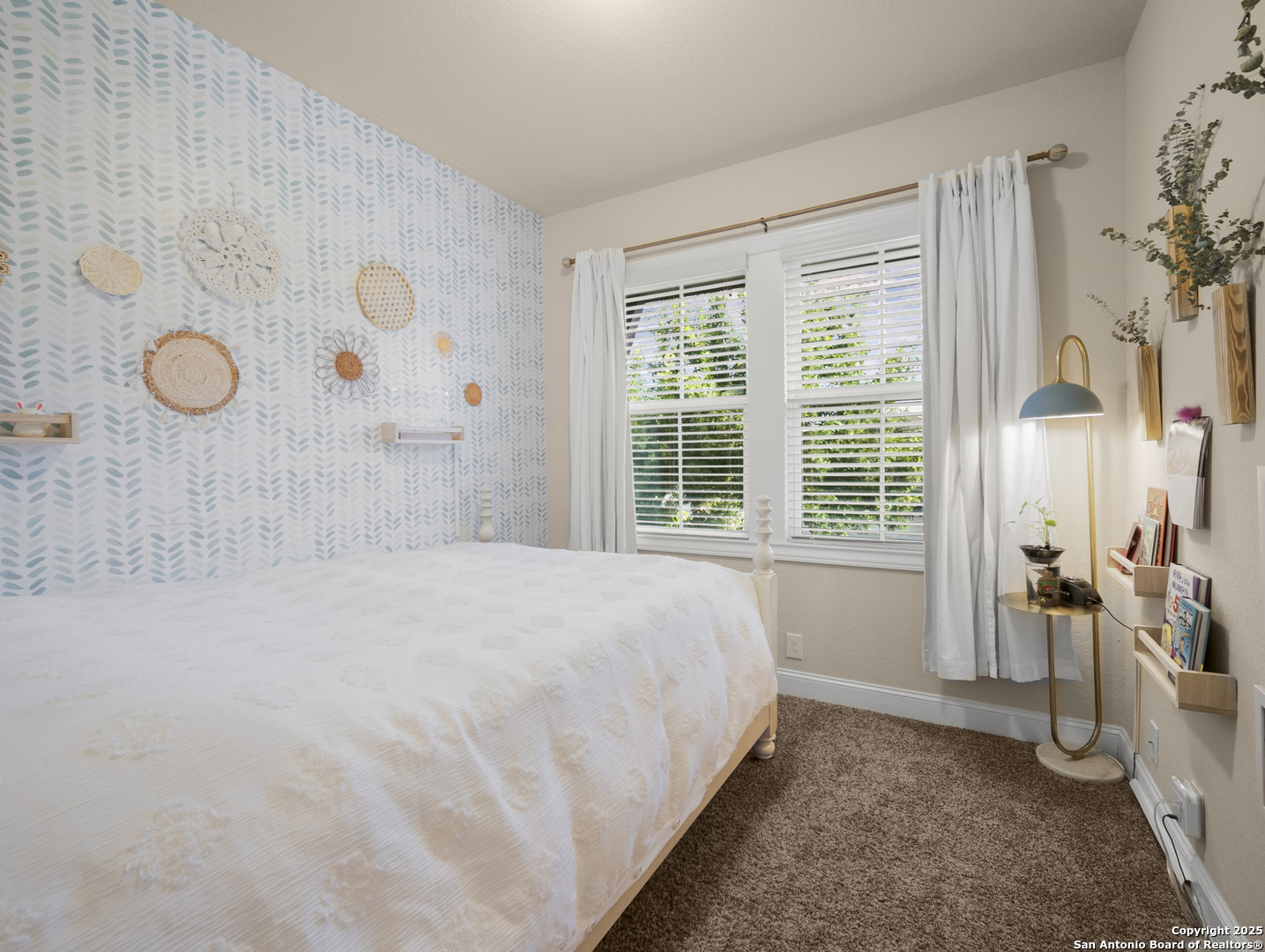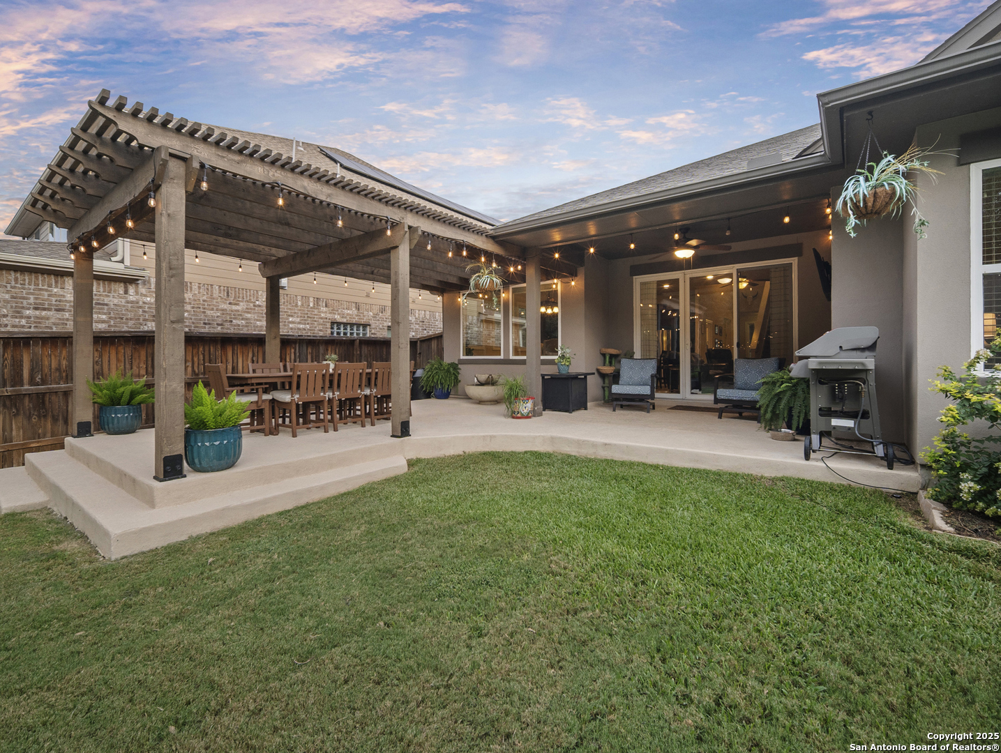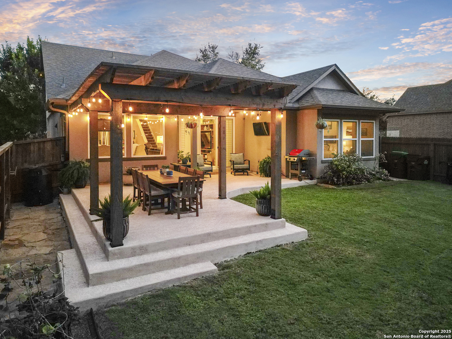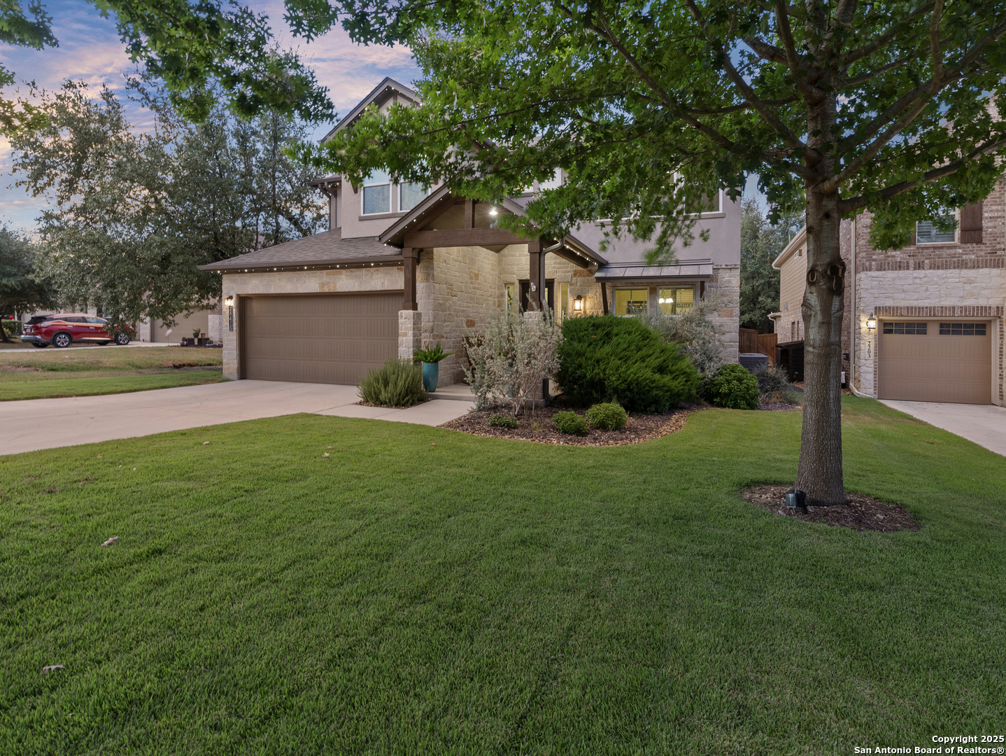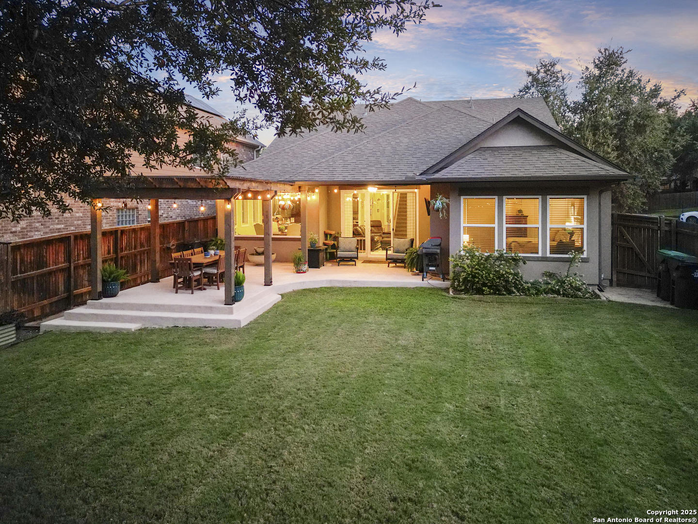 Tucked away on a quiet cul-de-sac street in the highly sought-after Willis Ranch community, this stunning 1.5-story home offers 3 bedrooms, 2.5 baths, and plenty of charm. Step inside to a welcoming entryway with a formal dining room that flows seamlessly into the kitchen. The chef's kitchen features rich cabinetry, granite countertops, and a large breakfast bar with seating for four-perfect for entertaining. A cozy breakfast nook and open living room complete the heart of the home. The spacious primary suite is located downstairs and boasts a spa-like bath with double vanities and a walk-in shower. The oversized master closet connects directly to the laundry room and mudroom, complete with custom built-in storage for convenience. Upstairs, you'll find a versatile game room, two additional bedrooms, and a full bath-ideal for family or guests. The backyard is a true retreat! With mature oaks providing shade throughout the yard and a peaceful greenbelt backdrop, this outdoor space can be enjoyed any time of day. A covered patio, recently added pergola, and wrought iron fence create the perfect setting for entertaining while taking in views of nature and wildlife. Thoughtful accent lighting and immaculate landscaping add to the home's curb appeal and charm. Willis Ranch offers a neighborhood walking trail, pool, and playground-and families will love that this property is zoned to the highly desired Comal ISD schools. Don't miss your chance to own this beautiful home in a peaceful setting with modern amenities and timeless style!