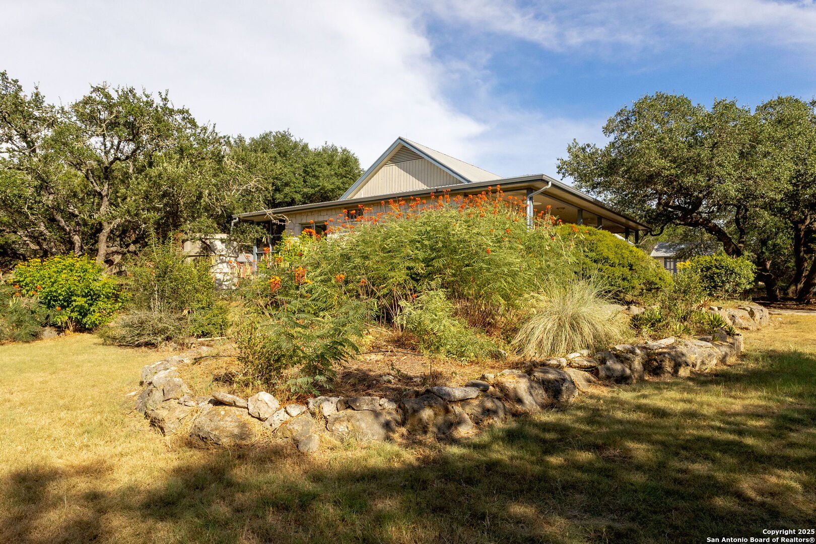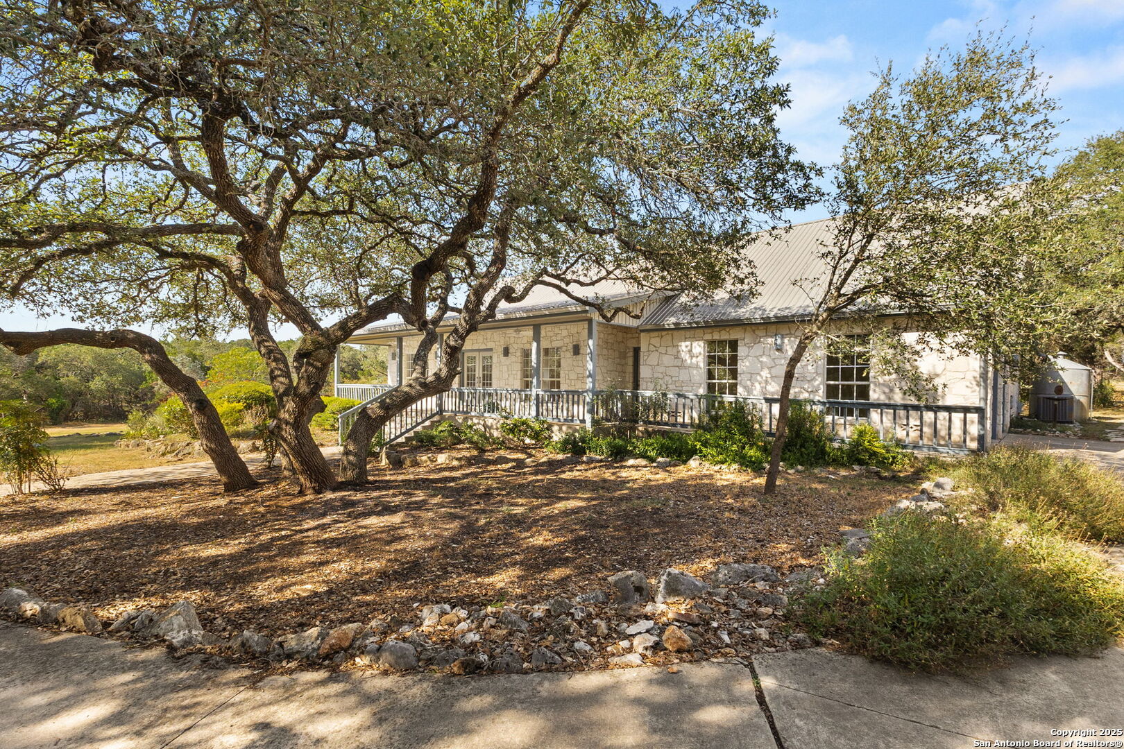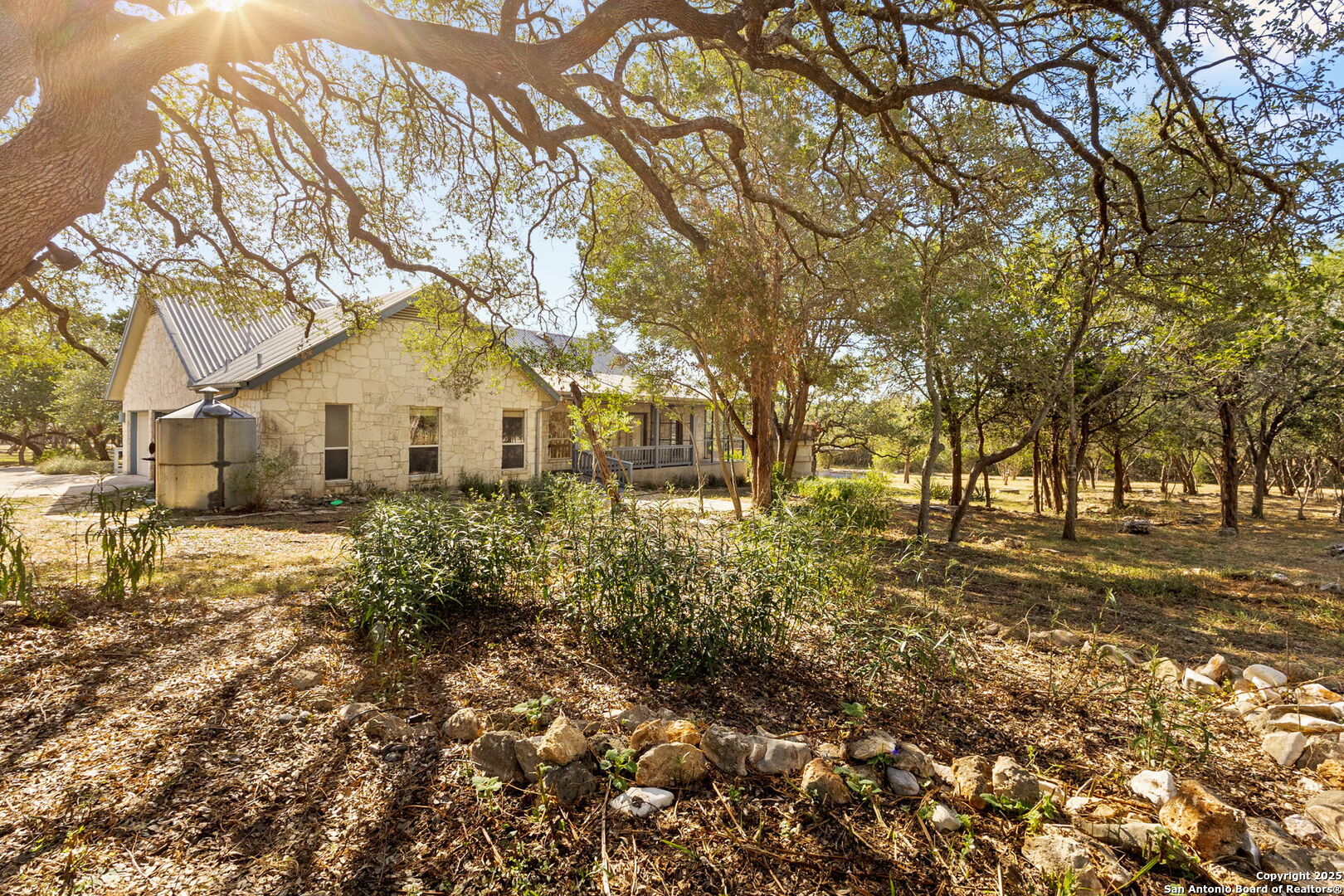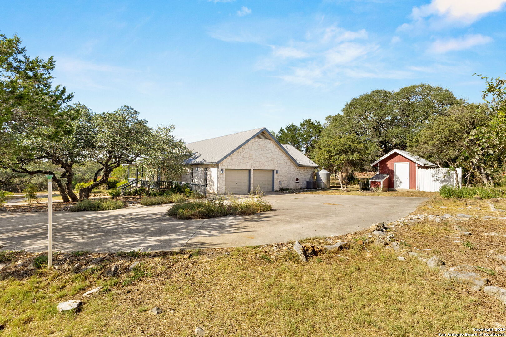 Five acres of Texas Hill Country freedom!! A private gated oasis just minutes from downtown New Braunfels and 20 minutes to San Antonio. This custom limestone home blends country serenity with urban convenience. Highlights include an expansive front and back porch for sipping ice tea and watching the tranquility of nature. The open-concept kitchen with a sunny breakfast nook opens to the family room with abundant natural light. The primary suite offers built-in cabinetry, a double vanity, a shower, and a large walk-in closet. Additional bedrooms (one with a picture window) and a flexible third room POTENTIAL (currently a nature-view screened alcove with ducting in place) provide versatile living space. A large laundry, mud room and 4 car garage complete the home. Outbuildings include a completed barn with two stalls for horses or livestock of your choice, a greenhouse, and large storage shed could easily be the man cave or she shed. Several raised bed garden spots ready for planting complete with water reclamation tanks. The circular drive offers easy access and ample parking for entertaining or extra toys. Don't miss the opportunity to own this country homestead/retreat with city proximity. Your best road home starts here-return daily to the tranquil oasis that is FIVE ACRES OF TEXAS.