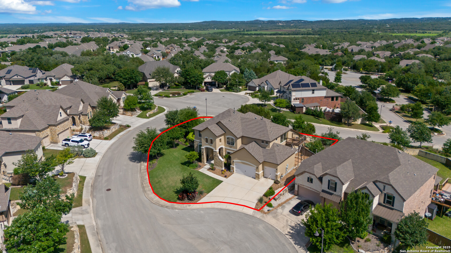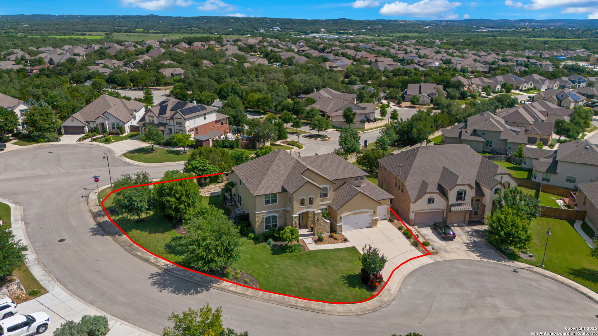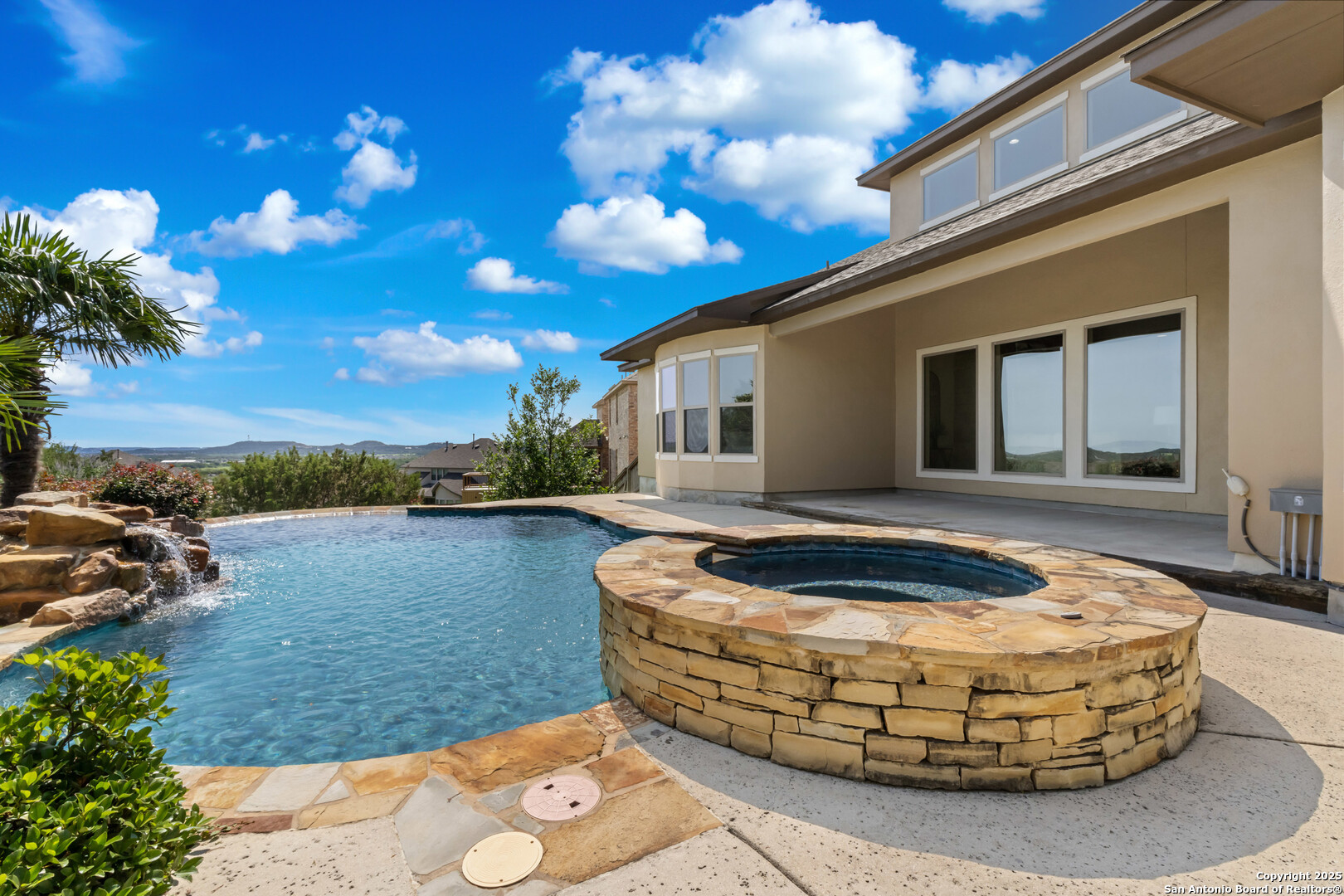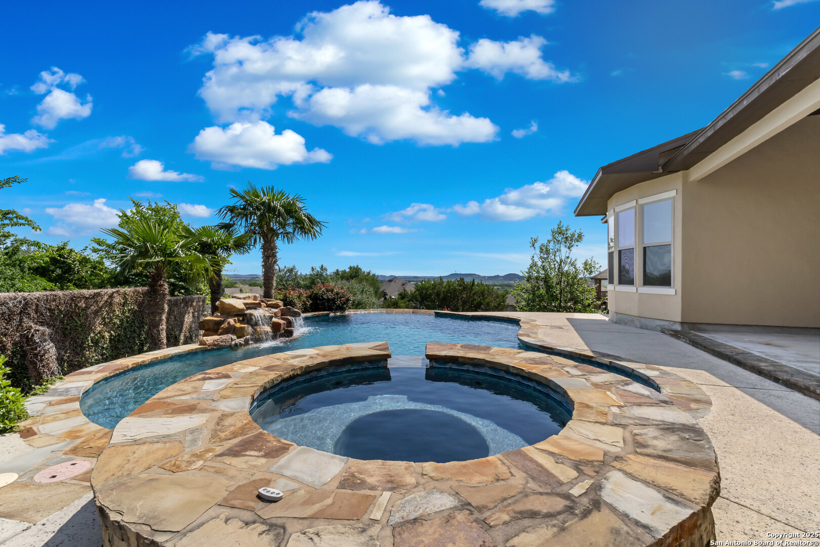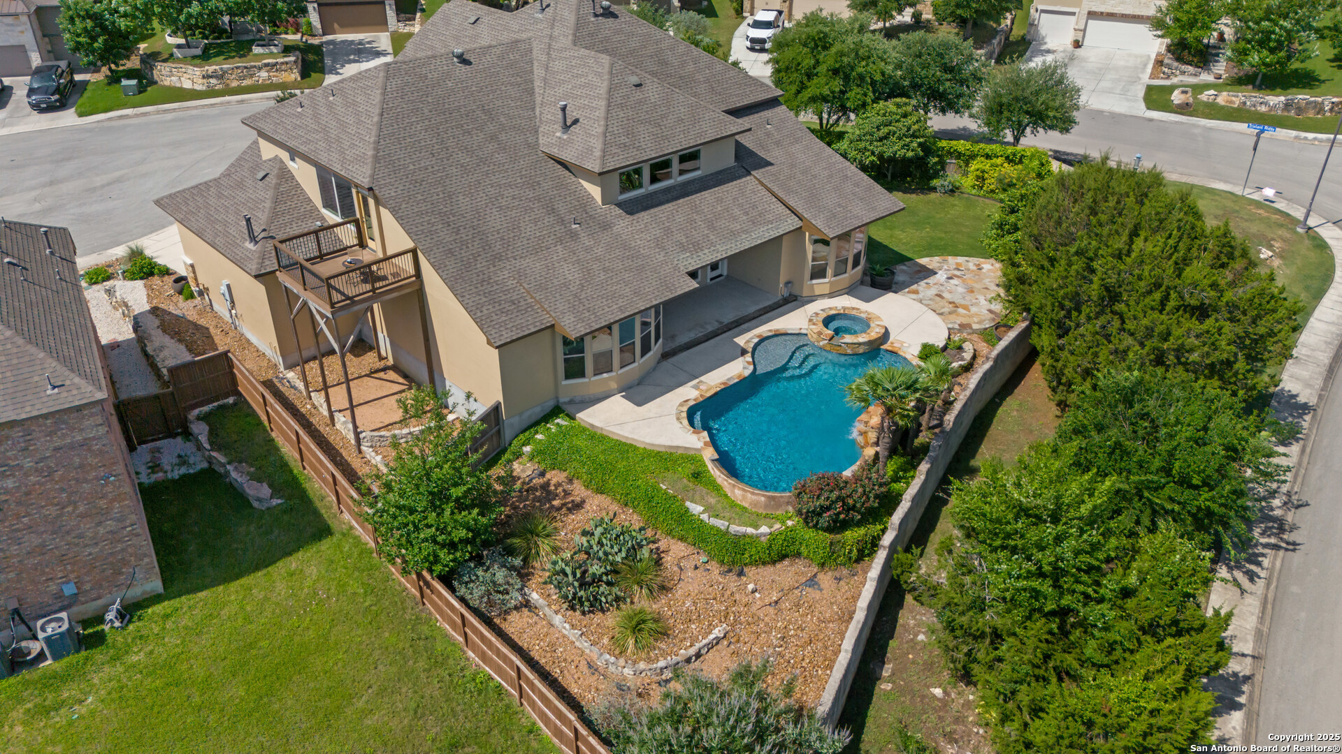 Luxury Living with Hill Country Views at an amazing price!!! Welcome to this stunning Monticello-built masterpiece, on an oversized corner lot at the top of the hill in the prestigious gated community of Hastings Ridge at Kinder Ranch. With unparalleled views, this 5-bedroom, 4-bathroom home offers 4,319 sq ft of thoughtfully designed space where elegance meets everyday comfort. As you approach the home, you're immediately welcomed by a beautifully landscaped front yard featuring lush Zoysia grass, mature crepe myrtle trees, and stately potted plants, all maintained by a full irrigation system-a true first impression of elegance and care. Upon entering, you're greeted by a grand foyer, a striking curved staircase, a private home office, and a formal dining room, setting the tone for the home's sophisticated character. Soaring 10-foot ceilings and an abundance of natural light carry you into the spacious living room-ideal for both entertaining guests and everyday relaxation. The gourmet kitchen is a chef's dream, showcasing high-end granite countertops, custom upgraded cabinetry, stone backsplash, gas cooking, and built-in appliances. You can also enjoy many family meals in the breakfast nook large enough for a 8 person table. The luxurious primary suite is your private sanctuary with sweeping Hill Country views, a spa-inspired bath featuring a mud-set walk-in shower, garden tub, dual vanities, and separate his-and-her closets. A large secondary bedroom and full bath on the main floor is perfect for multigenerational living or guests. Step outside to your private resort-style backyard oasis. Enjoy the large covered patio, outdoor stone fireplace, hot tub, and in-ground pool. This yard is perfect for relaxing evenings or lively gatherings. Don't miss the second-floor "Eagle's Nest" balcony, offering breathtaking panoramic views. Additional highlights include: wood and tile flooring throughout the first floor, a spacious game room with custom shuffleboard and darts, a separate media room with tv and surround sound, fitness equipment included, oversized laundry room with shelving and utility sink, drop zone off the oversized 3-car garage, two water heaters & two HVAC units, whole-home water filtration system, and custom shutters on all front-facing windows. Custom Hunter Douglas motorized shades available for all other windows in the home. This home is located in the highly acclaimed Comal ISD with the elementary, middle and high school that services the neighborhood all within walking distance. Just minutes from Hwy 281, top-tier shopping, dining, and all that North San Antonio has to offer. Hastings Ridge also features fantastic community amenities to include a pool, playground, basketball court, and scenic walking/jogging trails.