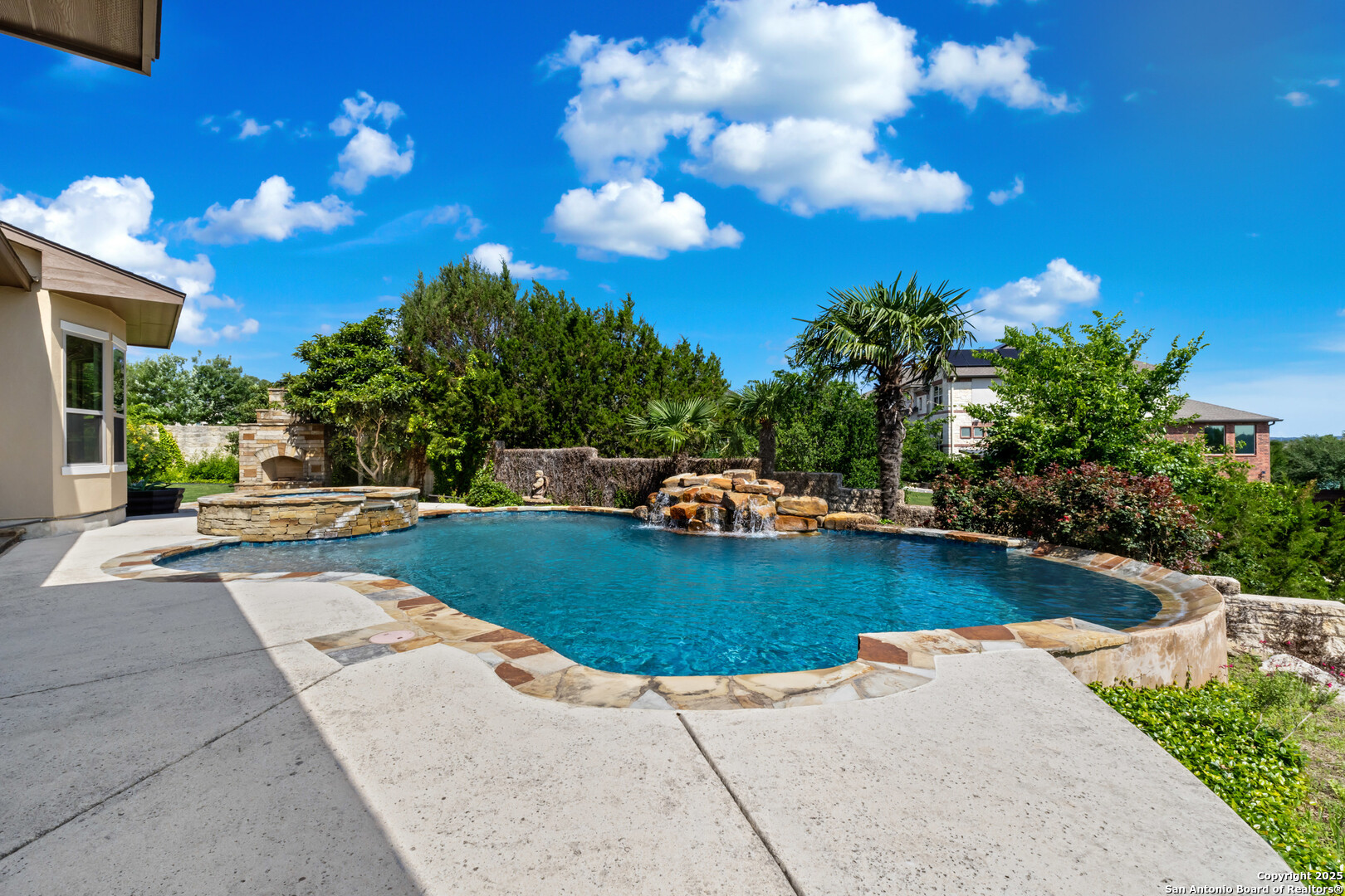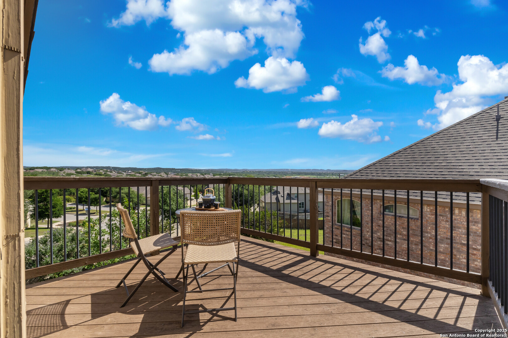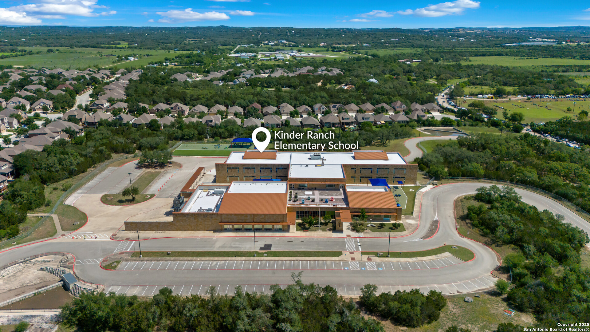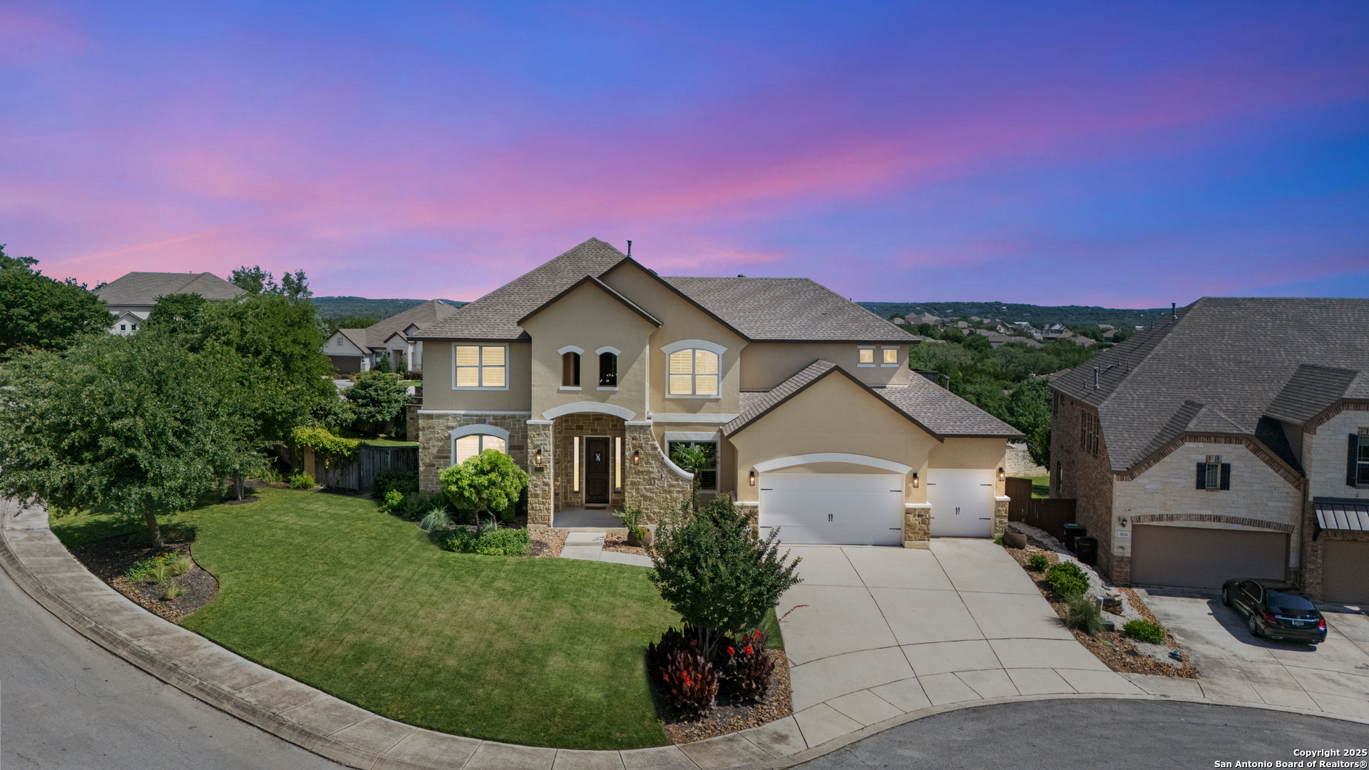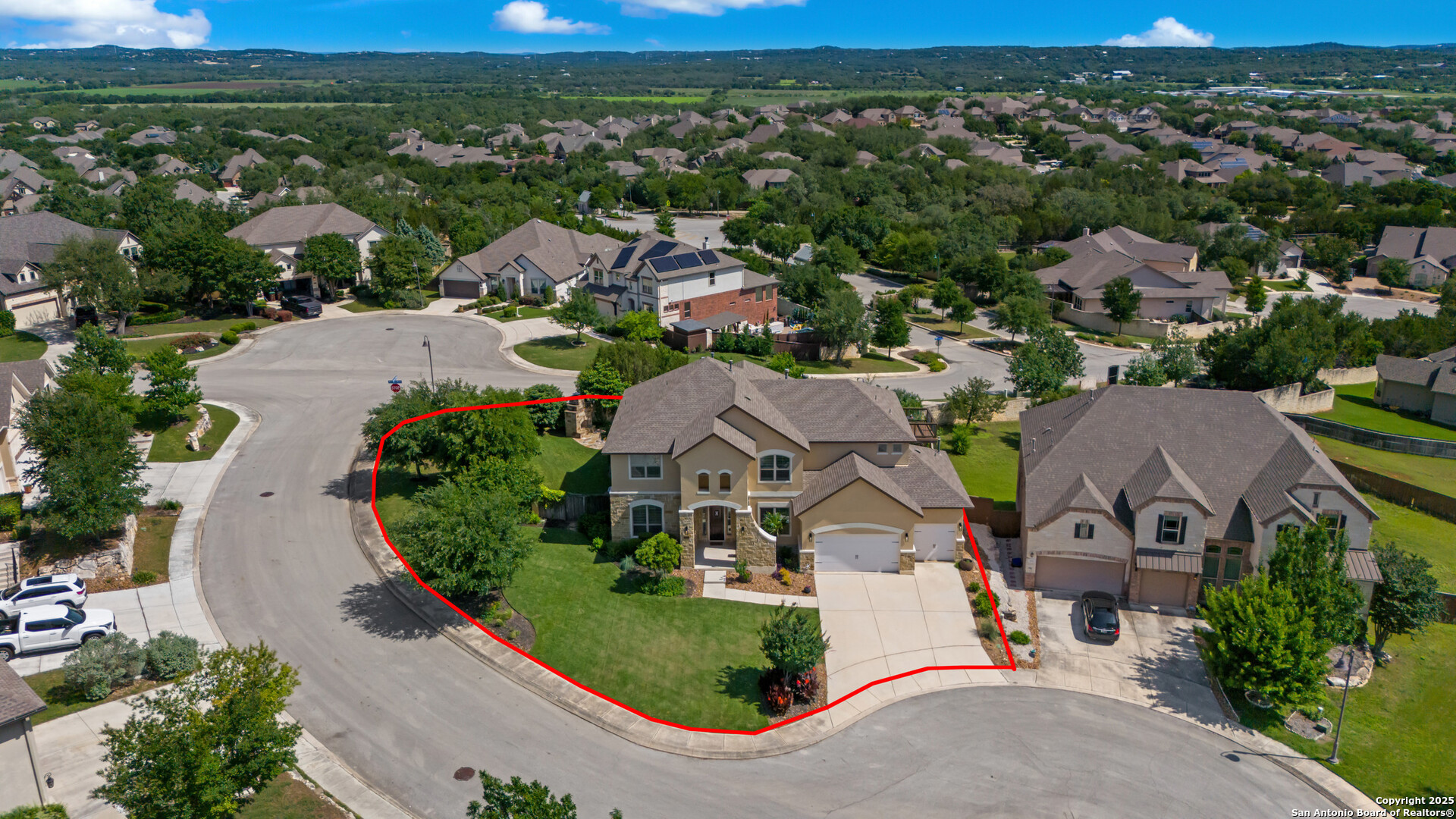Luxury Living with Hill Country Views at an amazing price!!! Welcome to this stunning Monticello-built masterpiece, on an oversized corner lot at the top of the hill in the prestigious gated community of Hastings Ridge at Kinder Ranch. With unparalleled views, this 5-bedroom, 4-bathroom home offers 4,319 sq ft of thoughtfully designed space where elegance meets everyday comfort. As you approach the home, you're immediately welcomed by a beautifully landscaped front yard featuring lush Zoysia grass, mature crepe myrtle trees, and stately potted plants, all maintained by a full irrigation system-a true first impression of elegance and care. Upon entering, you're greeted by a grand foyer, a striking curved staircase, a private home office, and a formal dining room, setting the tone for the home's sophisticated character. Soaring 10-foot ceilings and an abundance of natural light carry you into the spacious living room-ideal for both entertaining guests and everyday relaxation. The gourmet kitchen is a chef's dream, showcasing high-end granite countertops, custom upgraded cabinetry, stone backsplash, gas cooking, and built-in appliances. You can also enjoy many family meals in the breakfast nook large enough for a 8 person table. The luxurious primary suite is your private sanctuary with sweeping Hill Country views, a spa-inspired bath featuring a mud-set walk-in shower, garden tub, dual vanities, and separate his-and-her closets. A large secondary bedroom and full bath on the main floor is perfect for multigenerational living or guests. Step outside to your private resort-style backyard oasis. Enjoy the large covered patio, outdoor stone fireplace, hot tub, and in-ground pool. This yard is perfect for relaxing evenings or lively gatherings. Don't miss the second-floor "Eagle's Nest" balcony, offering breathtaking panoramic views. Additional highlights include: wood and tile flooring throughout the first floor, a spacious game room with custom shuffleboard and darts, a separate media room with tv and surround sound, fitness equipment included, oversized laundry room with shelving and utility sink, drop zone off the oversized 3-car garage, two water heaters & two HVAC units, whole-home water filtration system, and custom shutters on all front-facing windows. Custom Hunter Douglas motorized shades available for all other windows in the home. This home is located in the highly acclaimed Comal ISD with the elementary, middle and high school that services the neighborhood all within walking distance. Just minutes from Hwy 281, top-tier shopping, dining, and all that North San Antonio has to offer. Hastings Ridge also features fantastic community amenities to include a pool, playground, basketball court, and scenic walking/jogging trails.