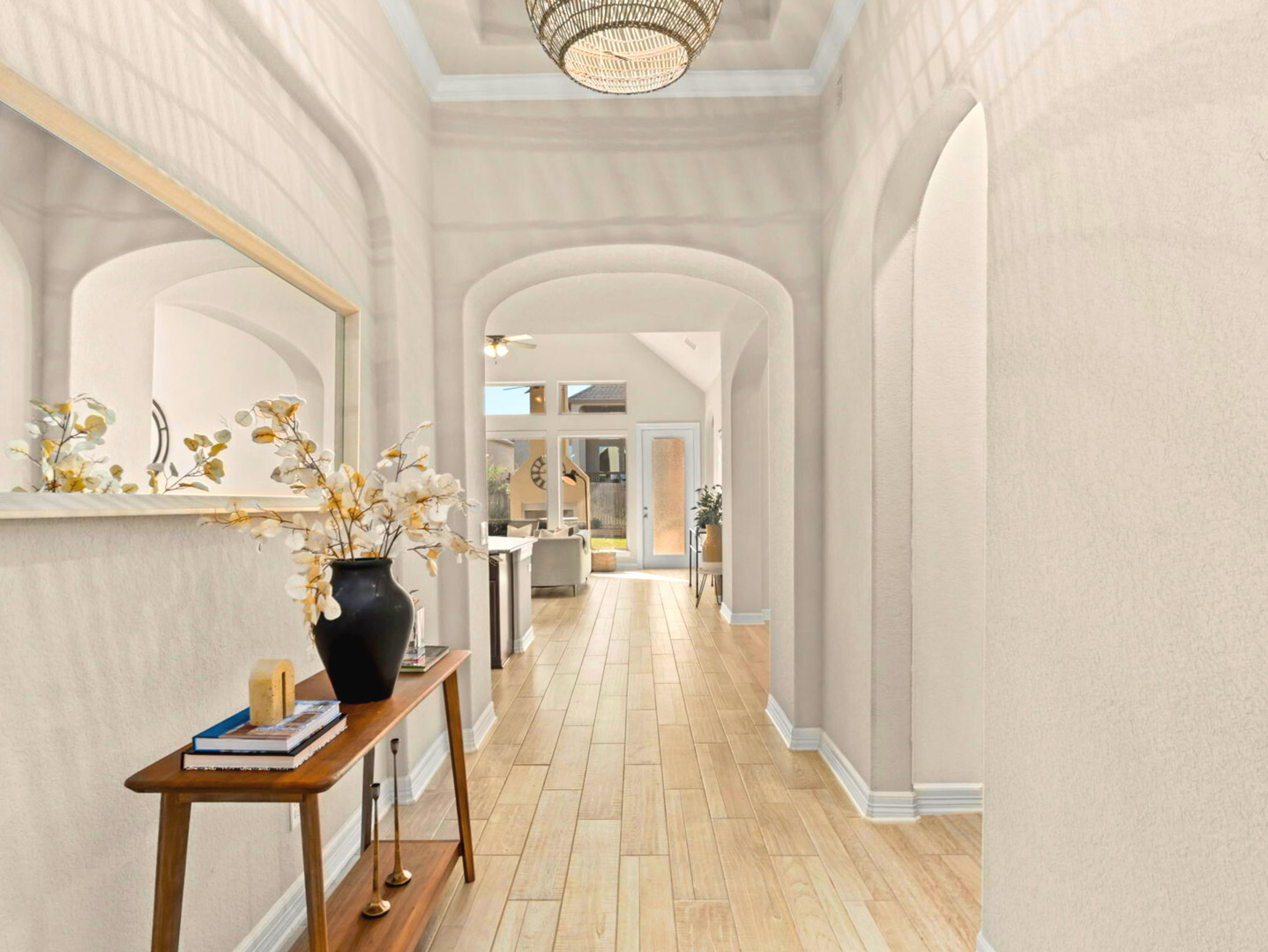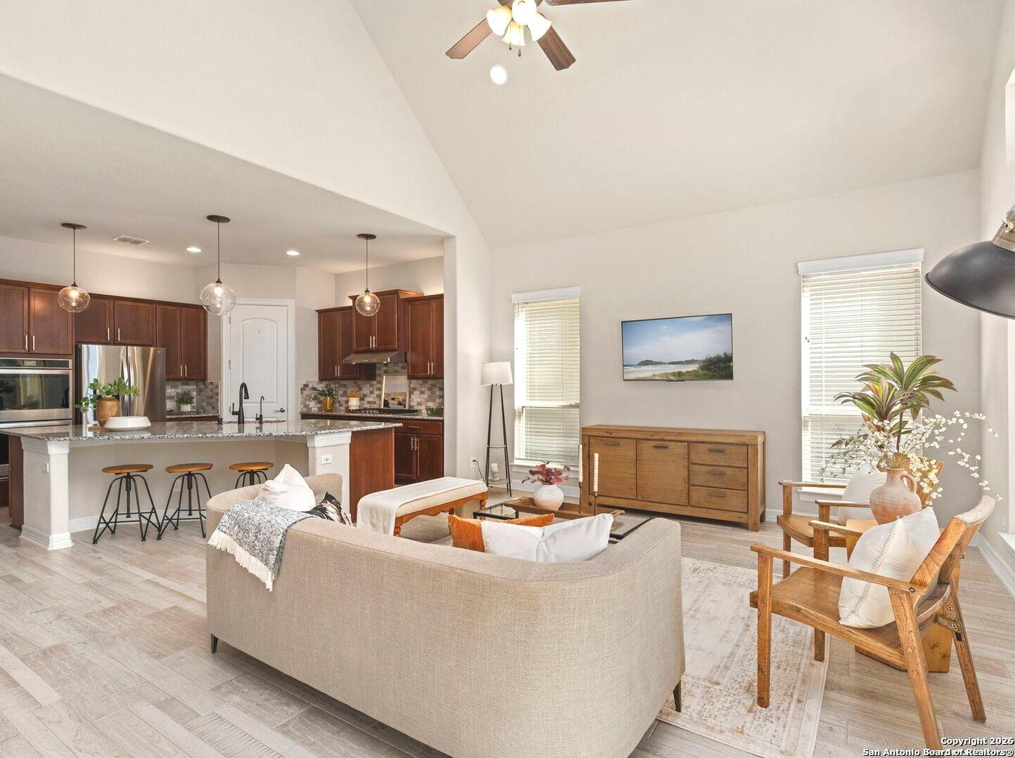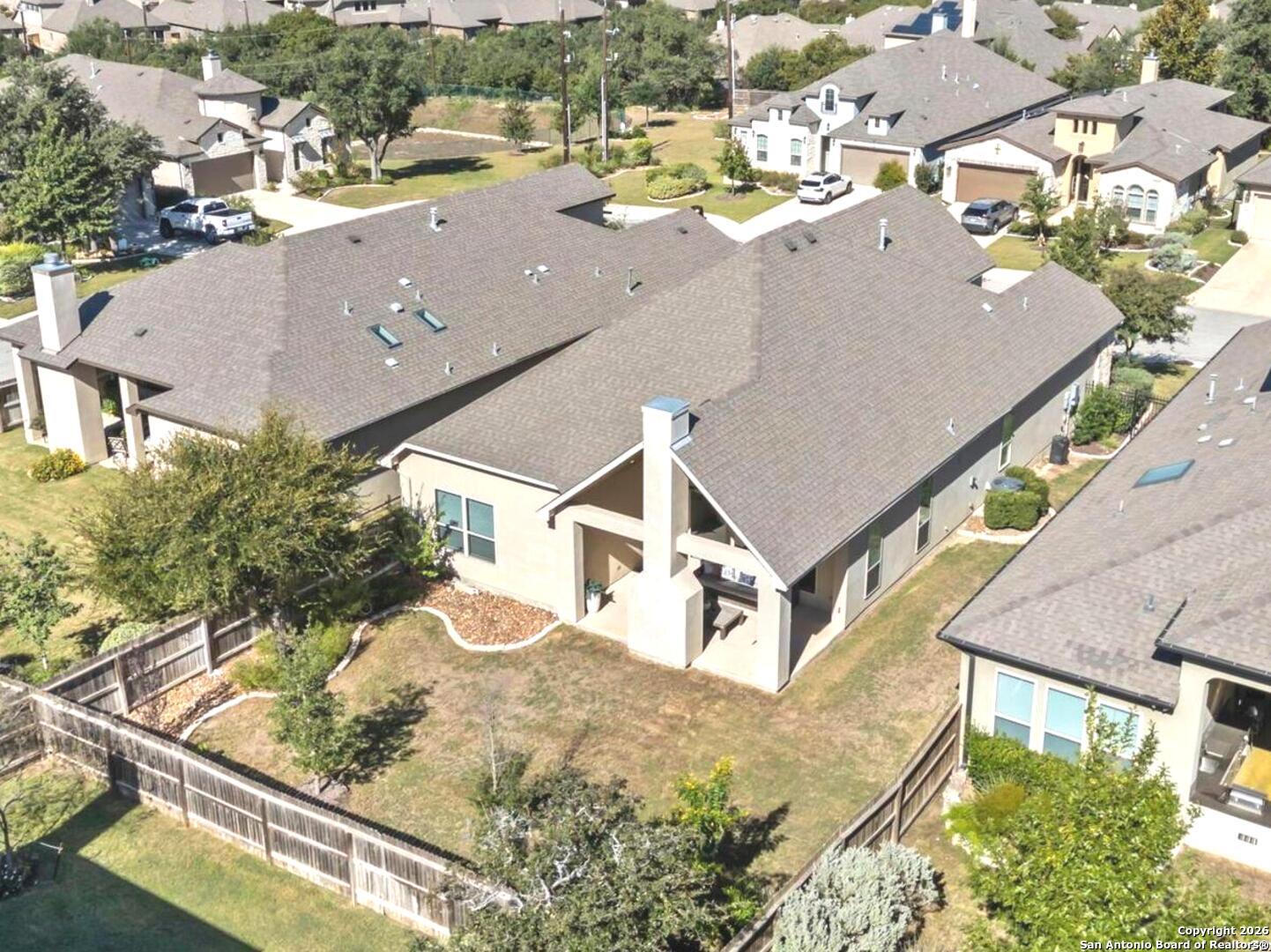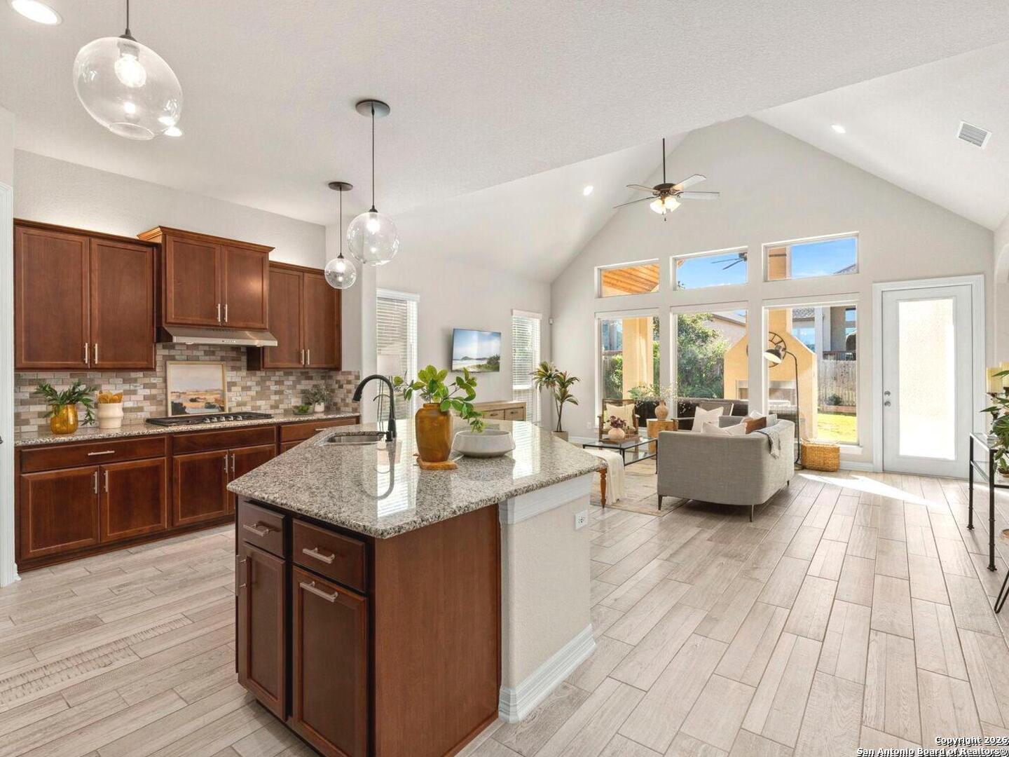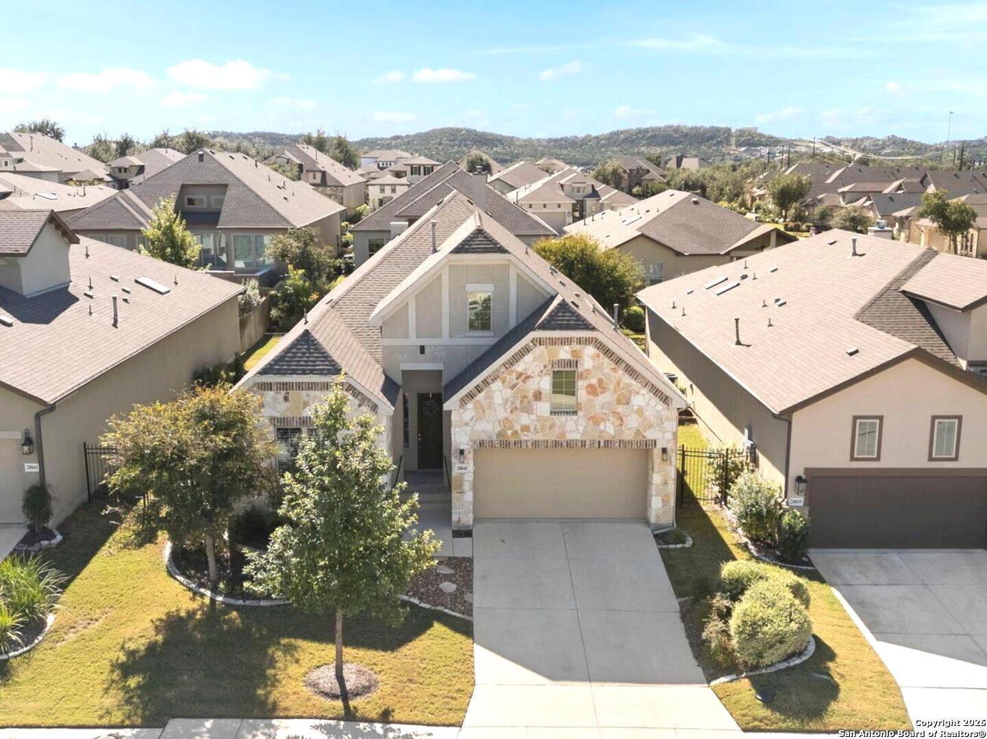 This inviting home is located in the beautiful neighborhood of Kinder Ranch at Settlers Ridge with controlled access. An impressive, well-built single-story, 3-bedroom and 2 1/2-bathroom home combines luxury with easy living. Enter to discover high ceilings, a majestic entryway, sun-filled rooms, and an open layout. A modern-designed kitchen provides the perfect atmosphere for everyday living and entertaining, with a grand island, double ovens, a gas cooktop, ample cabinetry space, and granite countertops. The primary bedroom is an elegant, spacious retreat, complemented by a full master bathroom suite with a walk-in closet. Step outside to enjoy a gorgeous covered patio, outdoor fireplace, and lush landscape. The front and backyard lawn maintenance of grass cutting is actively managed and included in the quarterly HOA fee. Experience quality craftsmanship and premium functional design, with attention to detail that creates a convenient, modern, and comfortable lifestyle. Schedule your private tour today.