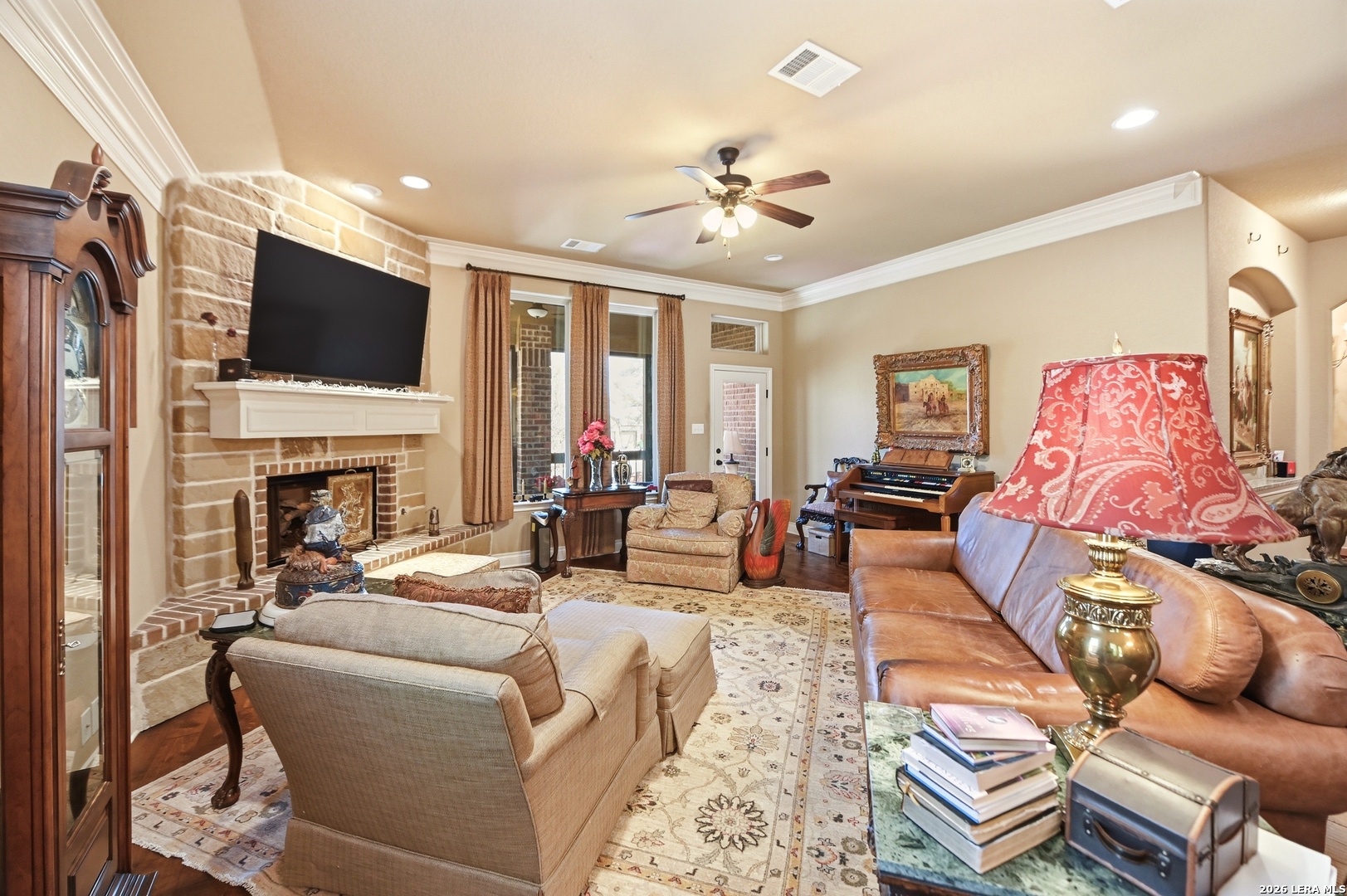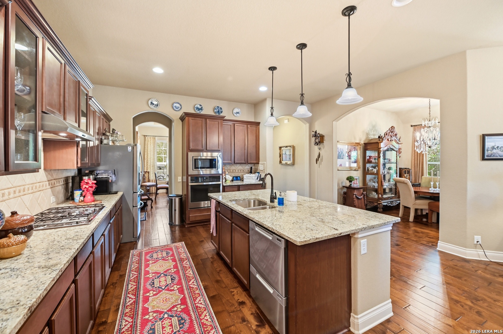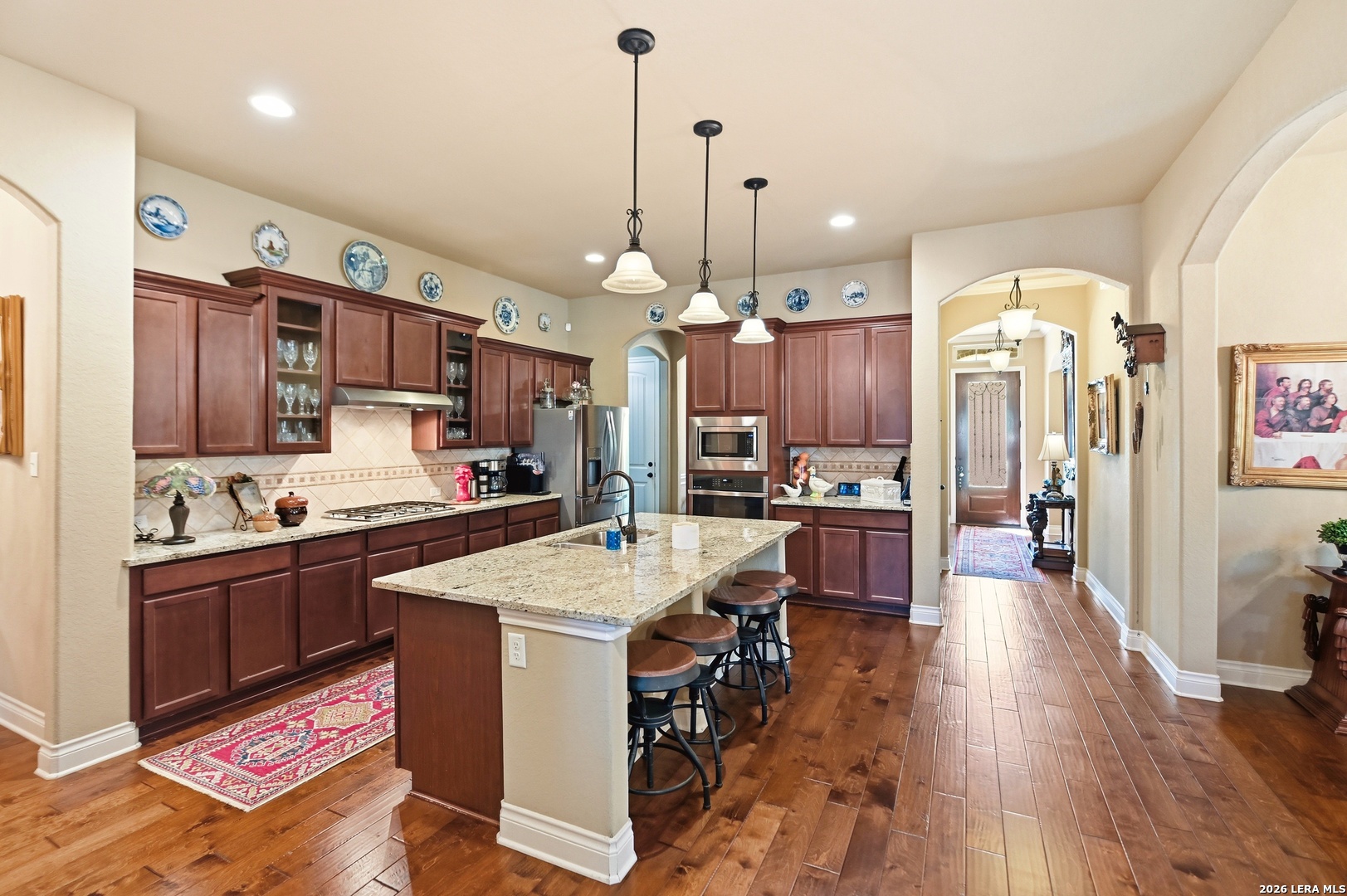 OWNERS BUILT THIS HOME NEW AND ADDED MAX UPGRADES. HARDWOOD FLOORS IN ALL LIVING AREAS, TOP OF THE LINE CARPET AND EXTRA PADDING IN THE MASTER BEDROOM, UPGRADED TILE IN ALL BATHROOMS, CROWN MOLDING THROUGHOUT, UPGRADED GRANITE AND APPLIANCES, FLAGSTONE PATIO IN BACK AND FULL YARD SPRINKLER SYSTEM. THE DINING ROOM IS AT THE FRONT OF THE HOME AND COULD BE AN OFFICE IF YOU PREFER. LARGE LIVING WITH FLOOR TO CEILING STONE FIREPLACE FEATURING GAS LOGS. VERY OPEN FLOOR WITH KITCHEN, LIVING AND 2ND EATING AREA OPEN TO MAKE A HUGE ENTERTAINMENT AREA AS WELL AS THE ENCLOSED PATIO ADDING EXTRA SPACE. THE KITCHEN IS THE ENVY OF MOST CHEF'S WITH TOP-OF-THE-LINE APPLIANCES INCLUDING DISHWASHER WITH DRAWERS FOR BETTER CLEANING, STAINLESS STEEL GAS COOKTOP, RECENTLY INSTALLED OVEN, HUGE ISLAND WITH STAINLESS STEEL SINK AND BREAKFAST BAR, PLUS LARGE PANTRY TO TOP IT ALL OFF. THE MASTER SUITE IS HUGE WITH BEDROOM, ATTACHED SITTING AREA, LUXURY BATH FEATURING LARGE WALK-IN SHOWER, GARDEN TUB, DOUBLE VAINITY WITH GRANITE COUNTERTOP AND BIG WALK-IN CLOSET WITH AN ADDITIONAL CLOSET OUTSIDE BEDROOM DOOR. THE OTHER TWO BEDROOMS ARE BIG WITH LOTS OF CLOSET SPACE. THE OUTIDE ENCLOSED PATIO EXTENDS THE LIVING AREA WITH LOTS OF NATURAL LIGHT MADE FOR MORING COFFEE OR RELAXING AT THE END OF THE DAY. THERE IS A THREE CAR TANDUM GARAGE, PERMANENT STAIRS TO ATTIC PLUS AN ELECTRIC LIFT SO THE ATTIC IS USABLE FOR STORAGE. THE BACK YARD HAD 25K WORTH OF LANDSCAPING DONE TO INCLUDE FLAGSTONE PATIO, LANDSCAPING AND WROUGHT IRON FENCING ON BOTH SIDES. THE ENTIRE YARD FEATURES AN AUTOMATIC SPRINKLER SYSTEM AND BEAUTIFUL LANDSCAPING. ALL THIS AND ONLY MINUTES TO BOERNE, SAN ANTONIO, SIX FLAGS AND MUCH MORE.