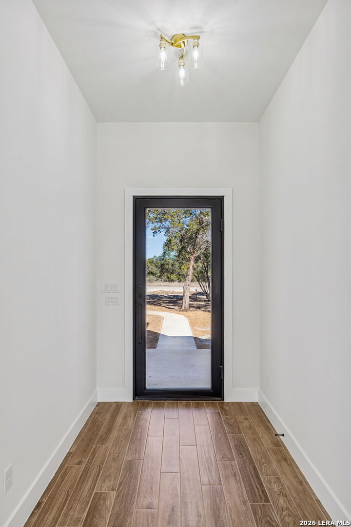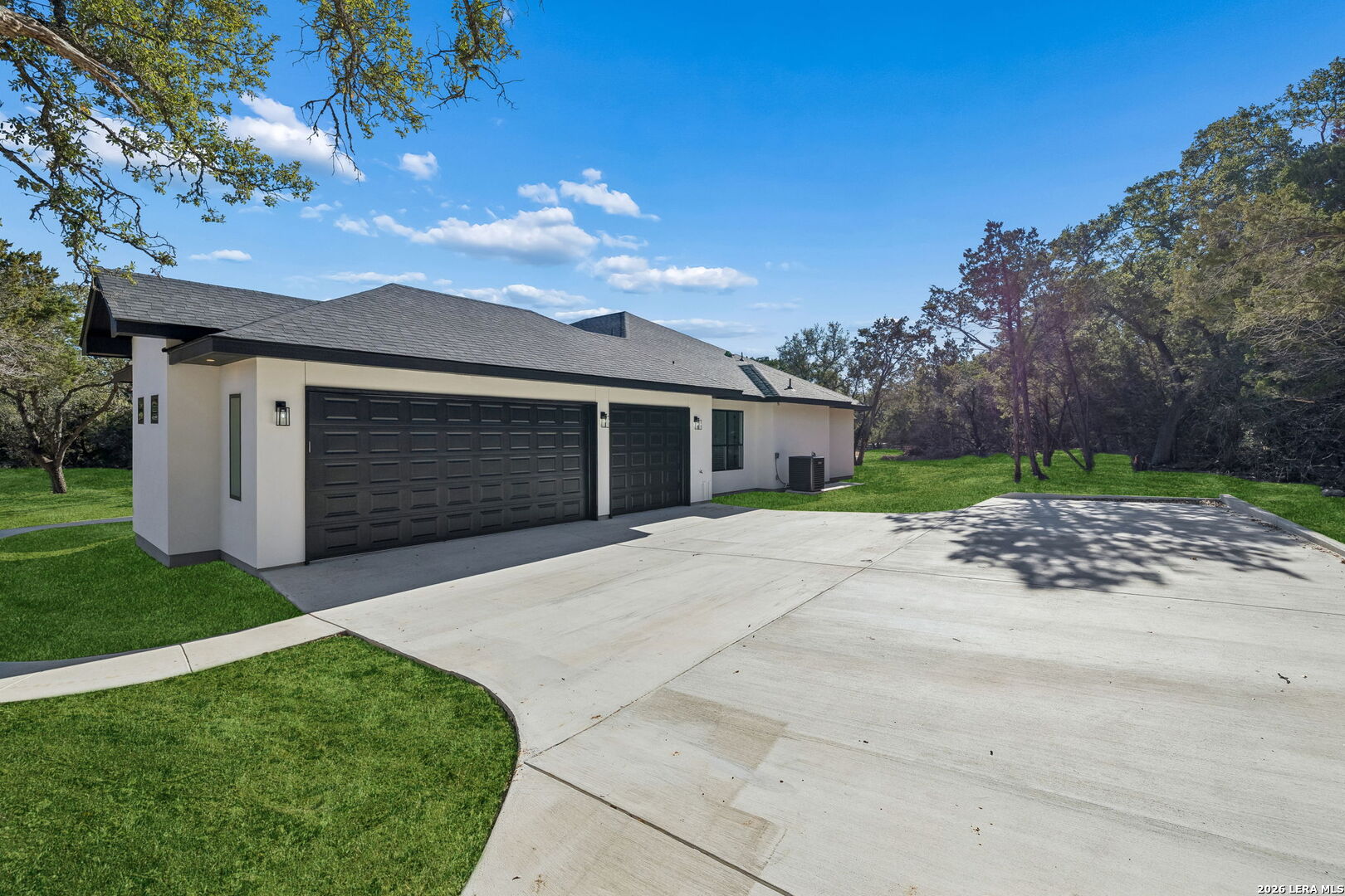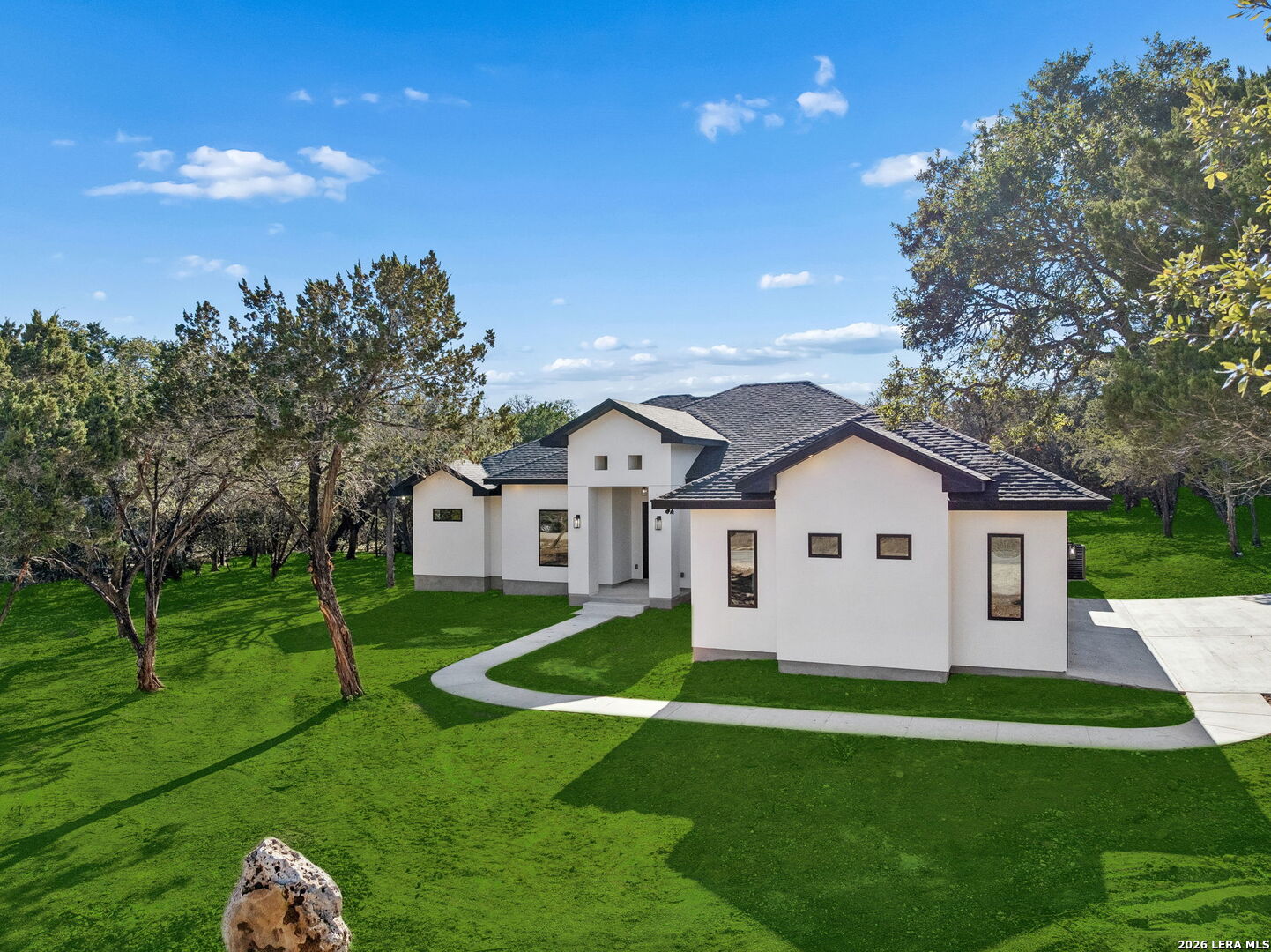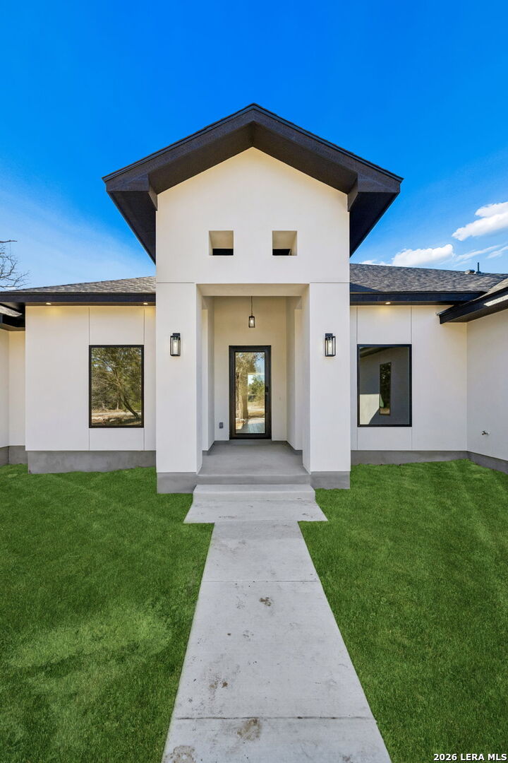Discover refined Hill Country living in this brand-new custom home situated on a private, oak-studded lot in the gated Serenity Oaks community. Backing to a private ranch, this 4-bedroom, 3-bath residence offers approximately 2,513 square feet of thoughtfully designed living space combining modern comfort, flexibility, and scenic surroundings. The open-concept living area showcases tray ceilings, a striking linear fireplace with custom built-ins, and oversized sliding glass doors that seamlessly connect indoor and outdoor living. The chef's kitchen features white oak cabinetry, quartz countertops, a two-tone oversized island, designer lighting, premium appliances, and elegant brass hardware - ideal for entertaining and everyday living. The private primary suite is a true retreat, offering tray ceilings, a spa-inspired bath with dual vanities, backlit mirrors, a spacious walk-in shower with window and niche, and an expansive walk-in closet with custom shelving. Two secondary bedrooms are well-appointed, while the fourth bedroom offers flexibility as a home office or study. An additional flex room provides endless possibilities and can easily function as a media room, gym, playroom, or additional living space. Step outside to the oversized covered patio featuring soaring ceilings with architectural truss detail, two ceiling fans, and a built-in outdoor kitchen, perfect for relaxing or entertaining while enjoying peaceful Hill Country views. Additional highlights include a dedicated laundry room with cabinetry and folding space, energy-efficient construction, EV charging plug in the garage, a generator plug, and an oversized three-car garage. Residents of Serenity Oaks enjoy gated access and exceptional amenities including an 18-hole golf course, junior Olympic swimming pool, private Guadalupe River park, playground, and basketball court. Luxury design, privacy, and flexibility come together in this move-in-ready Hill Country home.
