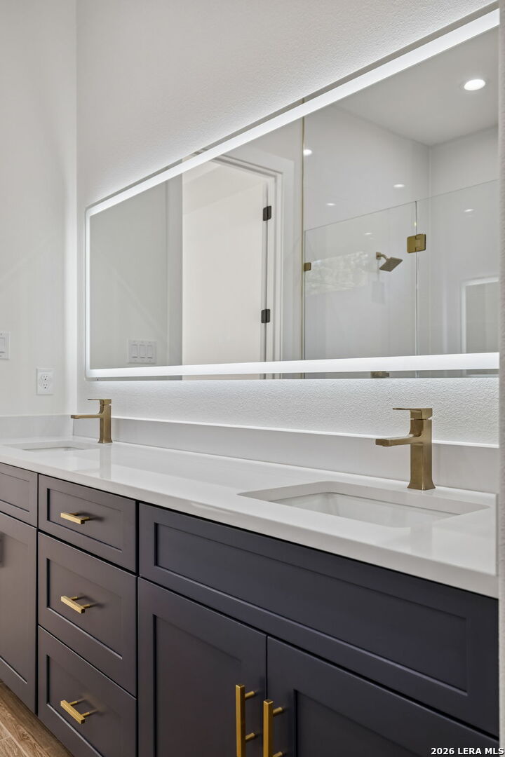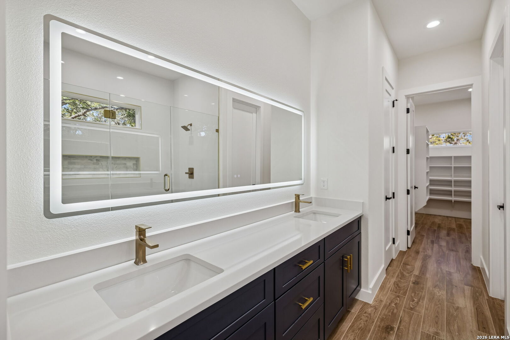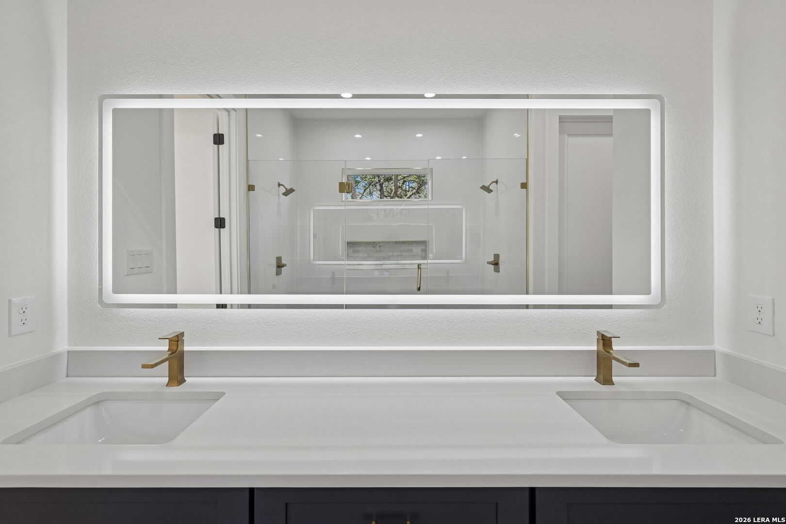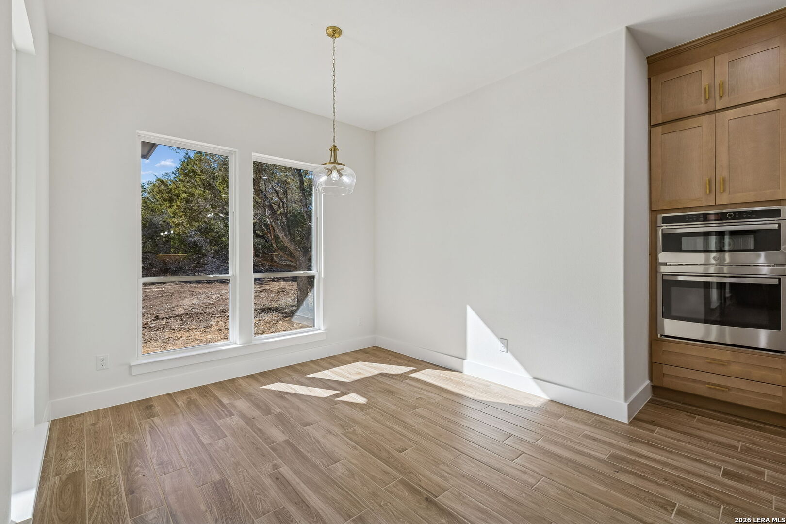 Discover refined Hill Country living in this brand-new custom home situated on a private, oak-studded lot in the gated Serenity Oaks community. Backing to a private ranch, this 4-bedroom, 3-bath residence offers approximately 2,513 square feet of thoughtfully designed living space combining modern comfort, flexibility, and scenic surroundings. The open-concept living area showcases tray ceilings, a striking linear fireplace with custom built-ins, and oversized sliding glass doors that seamlessly connect indoor and outdoor living. The chef's kitchen features white oak cabinetry, quartz countertops, a two-tone oversized island, designer lighting, premium appliances, and elegant brass hardware - ideal for entertaining and everyday living. The private primary suite is a true retreat, offering tray ceilings, a spa-inspired bath with dual vanities, backlit mirrors, a spacious walk-in shower with window and niche, and an expansive walk-in closet with custom shelving. Two secondary bedrooms are well-appointed, while the fourth bedroom offers flexibility as a home office or study. An additional flex room provides endless possibilities and can easily function as a media room, gym, playroom, or additional living space. Step outside to the oversized covered patio featuring soaring ceilings with architectural truss detail, two ceiling fans, and a built-in outdoor kitchen, perfect for relaxing or entertaining while enjoying peaceful Hill Country views. Additional highlights include a dedicated laundry room with cabinetry and folding space, energy-efficient construction, EV charging plug in the garage, a generator plug, and an oversized three-car garage. Residents of Serenity Oaks enjoy gated access and exceptional amenities including an 18-hole golf course, junior Olympic swimming pool, private Guadalupe River park, playground, and basketball court. Luxury design, privacy, and flexibility come together in this move-in-ready Hill Country home.