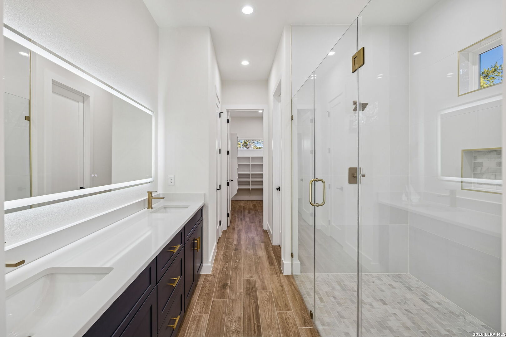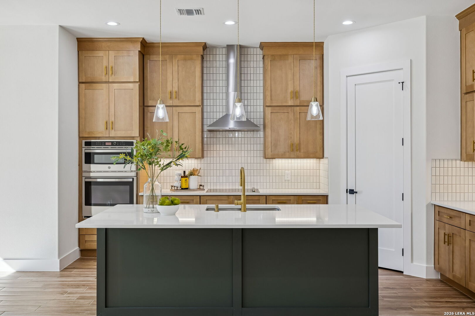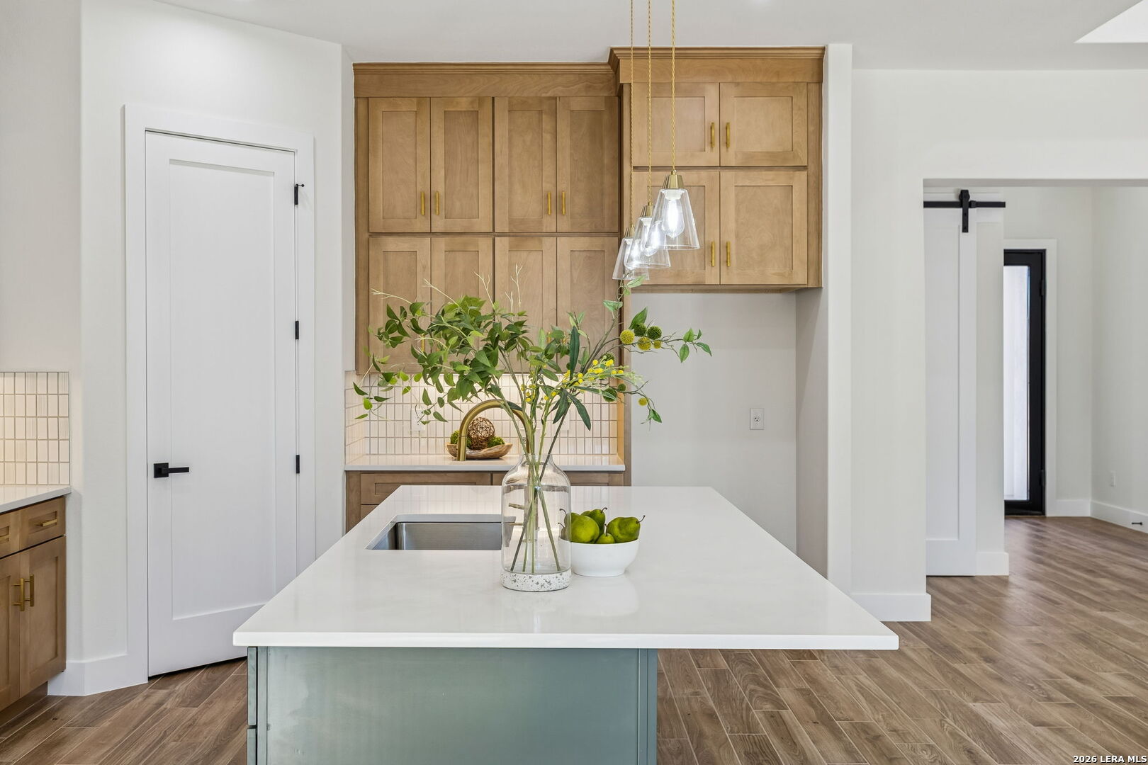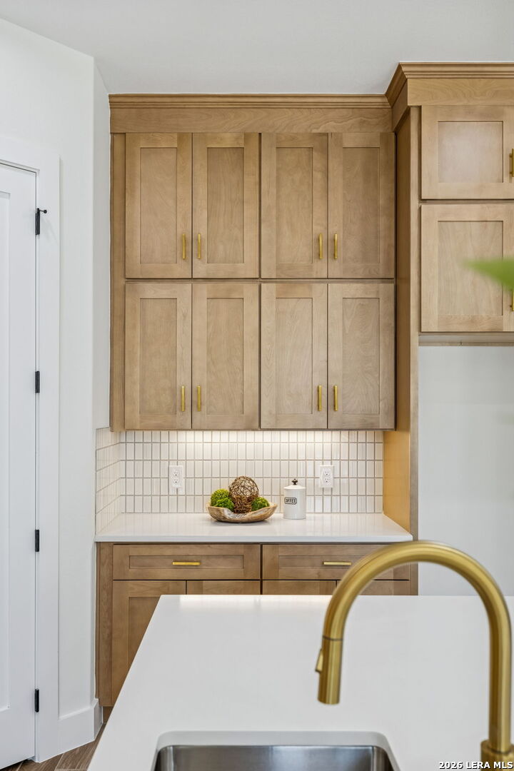 Discover refined Hill Country living in this brand-new custom home situated on a private, oak-studded lot in the gated Serenity Oaks community. Backing to a private ranch, this 4-bedroom, 3-bath residence offers approximately 2,513 square feet of thoughtfully designed living space combining modern comfort, flexibility, and scenic surroundings. The open-concept living area showcases tray ceilings, a striking linear fireplace with custom built-ins, and oversized sliding glass doors that seamlessly connect indoor and outdoor living. The chef's kitchen features white oak cabinetry, quartz countertops, a two-tone oversized island, designer lighting, premium appliances, and elegant brass hardware - ideal for entertaining and everyday living. The private primary suite is a true retreat, offering tray ceilings, a spa-inspired bath with dual vanities, backlit mirrors, a spacious walk-in shower with window and niche, and an expansive walk-in closet with custom shelving. Two secondary bedrooms are well-appointed, while the fourth bedroom offers flexibility as a home office or study. An additional flex room provides endless possibilities and can easily function as a media room, gym, playroom, or additional living space. Step outside to the oversized covered patio featuring soaring ceilings with architectural truss detail, two ceiling fans, and a built-in outdoor kitchen, perfect for relaxing or entertaining while enjoying peaceful Hill Country views. Additional highlights include a dedicated laundry room with cabinetry and folding space, energy-efficient construction, EV charging plug in the garage, a generator plug, and an oversized three-car garage. Residents of Serenity Oaks enjoy gated access and exceptional amenities including an 18-hole golf course, junior Olympic swimming pool, private Guadalupe River park, playground, and basketball court. Luxury design, privacy, and flexibility come together in this move-in-ready Hill Country home.