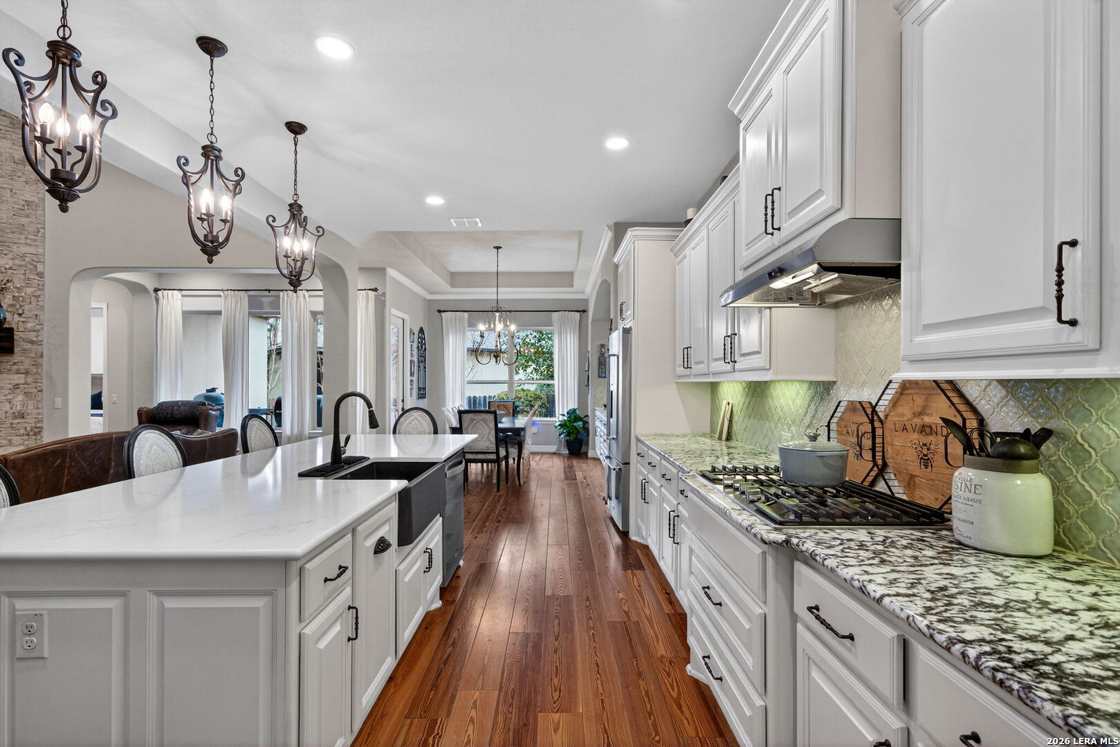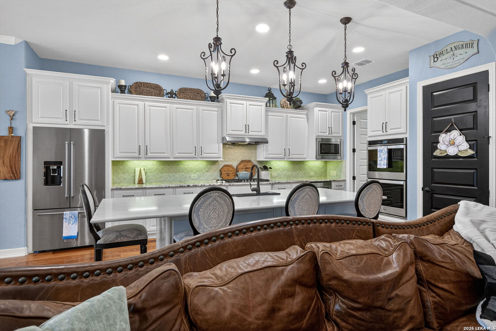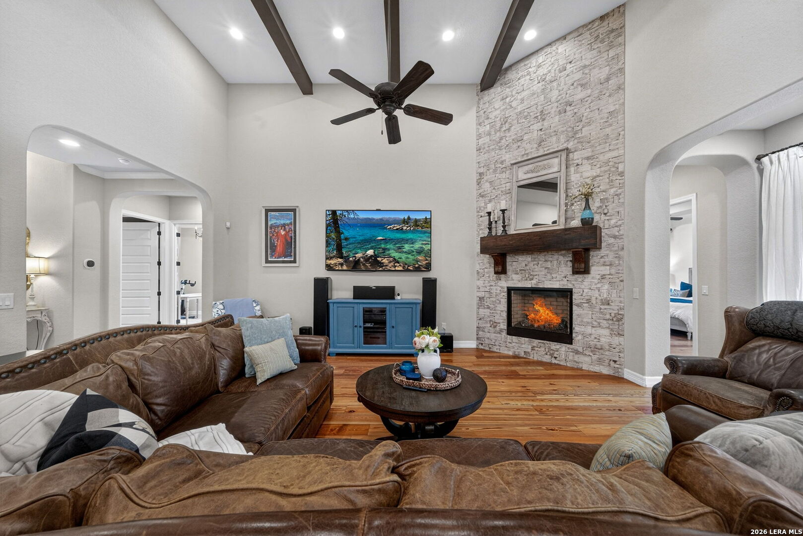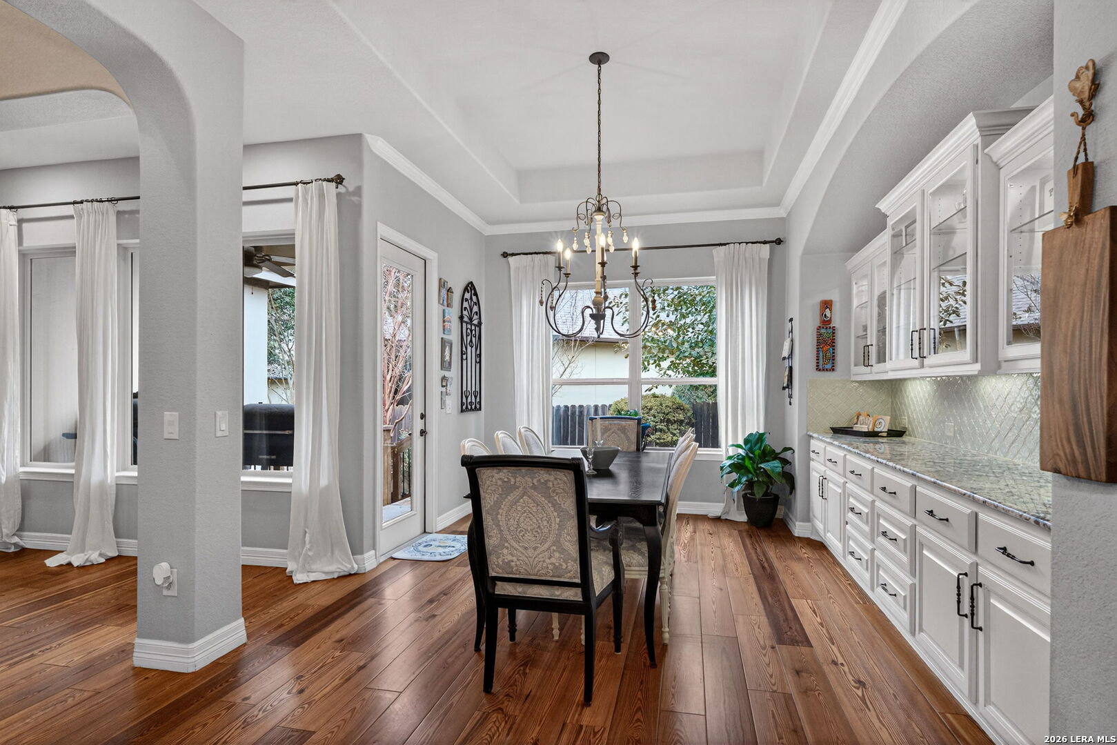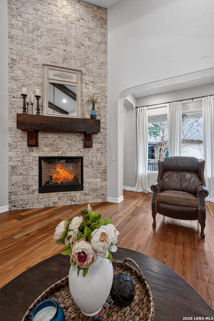 Welcome to refined Hill Country living in the gated community of Balcones Creek. Built by Sitterle in 2018 and thoughtfully designed for comfort and longevity, this one story garden home residence offers approximately 2,500 square feet of well curated living space with three bedrooms and three and a half baths, including a private casita ideal for guests or multigenerational living. From the moment you enter, the home impresses with soaring 16 foot ceilings in the great room, 10 foot ceilings throughout, and eight foot doors that enhance the sense of scale and light. Goodwin reclaimed heart of pine flooring runs throughout the main living areas and bedrooms, offering timeless character and durability, while refined finishes such as Emtek cabinet hardware, custom lighting, and a fireplace mantel crafted by Alamo Hardwoods elevate the overall design. The open kitchen is anchored by an oversized quartz island and flows seamlessly into the living and dining spaces, making it ideal for everyday living and effortless entertaining. The primary suite is a true retreat with a spa inspired bath, generous walk in closet, and serene privacy. Energy efficiency and comfort are prioritized with spray foam insulation, a Trane high efficiency dual zoned HVAC system, and a Google WiFi mesh network. Outdoor living is equally inviting with a covered patio, mature trees, privacy fencing, and a hot tub that conveys with the home. The three car tandem garage provides ample storage and flexibility. Lawn care and monitored security are included through the HOA, allowing for low maintenance living. Balcones Creek residents enjoy controlled access, a resort style pool, clubhouse, parks, and scenic jogging trails, all just minutes from Boerne's award winning schools, shopping, dining, and Hill Country charm. This home offers the rare combination of quality construction, thoughtful upgrades, and a lock and leave lifestyle in one of Boerne's most desirable communities.