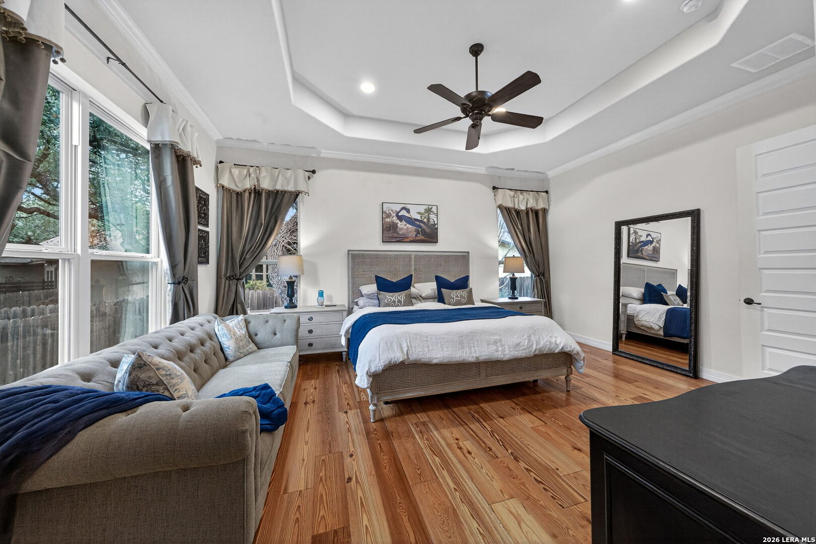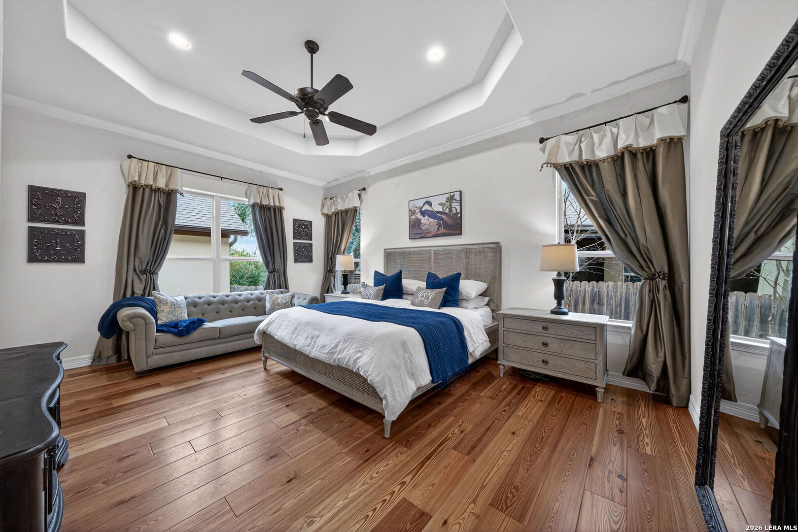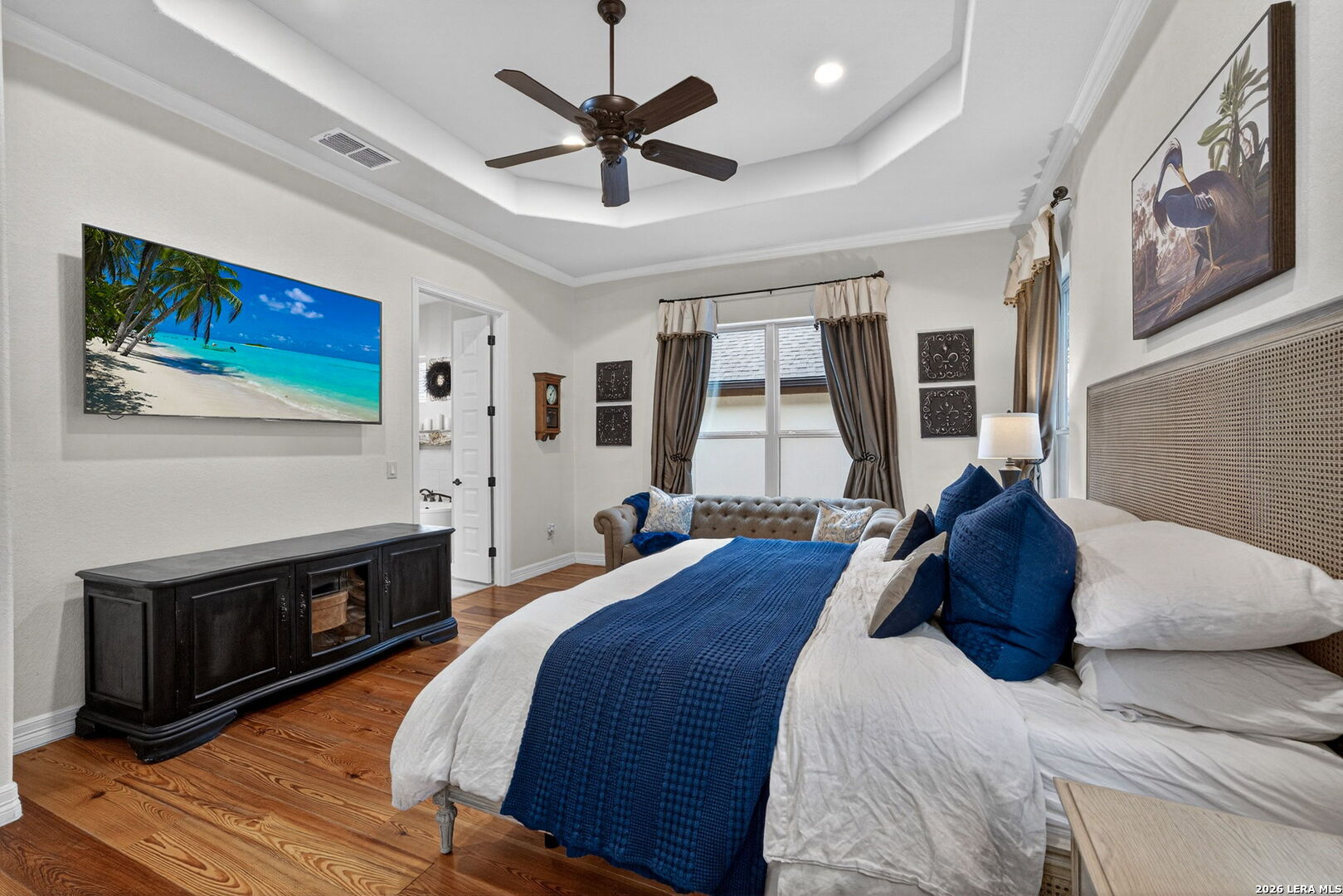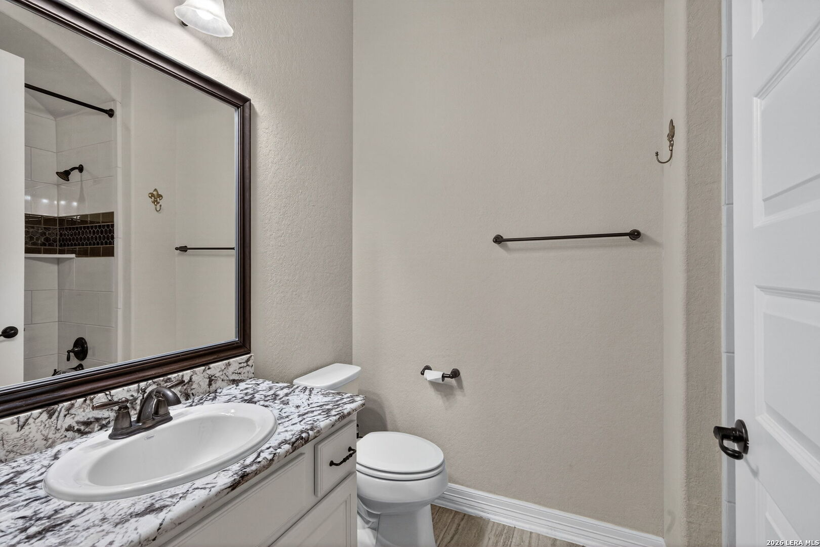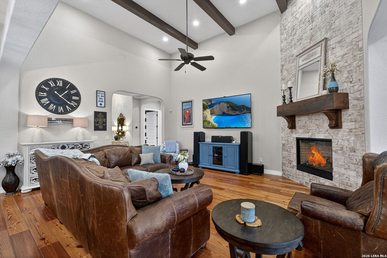 Welcome to refined Hill Country living in the gated community of Balcones Creek. Built by Sitterle in 2018 and thoughtfully designed for comfort and longevity, this one story garden home residence offers approximately 2,500 square feet of well curated living space with three bedrooms and three and a half baths, including a private casita ideal for guests or multigenerational living. From the moment you enter, the home impresses with soaring 16 foot ceilings in the great room, 10 foot ceilings throughout, and eight foot doors that enhance the sense of scale and light. Goodwin reclaimed heart of pine flooring runs throughout the main living areas and bedrooms, offering timeless character and durability, while refined finishes such as Emtek cabinet hardware, custom lighting, and a fireplace mantel crafted by Alamo Hardwoods elevate the overall design. The open kitchen is anchored by an oversized quartz island and flows seamlessly into the living and dining spaces, making it ideal for everyday living and effortless entertaining. The primary suite is a true retreat with a spa inspired bath, generous walk in closet, and serene privacy. Energy efficiency and comfort are prioritized with spray foam insulation, a Trane high efficiency dual zoned HVAC system, and a Google WiFi mesh network. Outdoor living is equally inviting with a covered patio, mature trees, privacy fencing, and a hot tub that conveys with the home. The three car tandem garage provides ample storage and flexibility. Lawn care and monitored security are included through the HOA, allowing for low maintenance living. Balcones Creek residents enjoy controlled access, a resort style pool, clubhouse, parks, and scenic jogging trails, all just minutes from Boerne's award winning schools, shopping, dining, and Hill Country charm. This home offers the rare combination of quality construction, thoughtful upgrades, and a lock and leave lifestyle in one of Boerne's most desirable communities.