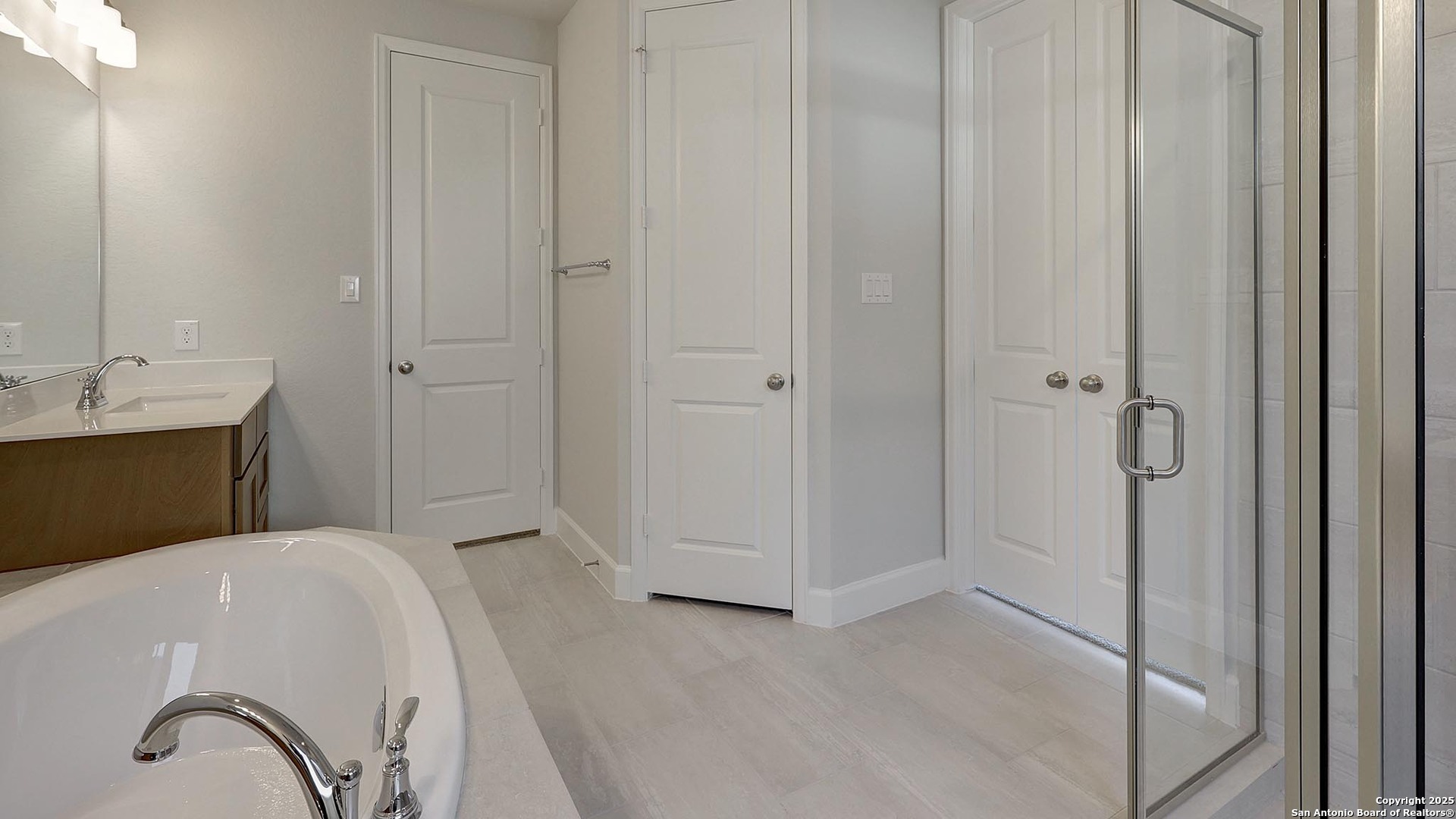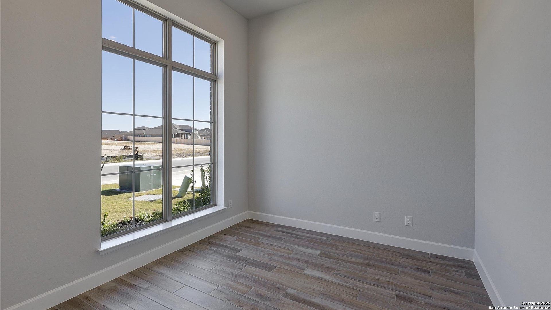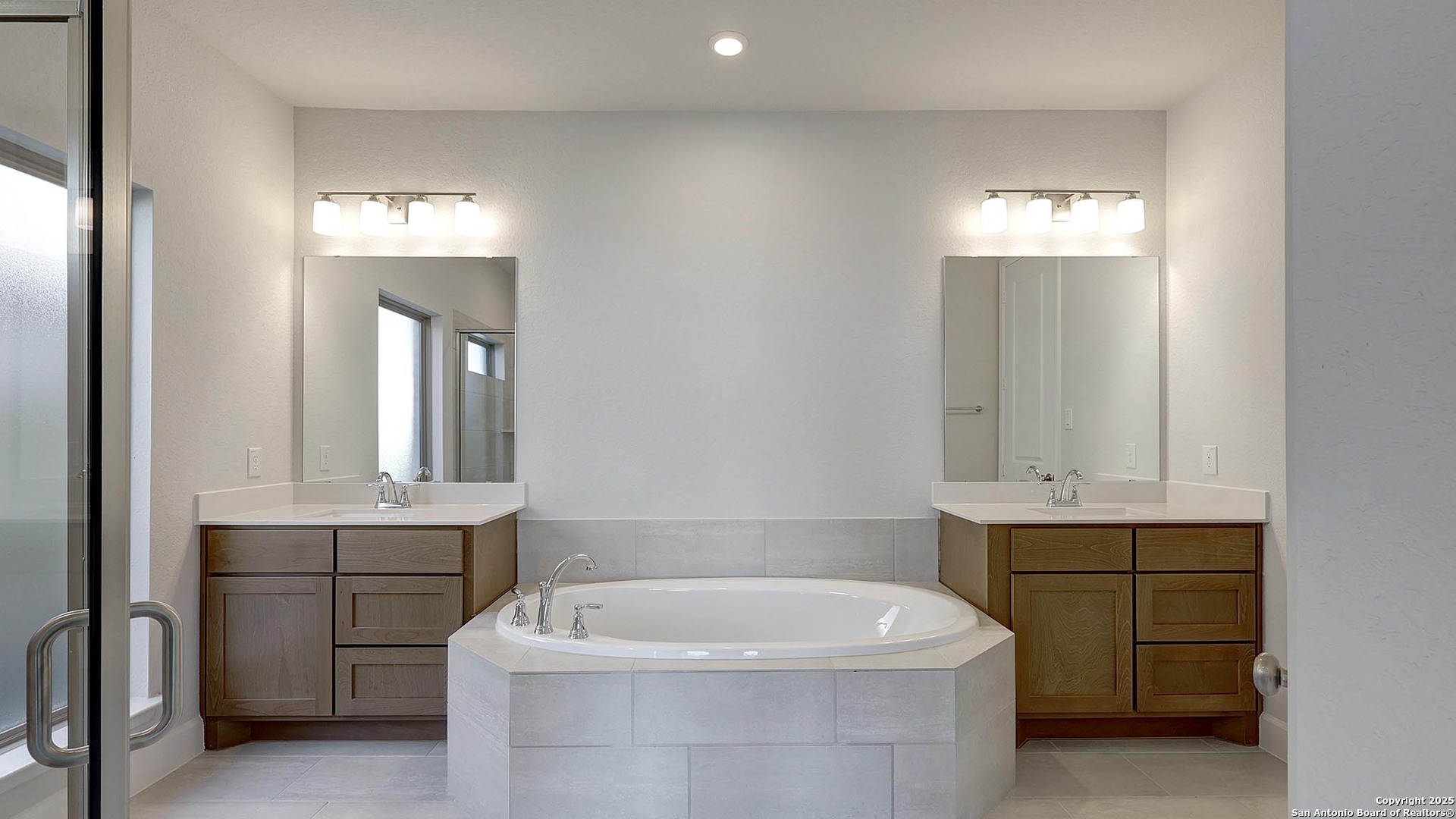 Home office with French doors and 11-foot ceiling set at two-story entry. Open kitchen features deep walk-in pantry, 5-burner gas cooktop and generous island with built-in seating space. Dining area opens to two-story family room with a sliding glass door. Primary suite includes bedroom with 10-foot tray ceiling. Double doors lead to primary bath with dual vanity, garden tub, separate glass-enclosed shower and large walk-in closet. An additional bedroom is downstairs. Secondary bedrooms and game room with 10-foot tray ceiling are upstairs. Covered backyard patio with landscaping featuring a 5-zone sprinkler system. Mud room off two-car garage.