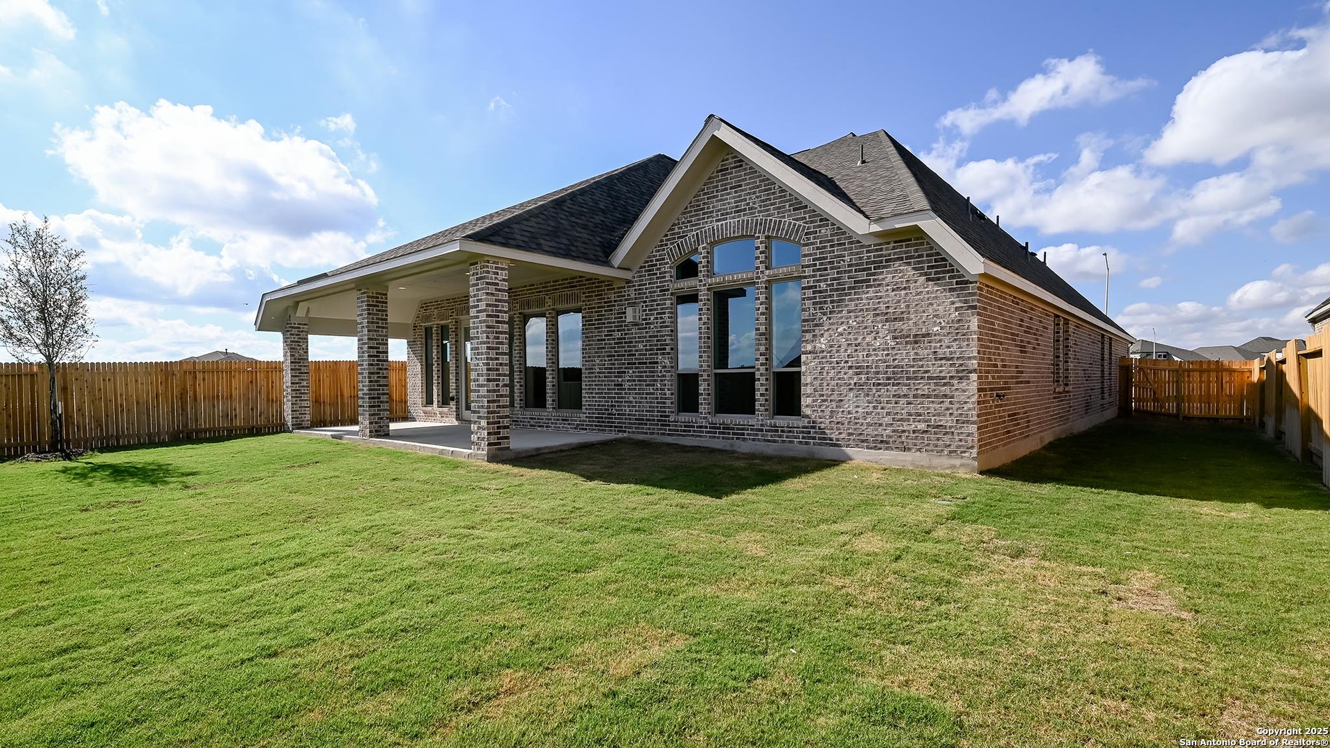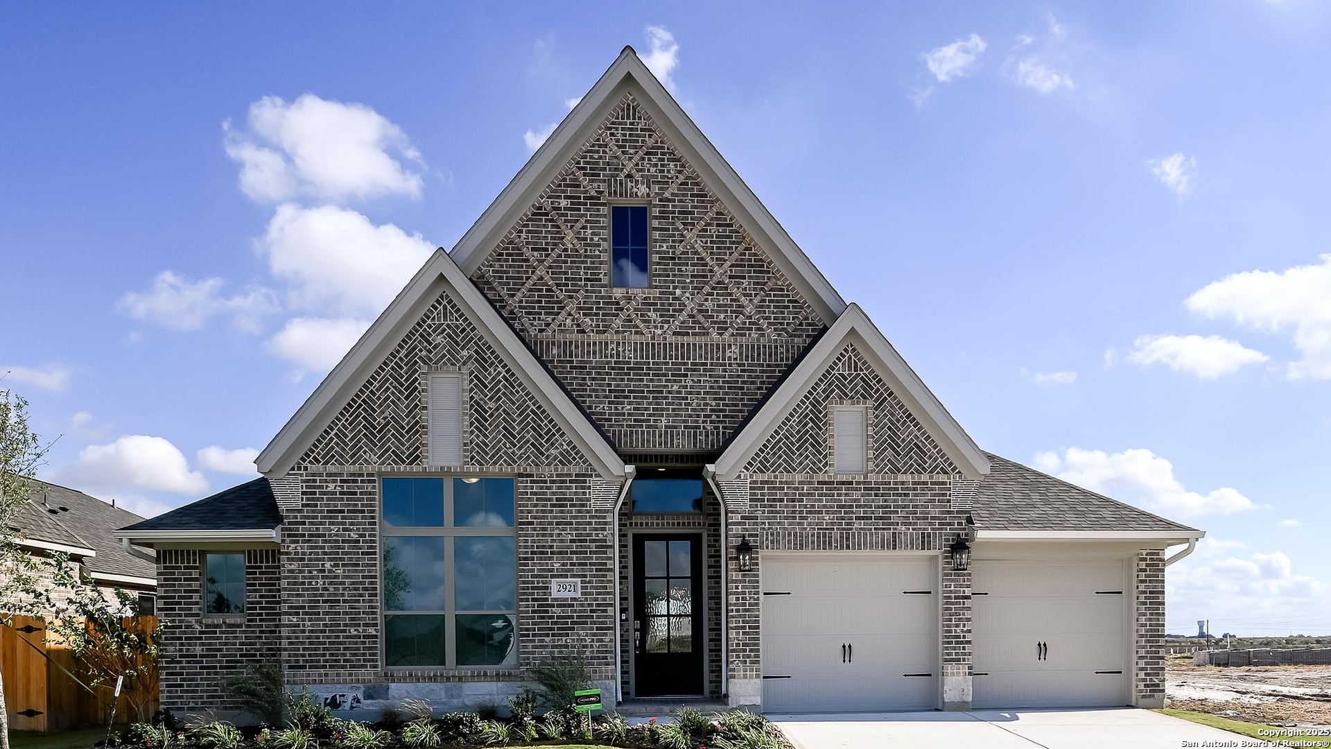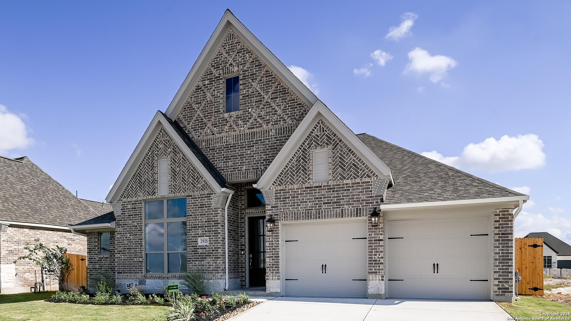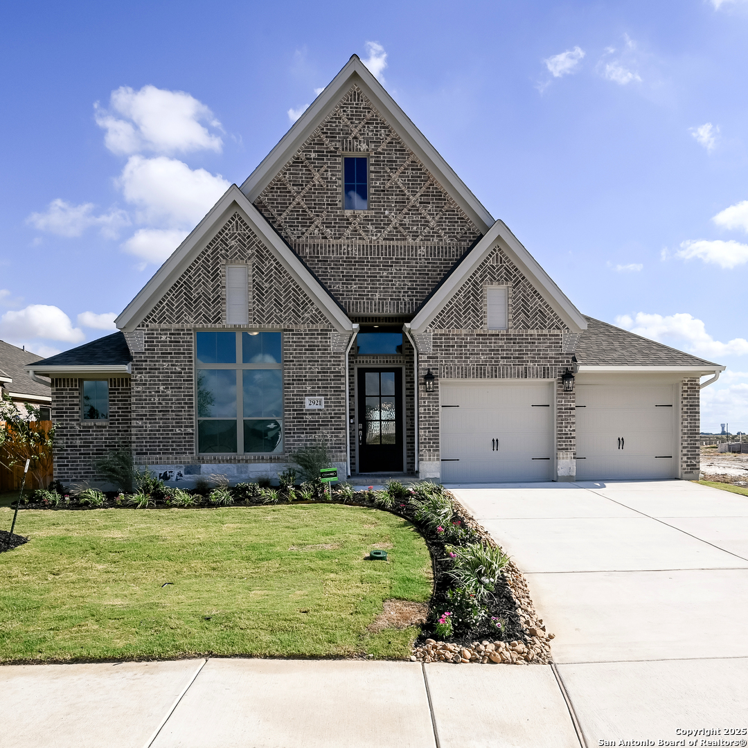 Entry welcomes with 12-foot ceiling. Game room with French doors and 12-foot ceiling off extended entry. Kitchen and dining area open to spacious family room with a wood mantel fireplace and wall of windows. Kitchen hosts inviting island with built-in seating space and 5-burner gas cooktop. Primary suite includes bedroom with 12-foot ceiling. Double doors lead to primary bath with dual vanities, freestanding tub, separate glass-enclosed shower and two walk-in closets. Abundant closet space and natural light throughout. Extended covered backyard patio. Mud room off three-car garage.