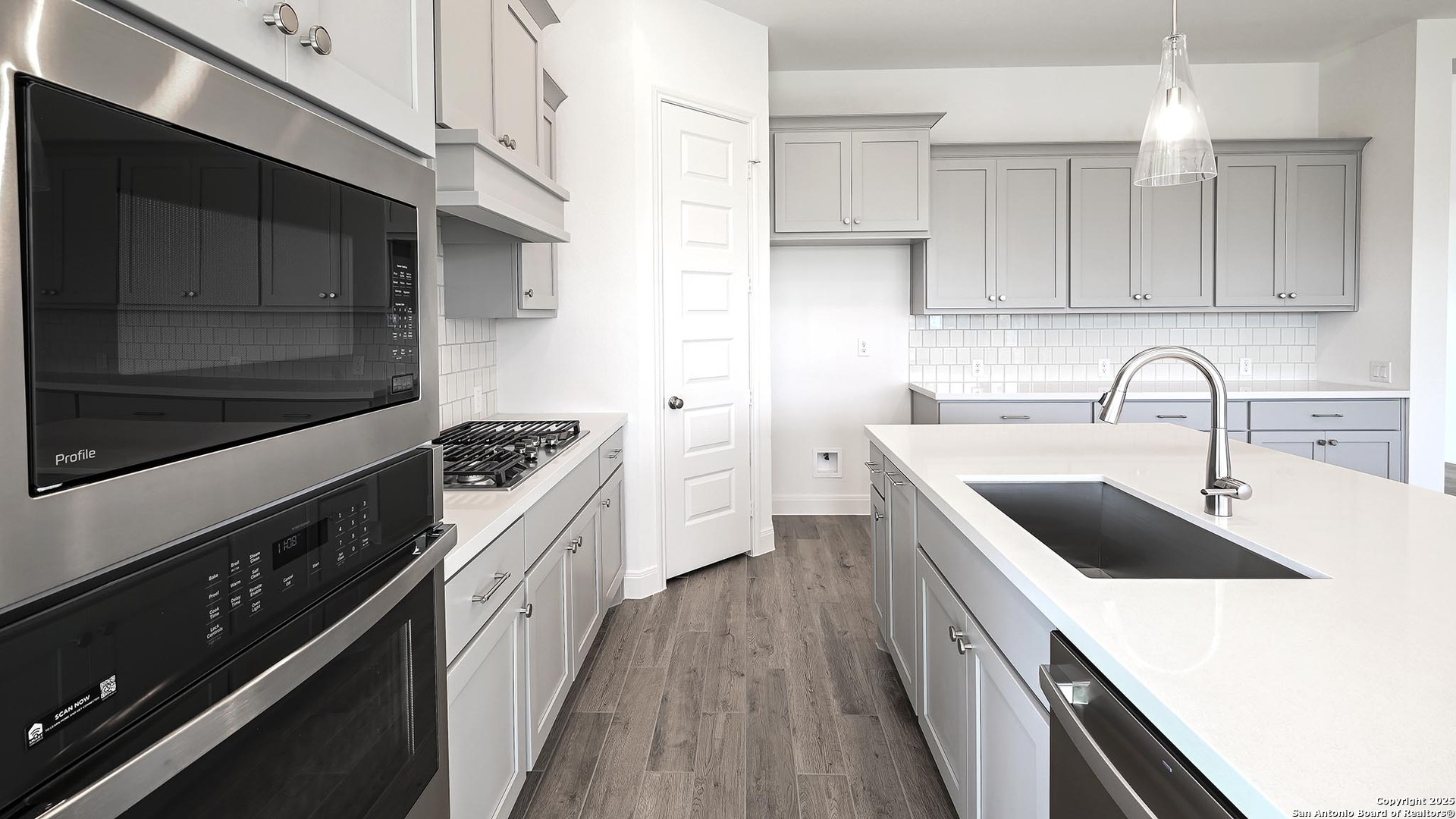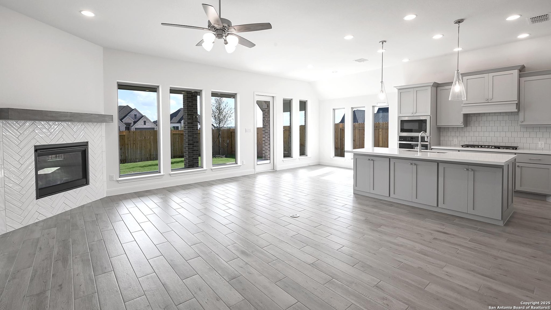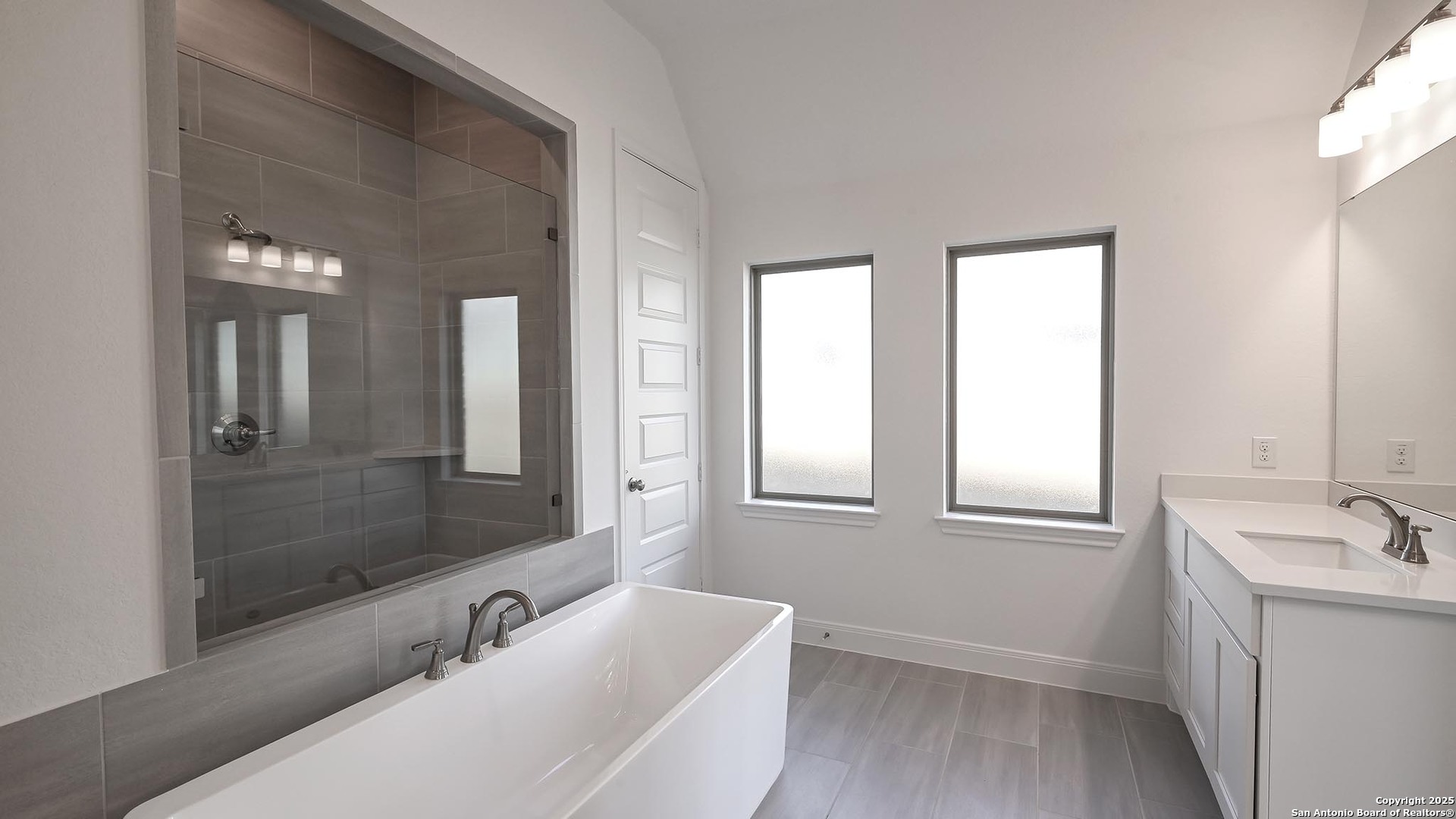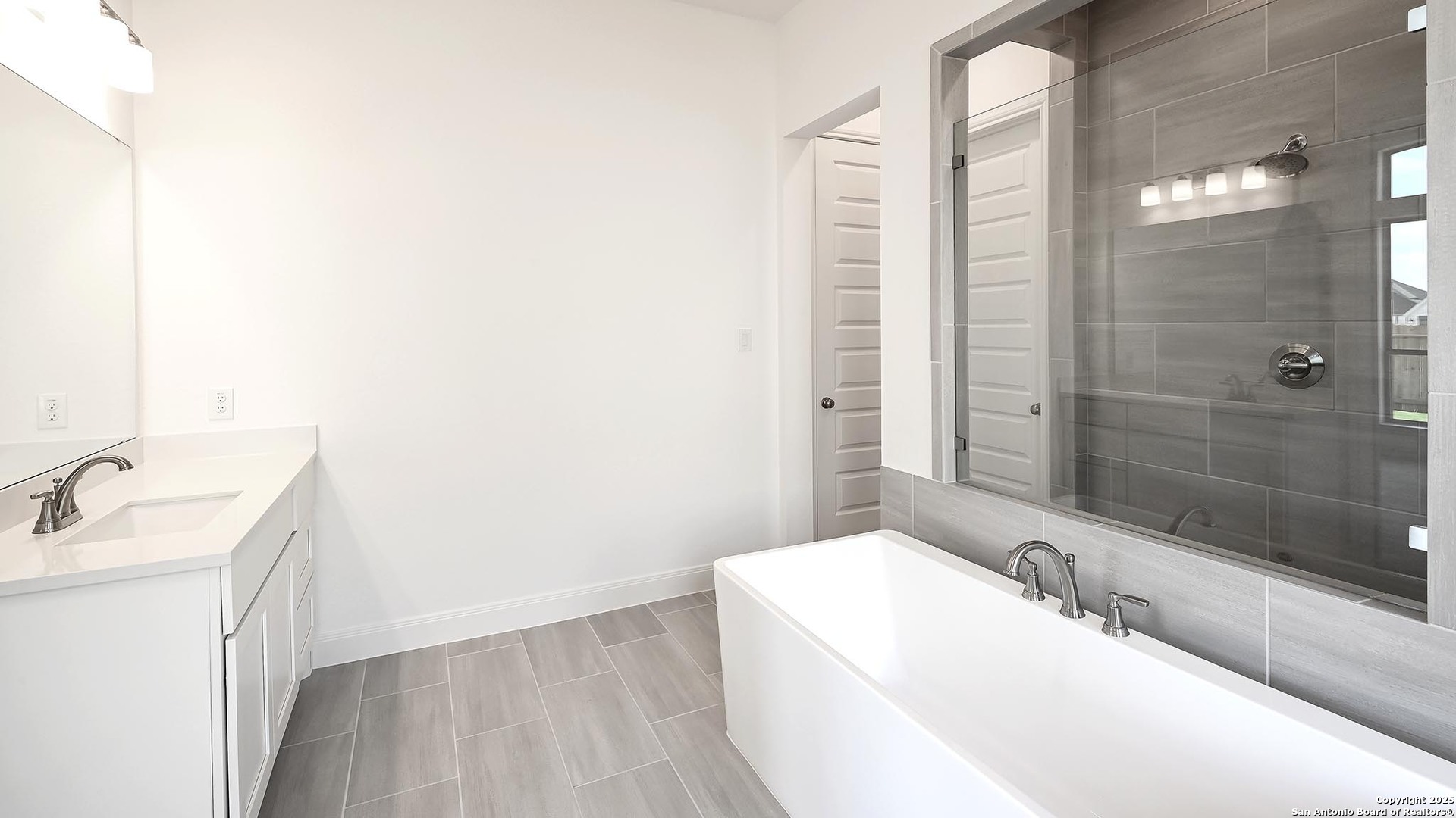 Entry welcomes with 12-foot ceiling. Game room with French doors and 12-foot ceiling off extended entry. Kitchen and dining area open to spacious family room with a wood mantel fireplace and wall of windows. Kitchen hosts inviting island with built-in seating space and 5-burner gas cooktop. Primary suite includes bedroom with 12-foot ceiling. Double doors lead to primary bath with dual vanities, freestanding tub, separate glass-enclosed shower and two walk-in closets. Abundant closet space and natural light throughout. Extended covered backyard patio. Mud room off three-car garage.