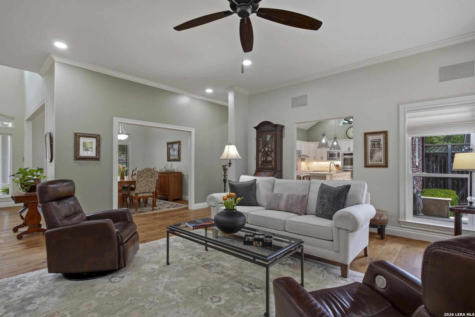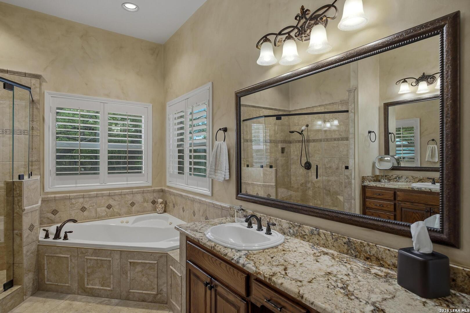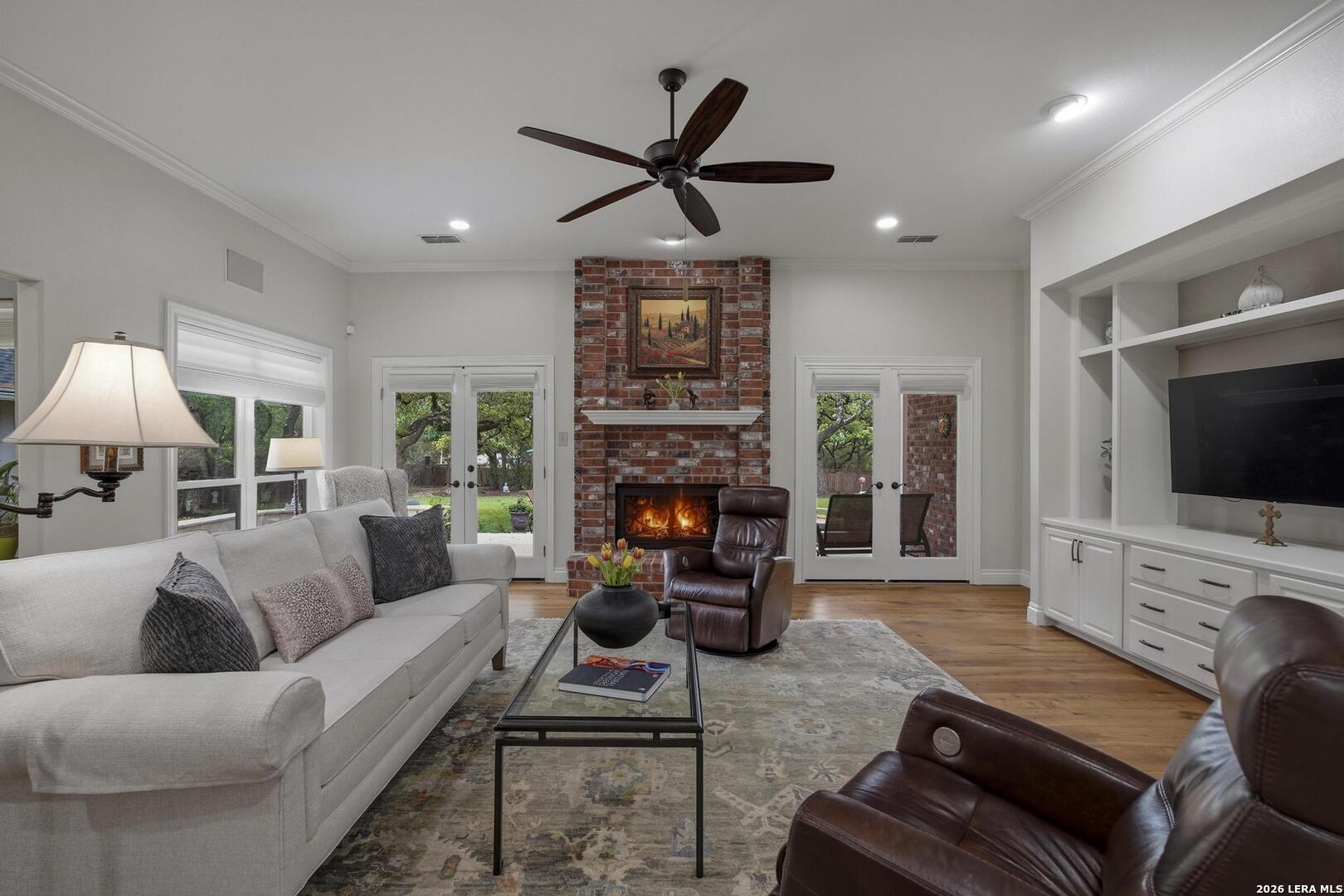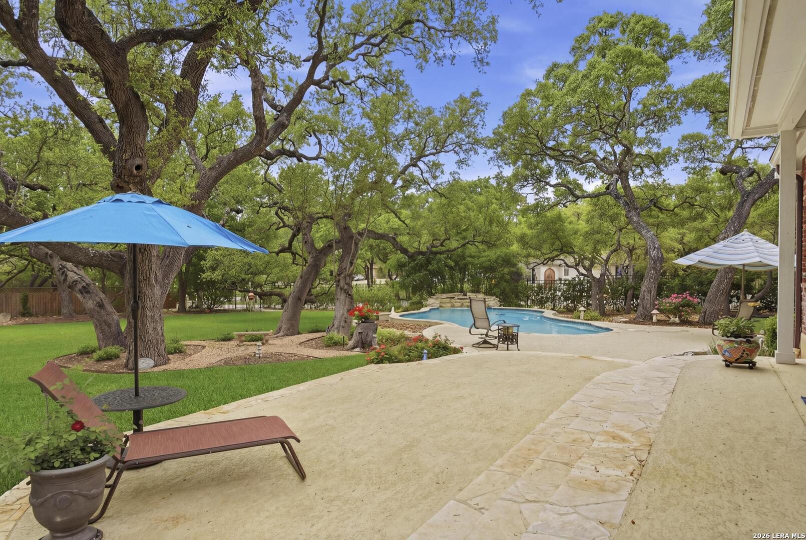 Nestled beneath majestic live oaks in the prestigious, guard-gated community of Raintree Woods, this exceptional custom Hill Country estate offers nearly an acre of privacy, elegance, and resort-style living in the heart of Fair Oaks Ranch. Designed for both luxury and livability, the open-concept floor plan features soaring ceilings, expansive windows, and abundant natural light, creating a warm yet sophisticated ambiance throughout. The grand living room showcases rich hardwood floors, custom built-ins, and a wood-burning fireplace, perfect for refined entertaining or relaxed evenings at home. At the center of it all, the chef-inspired kitchen is equipped with Quartzite countertops, custom wood cabinetry, double ovens, an induction cooktop, and an oversized island with prep sink-ideal for hosting gatherings and everyday living alike. The luxurious primary suite is a private retreat, featuring a spa-like bath with soaking tub, oversized walk-in shower, and generous walk-in closet. A main-level guest suite with ensuite bath offers flexibility for multigenerational living, executive office space, or private accommodations. Work from home in the dedicated study with hardwood flooring, The upstairs game/media room with built-in shelves and desk area provides the perfect setting for movie nights, homework or entertaining. Two additional bedrooms with walk-in closets and a true Jack-and-Jill bath with Italian Tile & Quartzite counters complete the upper level. Step outside to your fully fenced and gated .996-acre private backyard oasis, where a sparkling pool, covered patio, lush gardens, and mature trees create a serene, resort-style retreat with ample space for outdoor living, entertaining, gardening, or future enhancements. Enjoy the luxury lifestyle of Fair Oaks Ranch, with optional membership to the Fair Oaks Ranch Golf & Country Club featuring 36 holes of championship golf, tennis, pickleball, fitness center, resort-style pools, and a vibrant social scene. Luxury, privacy, and Hill Country charm-this is the one buyers have been waiting for!