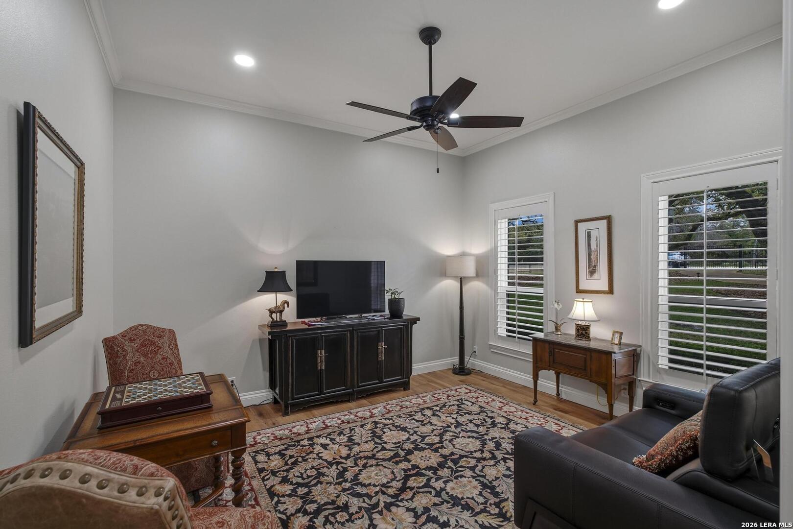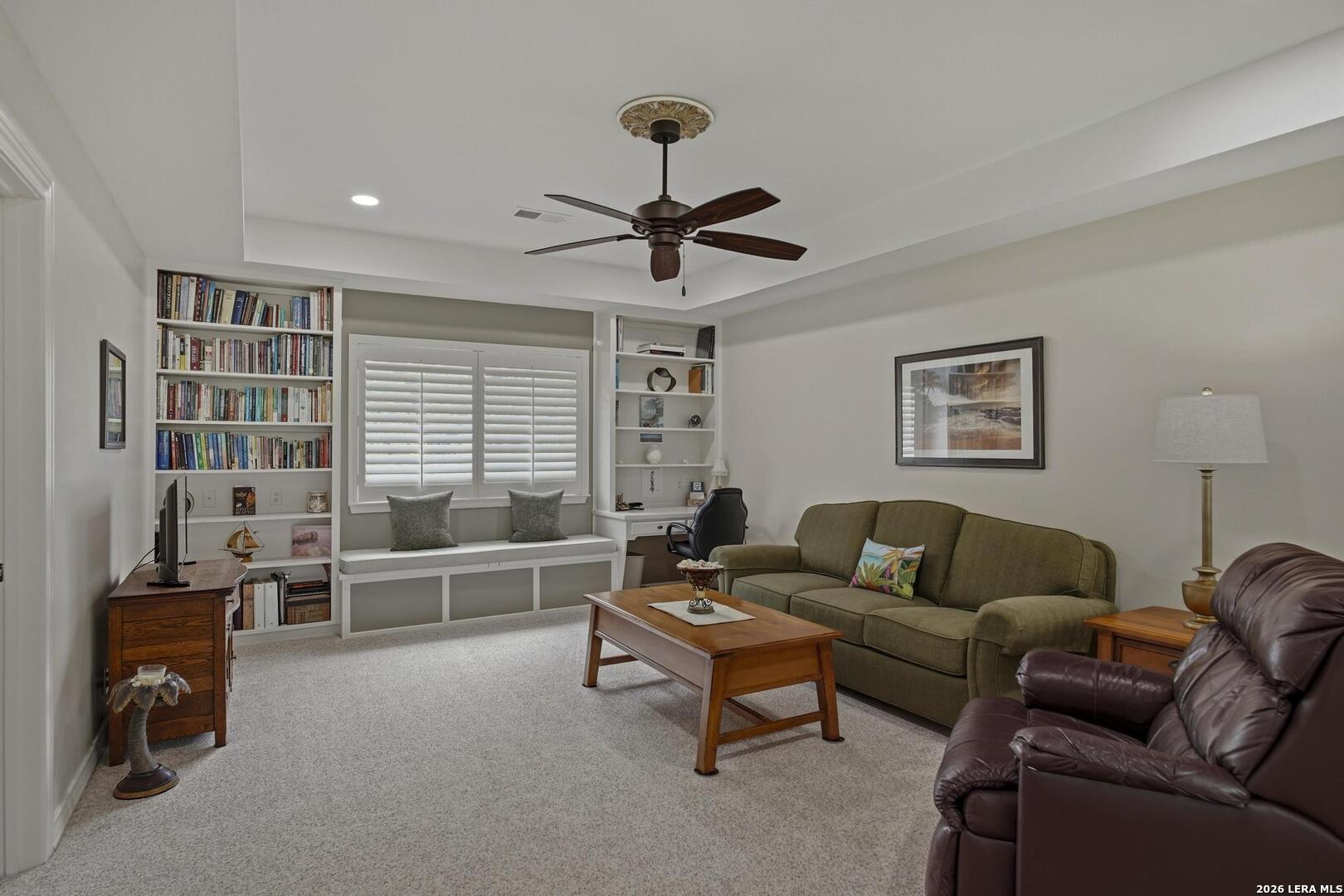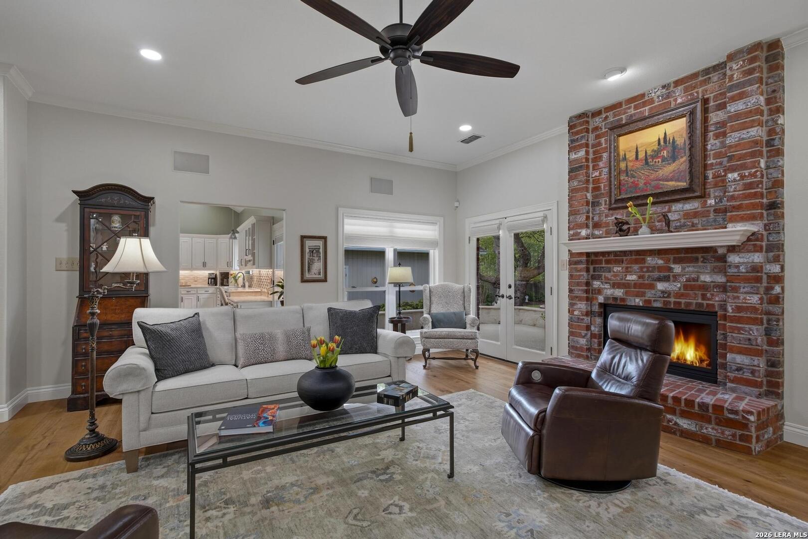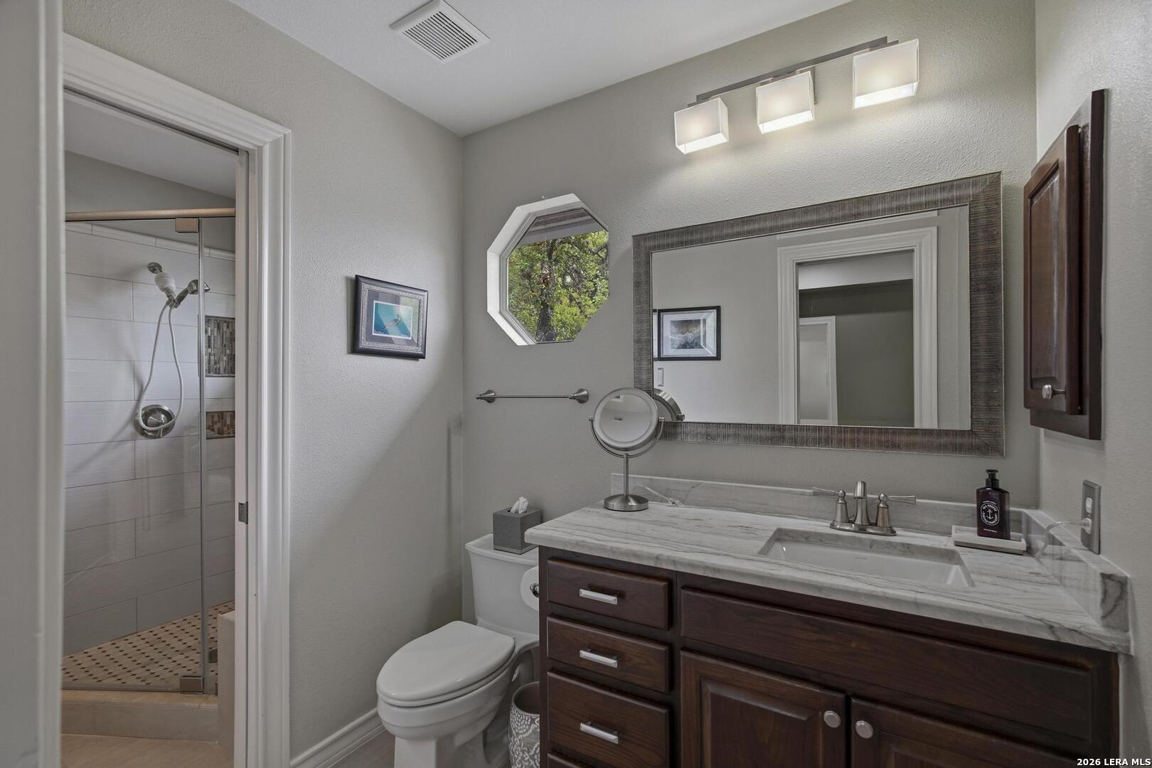 Nestled beneath majestic live oaks in the prestigious, guard-gated community of Raintree Woods, this exceptional custom Hill Country estate offers nearly an acre of privacy, elegance, and resort-style living in the heart of Fair Oaks Ranch. Designed for both luxury and livability, the open-concept floor plan features soaring ceilings, expansive windows, and abundant natural light, creating a warm yet sophisticated ambiance throughout. The grand living room showcases rich hardwood floors, custom built-ins, and a wood-burning fireplace, perfect for refined entertaining or relaxed evenings at home. At the center of it all, the chef-inspired kitchen is equipped with Quartzite countertops, custom wood cabinetry, double ovens, an induction cooktop, and an oversized island with prep sink-ideal for hosting gatherings and everyday living alike. The luxurious primary suite is a private retreat, featuring a spa-like bath with soaking tub, oversized walk-in shower, and generous walk-in closet. A main-level guest suite with ensuite bath offers flexibility for multigenerational living, executive office space, or private accommodations. Work from home in the dedicated study with hardwood flooring, The upstairs game/media room with built-in shelves and desk area provides the perfect setting for movie nights, homework or entertaining. Two additional bedrooms with walk-in closets and a true Jack-and-Jill bath with Italian Tile & Quartzite counters complete the upper level. Step outside to your fully fenced and gated .996-acre private backyard oasis, where a sparkling pool, covered patio, lush gardens, and mature trees create a serene, resort-style retreat with ample space for outdoor living, entertaining, gardening, or future enhancements. Enjoy the luxury lifestyle of Fair Oaks Ranch, with optional membership to the Fair Oaks Ranch Golf & Country Club featuring 36 holes of championship golf, tennis, pickleball, fitness center, resort-style pools, and a vibrant social scene. Luxury, privacy, and Hill Country charm-this is the one buyers have been waiting for!