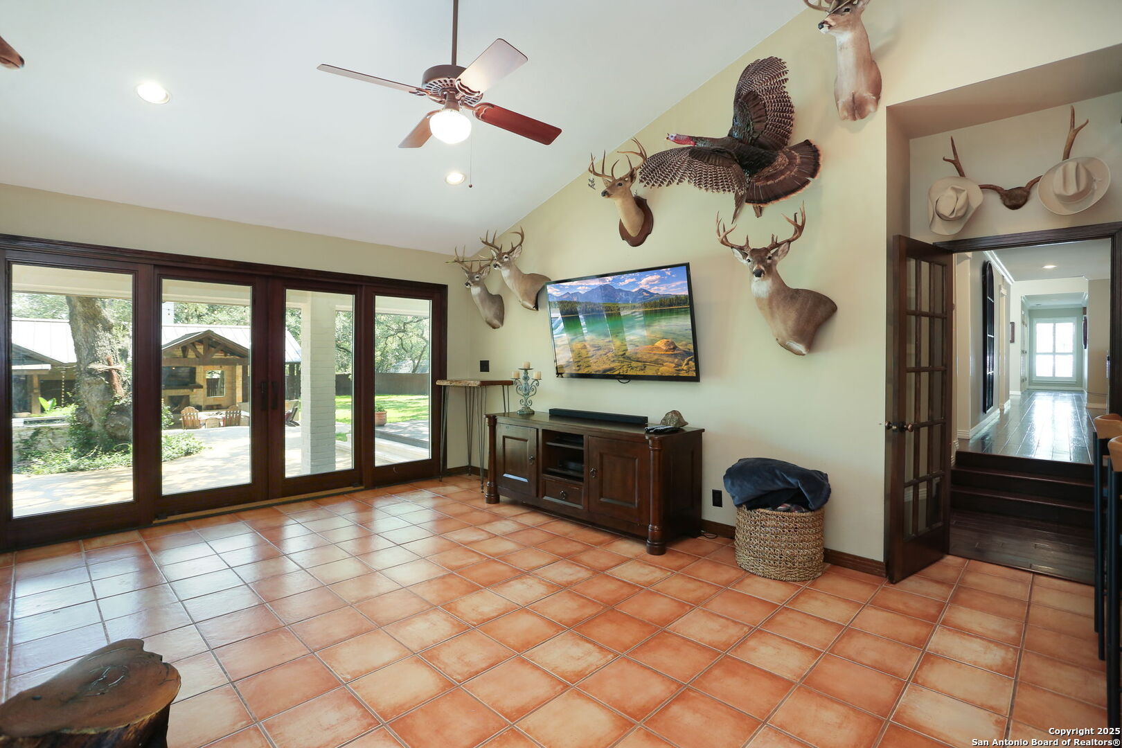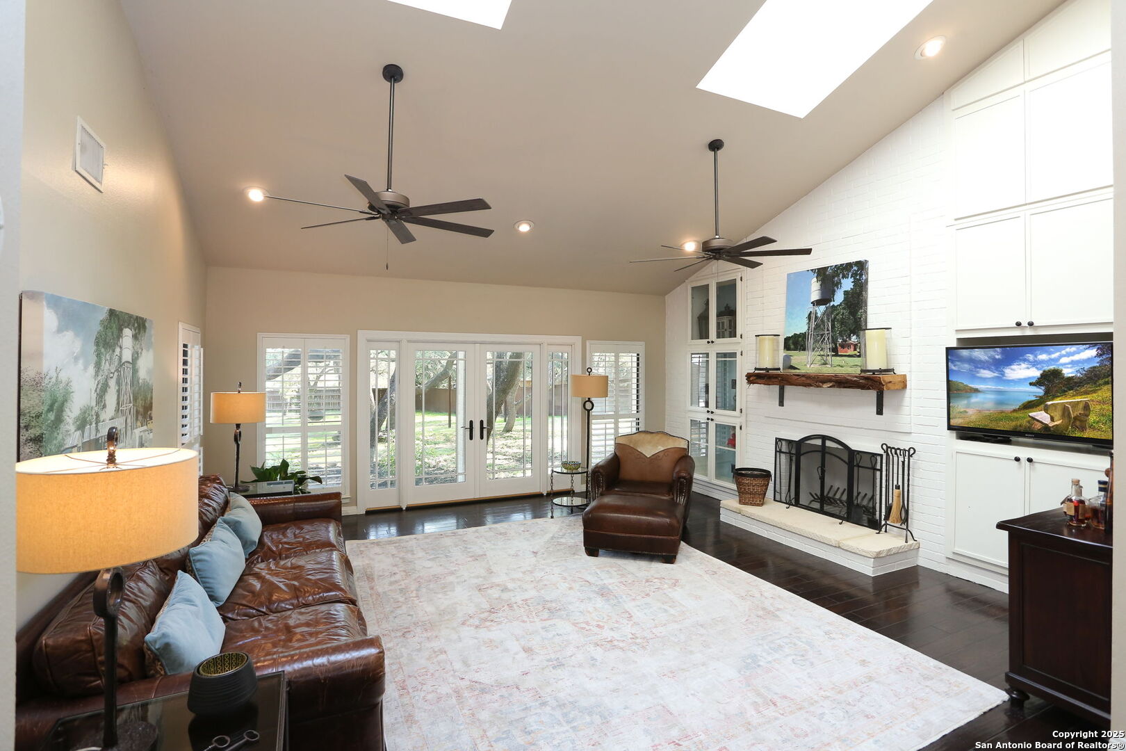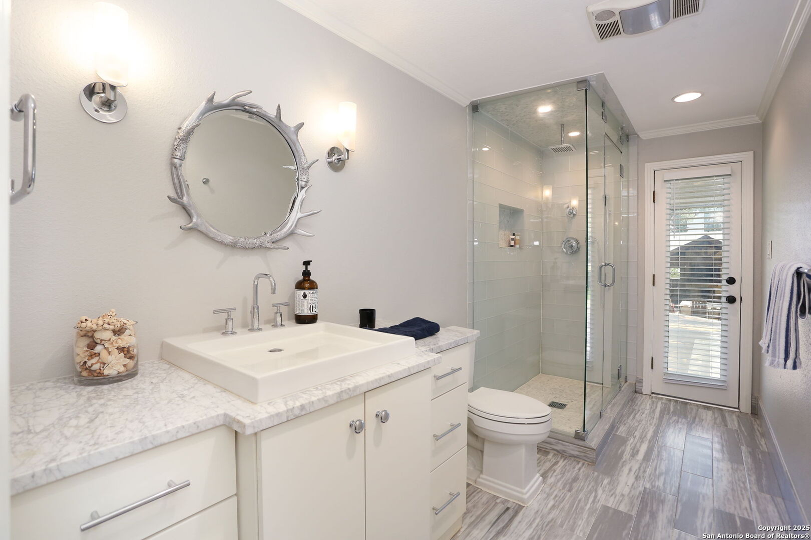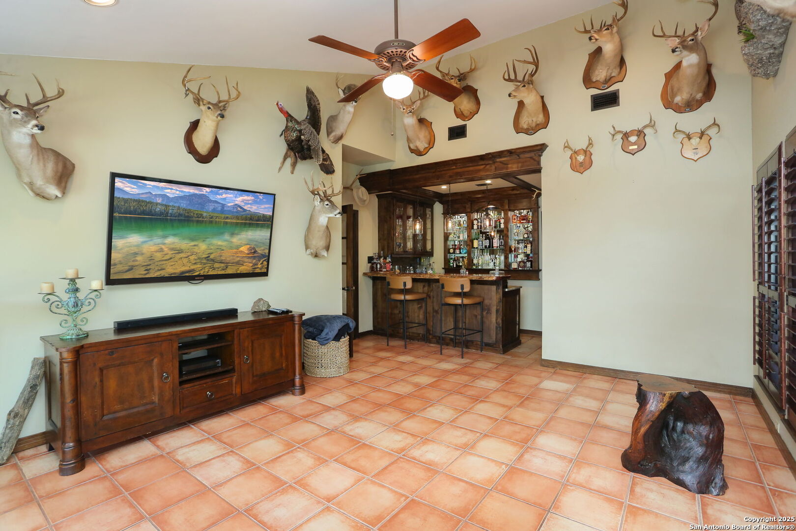 Experience luxury living in this newly renovated 5BR/4BA estate on .96 acres in the prestigious, manned-gate Raintree Woods of Fair Oaks Ranch. Steps from Fair Oaks Ranch Country Club, this home offers refined living with a 3-car garage, office with built-ins, and a "Man Cave" with wet bar, Sub-Zero mini fridge, and Scotsman ice maker. Dual-level design features a main-level primary suite and guest/office, plus 3 upstairs bedrooms. The kitchen dazzles with Sub-Zero fridge, 30" wine fridge, Wolfe range, and bar seating. An entertainer's paradise awaits outdoors, featuring a resort-style pool and spa with a swim-up bar, an impressive 1,100 sq. ft. covered kitchen outfitted with premium Lynx appliances, a Green Egg, ample storage space, surround sound, 2 televisions, and a gas-lit fireplace-plus a Coolstone firepit with bar seating, perfect for gathering any time of year. Gated elegance meets country club lifestyle on Seabiscuit Dr.