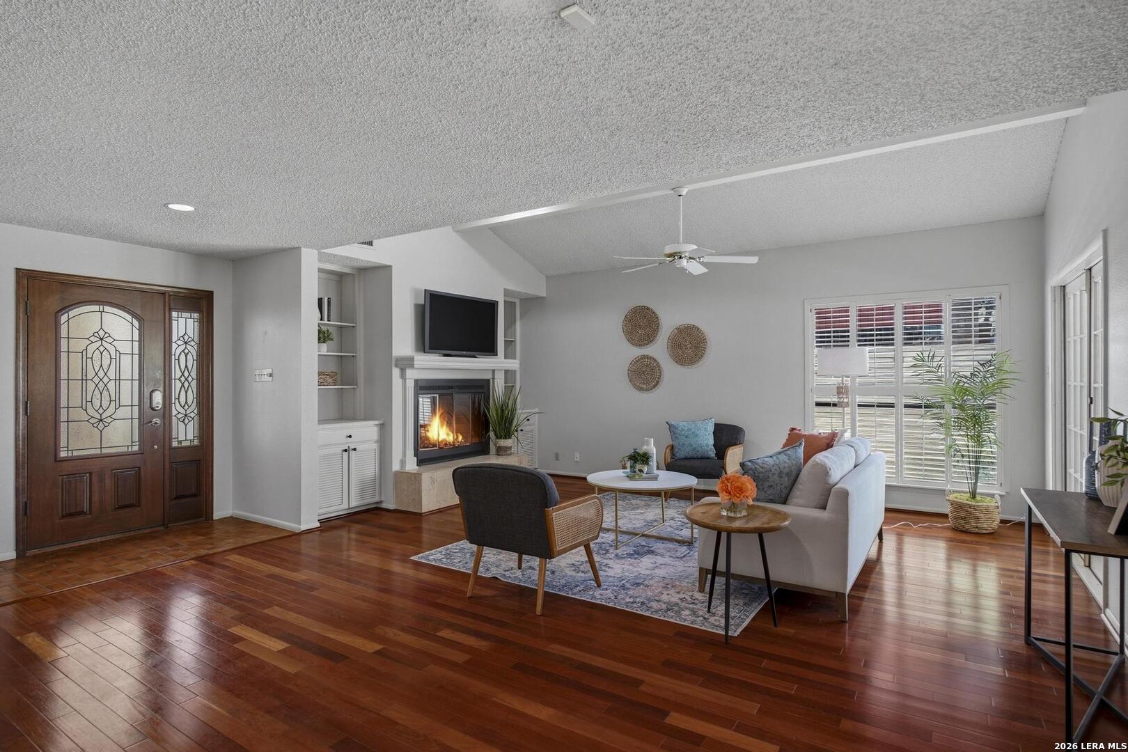 OPEN HOUSE SUNDAY APRIL 12 - 12-2PM. Welcome to this beautiful home overlooking the #2 hole of the Live Oak Golf Course in Fair Oaks Ranch. Perfectly positioned to capture peaceful golf course views, the home offers a wonderful blend of comfort, elegance, and relaxed Hill Country living. Step inside to a spacious family room featuring rich wood floors, expansive windows that frame the lush fairway, a cozy fireplace, and custom built-ins for both storage and display. The kitchen is thoughtfully designed with quartz countertops, a breakfast bar, new oven and cooktop, abundant custom cabinetry, a pantry, and a large utility room including washer and dryer. The generous breakfast and dining area enjoys scenic views, creating a lovely setting for morning coffee or evening meals. The spacious primary suite offers a private retreat with a sitting area or office space, plantation shutters, and a spa-inspired bathroom with multiple closets, including a large walk-in closet. Upstairs, you'll find two additional bedrooms and a full bath, providing comfortable accommodations for family or guests. Step outside to the covered back patio where you can relax and enjoy tranquil golf course views and beautiful Texas evenings. Located just a short walk or golf cart ride from Fair Oaks Ranch Golf & Country Club, members enjoy access to 36 holes of championship golf, tennis, pickleball, swimming pools, a fitness center, clubhouse dining, and a vibrant calendar of social events. Additional features include a beautiful gated courtyard, two-car garage with extra storage closets, a workbench area, and space for golf cart parking. HOA dues cover lawn maintenance!