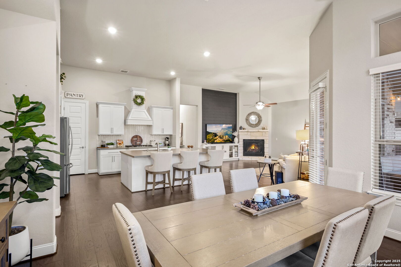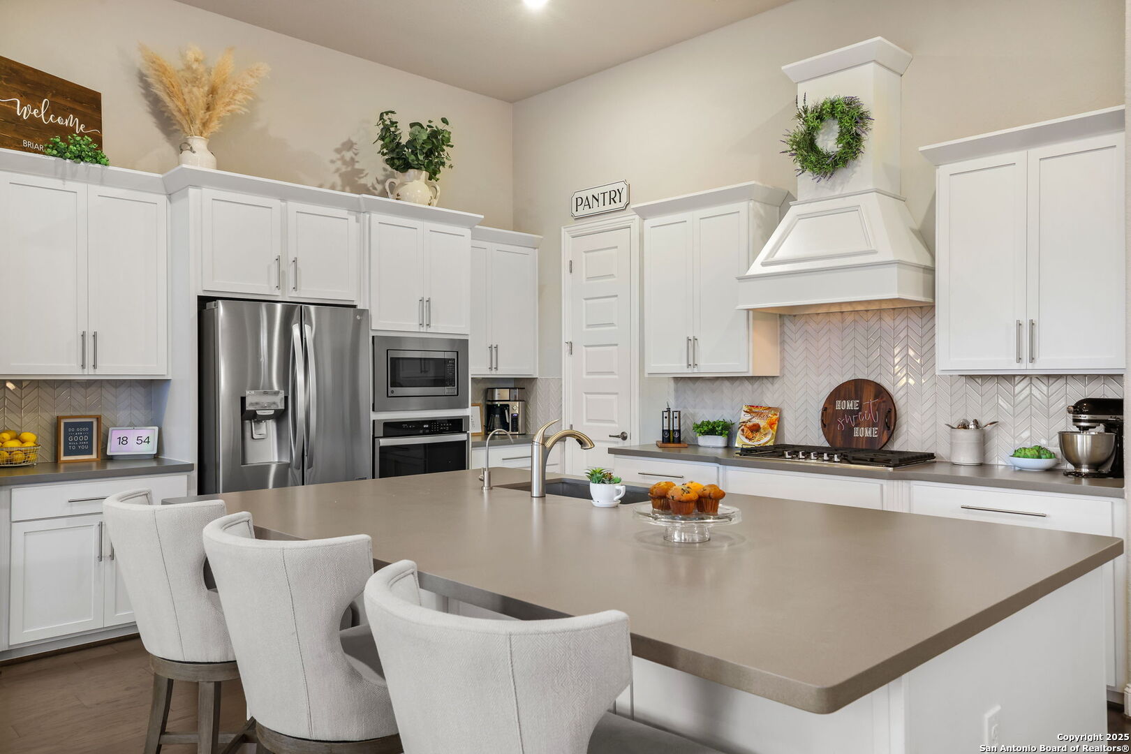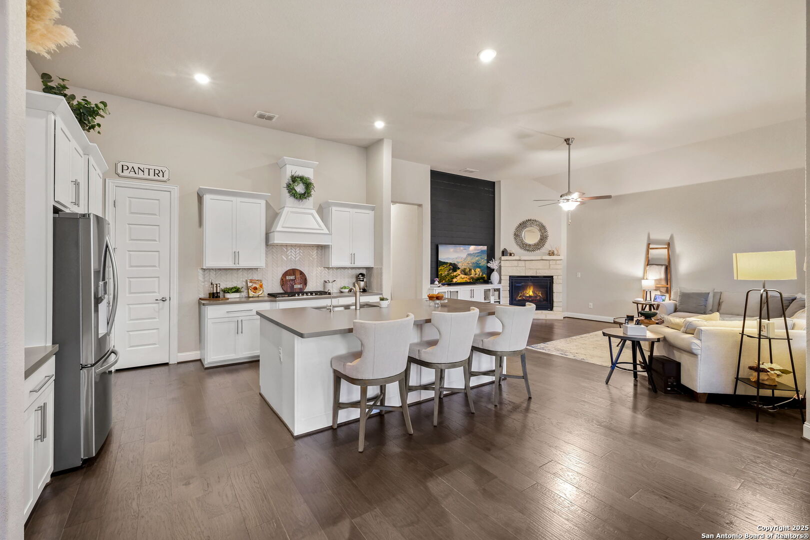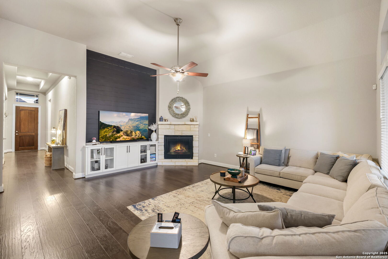 Discover your dream home in this stunning move-in-ready home that perfectly combines modern style with everyday comfort. This one story beauty features great curb appeal, open layout with natural light throughout, tall ceilings and a private study with French doors. The living room is a true highlight, showcasing a modern accent wall, custom shelving unit, and a cozy stone gas fireplace. Gorgeous white kitchen features a grand island, gas stove, glass tile backsplash, stainless steel appliances, pull-out drawers and connects to your spacious dining room ideal for endless entertainment! The primary suite is private, complete with a garden tub, dual vanities, and a large closet with a built-in make-ready mirror. Enjoy relaxing evenings on your covered cozy patio with ambient lighting. Located just minutes from IH-10, Hwy. 46, Boerne High School, parks, shopping, and dining options, this home offers both convenience and comfort. Don't miss this opportunity, schedule your showing today and see everything this amazing home has to offer!