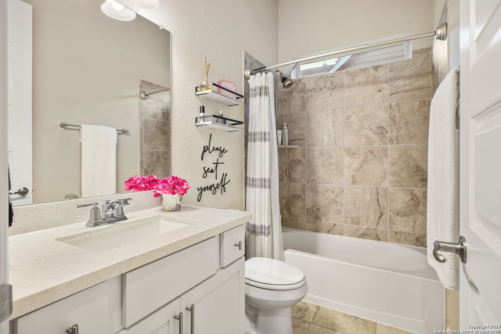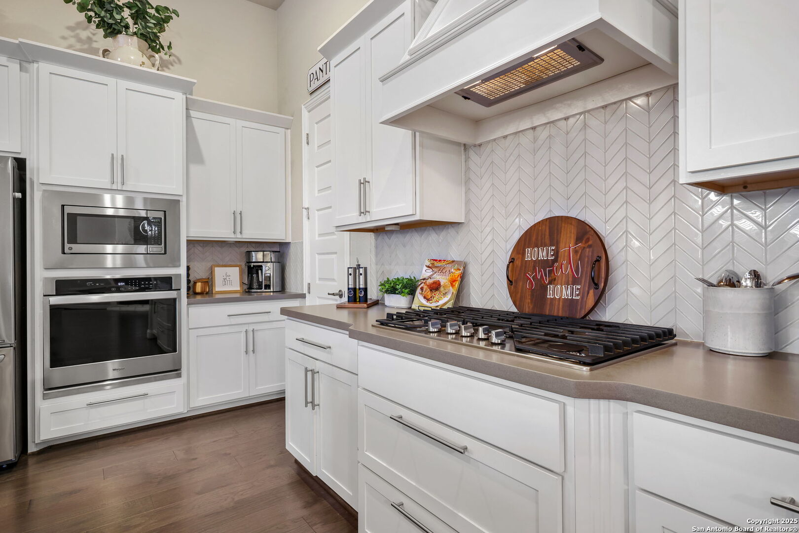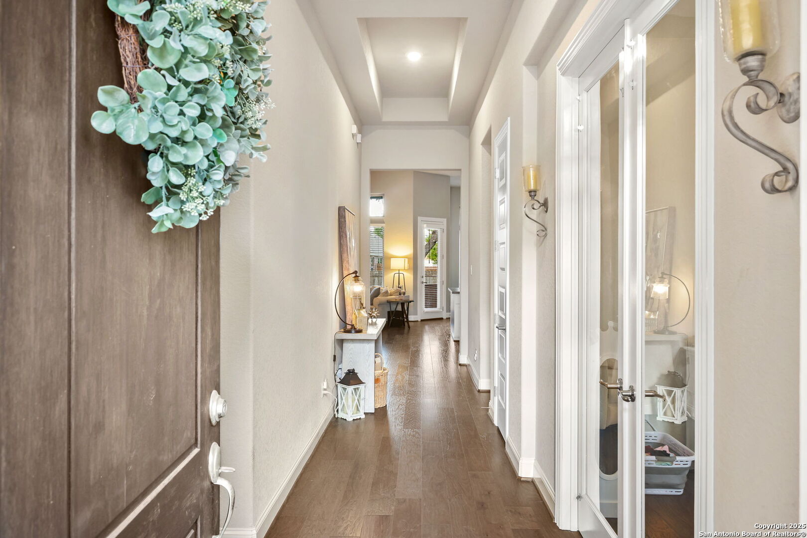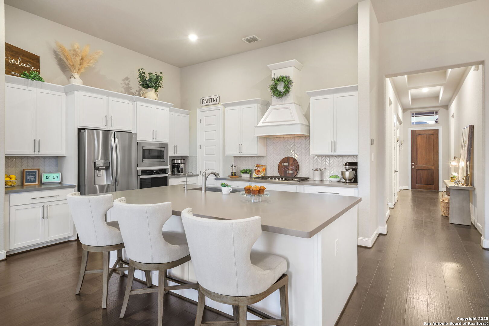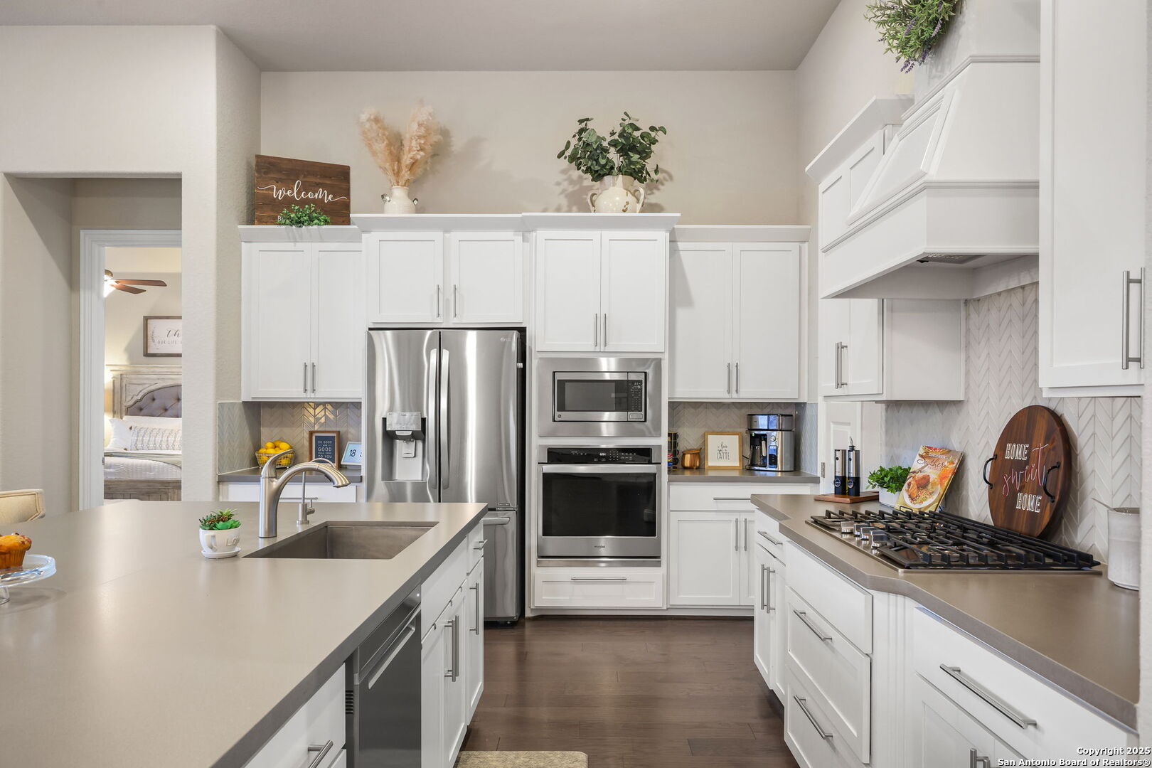 Discover your dream home in this stunning move-in-ready home that perfectly combines modern style with everyday comfort. This one story beauty features great curb appeal, open layout with natural light throughout, tall ceilings and a private study with French doors. The living room is a true highlight, showcasing a modern accent wall, custom shelving unit, and a cozy stone gas fireplace. Gorgeous white kitchen features a grand island, gas stove, glass tile backsplash, stainless steel appliances, pull-out drawers and connects to your spacious dining room ideal for endless entertainment! The primary suite is private, complete with a garden tub, dual vanities, and a large closet with a built-in make-ready mirror. Enjoy relaxing evenings on your covered cozy patio with ambient lighting. Located just minutes from IH-10, Hwy. 46, Boerne High School, parks, shopping, and dining options, this home offers both convenience and comfort. Don't miss this opportunity, schedule your showing today and see everything this amazing home has to offer!