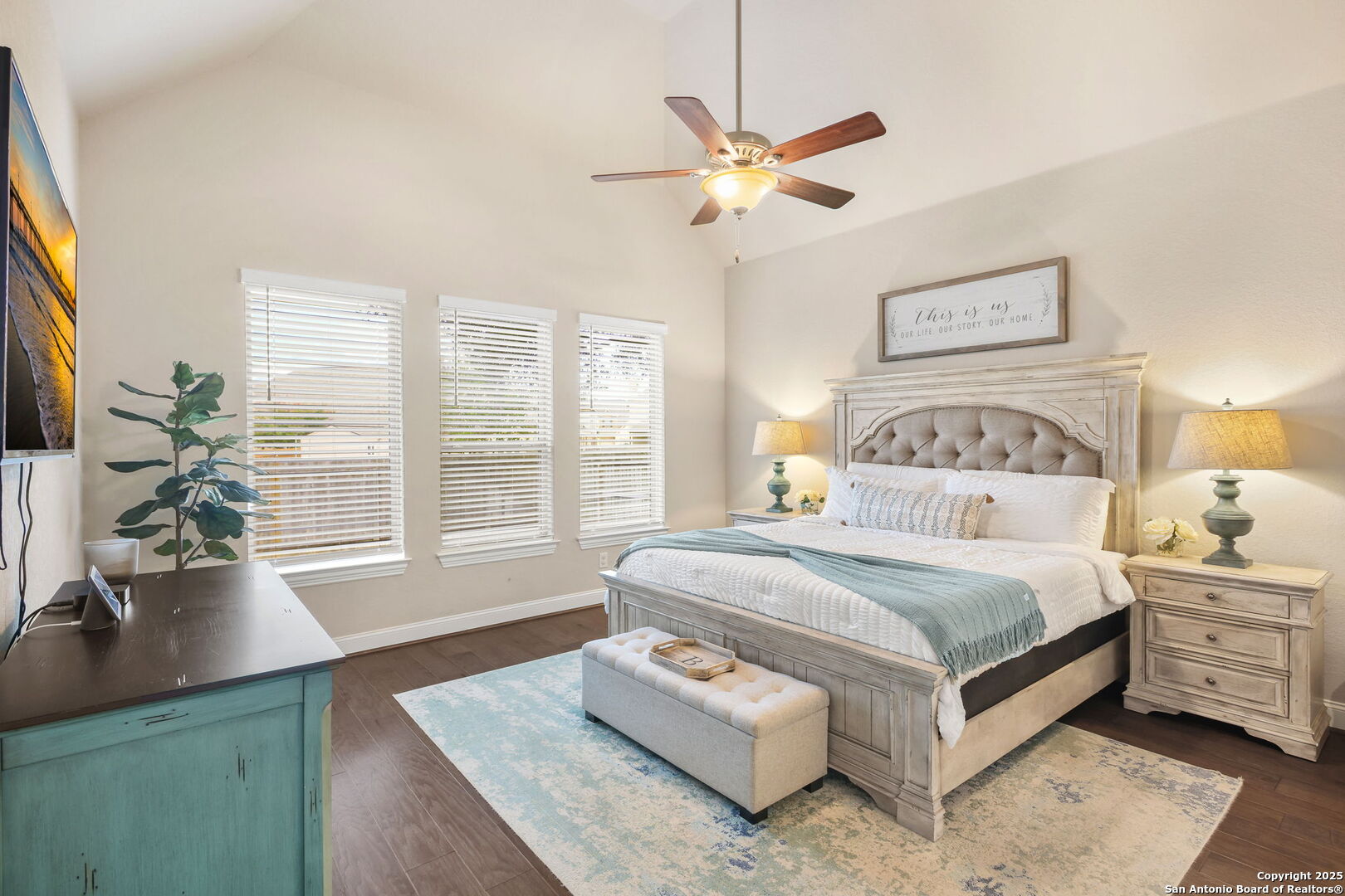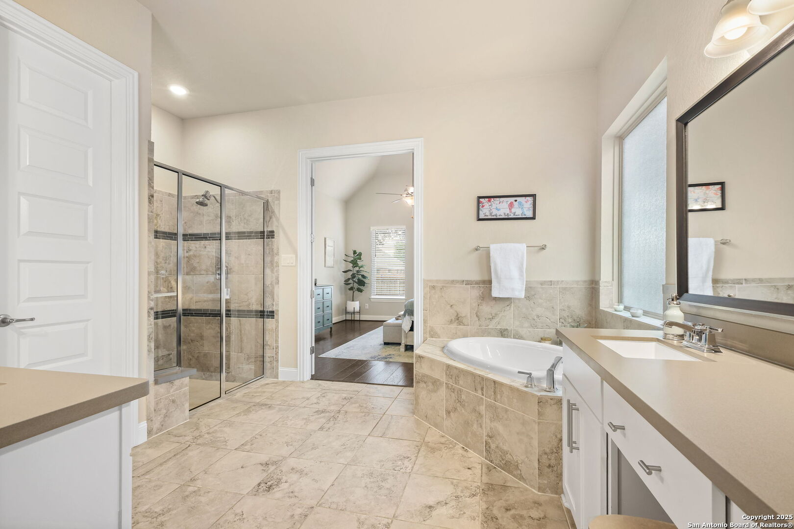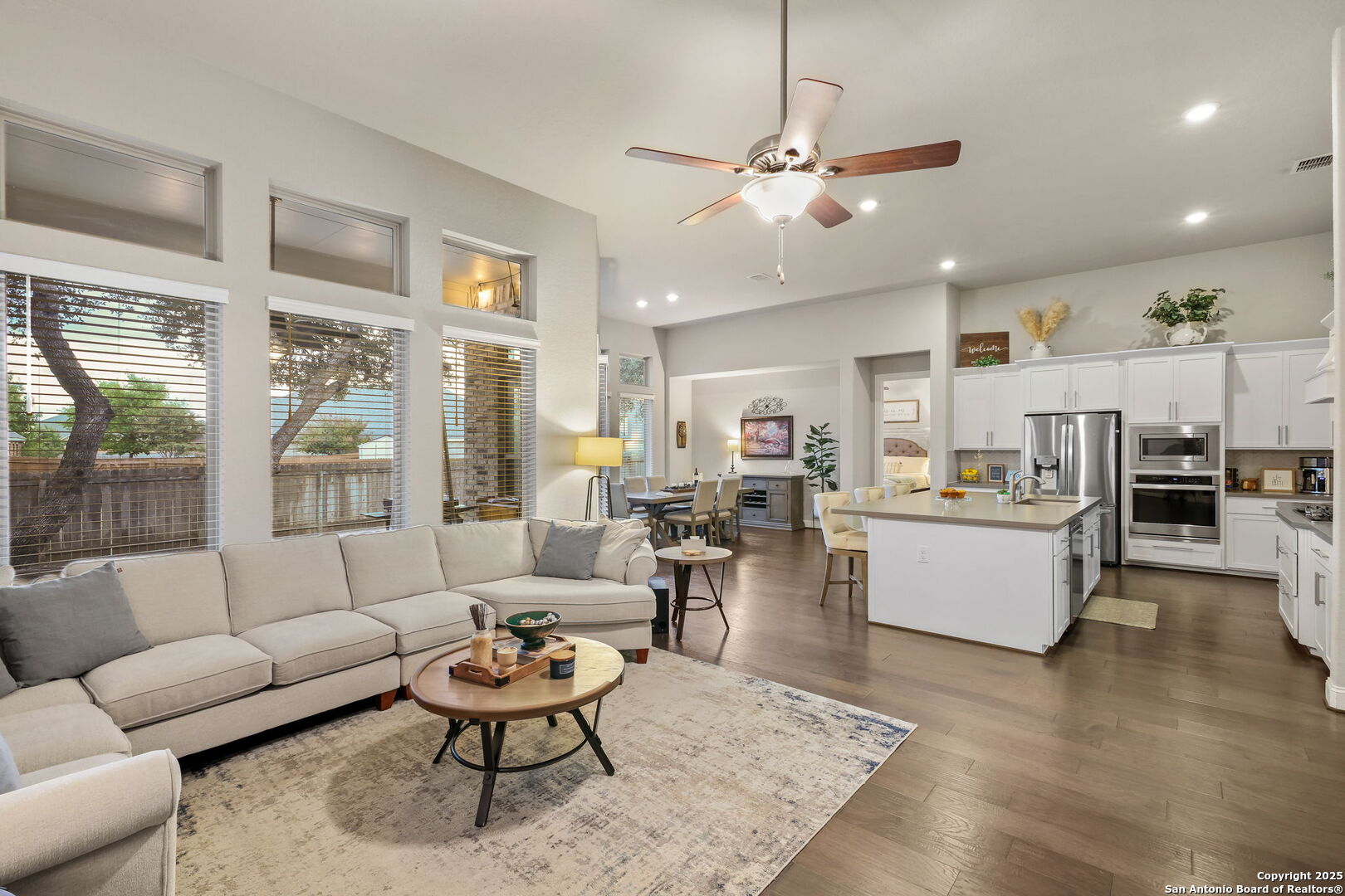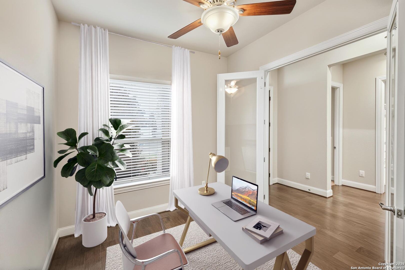 Discover your dream home in this stunning move-in-ready home that perfectly combines modern style with everyday comfort. This one story beauty features great curb appeal, open layout with natural light throughout, tall ceilings and a private study with French doors. The living room is a true highlight, showcasing a modern accent wall, custom shelving unit, and a cozy stone gas fireplace. Gorgeous white kitchen features a grand island, gas stove, glass tile backsplash, stainless steel appliances, pull-out drawers and connects to your spacious dining room ideal for endless entertainment! The primary suite is private, complete with a garden tub, dual vanities, and a large closet with a built-in make-ready mirror. Enjoy relaxing evenings on your covered cozy patio with ambient lighting. Located just minutes from IH-10, Hwy. 46, Boerne High School, parks, shopping, and dining options, this home offers both convenience and comfort. Don't miss this opportunity, schedule your showing today and see everything this amazing home has to offer!