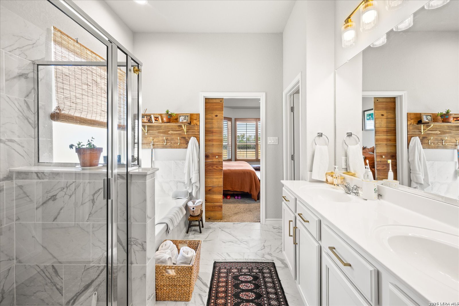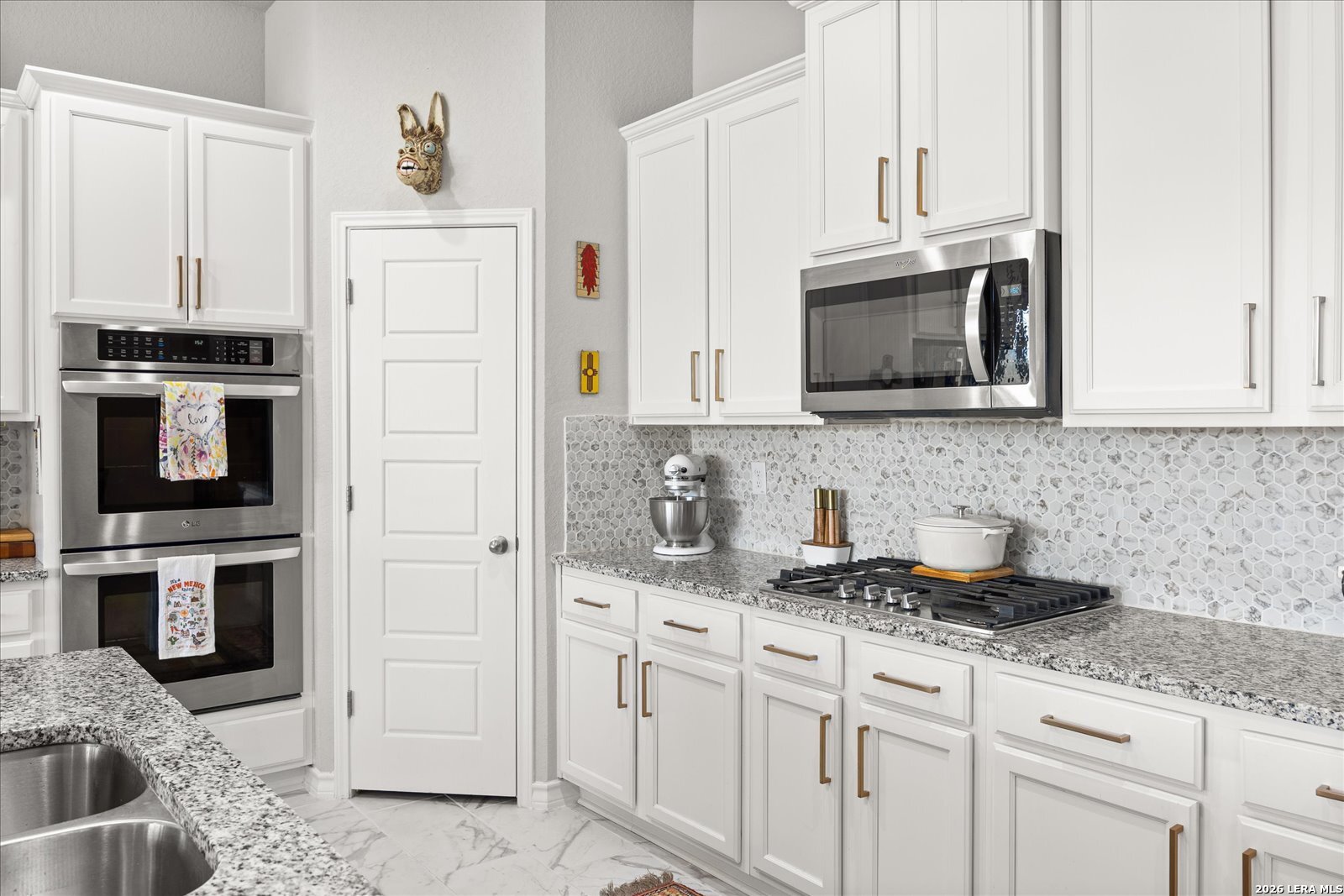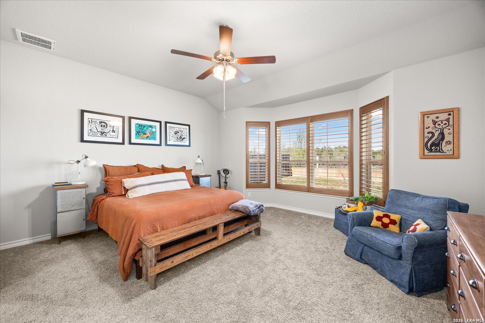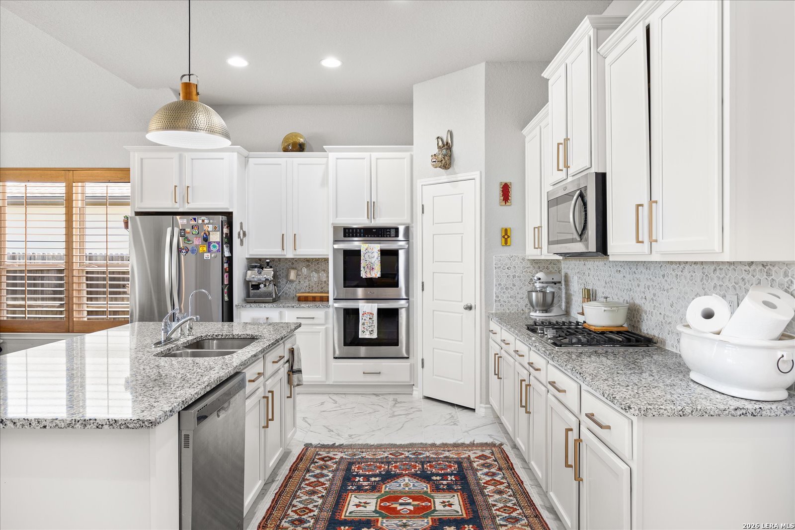 Welcome to 29739 Elkhorn Ridge, a sought-after gated community in Fair Oaks Ranch, where this stunning 4-bedroom, 3-bath home blends modern comfort with timeless Hill Country style. Built in 2021 by Princeton Classic Homes, this thoughtfully designed 2,558 sq. ft. residence backs to a scenic wet-weather creek, creating a peaceful setting often visited by local wildlife, including whitetail and axis deer. From the moment you step inside, you'll notice the open-concept layout, soaring ceilings, plantation shutters, and abundant natural light that fills the main living areas. The spacious living room offers the perfect space for relaxing or entertaining guests. The chef's kitchen is beautifully appointed with granite countertops, an oversized island, stainless steel appliances, double ovens, gas cooking, and generous cabinetry for storage. The primary suite provides a private retreat with a spa-like bathroom and an oversized walk-in closet. Two additional bedrooms are located downstairs, offering flexible space for family or guests. Upstairs, a versatile game room and fourth bedroom create the ideal setup for a guest suite, media space, or home office. Step outside to the covered patio and enjoy the peaceful backyard setting overlooking the creek and surrounding Hill Country landscape. Conveniently located just 1.5 miles from H-E-B and the upcoming Lemon Creek development, this home offers easy access to Fair Oaks Ranch Golf & Country Club, scenic parks, shopping, and dining. With high-end finishes and thoughtful upgrades throughout, this exceptional property is one you won't want to miss.