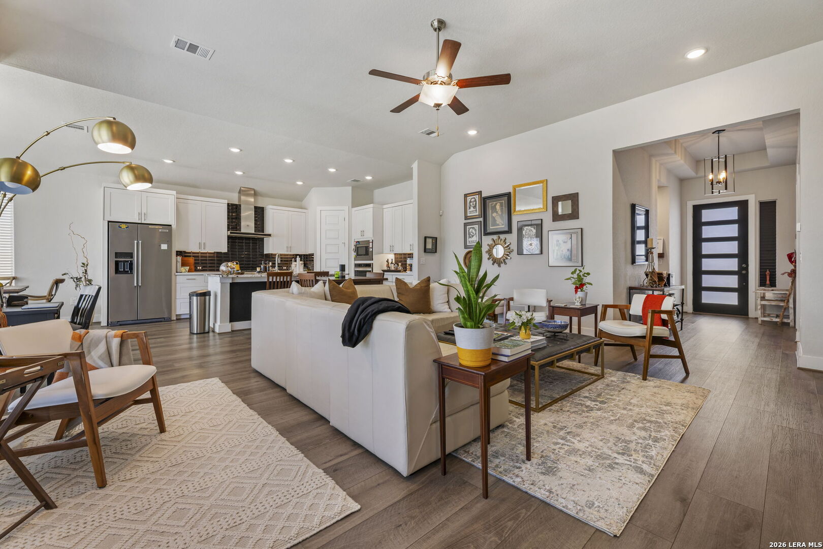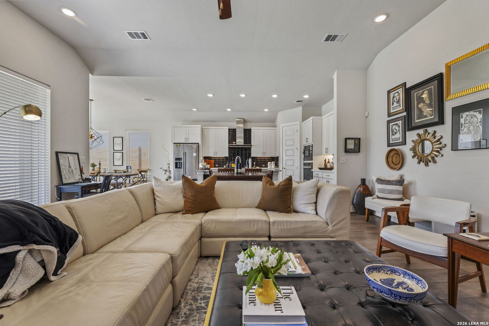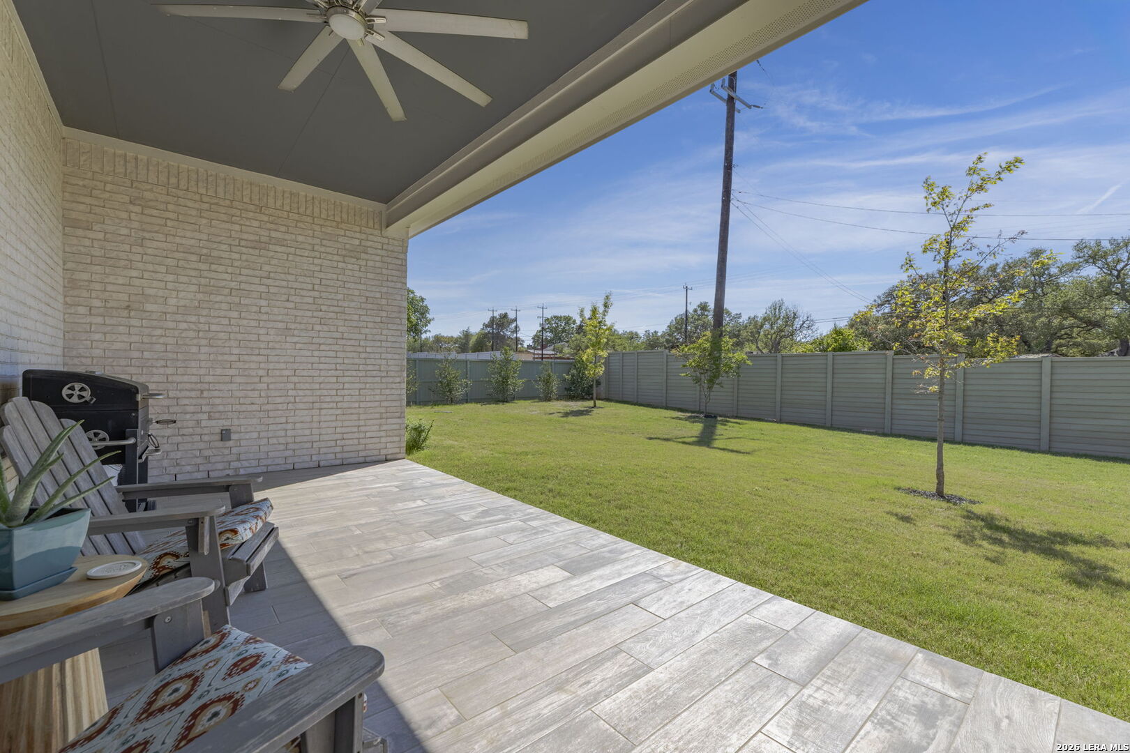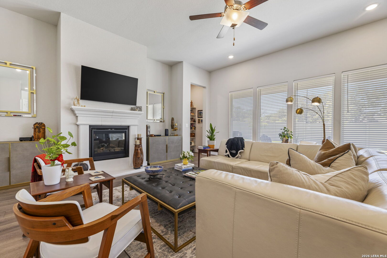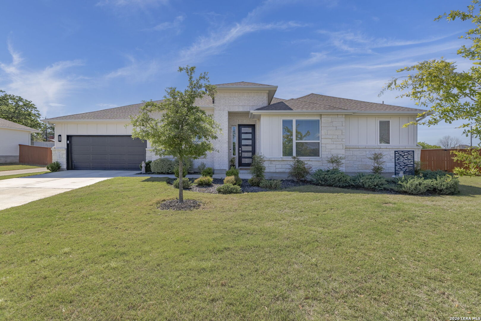 Located in a gated Hill Country community just moments from the prestigious Fair Oaks Ranch Country Club, this exceptional residence offers refined living in one of the area's most sought-after locations. Enjoy access to premier amenities including two championship 18-hole golf courses, tennis, pickleball, swimming, and a state-of-the-art fitness center (membership required). Inside, the open and light-filled floor plan is designed for both everyday comfort and effortless entertaining. Luxury vinyl flooring flows throughout most of the home, complemented by designer lighting, upgraded ceiling fans, and elegant accent details. The chef's kitchen is a standout feature, equipped with a Bertazzoni Italian six-burner gas range, KitchenAid counter-depth refrigerator, KitchenAid dishwasher, a granite island, and generous prep space perfect for gathering with family and guests. The thoughtfully designed layout includes three spacious bedrooms, a dedicated private study, and 2.5 beautifully finished bathrooms featuring quartz countertops and upgraded fixtures. The primary suite offers a peaceful retreat with a tray ceiling, custom window treatments, custom mirrors, and dual closets including a custom Closets by Design system. Additional upgrades include a custom laundry room storage system, gas fireplace, tankless gas water heater, Trane HVAC system, water softener and filtration system, and a 250-gallon in-ground gas tank. Step outside to a beautifully landscaped backyard featuring mature trees, irrigation, and a covered patio with ceiling fan-perfect for relaxing or entertaining. A newly installed 8-foot privacy fence adds both security and privacy. Ideally positioned between San Antonio and Boerne and located within highly acclaimed Boerne ISD. This home offers the perfect blend of luxury, lifestyle, and Hill Country beauty.