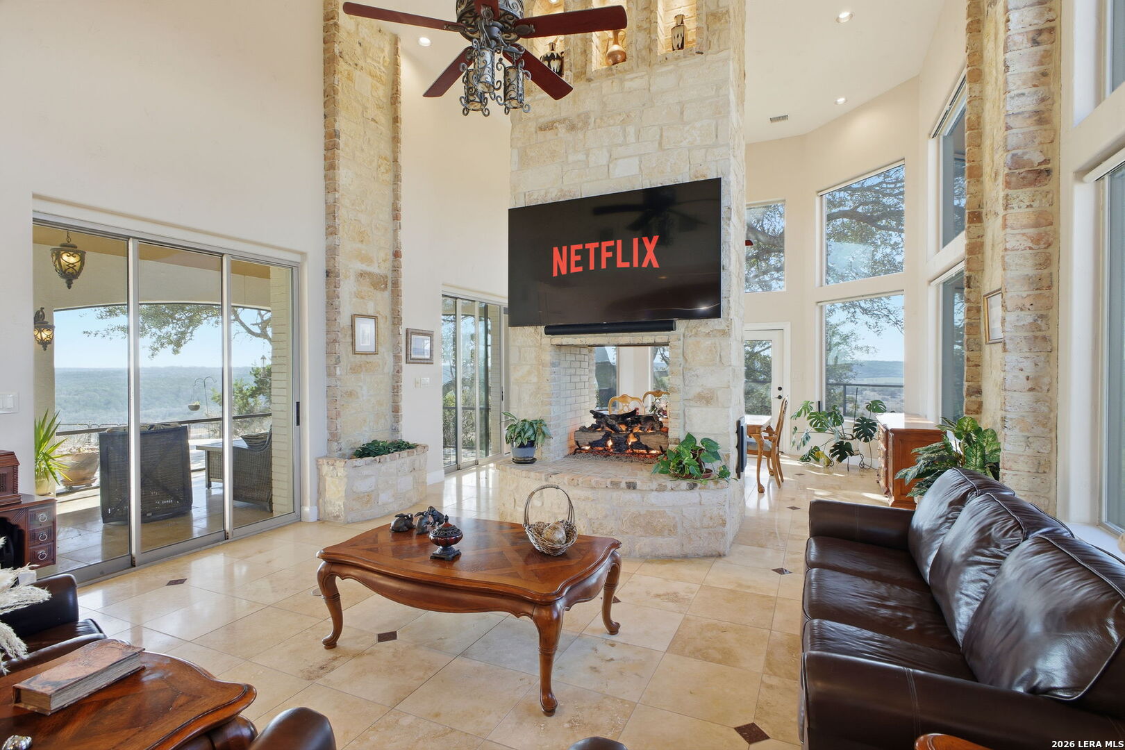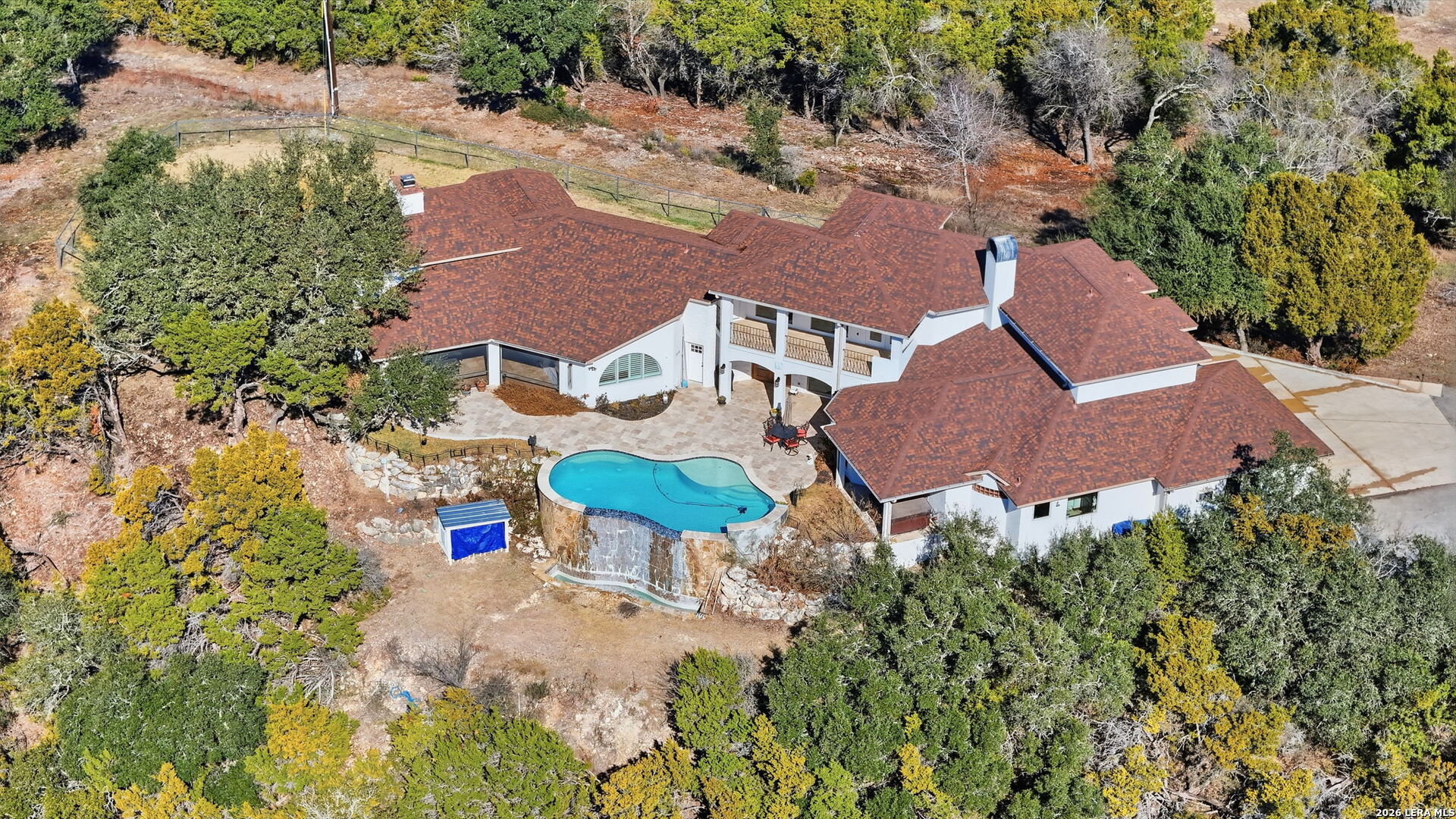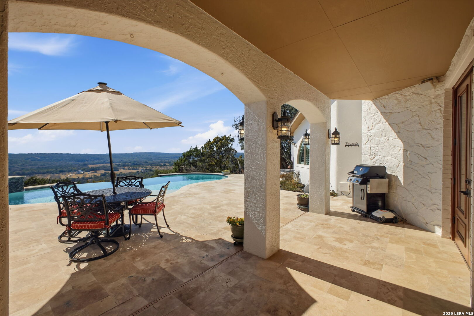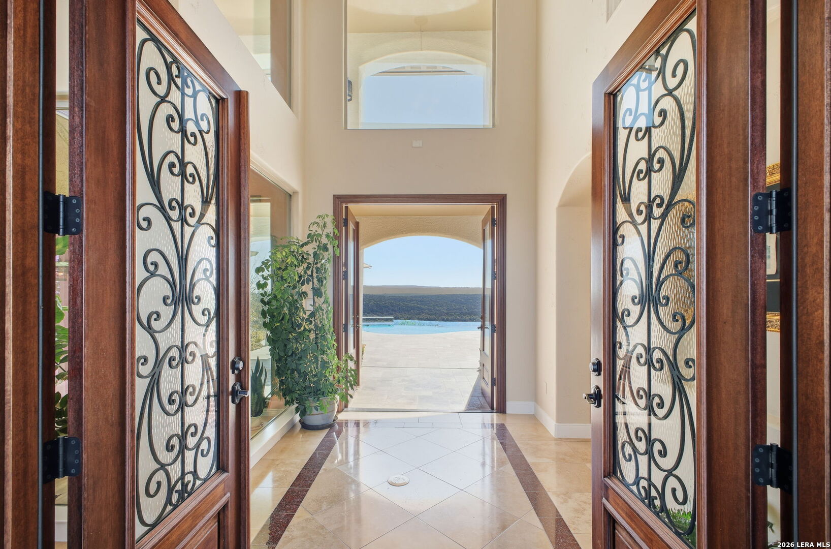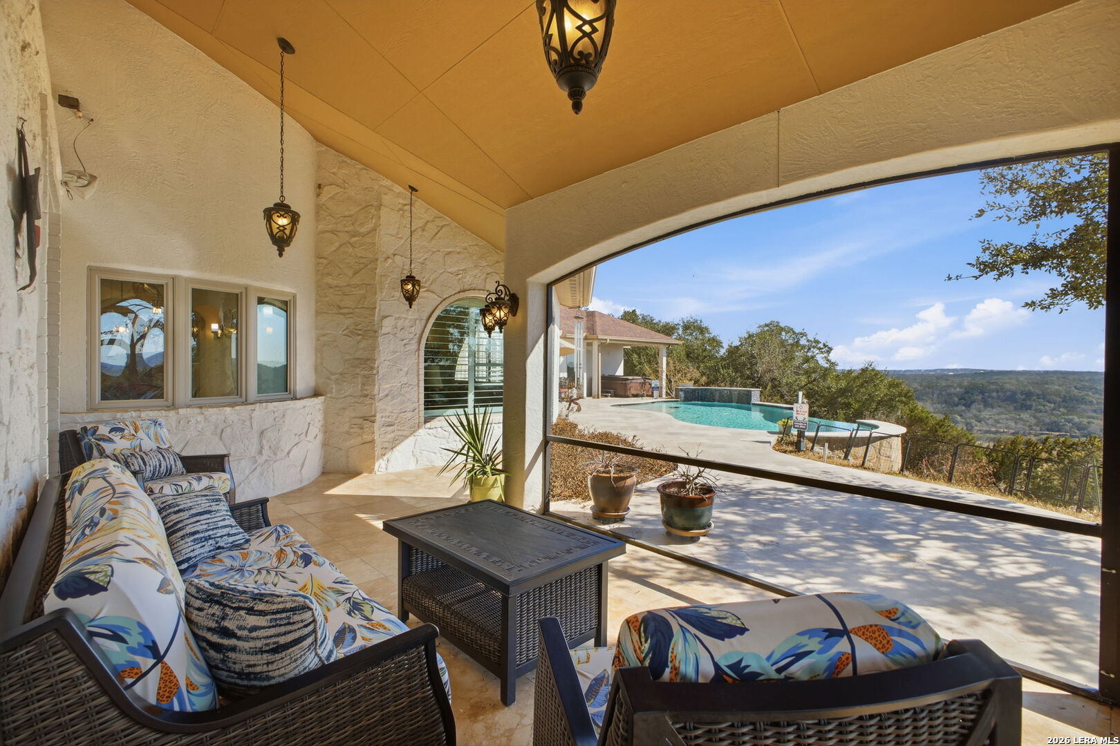 Majestic Hill Country Estate on Over 9 Acres | Sweeping Vistas | Resort-Style Living Set atop more than 9 acres of rolling Hill Country in Bulverde, 29940 Beck Rd. is a one-of-a-kind custom estate offering breathtaking panoramic views from nearly every room. Mature trees, gentle slopes, and elevated positioning create unmatched privacy while capturing expansive vistas of the surrounding countryside. A grand entry welcomes you into a dramatic foyer and atrium, highlighted by a striking custom ironwork staircase that sets the tone for the home's architectural elegance. Walls of windows and arched openings frame the scenery throughout, seamlessly blending indoor luxury with the natural beauty beyond. The main living spaces are anchored by a floor-to-ceiling, double-sided stone fireplace, creating a stunning separation between the living and dining rooms-both surrounded by soaring views. The open-concept kitchen is equally impressive, featuring a copper-clad ceiling, six-burner gas range, built-in bar cabinetry, expansive breakfast area, and a generous walk-in pantry. Even everyday moments are elevated with uninterrupted countryside views from the kitchen sink. A dedicated office provides an inspiring workspace with arched windows overlooking the hills. The main-level primary suite is a private retreat, complete with a stone fireplace, dramatic feature wall, and direct access to the patio and pool. Wake each morning to tranquil views of the infinity pool and rolling landscape. The spa-like primary bath includes multiple closets, a jacuzzi tub, built-in sauna, and a marble-surround walk-in shower. Also on the main floor, a spacious secondary bedroom with its own private ensuite bath offers ideal accommodations for guests or multigenerational living, providing comfort and privacy separate from the primary suite. Upstairs, a loft and balcony overlook the pool and sweeping Hill Country, accompanied by two additional bedrooms, sharing an ensuite bath, and second laundry room perfect for family or guests. Outdoor living is nothing short of resort-inspired. A beautifully designed covered patio opens to an infinity-edge pool overlooking endless vistas, complemented by a separate hot tub, grill, pool-accessible bathroom, and a covered sunroom-perfect for sunset evenings and year-round enjoyment. Additional features include a laundry room with built-in sink, a thoughtful split-bedroom layout, and gently sloped acreage adorned with mature Hill Country trees, maximizing privacy and views. A rare opportunity to own a private Hill Country estate where luxury, views, and space converge-just minutes from modern conveniences, yet worlds away.