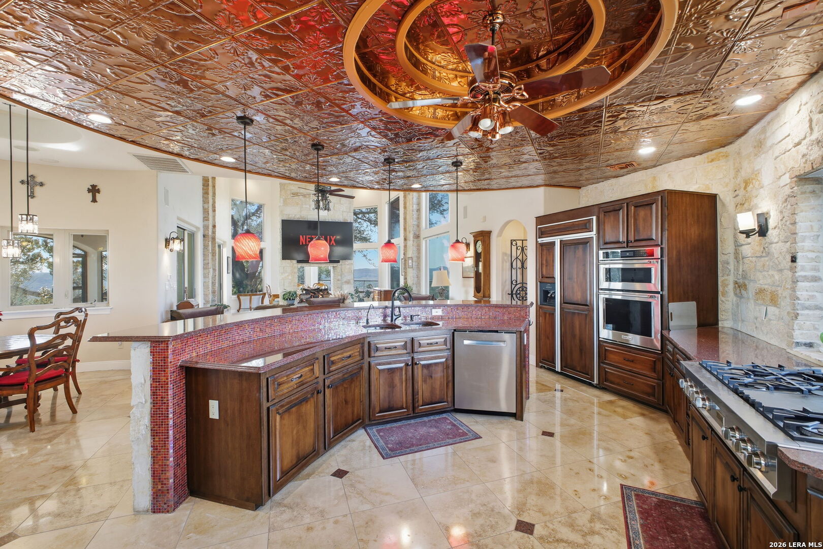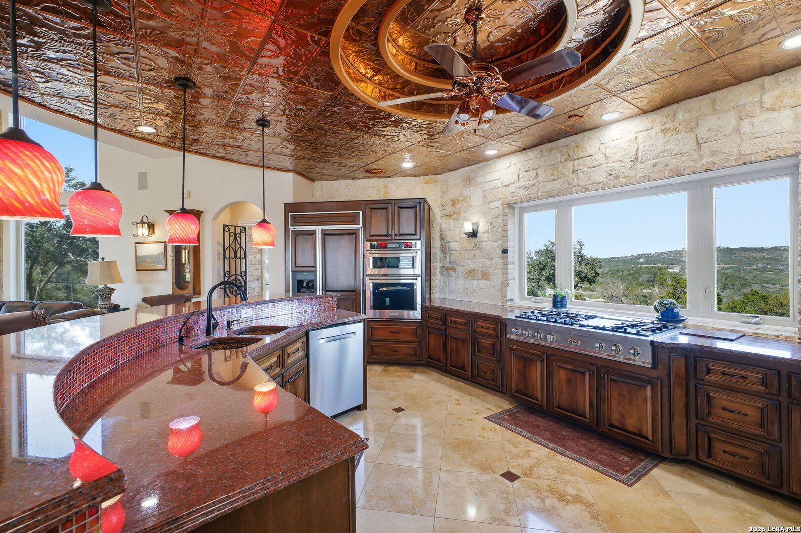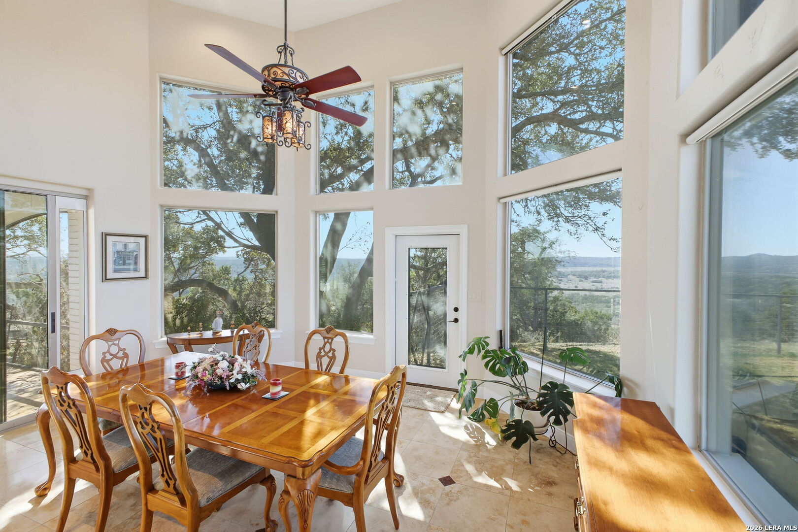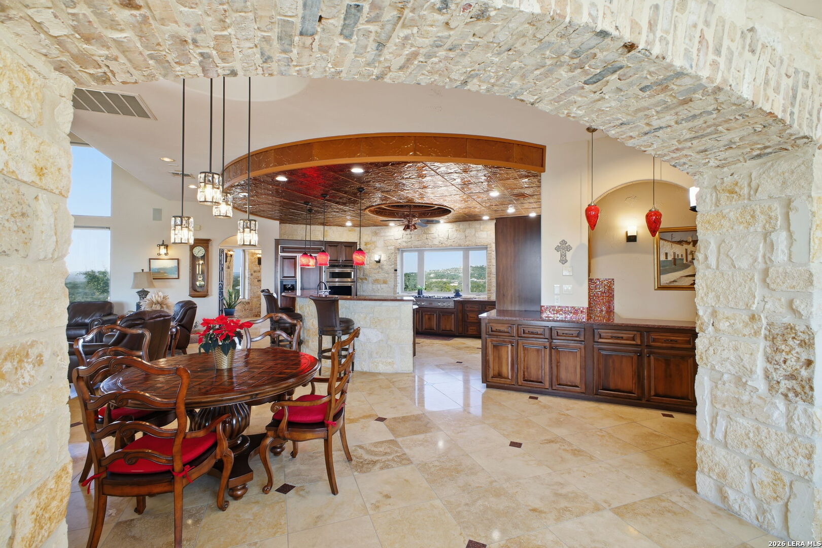 Majestic Hill Country Estate on Over 9 Acres | Sweeping Vistas | Resort-Style Living Set atop more than 9 acres of rolling Hill Country in Bulverde, 29940 Beck Rd. is a one-of-a-kind custom estate offering breathtaking panoramic views from nearly every room. Mature trees, gentle slopes, and elevated positioning create unmatched privacy while capturing expansive vistas of the surrounding countryside. A grand entry welcomes you into a dramatic foyer and atrium, highlighted by a striking custom ironwork staircase that sets the tone for the home's architectural elegance. Walls of windows and arched openings frame the scenery throughout, seamlessly blending indoor luxury with the natural beauty beyond. The main living spaces are anchored by a floor-to-ceiling, double-sided stone fireplace, creating a stunning separation between the living and dining rooms-both surrounded by soaring views. The open-concept kitchen is equally impressive, featuring a copper-clad ceiling, six-burner gas range, built-in bar cabinetry, expansive breakfast area, and a generous walk-in pantry. Even everyday moments are elevated with uninterrupted countryside views from the kitchen sink. A dedicated office provides an inspiring workspace with arched windows overlooking the hills. The main-level primary suite is a private retreat, complete with a stone fireplace, dramatic feature wall, and direct access to the patio and pool. Wake each morning to tranquil views of the infinity pool and rolling landscape. The spa-like primary bath includes multiple closets, a jacuzzi tub, built-in sauna, and a marble-surround walk-in shower. Also on the main floor, a spacious secondary bedroom with its own private ensuite bath offers ideal accommodations for guests or multigenerational living, providing comfort and privacy separate from the primary suite. Upstairs, a loft and balcony overlook the pool and sweeping Hill Country, accompanied by two additional bedrooms, sharing an ensuite bath, and second laundry room perfect for family or guests. Outdoor living is nothing short of resort-inspired. A beautifully designed covered patio opens to an infinity-edge pool overlooking endless vistas, complemented by a separate hot tub, grill, pool-accessible bathroom, and a covered sunroom-perfect for sunset evenings and year-round enjoyment. Additional features include a laundry room with built-in sink, a thoughtful split-bedroom layout, and gently sloped acreage adorned with mature Hill Country trees, maximizing privacy and views. A rare opportunity to own a private Hill Country estate where luxury, views, and space converge-just minutes from modern conveniences, yet worlds away.
