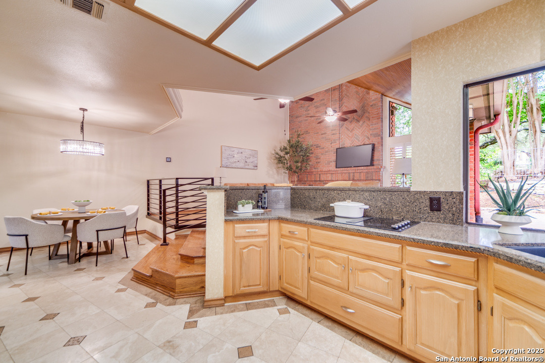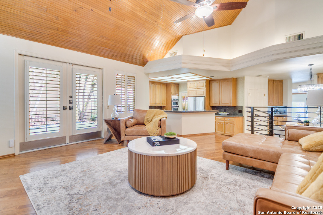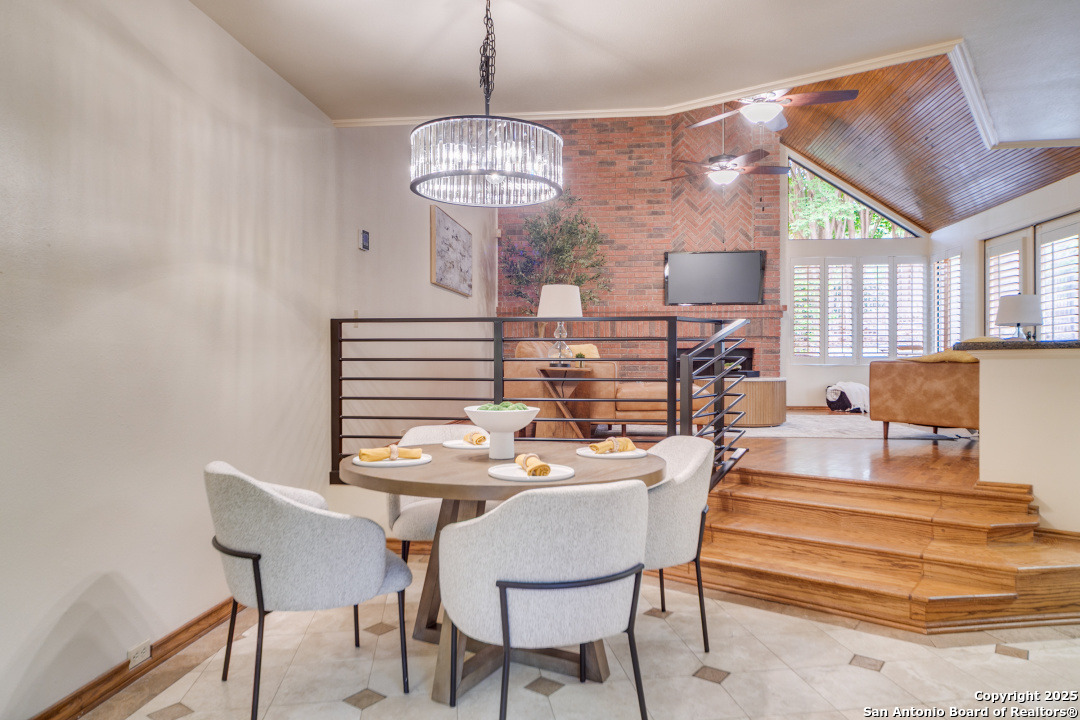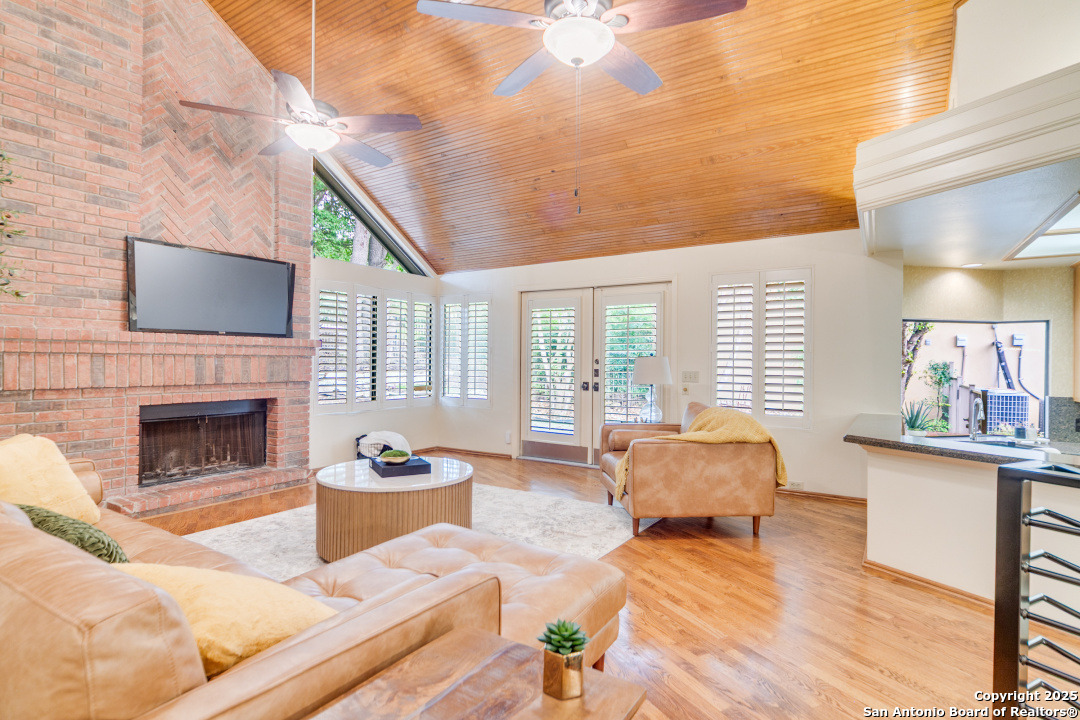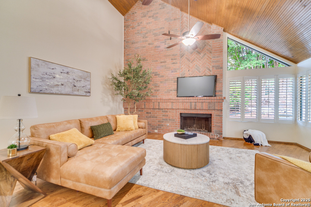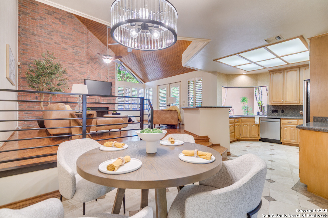 Discover elegance and comfort in this stunning home located in The Dominion, The Cottages. This beautiful 1 story residence features three bedrooms, two bathrooms, and a roomy two-car garage. Step inside to find luxurious hardwood and Cantera marble flooring. The Family room with a cozy brick fireplace (w/gas starter), and finished with soaring wood ceilings and French doors to patio. The formal living and dining areas provide an elegant space for entertaining. Step outside to a stone patio, prefect for relaxing and enjoying the outdoors. With a standing seam metal roof and mature trees, this home is not just a place to live, but a lifestyle. Plus, it's close to the Koi Pond and park! Other amenities include Plantation shutters, stainless steel appliances, warming oven, crown molding and granite countertops. Don't miss this gem? Ask about our preferred lender incentives.