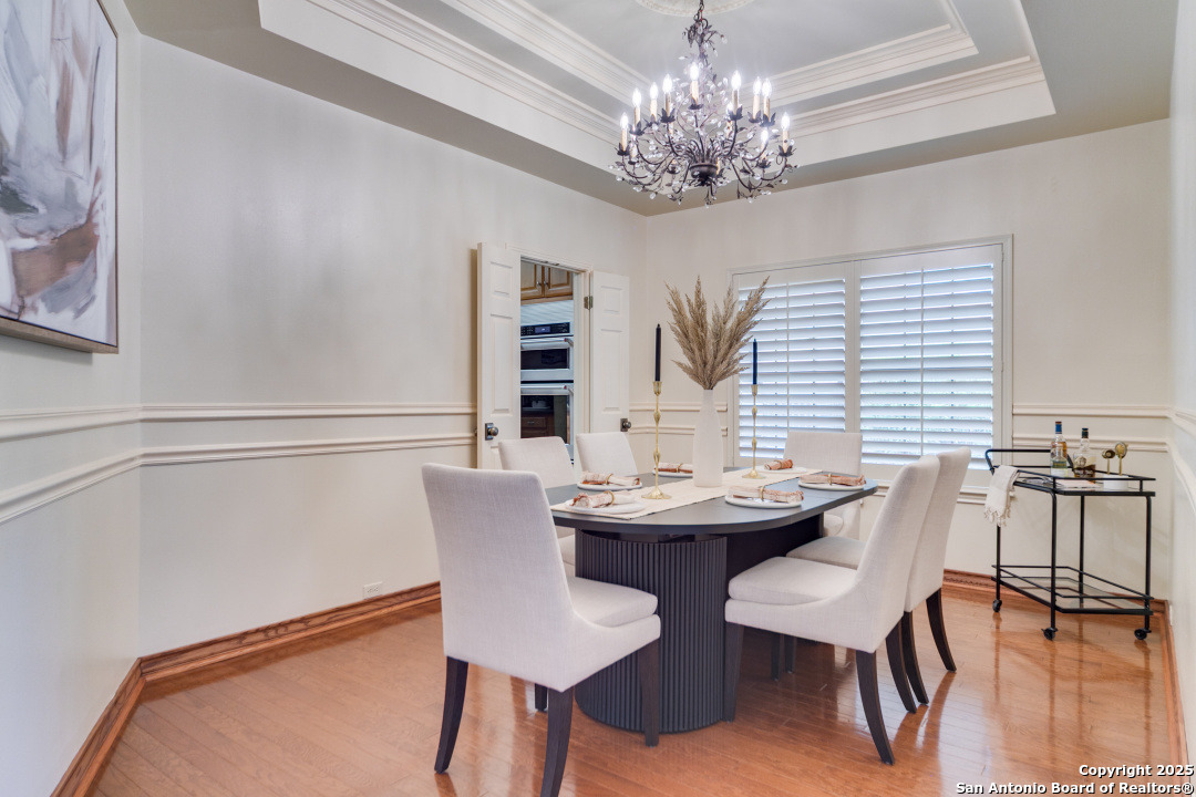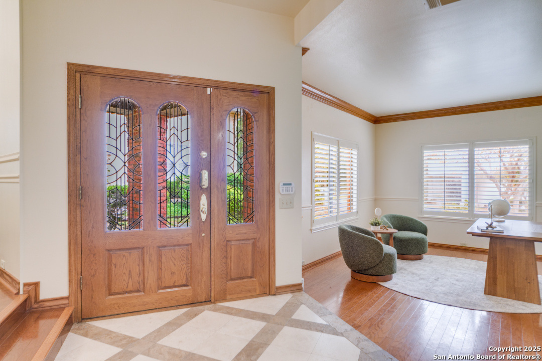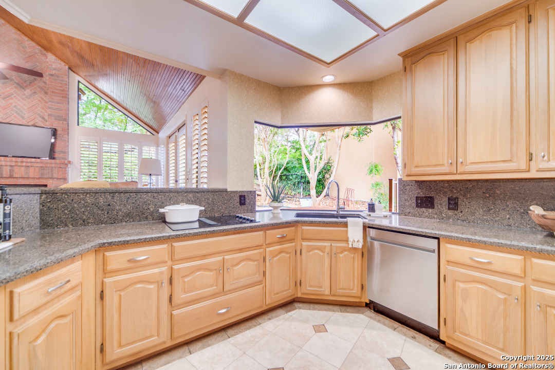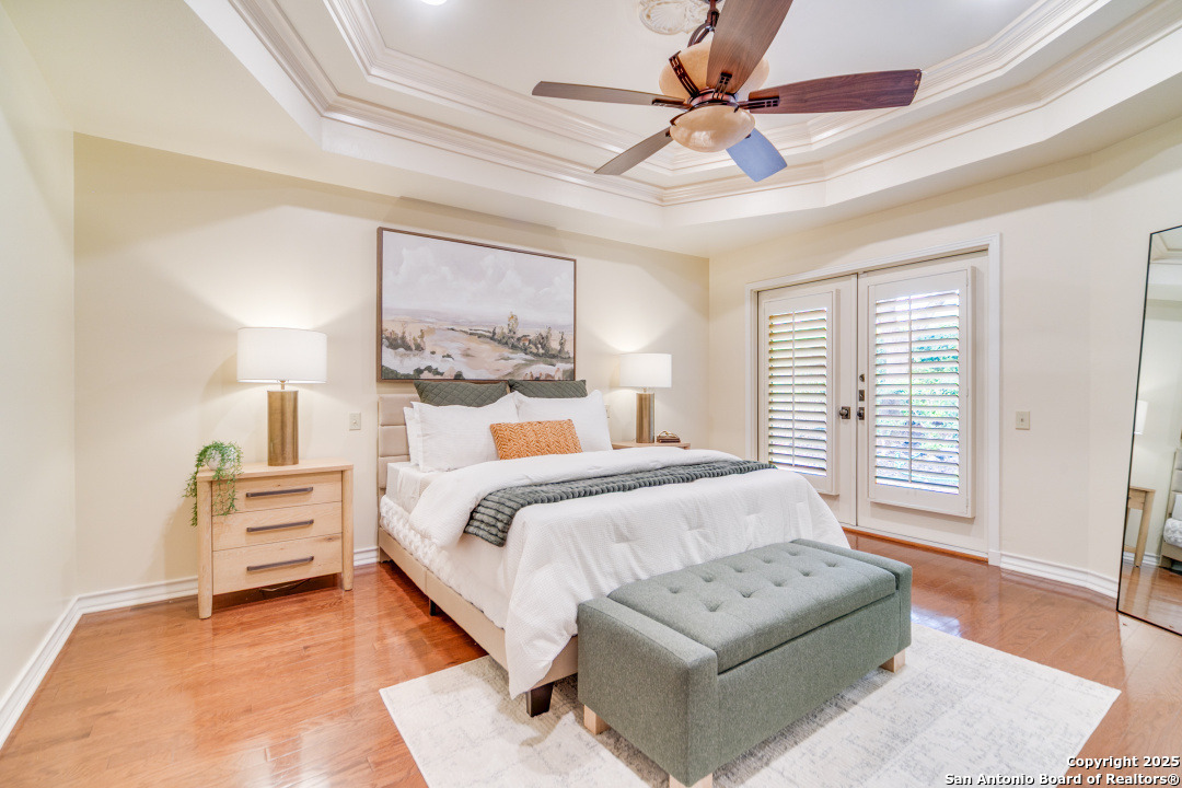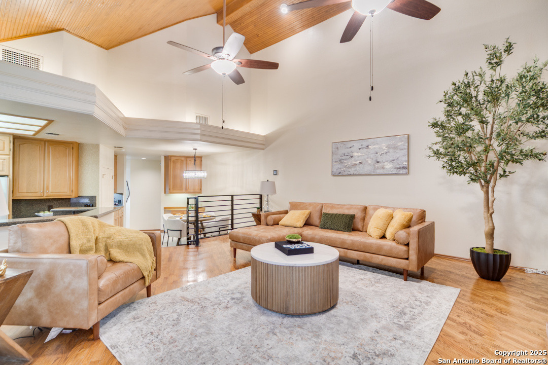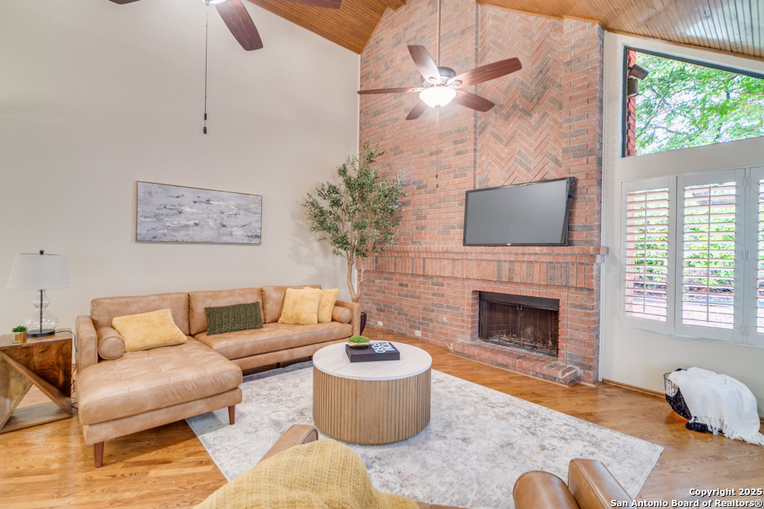 Discover elegance and comfort in this stunning home located in The Dominion, The Cottages. This beautiful 1 story residence features three bedrooms, two bathrooms, and a roomy two-car garage. Step inside to find luxurious hardwood and Cantera marble flooring. The Family room with a cozy brick fireplace (w/gas starter), and finished with soaring wood ceilings and French doors to patio. The formal living and dining areas provide an elegant space for entertaining. Step outside to a stone patio, prefect for relaxing and enjoying the outdoors. With a standing seam metal roof and mature trees, this home is not just a place to live, but a lifestyle. Plus, it's close to the Koi Pond and park! Other amenities include Plantation shutters, stainless steel appliances, warming oven, crown molding and granite countertops. Don't miss this gem? Ask about our preferred lender incentives.