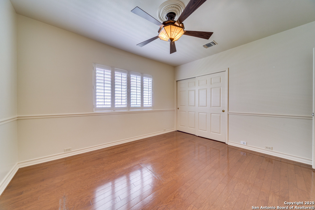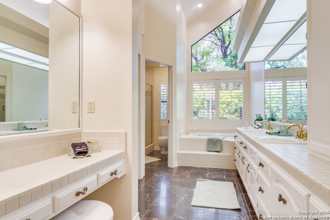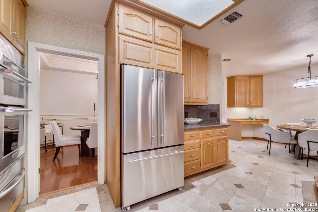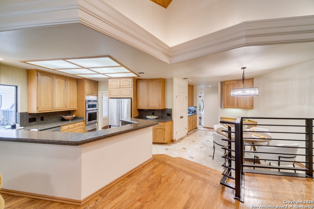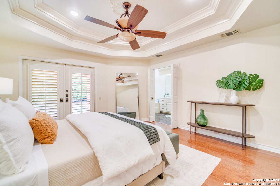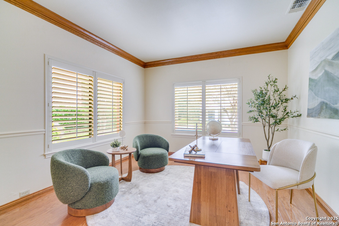 Discover elegance and comfort in this stunning home located in The Dominion, The Cottages. This beautiful 1 story residence features three bedrooms, two bathrooms, and a roomy two-car garage. Step inside to find luxurious hardwood and Cantera marble flooring. The Family room with a cozy brick fireplace (w/gas starter), and finished with soaring wood ceilings and French doors to patio. The formal living and dining areas provide an elegant space for entertaining. Step outside to a stone patio, prefect for relaxing and enjoying the outdoors. With a standing seam metal roof and mature trees, this home is not just a place to live, but a lifestyle. Plus, it's close to the Koi Pond and park! Other amenities include Plantation shutters, stainless steel appliances, warming oven, crown molding and granite countertops. Don't miss this gem? Ask about our preferred lender incentives.