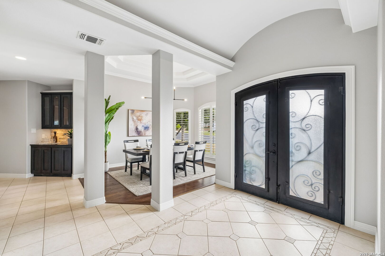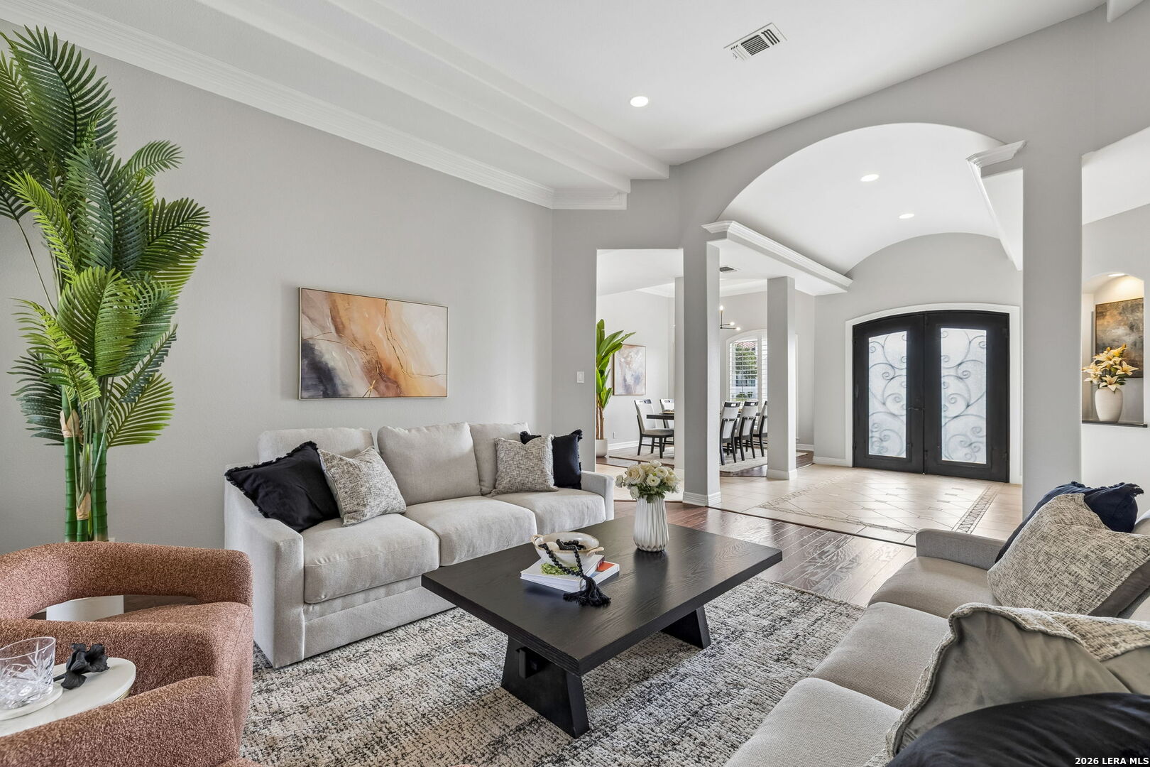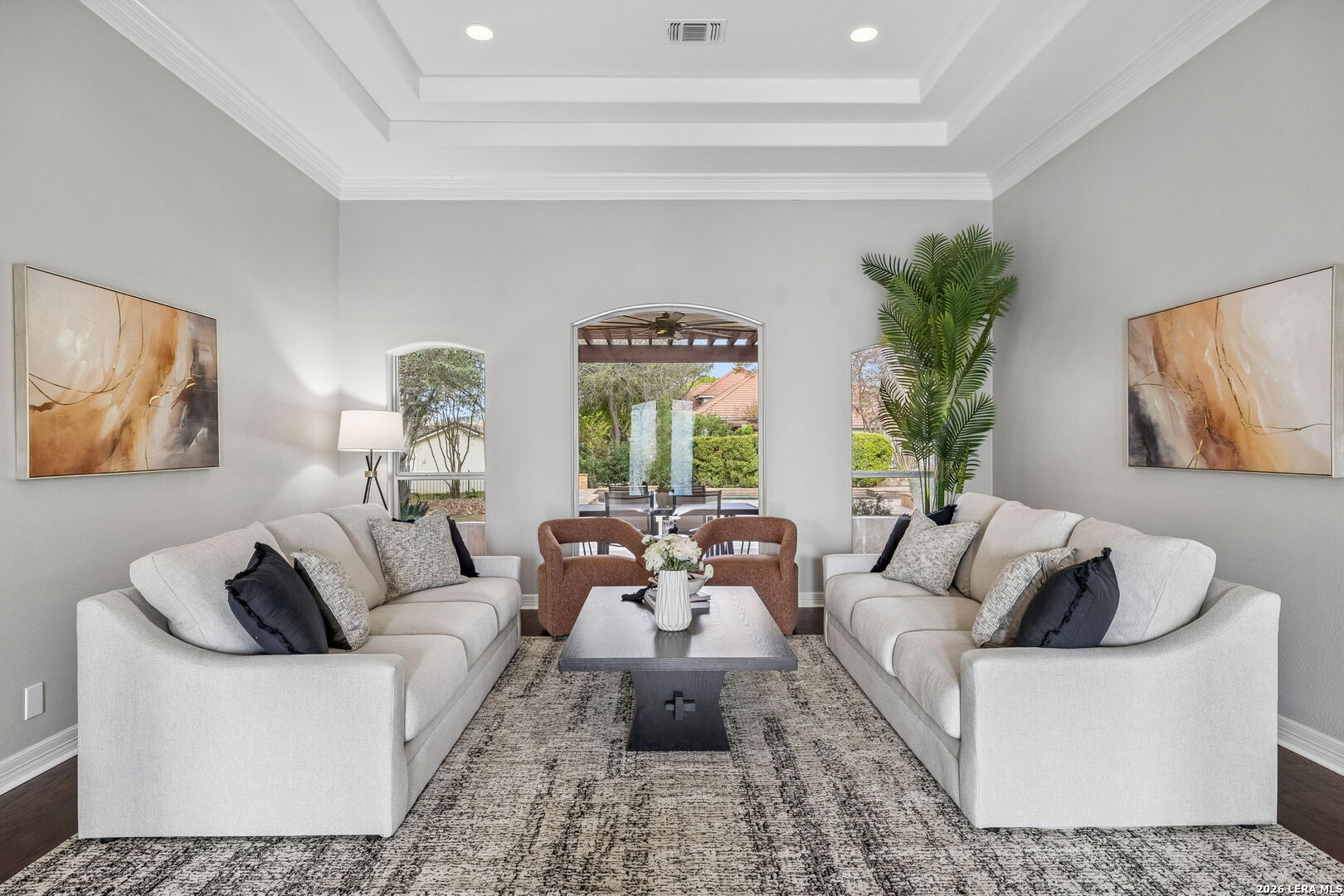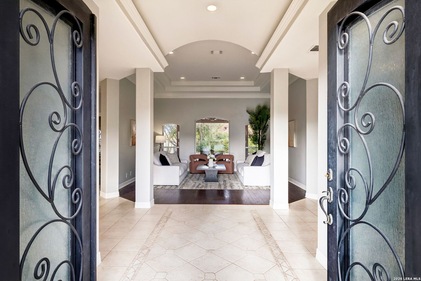 Set within The Dominion on a generous corner lot shaded by mature trees, this single-story residence offers a thoughtful layout and a strong connection to the surrounding landscape. The approach is framed by established greenery and a classic iron entry door that opens to a welcoming interior with natural light throughout. Inside, the floor plan unfolds with multiple living areas arranged for everyday living and entertaining, anchored by an island kitchen that serves as a central gathering point. Large windows bring in views of the yard and create a bright, open feel across the main living spaces. The primary suite is positioned for privacy and comfort, while secondary bedrooms and additional living areas provide flexibility for guests, work, or hobbies. Throughout the home, the layout emphasizes livability, natural light, and easy flow from room to room. Outside, the corner lot and mature landscaping create a sense of space and established character, with outdoor areas suited for relaxing, entertaining, or future customization. Located within The Dominion, 3 Kings Mill offers a single-story layout, mature setting, and a well-designed floor plan in one of the area's most established guard-gated communities.