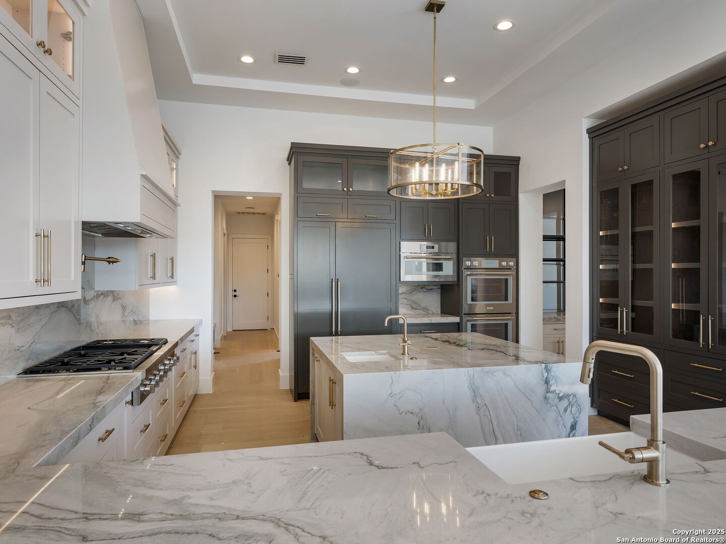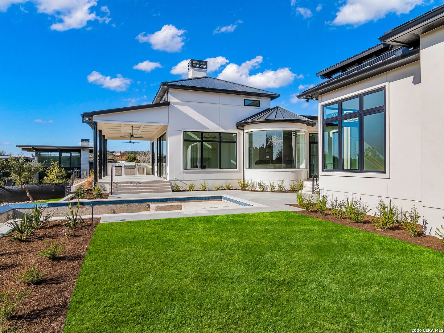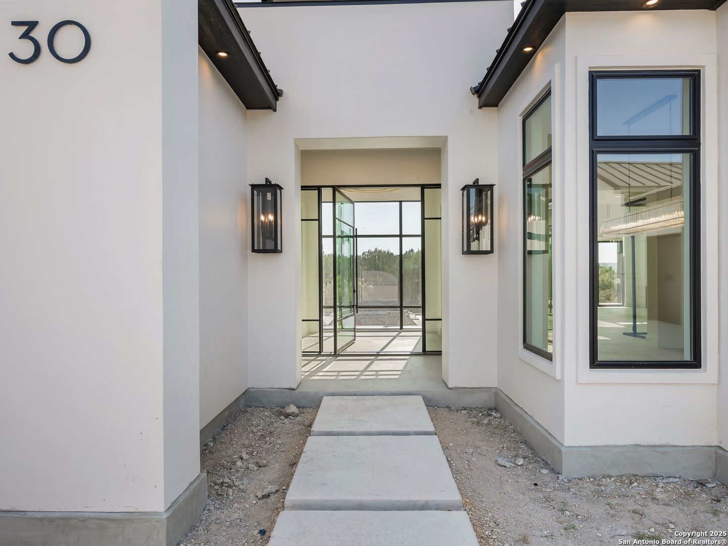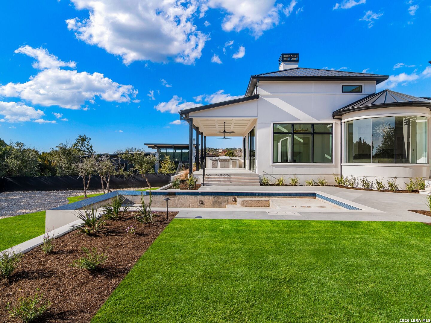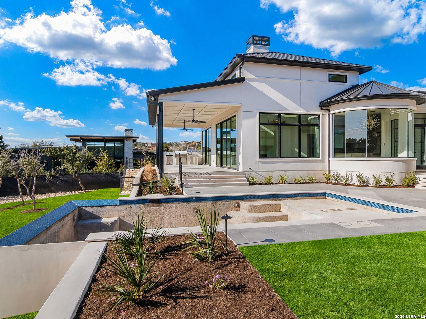 This brand-new custom construction by Uptown Homes in The Dominion features architectural design by ADesign's Gustavo Arredondo and interior selections by YADESIGN INTERIORS. Built with exceptional attention to detail, the home showcases refined finishes, custom ceiling treatments, and thoughtfully integrated architectural elements throughout. The chef's kitchen is outfitted with professional-grade stainless steel appliances and opens to a spacious great room with soaring ceilings, creating a seamless flow for everyday living and entertaining. The primary suite offers a spa-like bath and a large walk-in closet with extensive built-ins. Three additional guest bedrooms each feature private en-suite baths, and a generously sized game room provides added flexibility. Outdoor living is equally well-appointed, with a covered patio, full outdoor kitchen, expansive hardscaping, and a sparkling pool set within a private, resort-style setting.