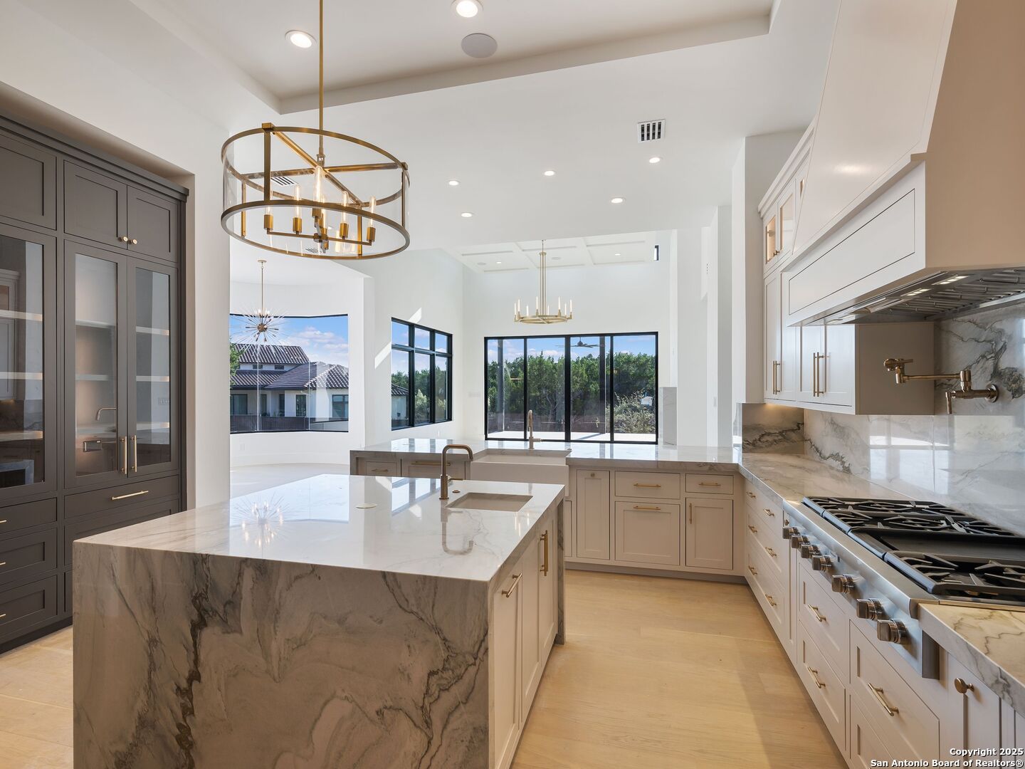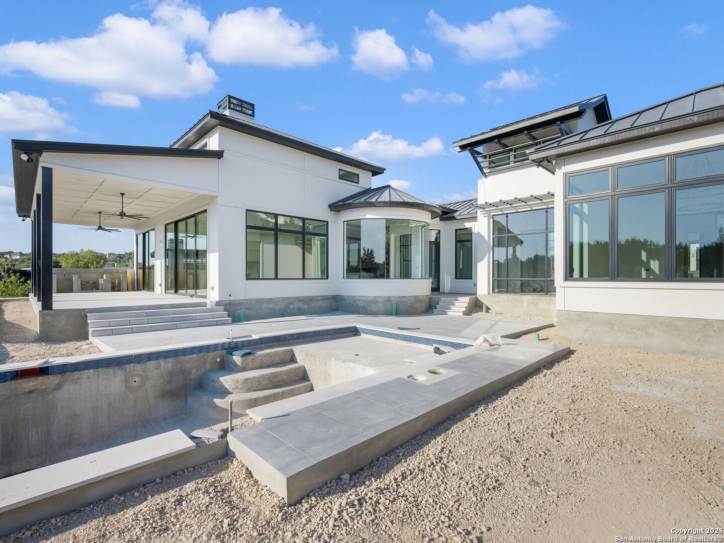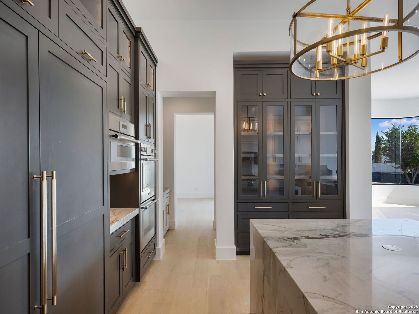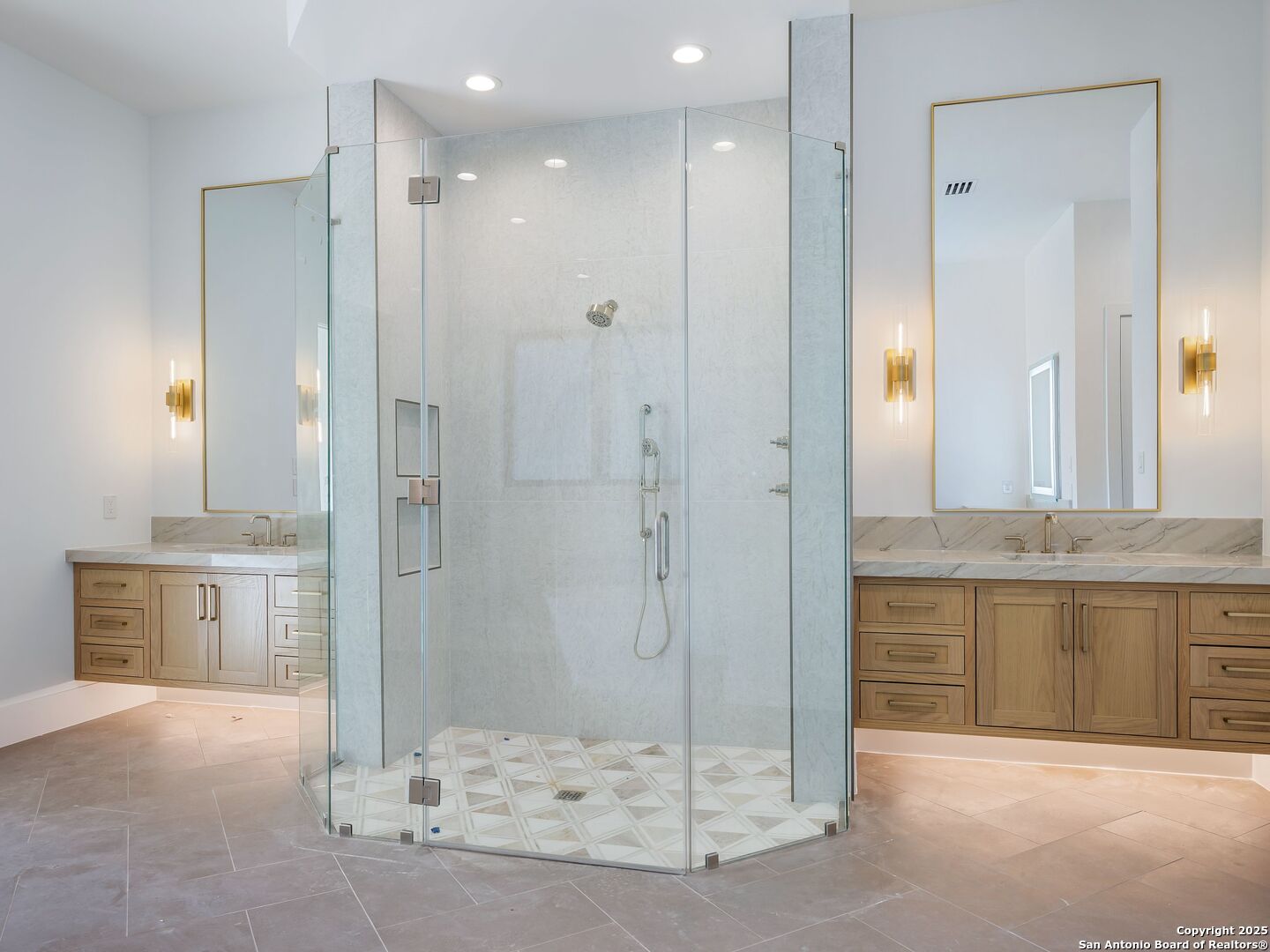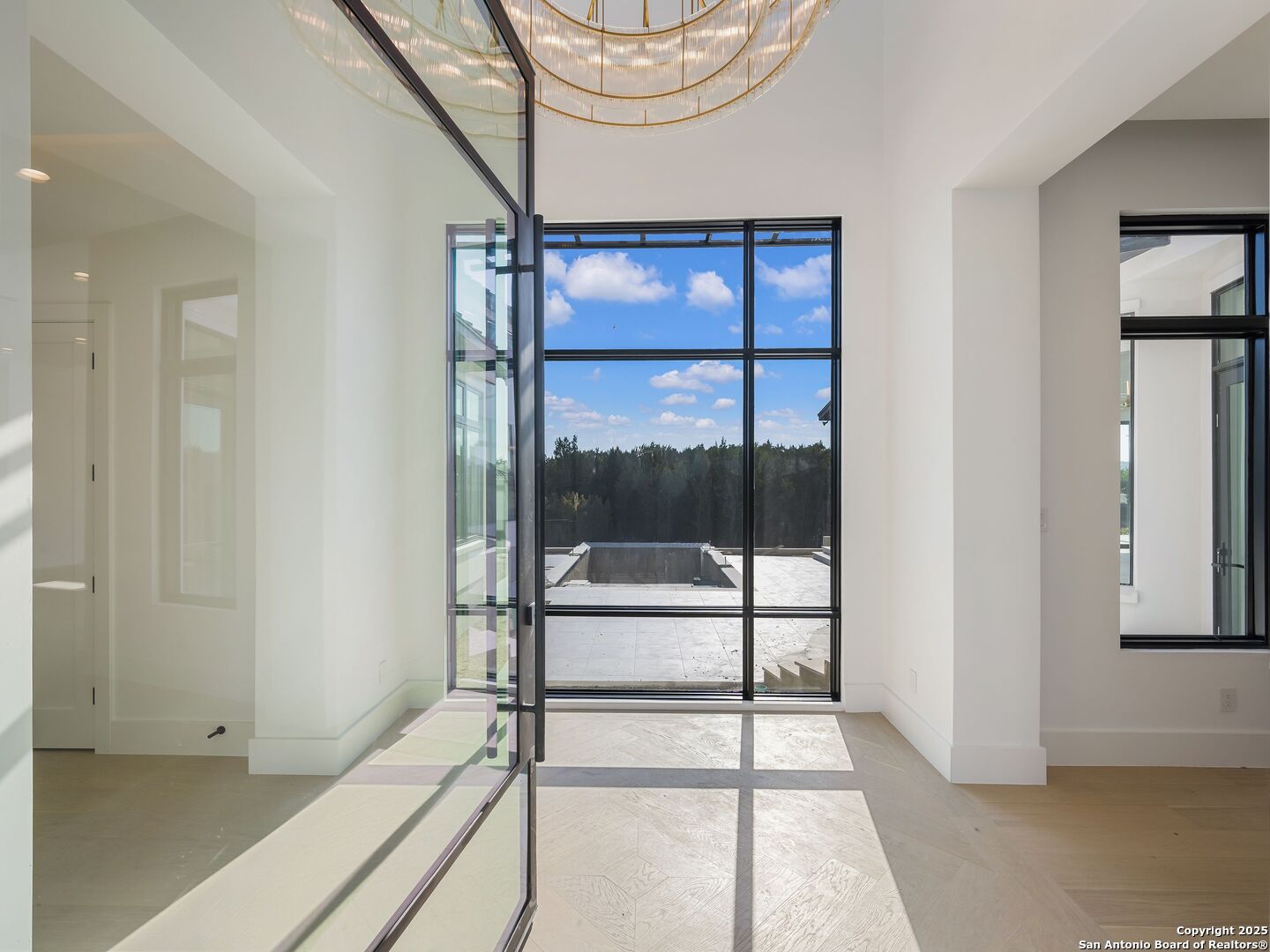 This brand-new custom construction by Uptown Homes in The Dominion features architectural design by ADesign's Gustavo Arredondo and interior selections by YADESIGN INTERIORS. Built with exceptional attention to detail, the home showcases refined finishes, custom ceiling treatments, and thoughtfully integrated architectural elements throughout. The chef's kitchen is outfitted with professional-grade stainless steel appliances and opens to a spacious great room with soaring ceilings, creating a seamless flow for everyday living and entertaining. The primary suite offers a spa-like bath and a large walk-in closet with extensive built-ins. Three additional guest bedrooms each feature private en-suite baths, and a generously sized game room provides added flexibility. Outdoor living is equally well-appointed, with a covered patio, full outdoor kitchen, expansive hardscaping, and a sparkling pool set within a private, resort-style setting.