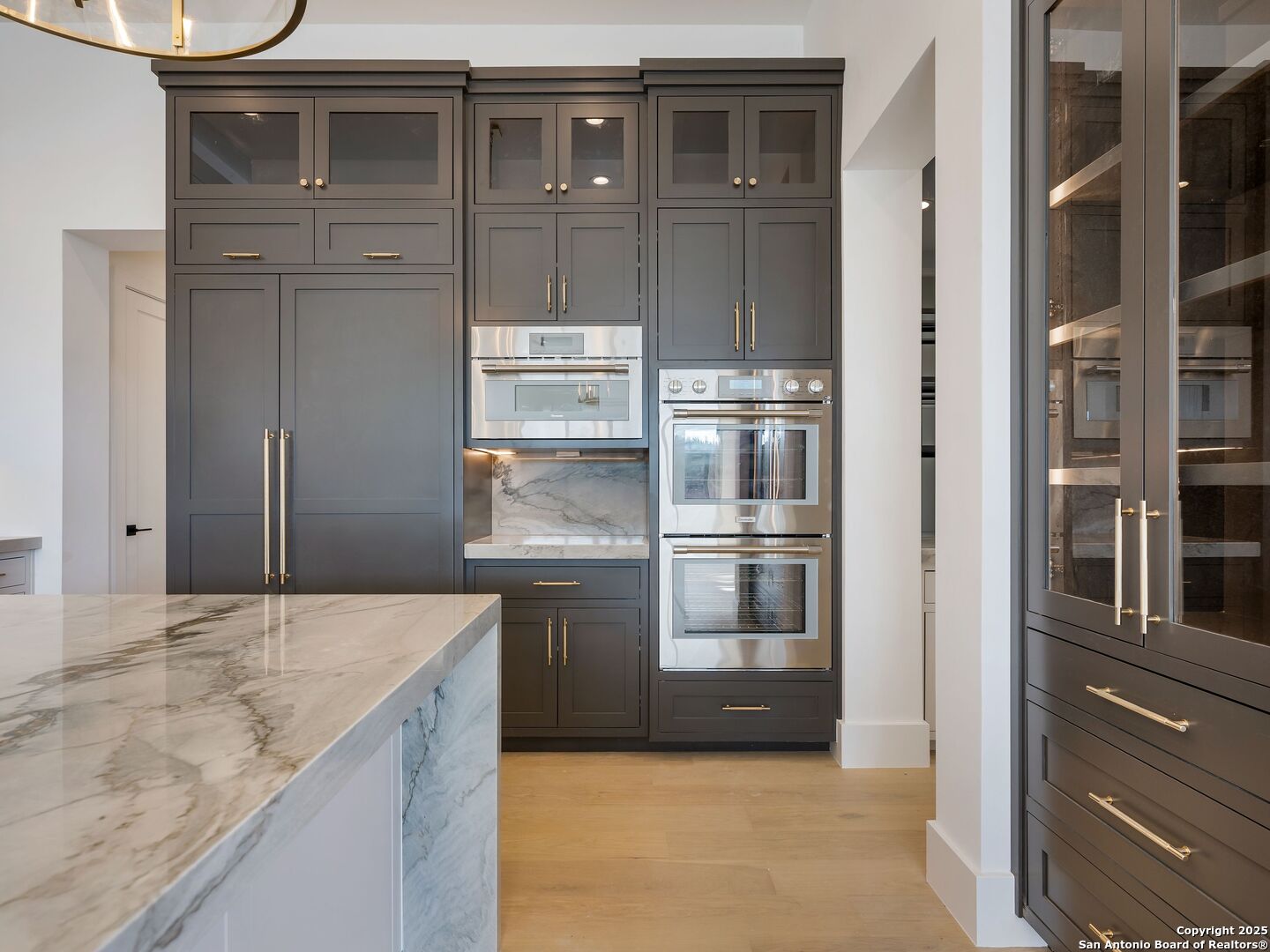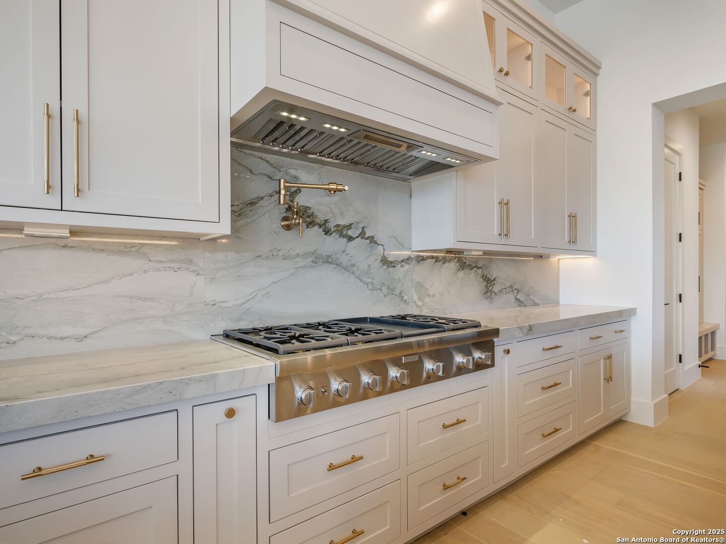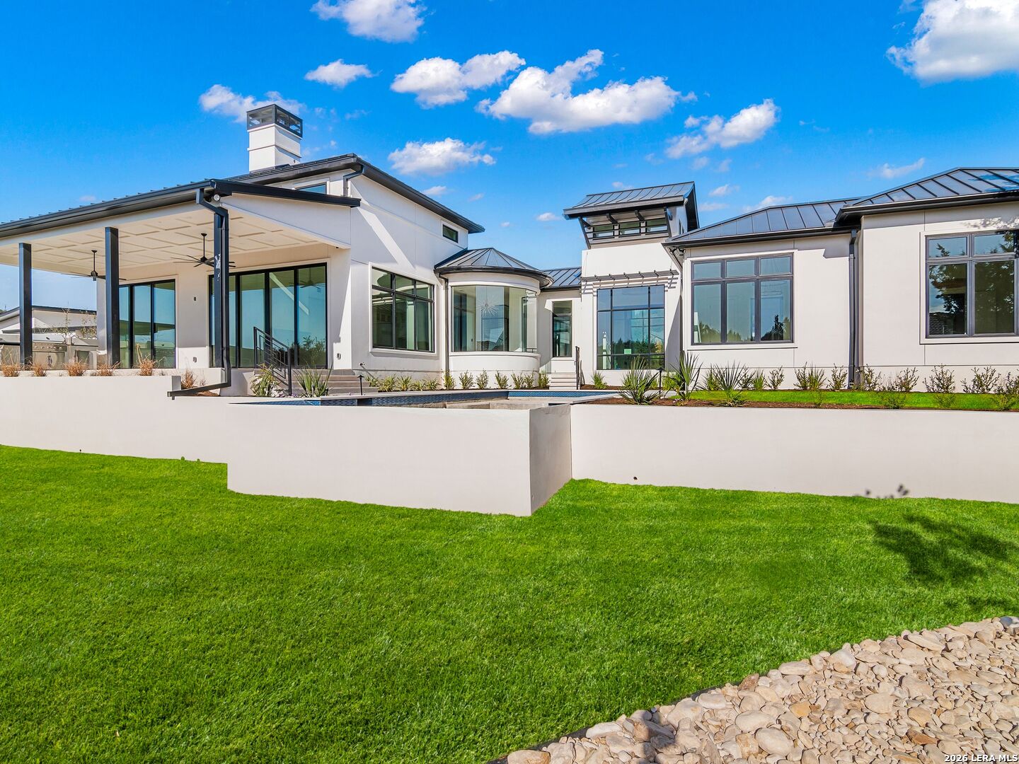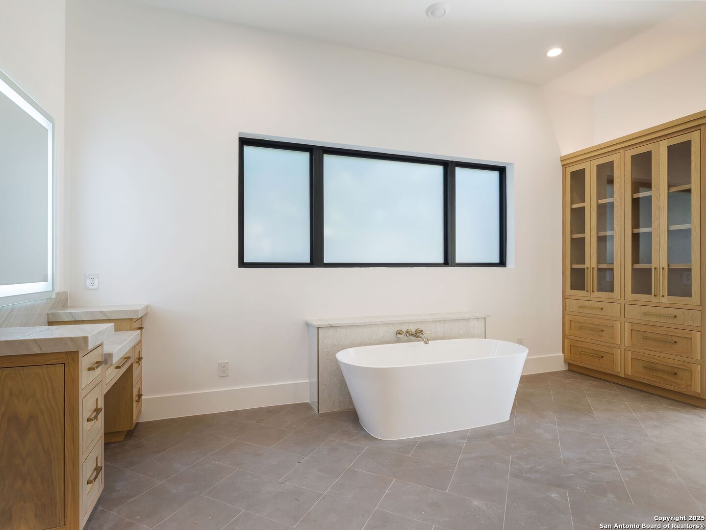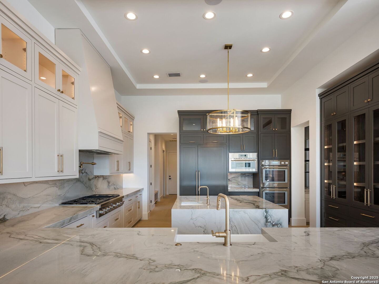 This brand-new custom construction by Uptown Homes in The Dominion features architectural design by ADesign's Gustavo Arredondo and interior selections by YADESIGN INTERIORS. Built with exceptional attention to detail, the home showcases refined finishes, custom ceiling treatments, and thoughtfully integrated architectural elements throughout. The chef's kitchen is outfitted with professional-grade stainless steel appliances and opens to a spacious great room with soaring ceilings, creating a seamless flow for everyday living and entertaining. The primary suite offers a spa-like bath and a large walk-in closet with extensive built-ins. Three additional guest bedrooms each feature private en-suite baths, and a generously sized game room provides added flexibility. Outdoor living is equally well-appointed, with a covered patio, full outdoor kitchen, expansive hardscaping, and a sparkling pool set within a private, resort-style setting.
