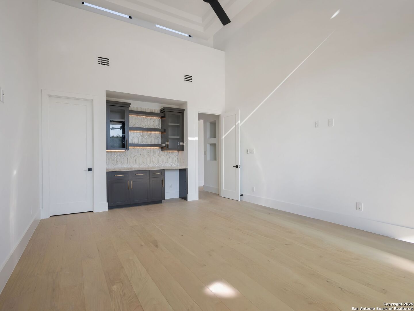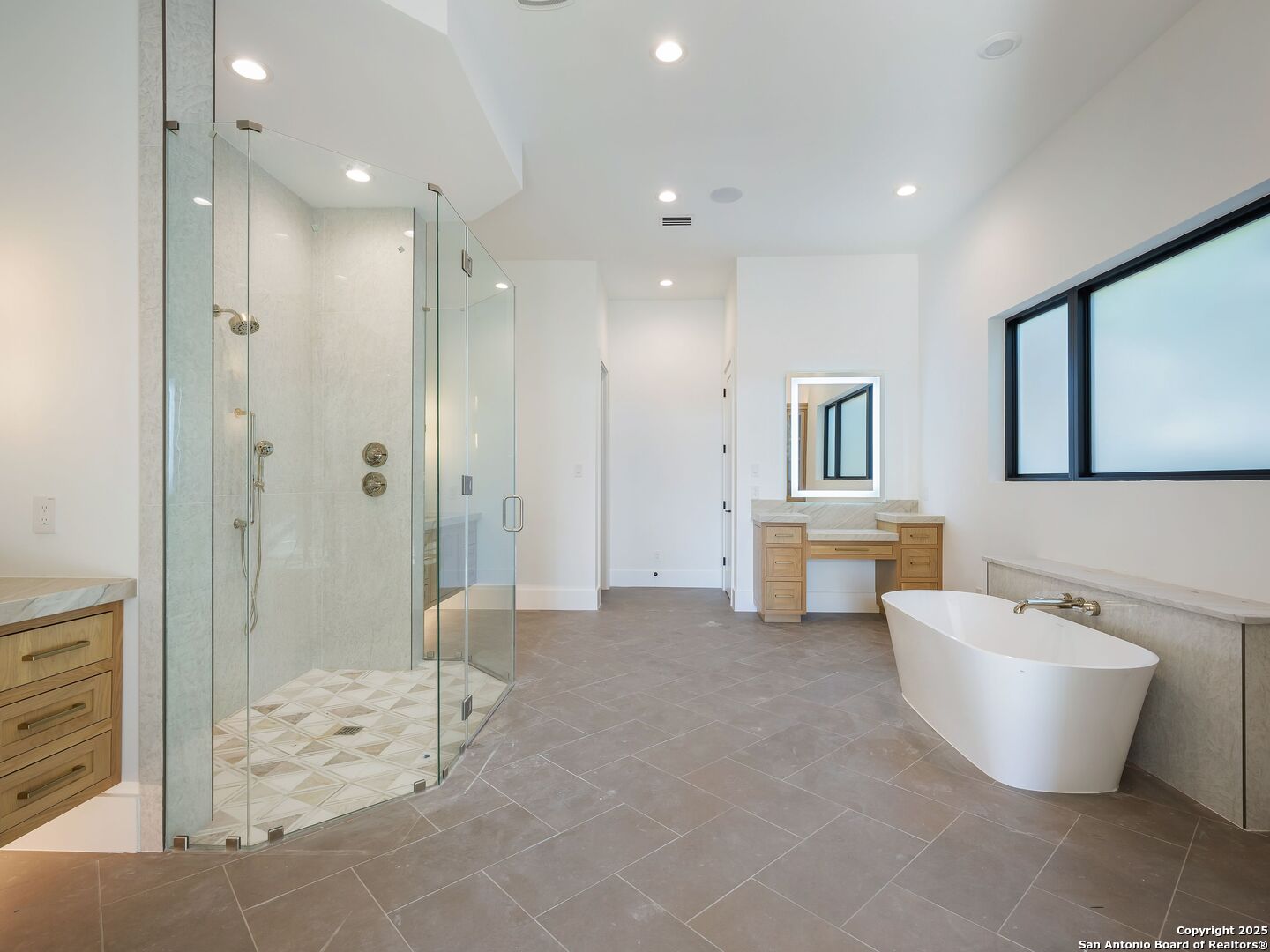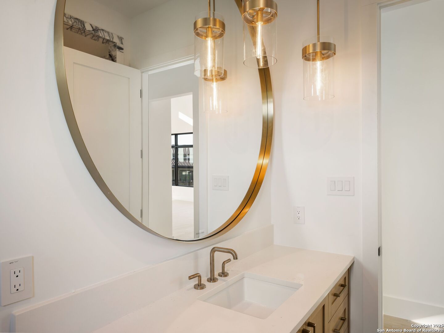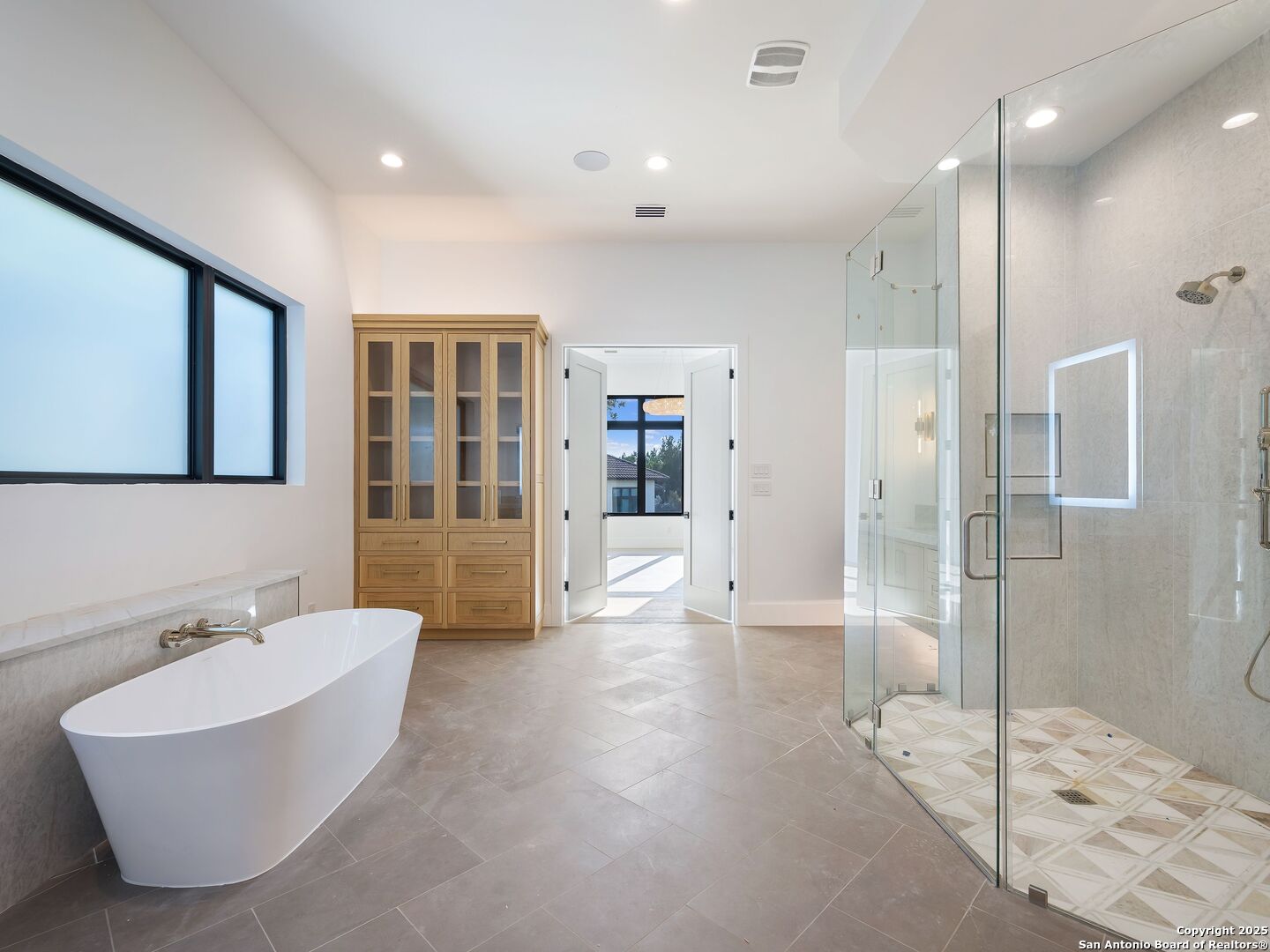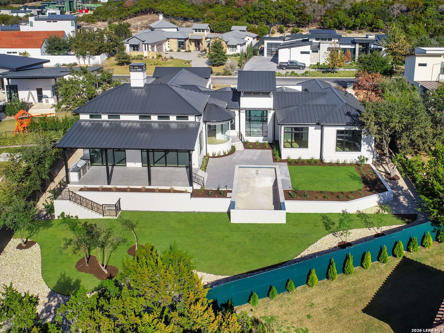 This brand-new custom construction by Uptown Homes in The Dominion features architectural design by ADesign's Gustavo Arredondo and interior selections by YADESIGN INTERIORS. Built with exceptional attention to detail, the home showcases refined finishes, custom ceiling treatments, and thoughtfully integrated architectural elements throughout. The chef's kitchen is outfitted with professional-grade stainless steel appliances and opens to a spacious great room with soaring ceilings, creating a seamless flow for everyday living and entertaining. The primary suite offers a spa-like bath and a large walk-in closet with extensive built-ins. Three additional guest bedrooms each feature private en-suite baths, and a generously sized game room provides added flexibility. Outdoor living is equally well-appointed, with a covered patio, full outdoor kitchen, expansive hardscaping, and a sparkling pool set within a private, resort-style setting.