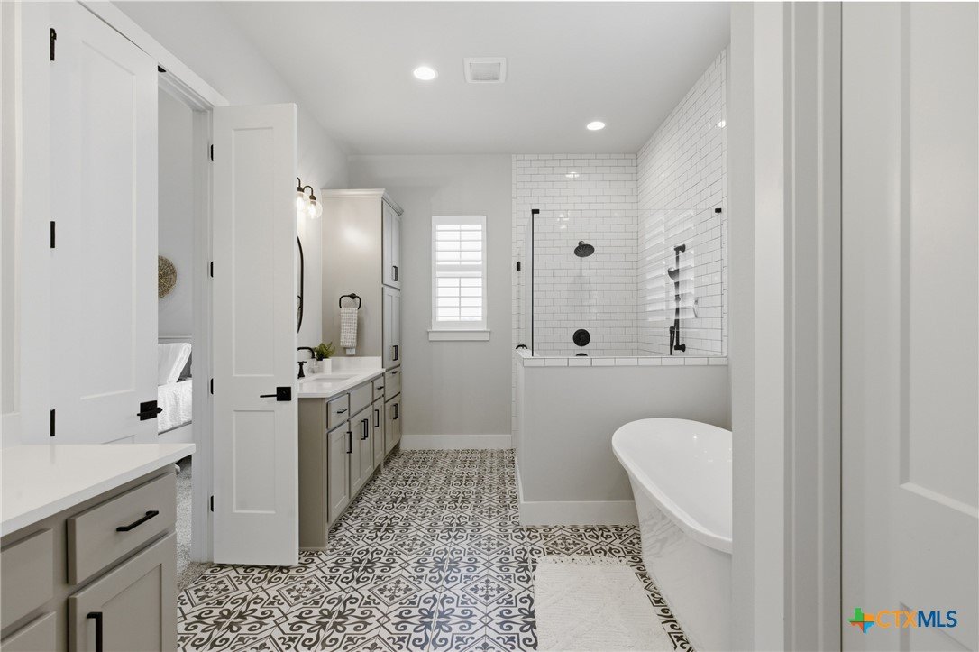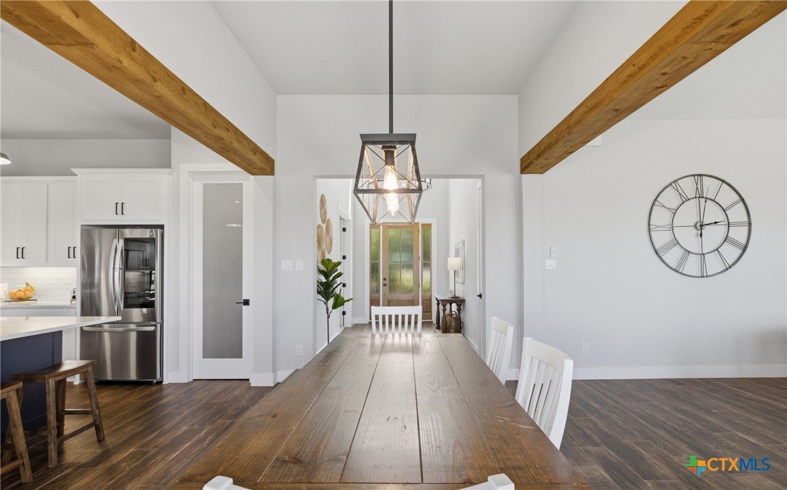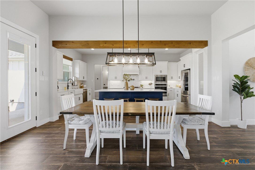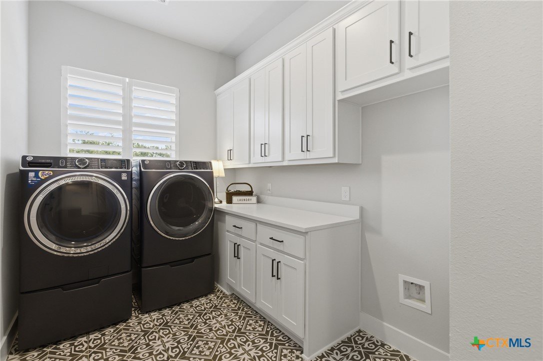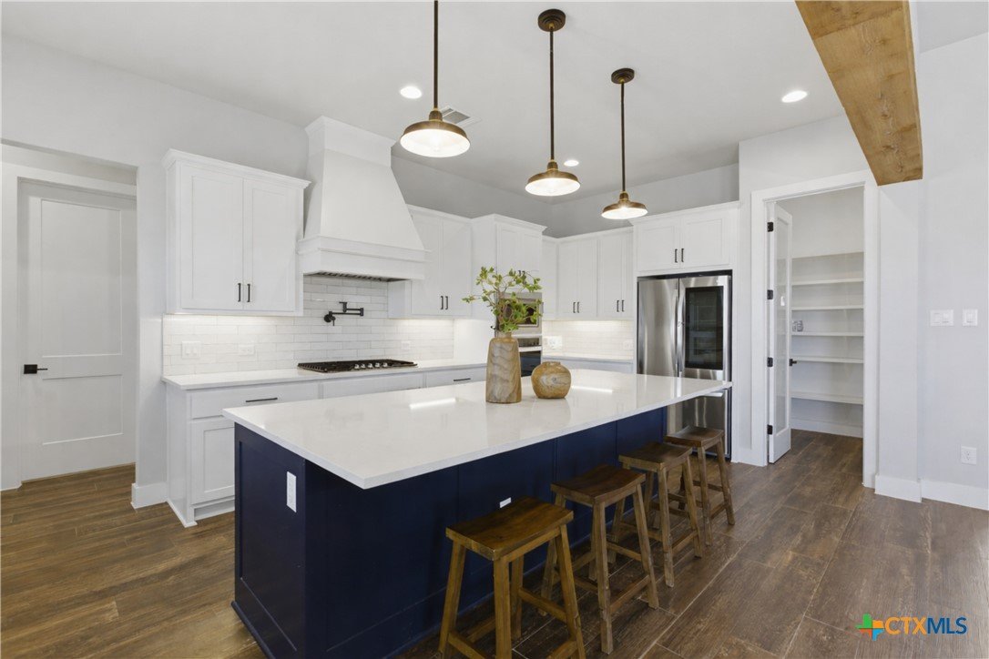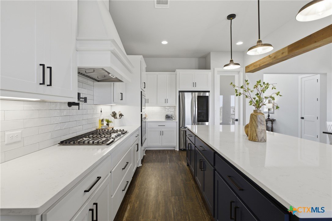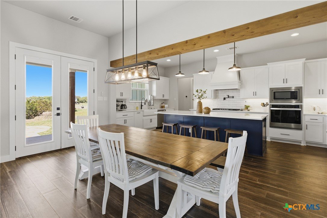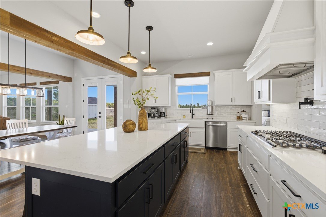 Custom modern farmhouse meets timeless elegance in this stunning property, situated on an expansive & incredibly private 3.08-acre lot showcasing serene Hill Country views & endless possibilities—all with no HOA to limit your vision. Fully fenced with a solar-powered gated entry, the property is equipped with a generator hookup, RV hookup, buried 250-gallon propane tank, hardwired exterior security cameras, & a whole-house water filtration system. A long driveway leads to a side garage featuring epoxy floors. Inside, the home welcomes you with an open layout, soaring ceilings, expansive windows, & beautiful wood-look ceramic tile. The spacious living room is highlighted by a beamed cathedral ceiling, tranquil views, & a striking black wood-burning stove, seamlessly flowing into the dining area & kitchen. The kitchen impresses with quartz countertops, a large island with bar seating, crisp white cabinetry with under lighting & pot filler over the stove, a classic subway tile backsplash, & a custom butler's walk-in pantry. An office/flex space offers versatility for work or hobbies. The primary suite features a cathedral ceiling, an electric fireplace with mantle, & a chic ensuite bath with dual vanities, a soaking tub, frameless glass shower, & a spacious walk-in closet with built-ins. Two additional bedrooms provide flexibility & share a full bath. Step outside to enjoy the expansive backyard, where a large covered patio with a gas stub & a beautifully crafted circular stonework patio create the perfect setting for entertaining or relaxing under the Texas sky. Additional highlights include a spacious storage shed w/tools that convey. With ample room to roam & customize, this property offers the freedom to raise animals, start a garden, build a guest house, or create the lifestyle you’ve always envisioned. Ideally located just a short drive from H-E-B, shopping, dining, & recreation, & with easy access to TX-195 & US-183.