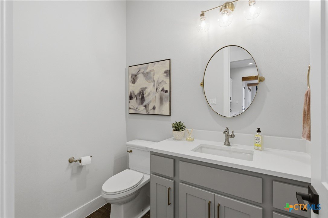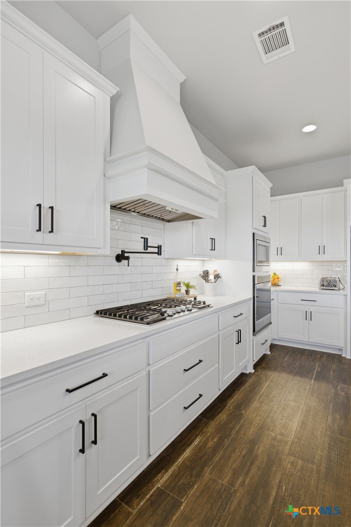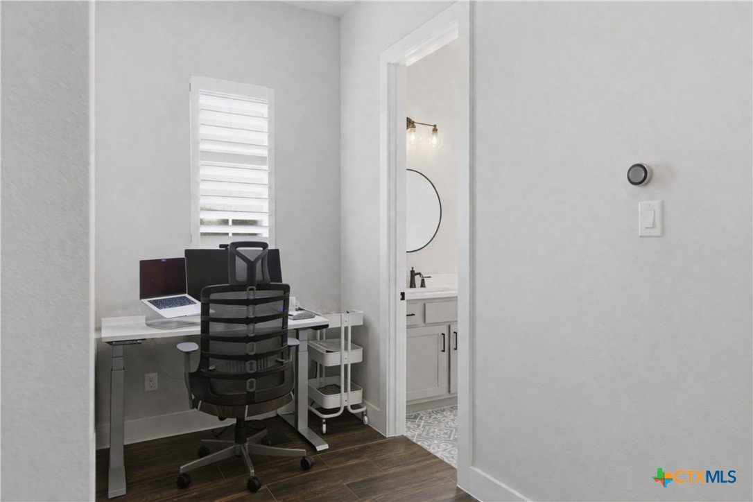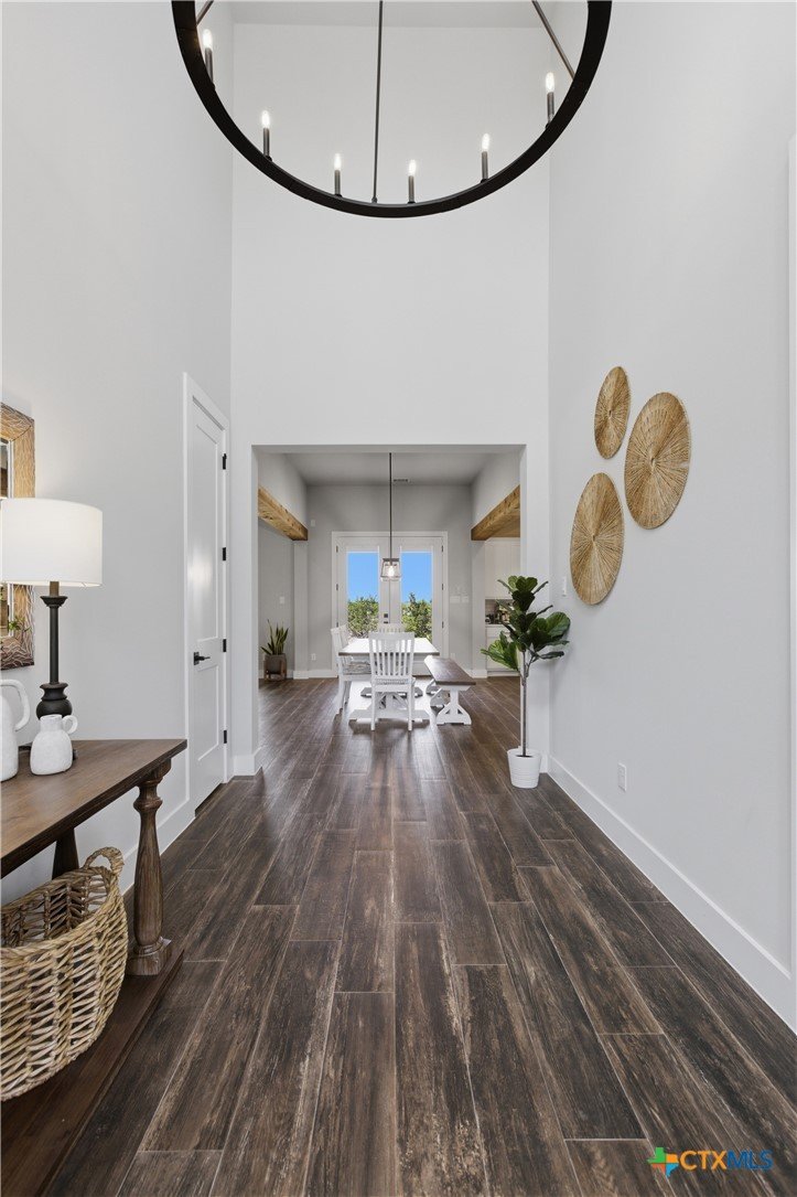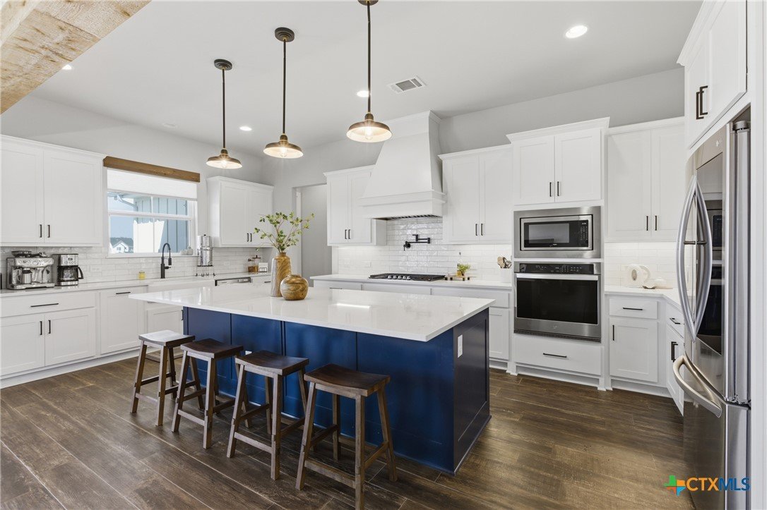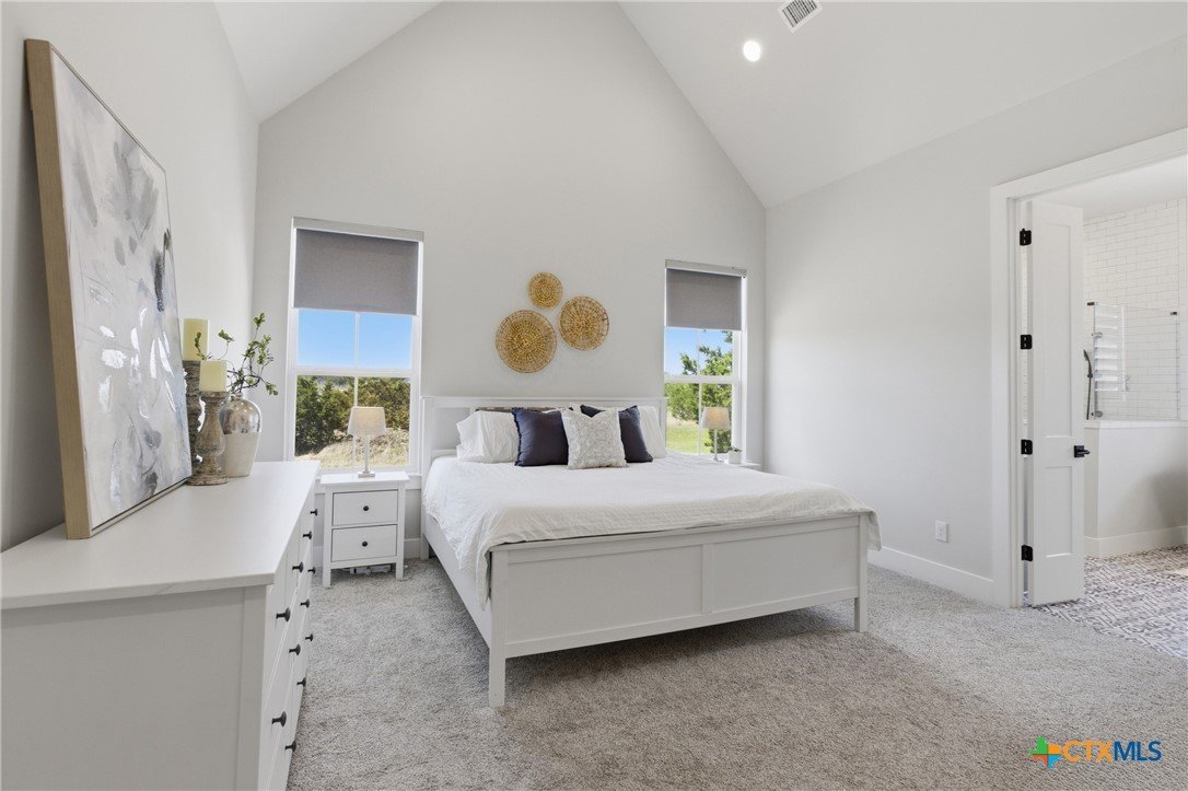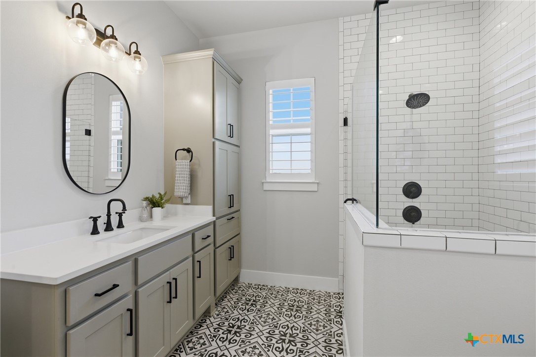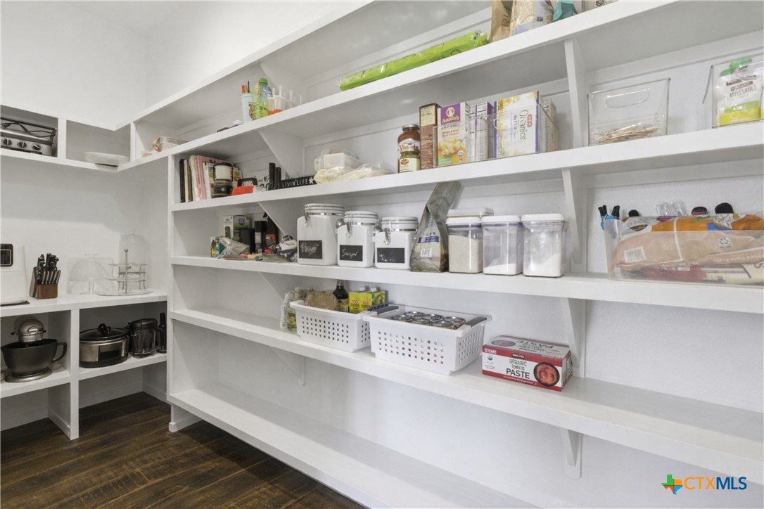 Custom modern farmhouse meets timeless elegance in this stunning property, situated on an expansive & incredibly private 3.08-acre lot showcasing serene Hill Country views & endless possibilities—all with no HOA to limit your vision. Fully fenced with a solar-powered gated entry, the property is equipped with a generator hookup, RV hookup, buried 250-gallon propane tank, hardwired exterior security cameras, & a whole-house water filtration system. A long driveway leads to a side garage featuring epoxy floors. Inside, the home welcomes you with an open layout, soaring ceilings, expansive windows, & beautiful wood-look ceramic tile. The spacious living room is highlighted by a beamed cathedral ceiling, tranquil views, & a striking black wood-burning stove, seamlessly flowing into the dining area & kitchen. The kitchen impresses with quartz countertops, a large island with bar seating, crisp white cabinetry with under lighting & pot filler over the stove, a classic subway tile backsplash, & a custom butler's walk-in pantry. An office/flex space offers versatility for work or hobbies. The primary suite features a cathedral ceiling, an electric fireplace with mantle, & a chic ensuite bath with dual vanities, a soaking tub, frameless glass shower, & a spacious walk-in closet with built-ins. Two additional bedrooms provide flexibility & share a full bath. Step outside to enjoy the expansive backyard, where a large covered patio with a gas stub & a beautifully crafted circular stonework patio create the perfect setting for entertaining or relaxing under the Texas sky. Additional highlights include a spacious storage shed w/tools that convey. With ample room to roam & customize, this property offers the freedom to raise animals, start a garden, build a guest house, or create the lifestyle you’ve always envisioned. Ideally located just a short drive from H-E-B, shopping, dining, & recreation, & with easy access to TX-195 & US-183.