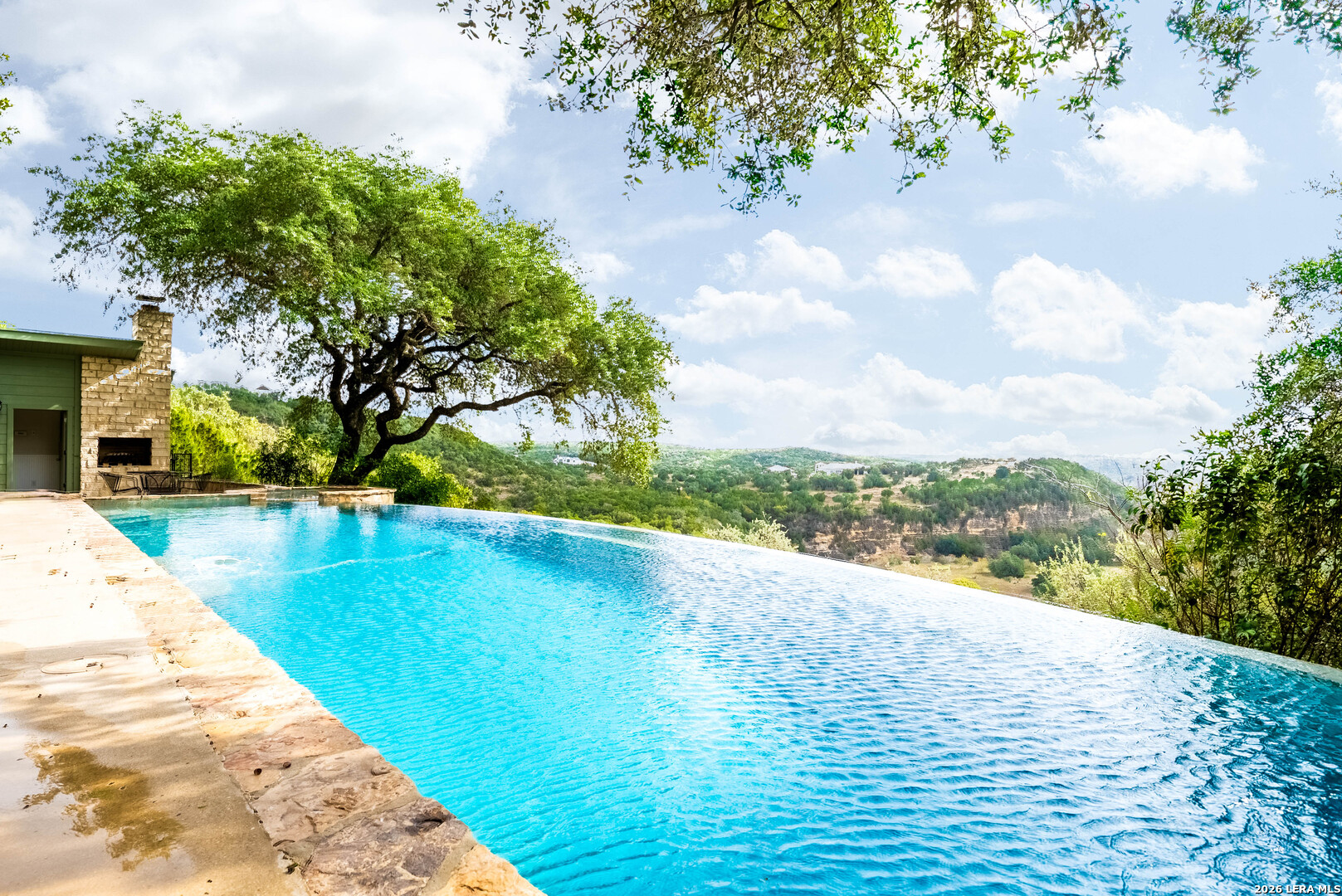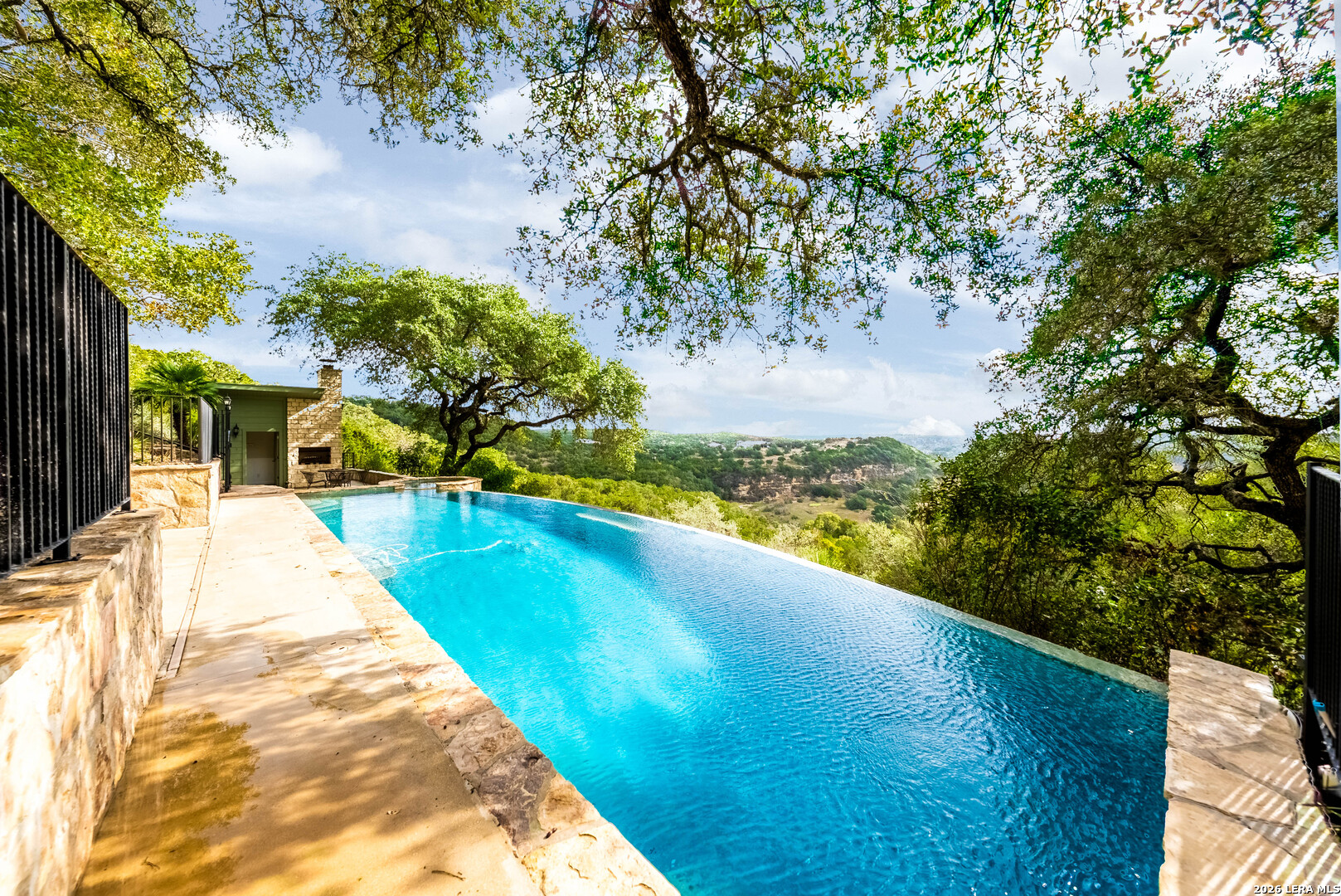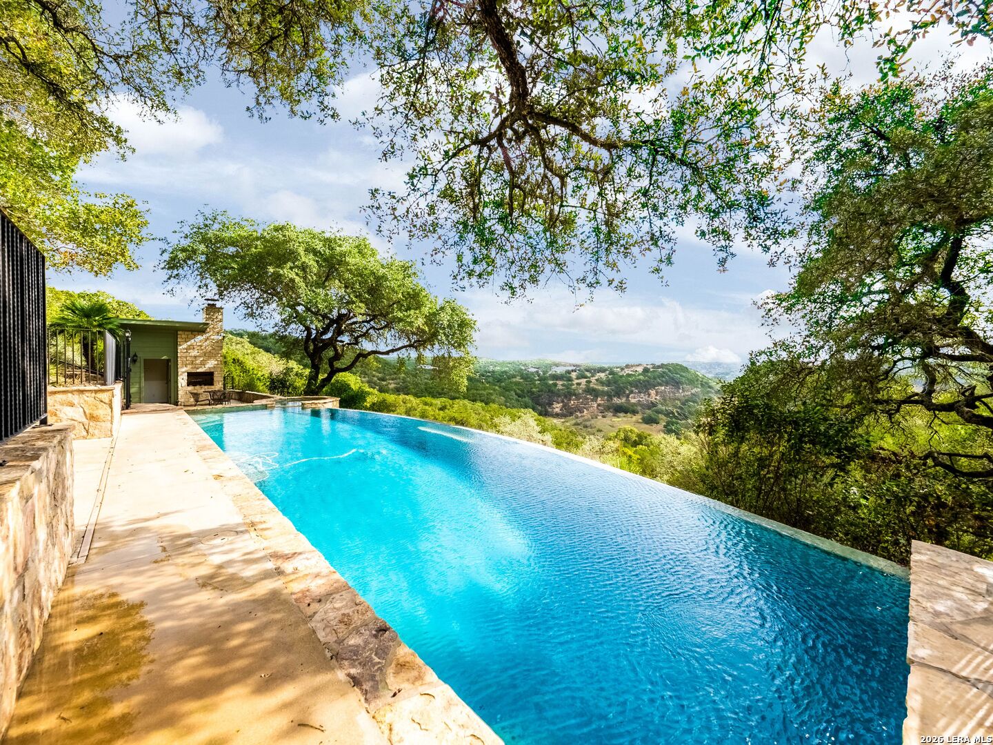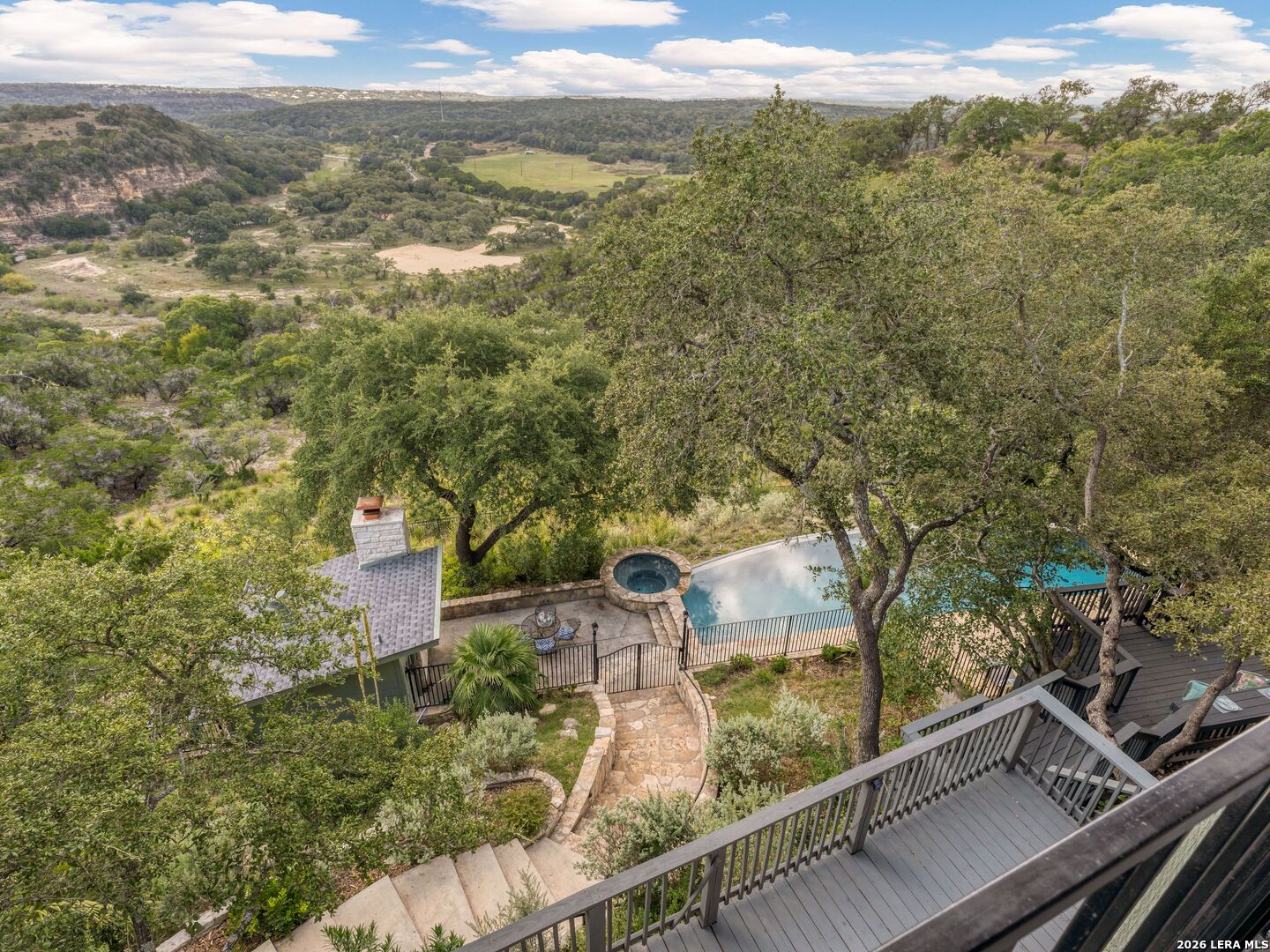 Perched high above the Texas Hill Country, The Cloud House of Bulverde lives up to its name-an ethereal retreat where the clouds meet the hills, and every sunrise feels like a painting. Set on over three private acres with minimal HOA, this architectural masterpiece combines elevated design with natural serenity, just 15 minutes from San Antonio and within the highly acclaimed Comal ISD. Originally envisioned by award-winning Austin architect Tim Cuppett - recently celebrated for designing Emma Stone's Austin residence-and brought to life by Davee Custom Homes, this extraordinary home exemplifies timeless Hill Country modernism. The property has been meticulously cared for, preserving its architectural integrity while blending tasteful updates and designer finish-outs that enhance both livability and sophistication. Inside, soaring ceilings, an oversized maple staircase, and walls of glass frame panoramic canyon and Cibolo Creek views from nearly every room. The split-level floor plan was thoughtfully designed for flexibility, offering multiple living spaces, four spacious bedrooms, five bathrooms, a dedicated office with built-ins and corner windows, a gym, and an inviting media room. The configuration also allows for the creation of a fully self-contained guest retreat, mother-in-law suite, or staff quarters with private access. The reimagined primary suite features a spa-inspired bath, gas fireplace, walk-in closet, and a private covered balcony overlooking the Hill Country. The sleek kitchen showcases designer cabinetry, granite counters, and a Thermador 6-burner gas range, seamlessly flowing into the open dining and living areas anchored by a striking limestone wall and fireplace. Outdoors, this property transcends expectation with an expansive negative-edge pool and elevated spa, perfectly positioned to capture the endless views. Multiple entertaining decks cascade down the hillside, complemented by a built-in grill, poolside half bath, and outdoor shower-all designed to enjoy the Hill Country's natural beauty in comfort and style. Mature oaks shade the landscape, offering both privacy and a serene connection to nature. Gated, metal-fenced, and cross-fenced, this contemporary Hill Country retreat was created for those who desire what no one else has-a sanctuary of luxury, peace, and panoramic beauty. Conveniently located between New Braunfels and San Antonio, The Cloud House of Bulverde is more than a home-it's a masterpiece in the sky.