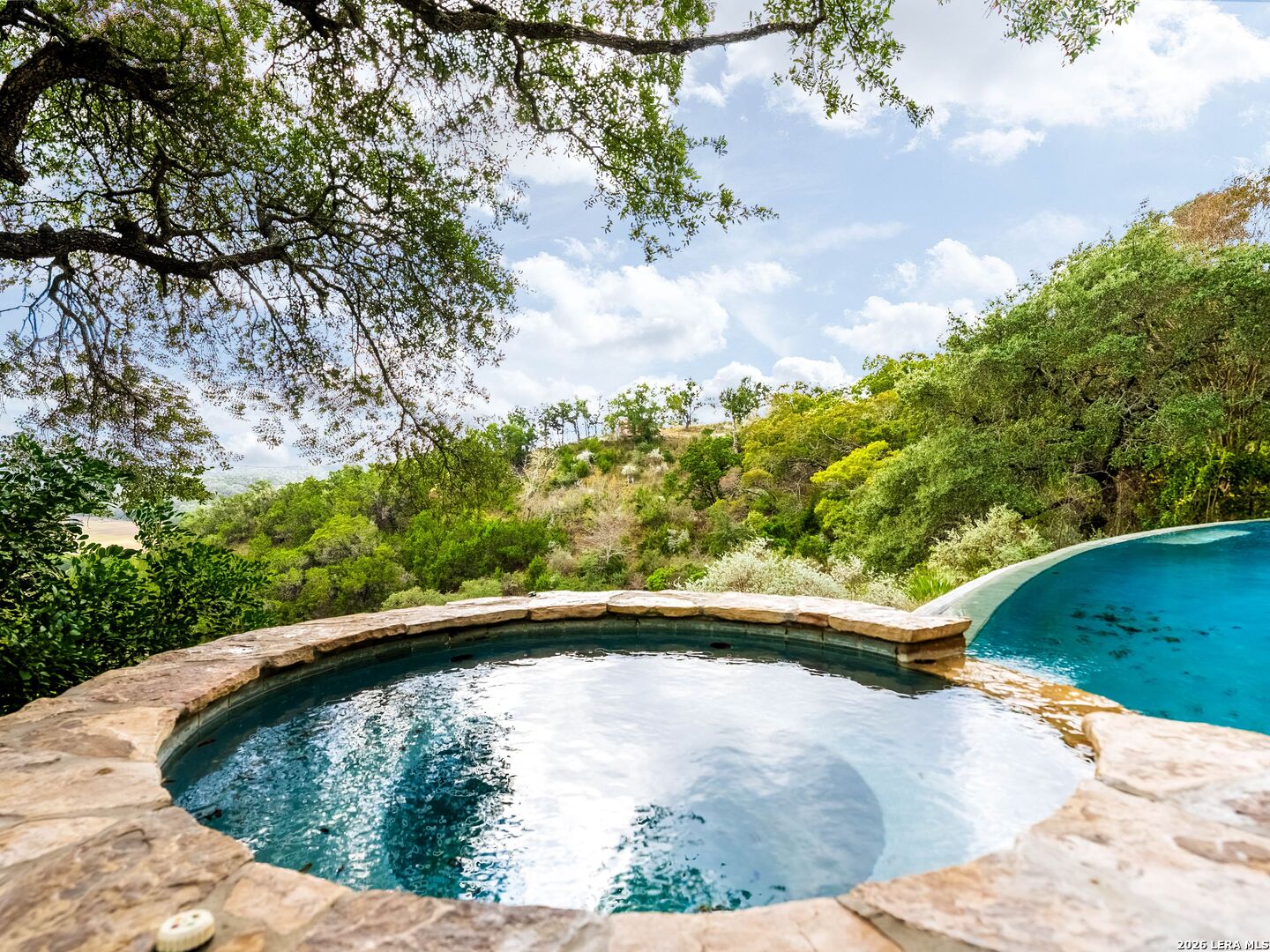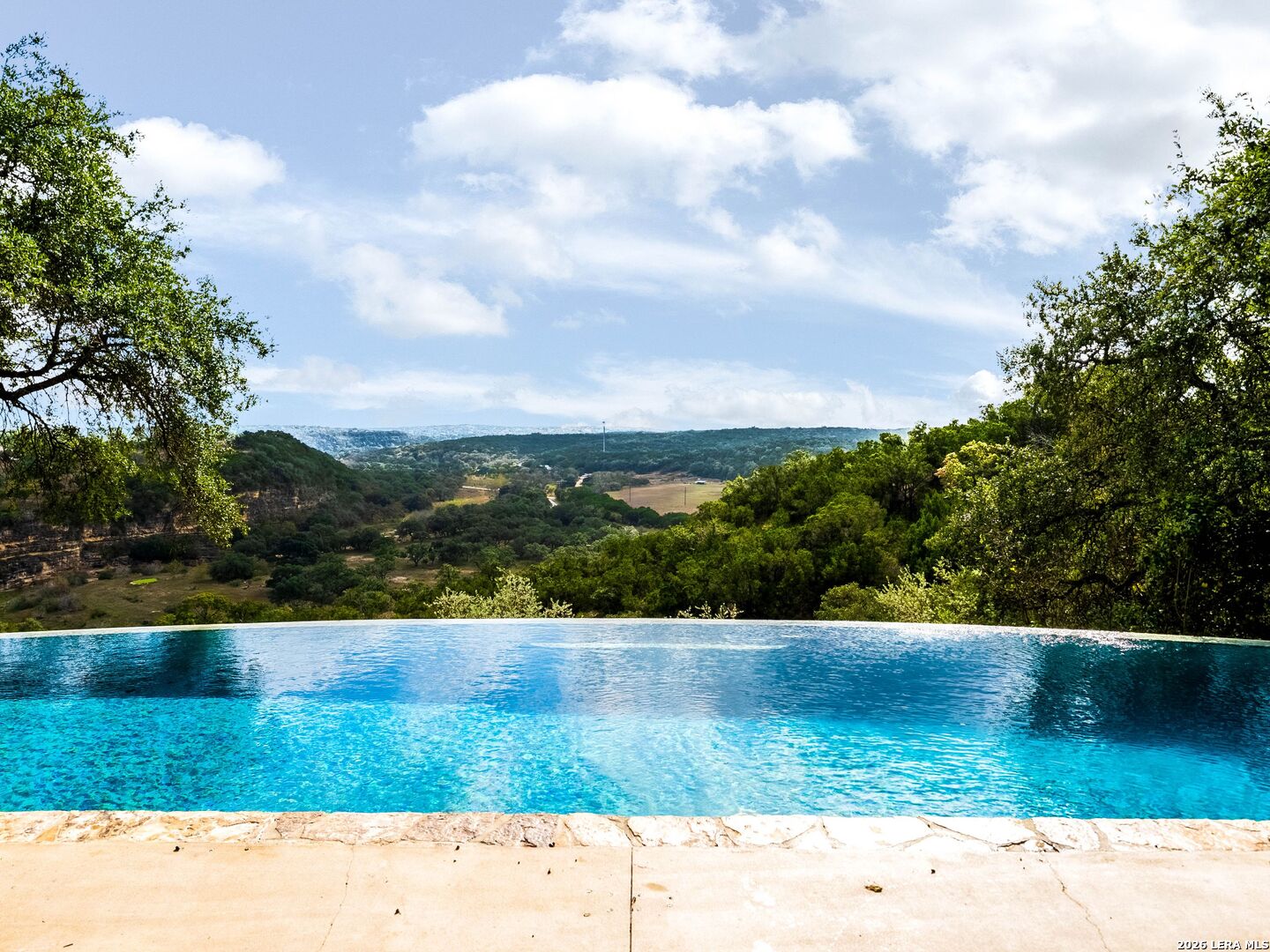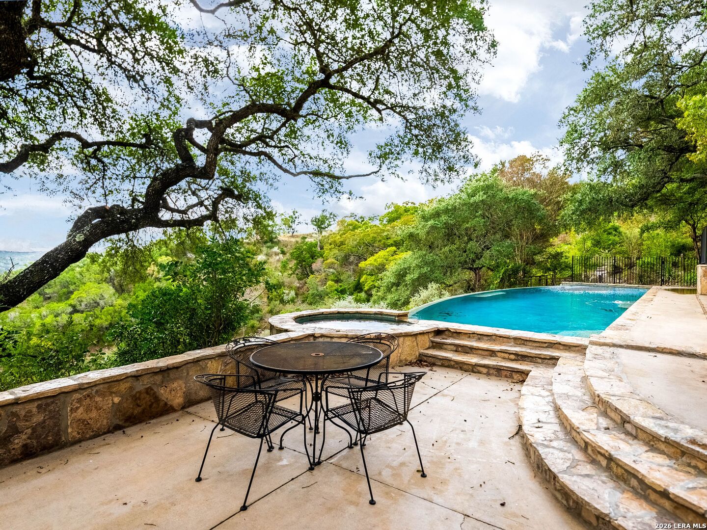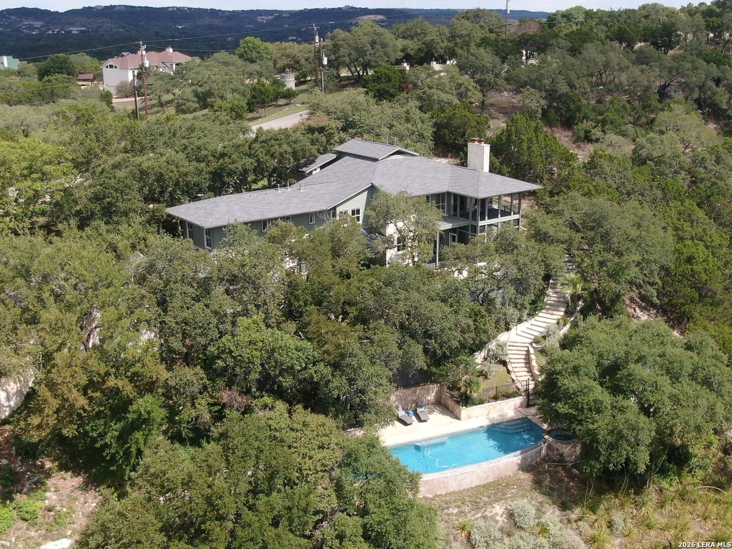 Perched high above the Texas Hill Country, The Cloud House of Bulverde lives up to its name-an ethereal retreat where the clouds meet the hills, and every sunrise feels like a painting. Set on over three private acres with minimal HOA, this architectural masterpiece combines elevated design with natural serenity, just 15 minutes from San Antonio and within the highly acclaimed Comal ISD. Originally envisioned by award-winning Austin architect Tim Cuppett - recently celebrated for designing Emma Stone's Austin residence-and brought to life by Davee Custom Homes, this extraordinary home exemplifies timeless Hill Country modernism. The property has been meticulously cared for, preserving its architectural integrity while blending tasteful updates and designer finish-outs that enhance both livability and sophistication. Inside, soaring ceilings, an oversized maple staircase, and walls of glass frame panoramic canyon and Cibolo Creek views from nearly every room. The split-level floor plan was thoughtfully designed for flexibility, offering multiple living spaces, four spacious bedrooms, five bathrooms, a dedicated office with built-ins and corner windows, a gym, and an inviting media room. The configuration also allows for the creation of a fully self-contained guest retreat, mother-in-law suite, or staff quarters with private access. The reimagined primary suite features a spa-inspired bath, gas fireplace, walk-in closet, and a private covered balcony overlooking the Hill Country. The sleek kitchen showcases designer cabinetry, granite counters, and a Thermador 6-burner gas range, seamlessly flowing into the open dining and living areas anchored by a striking limestone wall and fireplace. Outdoors, this property transcends expectation with an expansive negative-edge pool and elevated spa, perfectly positioned to capture the endless views. Multiple entertaining decks cascade down the hillside, complemented by a built-in grill, poolside half bath, and outdoor shower-all designed to enjoy the Hill Country's natural beauty in comfort and style. Mature oaks shade the landscape, offering both privacy and a serene connection to nature. Gated, metal-fenced, and cross-fenced, this contemporary Hill Country retreat was created for those who desire what no one else has-a sanctuary of luxury, peace, and panoramic beauty. Conveniently located between New Braunfels and San Antonio, The Cloud House of Bulverde is more than a home-it's a masterpiece in the sky.