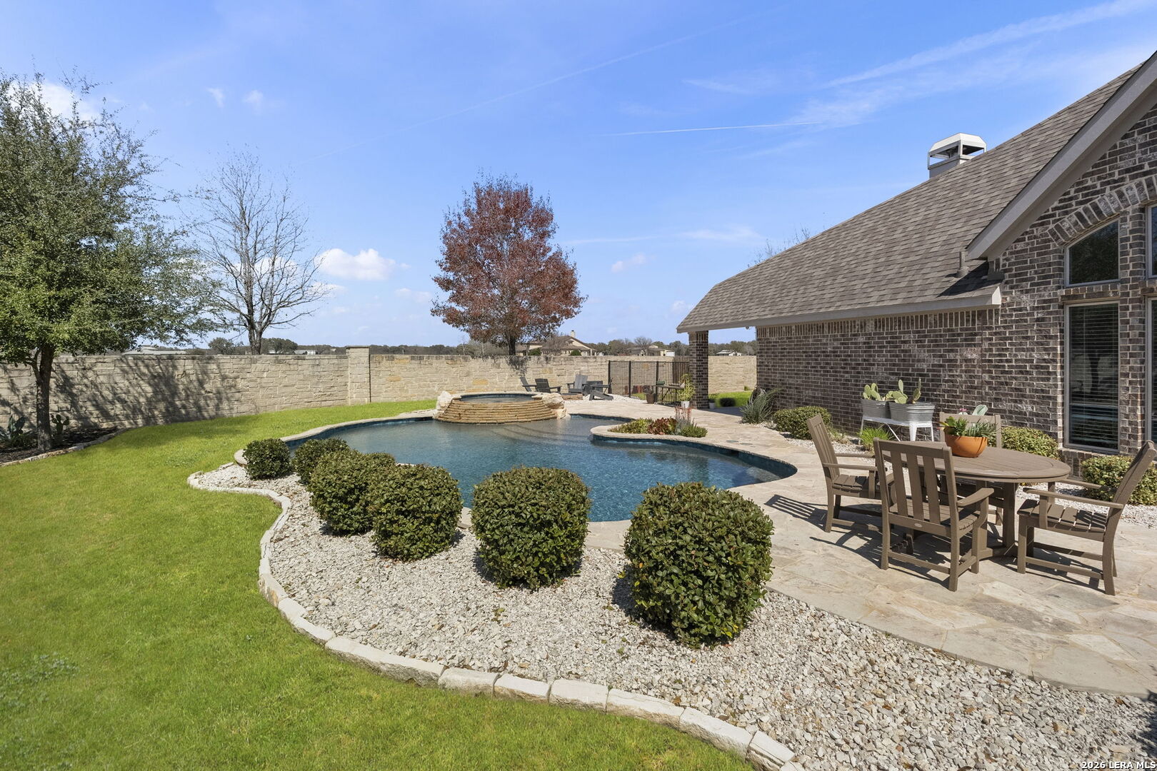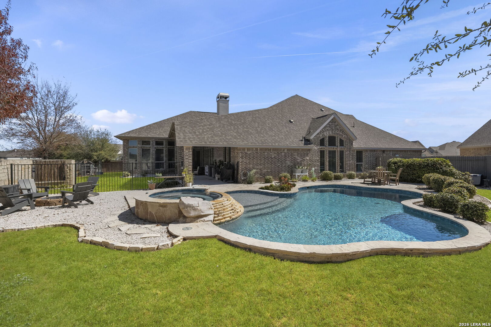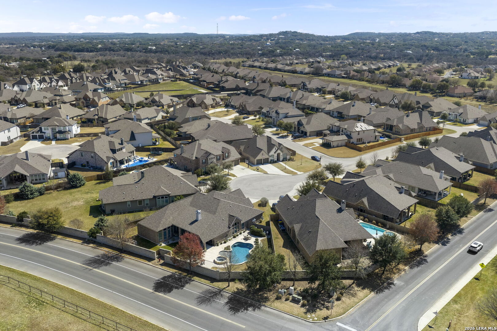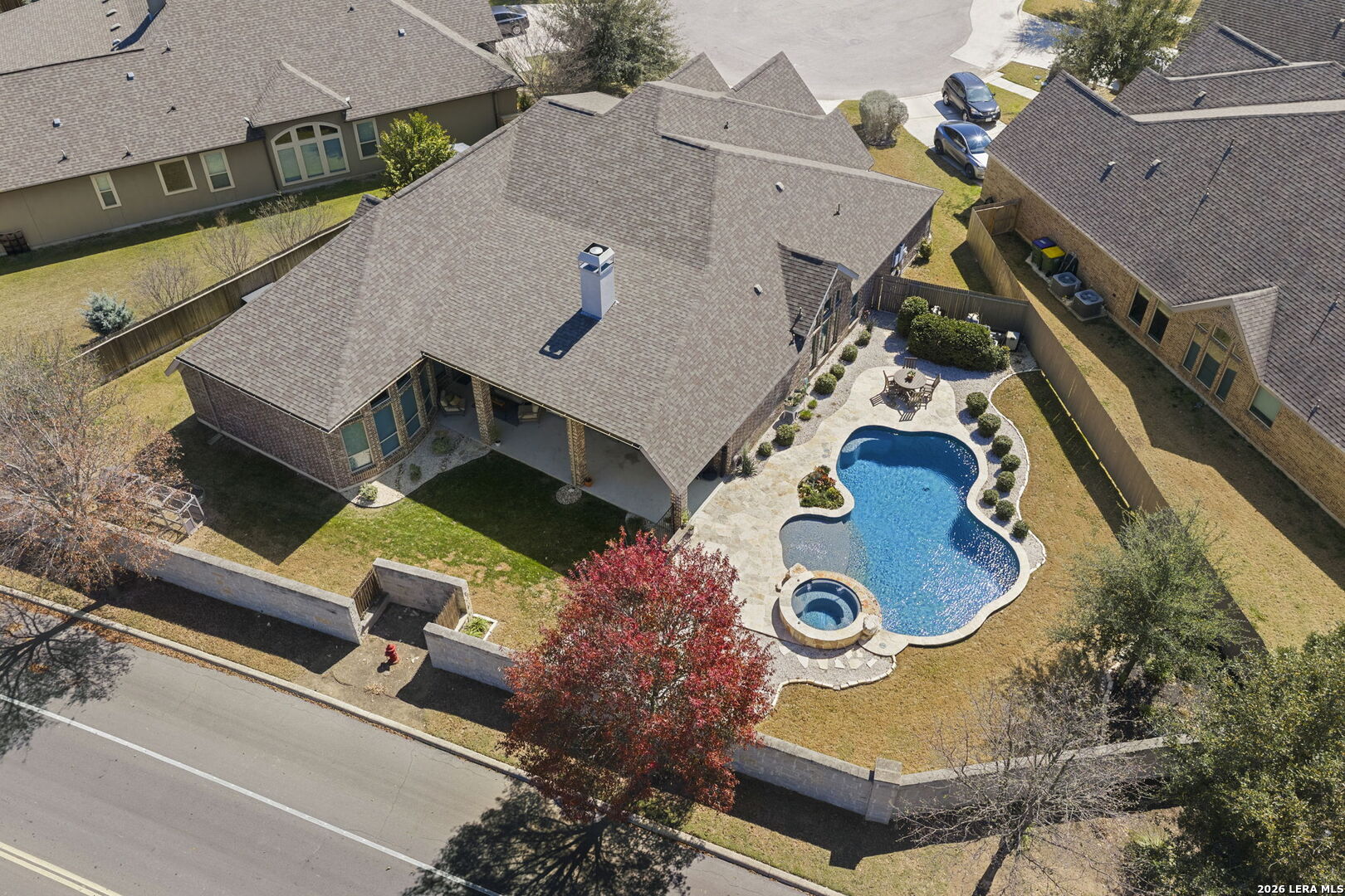 Located in the gated community of River Valley in Fair Oaks Ranch and golf cart distance to Fair Oaks Ranch Golf & Country Club, this beautifully designed home on a cul-de-sac offers resort-style outdoor living with an expansive flagstone patio, pool, and hot tub. This 4 bedroom, 3.5 bath home spans 3,419 sq ft and features three living spaces plus a private study, including a spacious family room, sitting room, and versatile flex space. Soaring ceilings, tile flooring through out, abundant natural light, and a cast stone fireplace elevate the main living area while the island kitchen boasts built in appliances, walk-in pantry, and breakfast bar. The secluded primary suite showcases a curved wall of windows and a spa-inspired bath with garden tub, glass-enclosed shower, dual vanities, and two walk-in closets. A private guest suite with full bath and a functional mud room complete this thoughtfully designed home. Welcome home to Fair Oaks living!
