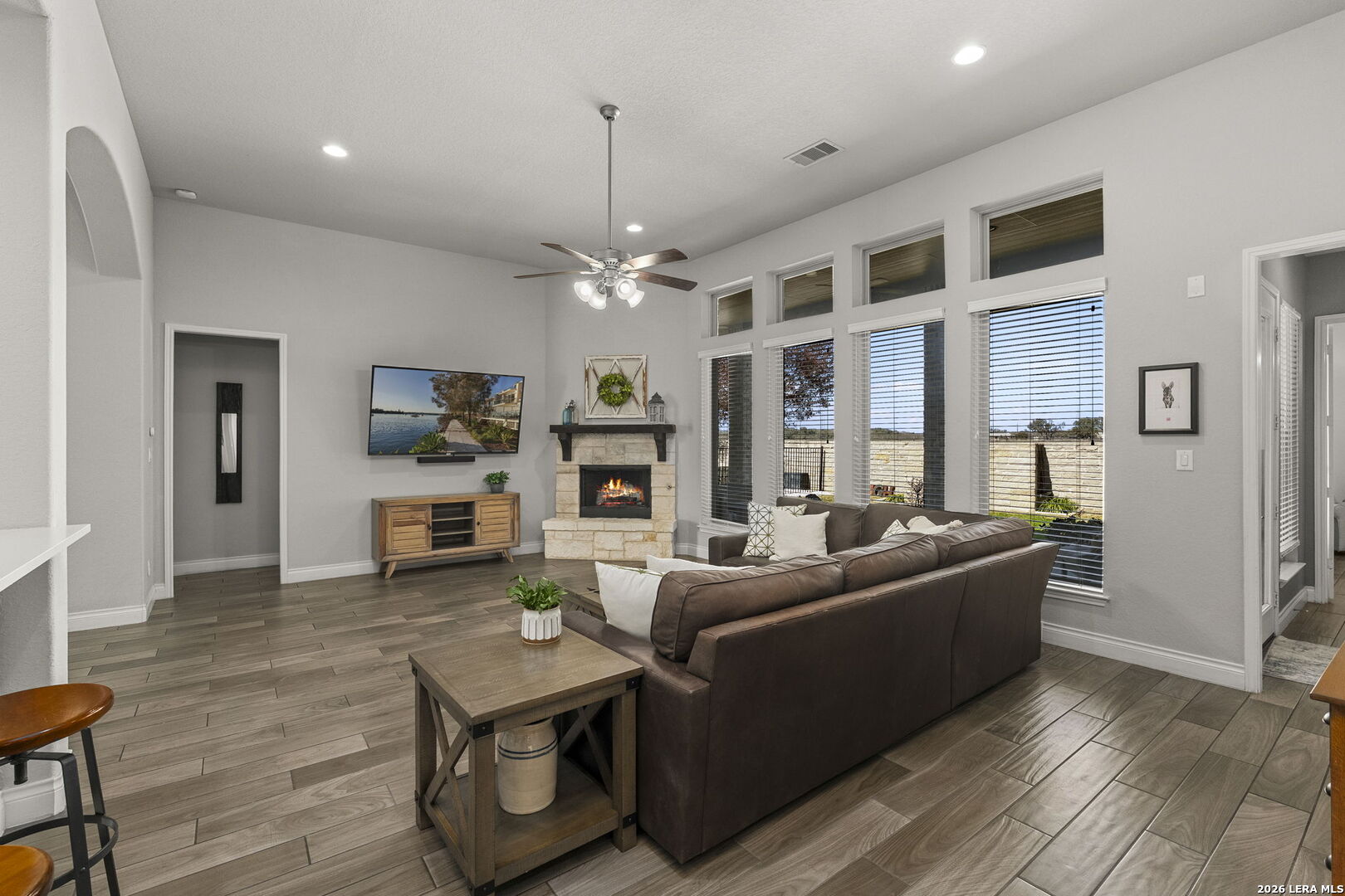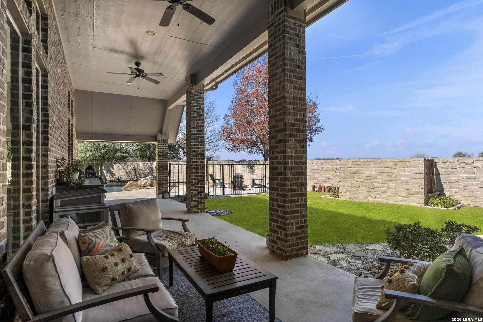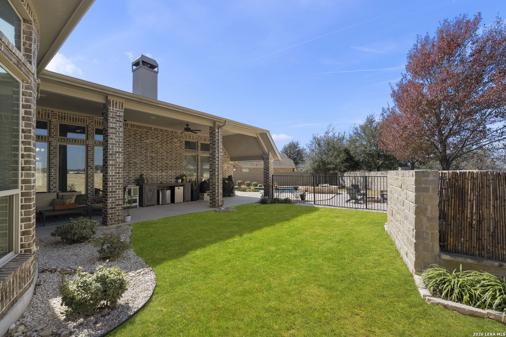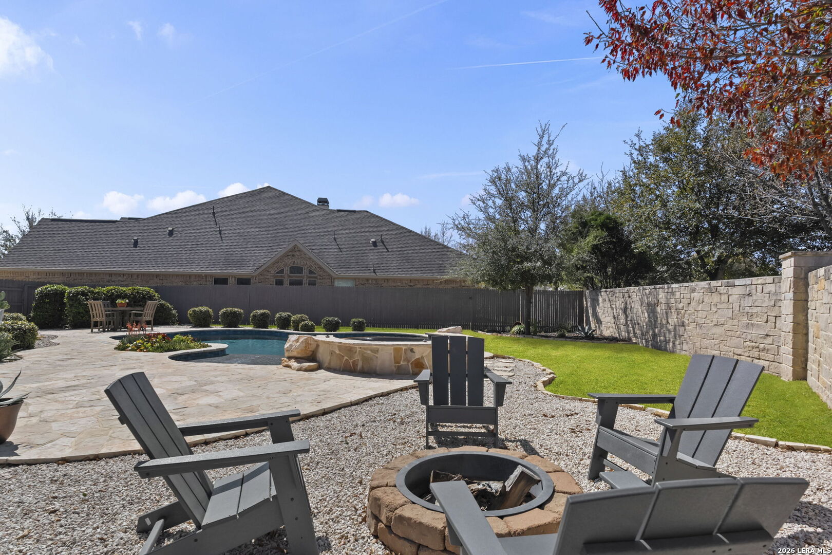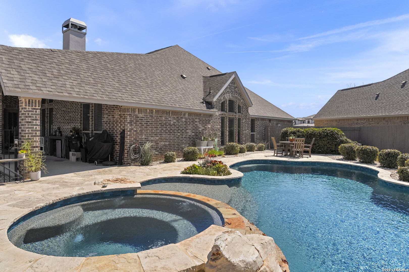 Located in the gated community of River Valley in Fair Oaks Ranch and golf cart distance to Fair Oaks Ranch Golf & Country Club, this beautifully designed home on a cul-de-sac offers resort-style outdoor living with an expansive flagstone patio, pool, and hot tub. This 4 bedroom, 3.5 bath home spans 3,419 sq ft and features three living spaces plus a private study, including a spacious family room, sitting room, and versatile flex space. Soaring ceilings, tile flooring through out, abundant natural light, and a cast stone fireplace elevate the main living area while the island kitchen boasts built in appliances, walk-in pantry, and breakfast bar. The secluded primary suite showcases a curved wall of windows and a spa-inspired bath with garden tub, glass-enclosed shower, dual vanities, and two walk-in closets. A private guest suite with full bath and a functional mud room complete this thoughtfully designed home. Welcome home to Fair Oaks living!