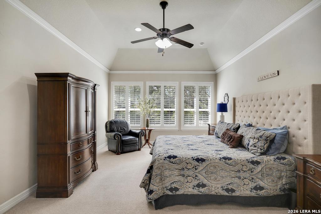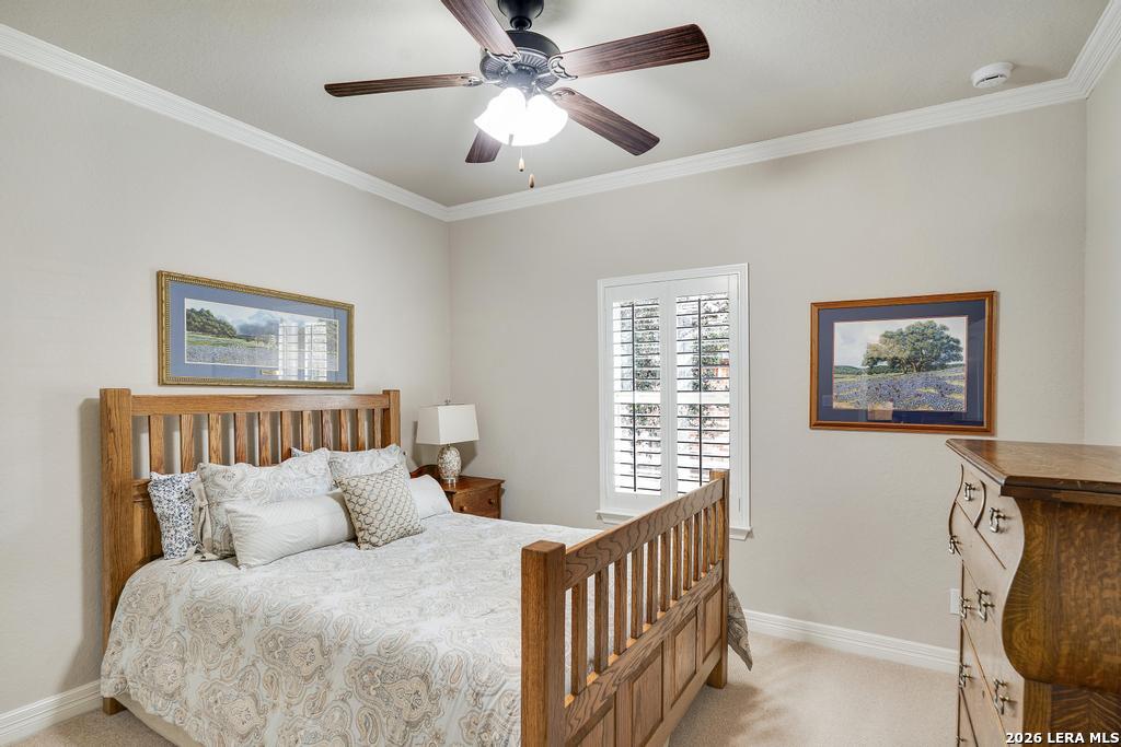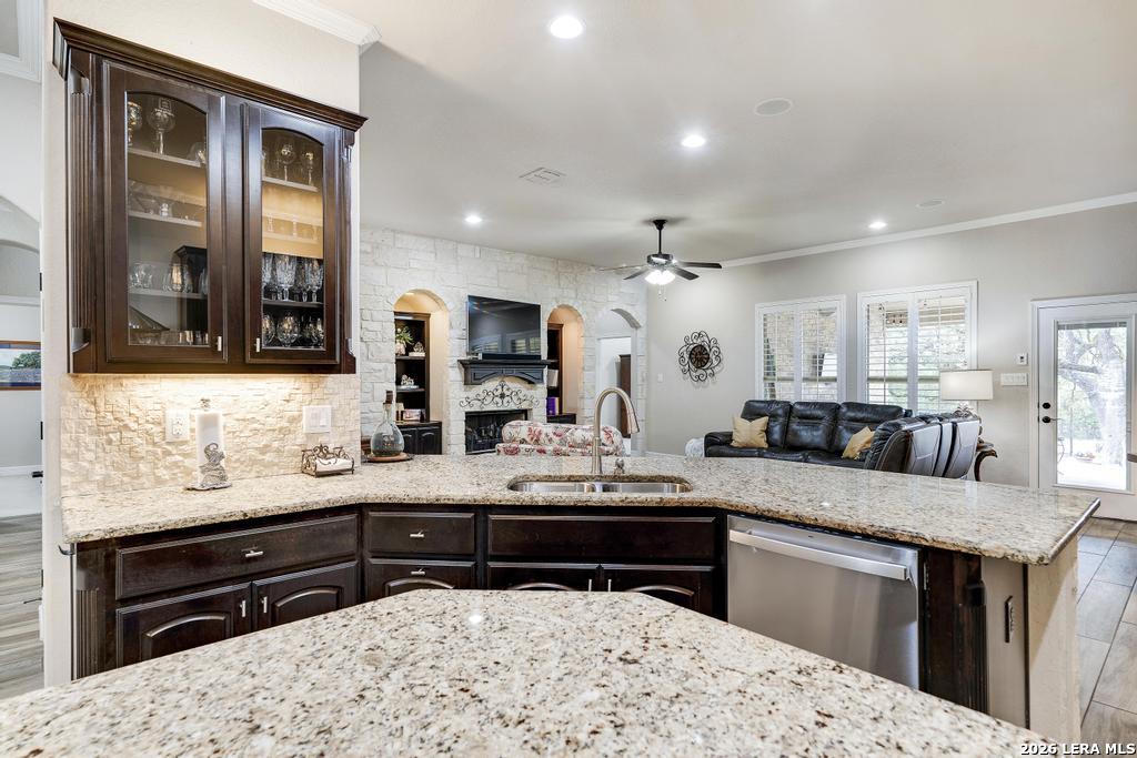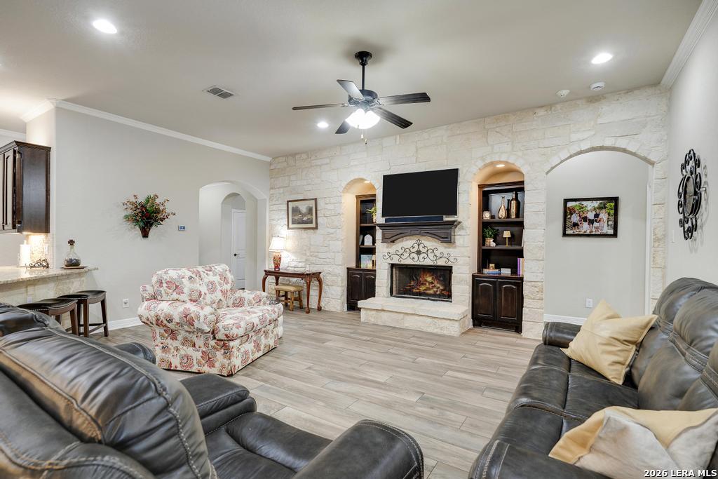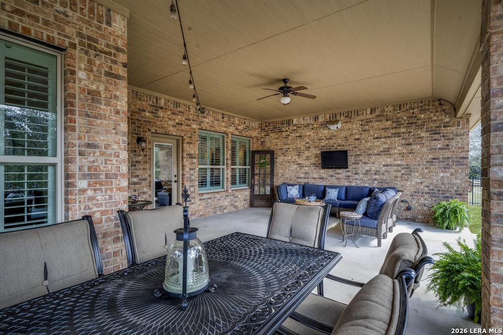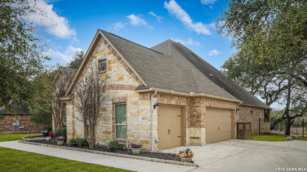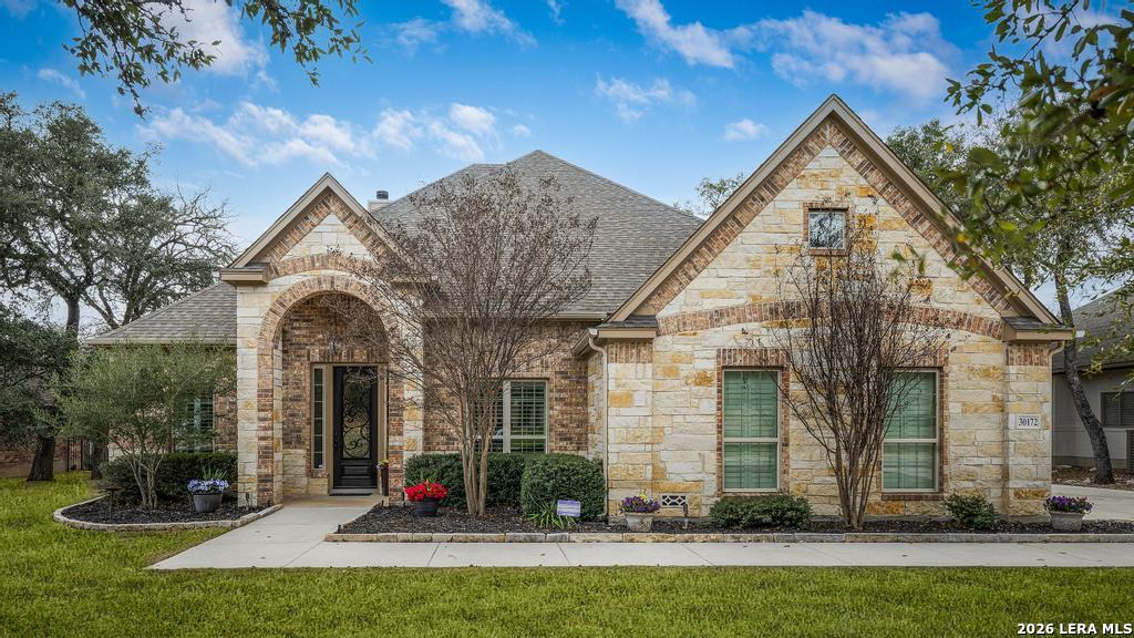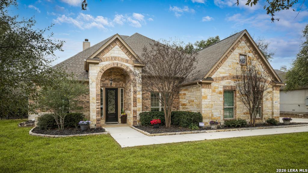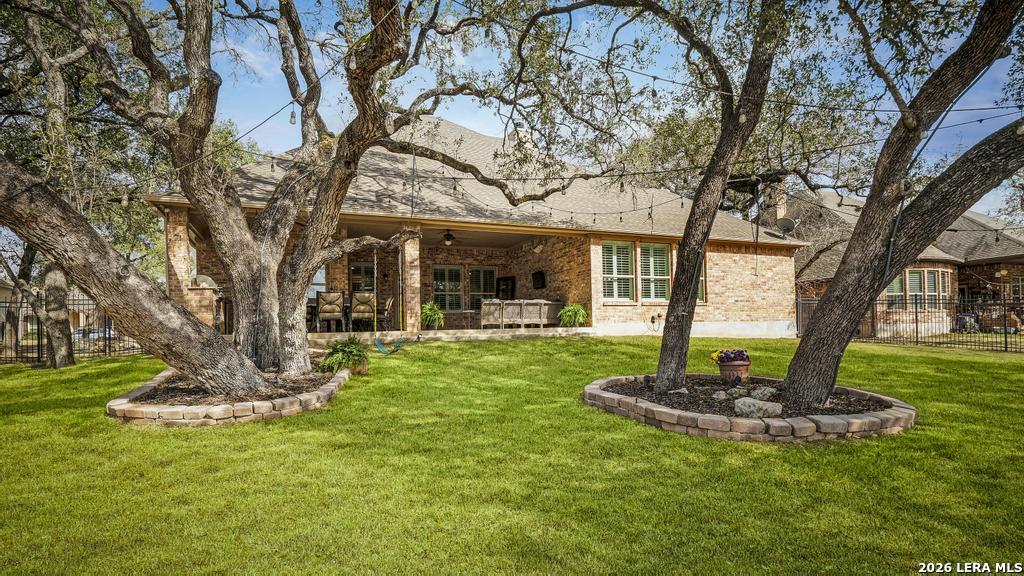 If you've been searching for a one-story home that gives you room to breathe without the upkeep of a larger property, this one deserves a serious look. Tucked inside the gated community of Setterfeld Estates in Fair Oaks Ranch, this stone and brick home sits on a generous lot shaded by mature live oaks - the kind of setting that's getting harder to find. Comal County's lower tax rates are just one more reason buyers keep gravitating here, and in a neighborhood where homes move quickly, one-story properties like this one don't last. From the moment you step through the front door, it's clear this home was built with care. High ceilings, open sight lines, and thoughtful architectural details - crown molding, graceful archways, and custom sheetrock work you simply don't see in most new construction - give it a character that's genuinely hard to replicate. Interior stone accent walls add warmth and Texas charm throughout. The spacious living room centers around a fireplace with a cut Texas limestone hearth and surround, a natural gathering point that anchors the entire main living area. Wood-look ceramic tile runs through the living spaces - durable, beautiful, and easy to maintain. A private study offers a quiet spot for working from home or handling whatever the day brings. The primary suite is a proper retreat, with split and separate vanities and a garden tub. Plantation shutters throughout add a finished, elevated look without feeling overdone. When it's time to be outside, the covered patio is genuinely impressive - the kind of outdoor living space Texans design their weekends around - complete with an outdoor kitchen ready for whatever you're cooking up. The three-car garage gives you flexibility for vehicles, storage, a workshop, or all three. The flex room adapts easily to whatever you need: a movie room, hobby space, game room, or quiet retreat. Homes in Setterfeld Estates sell fast. One-story homes on lots like this sell faster. Schedule your private showing soon. (Grass color has been enhanced.)