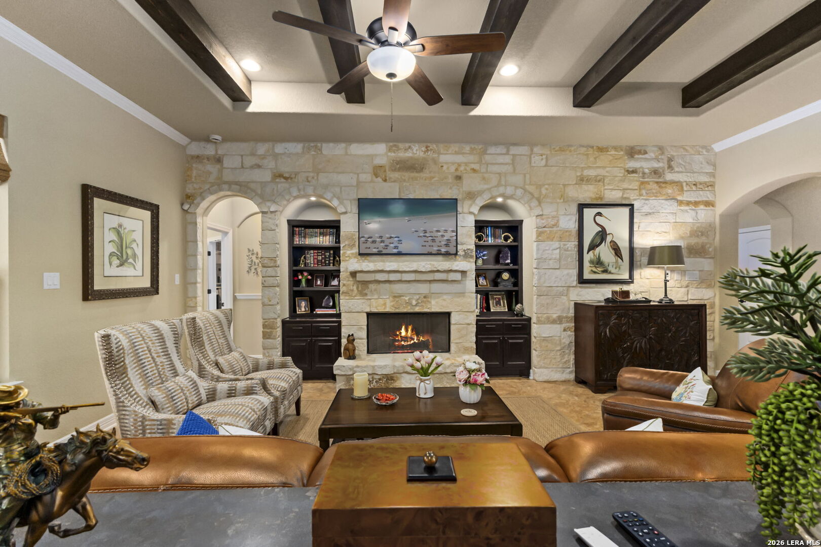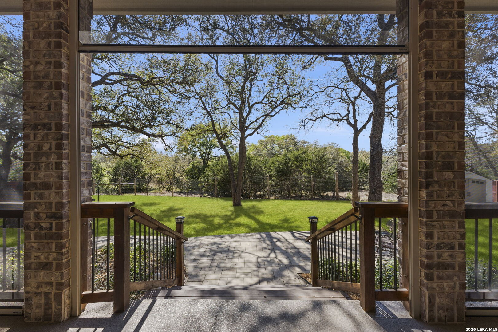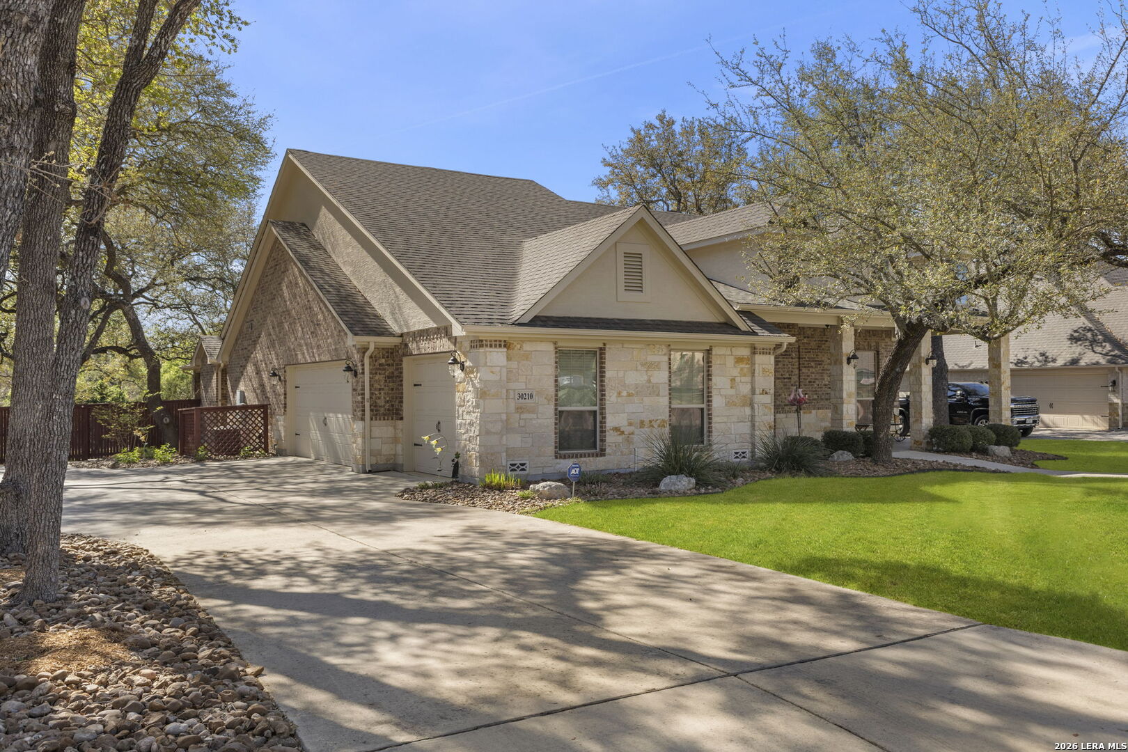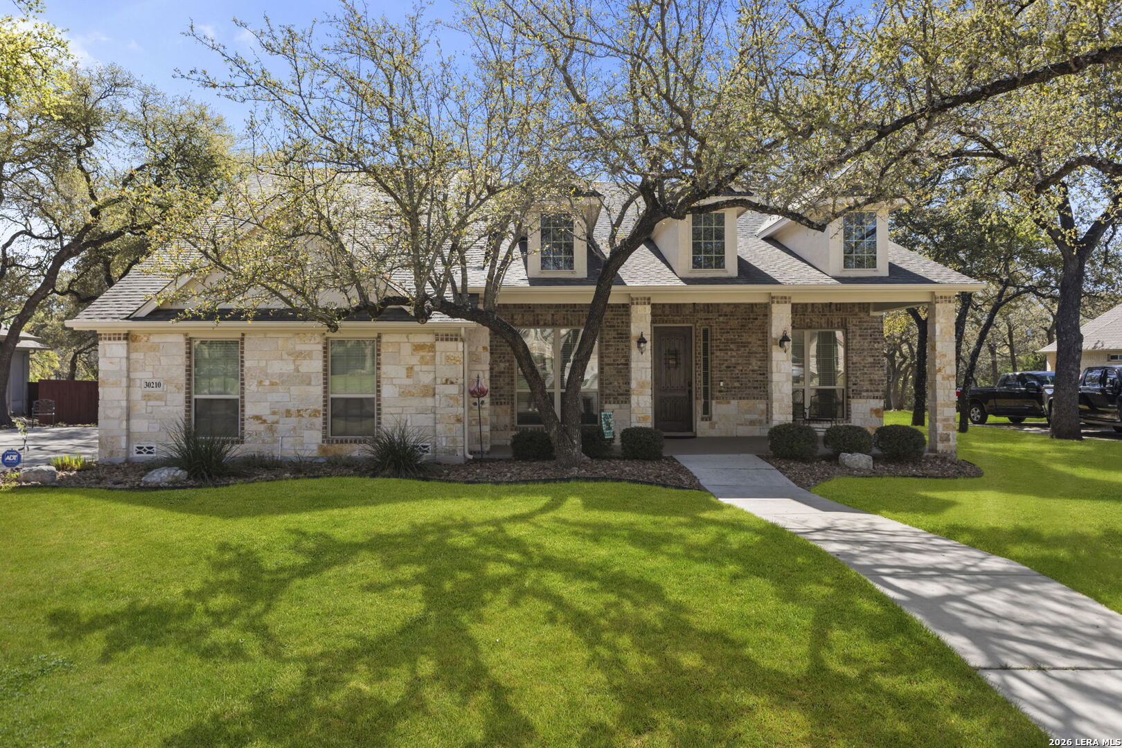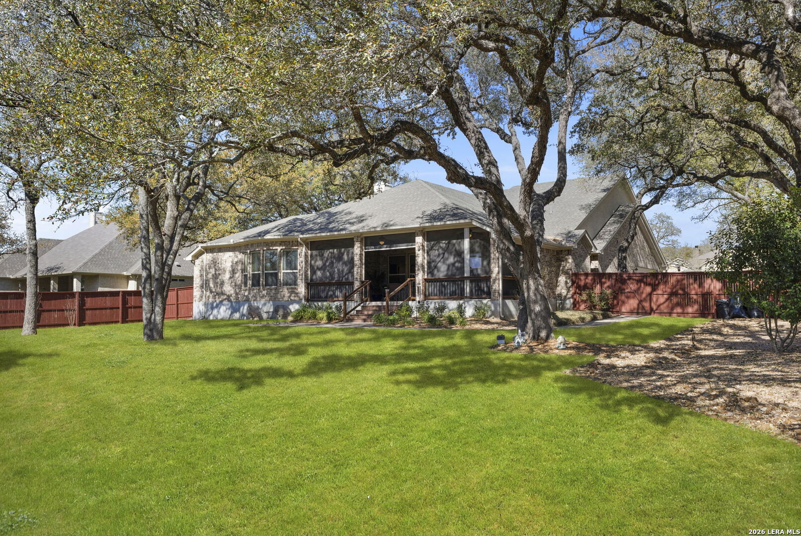 Set among mature trees in the prestigious Fair Oaks Ranch community, this 4-bedroom, 3.5-bathroom home blends timeless elegance with thoughtful design. Beautiful curb appeal and refined accents welcome you into an open, inviting interior filled with warmth and character. The living room makes a striking impression with rich wood beams, a stone accent wall, and custom built-in shelving-creating a space that is both sophisticated and comfortable. The spacious chef's kitchen is designed for both everyday living and entertaining, featuring stainless steel appliances, an inlay oven and microwave, an electric cooktop, abundant cabinetry, and a peninsula with bar seating. The seamless layout flows effortlessly into the formal dining room and a dedicated front office, offering the perfect balance of gathering spaces and quiet work areas. The grand primary suite serves as a private retreat, complete with a spa-like en suite bathroom featuring dual vanities, a soaking tub, separate shower, and an expansive walk-in closet. An additional dedicated media room provides the ideal setting for movie nights, game days, or relaxing with family and friends. Step outside to a generous covered patio overlooking a spacious backyard-perfect for al fresco dining, entertaining, or unwinding in the shade of mature trees. Located in the highly sought-after Fair Oaks Ranch community, this home offers a serene Hill Country lifestyle with convenient access to shopping, dining, and top-rated schools-delivering the perfect blend of luxury, comfort, and everyday convenience.