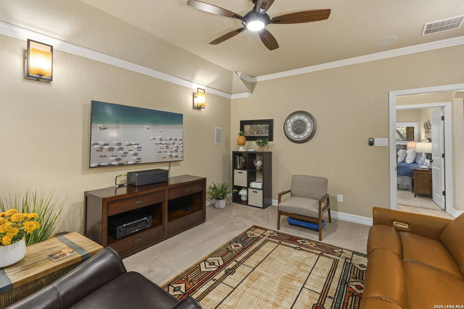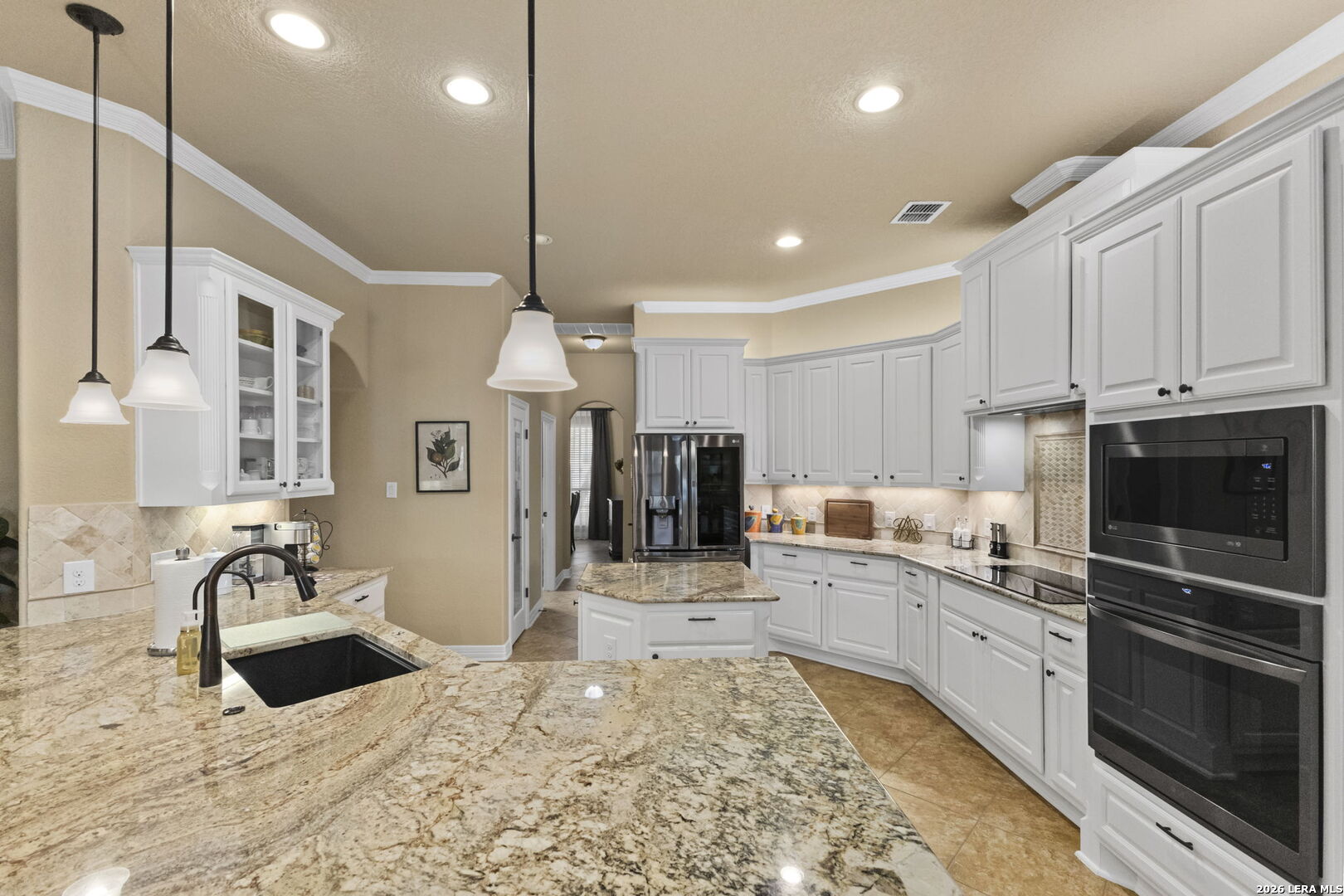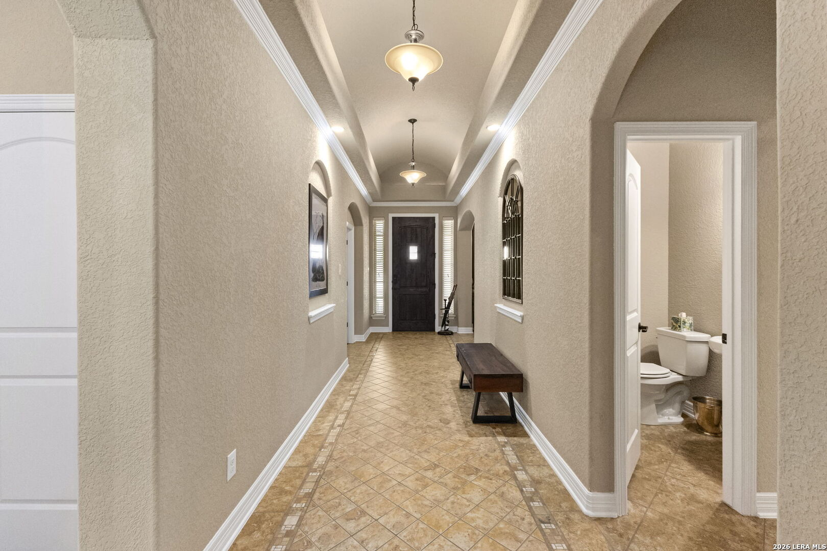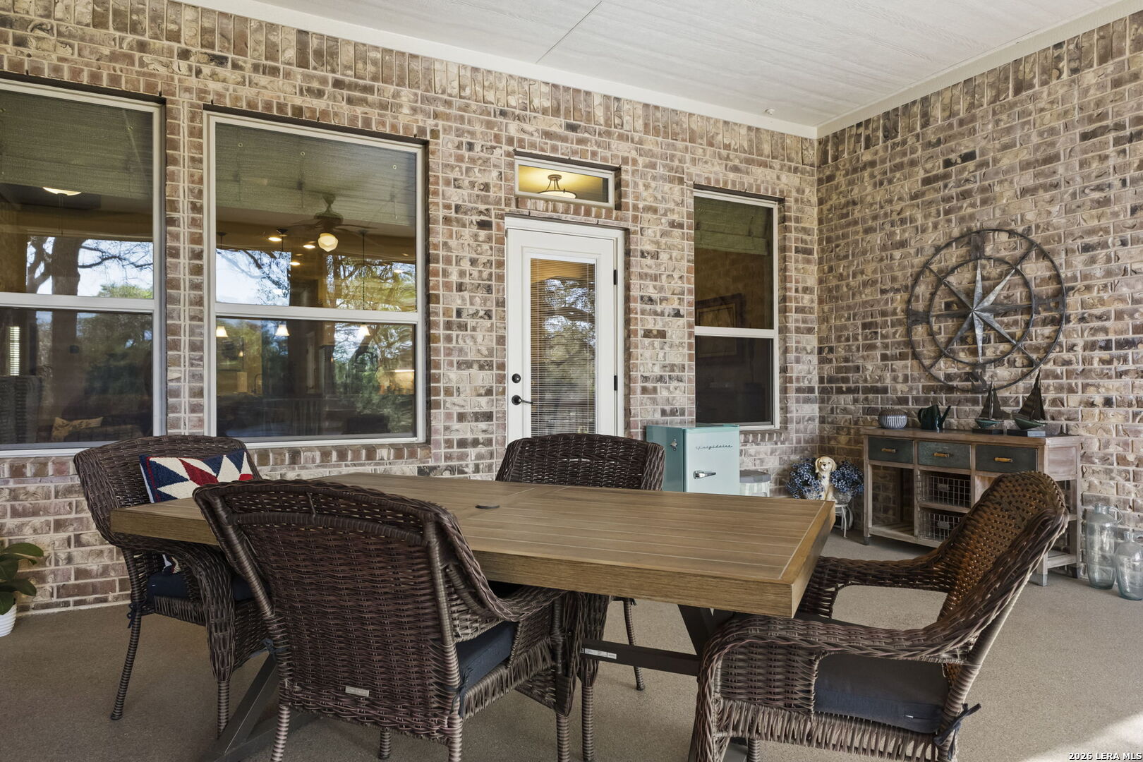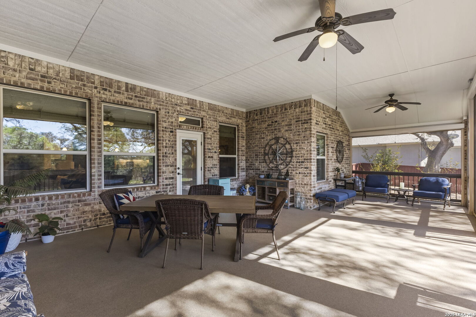 Set among mature trees in the prestigious Fair Oaks Ranch community, this 4-bedroom, 3.5-bathroom home blends timeless elegance with thoughtful design. Beautiful curb appeal and refined accents welcome you into an open, inviting interior filled with warmth and character. The living room makes a striking impression with rich wood beams, a stone accent wall, and custom built-in shelving-creating a space that is both sophisticated and comfortable. The spacious chef's kitchen is designed for both everyday living and entertaining, featuring stainless steel appliances, an inlay oven and microwave, an electric cooktop, abundant cabinetry, and a peninsula with bar seating. The seamless layout flows effortlessly into the formal dining room and a dedicated front office, offering the perfect balance of gathering spaces and quiet work areas. The grand primary suite serves as a private retreat, complete with a spa-like en suite bathroom featuring dual vanities, a soaking tub, separate shower, and an expansive walk-in closet. An additional dedicated media room provides the ideal setting for movie nights, game days, or relaxing with family and friends. Step outside to a generous covered patio overlooking a spacious backyard-perfect for al fresco dining, entertaining, or unwinding in the shade of mature trees. Located in the highly sought-after Fair Oaks Ranch community, this home offers a serene Hill Country lifestyle with convenient access to shopping, dining, and top-rated schools-delivering the perfect blend of luxury, comfort, and everyday convenience.