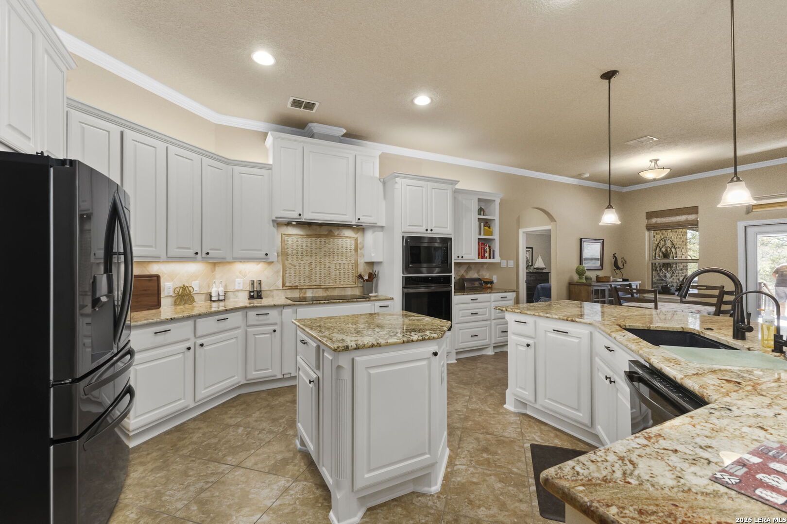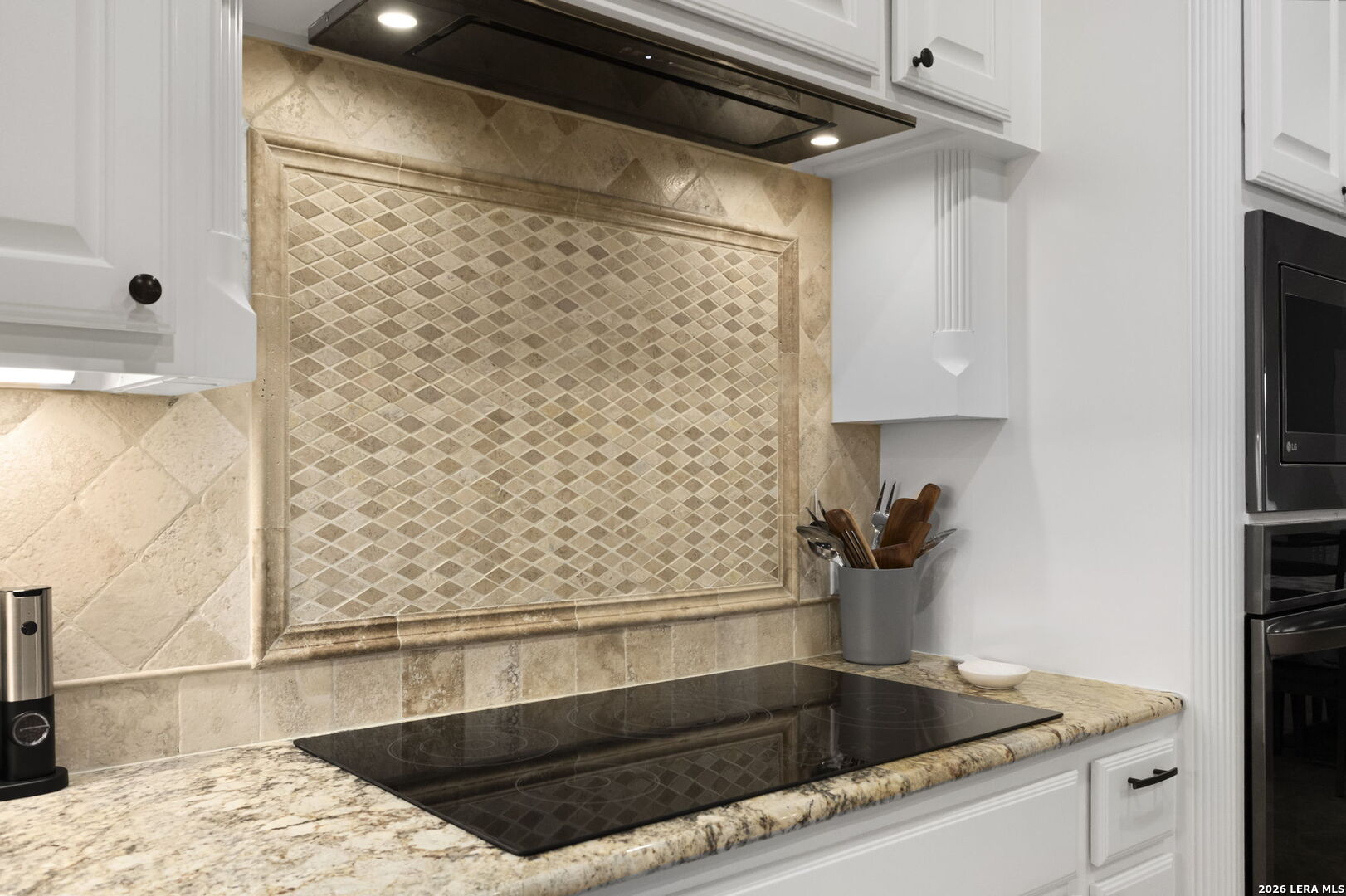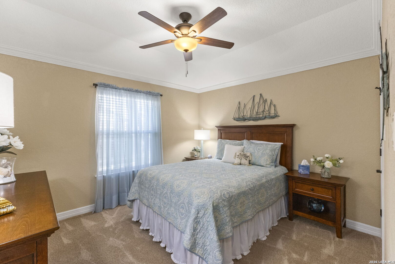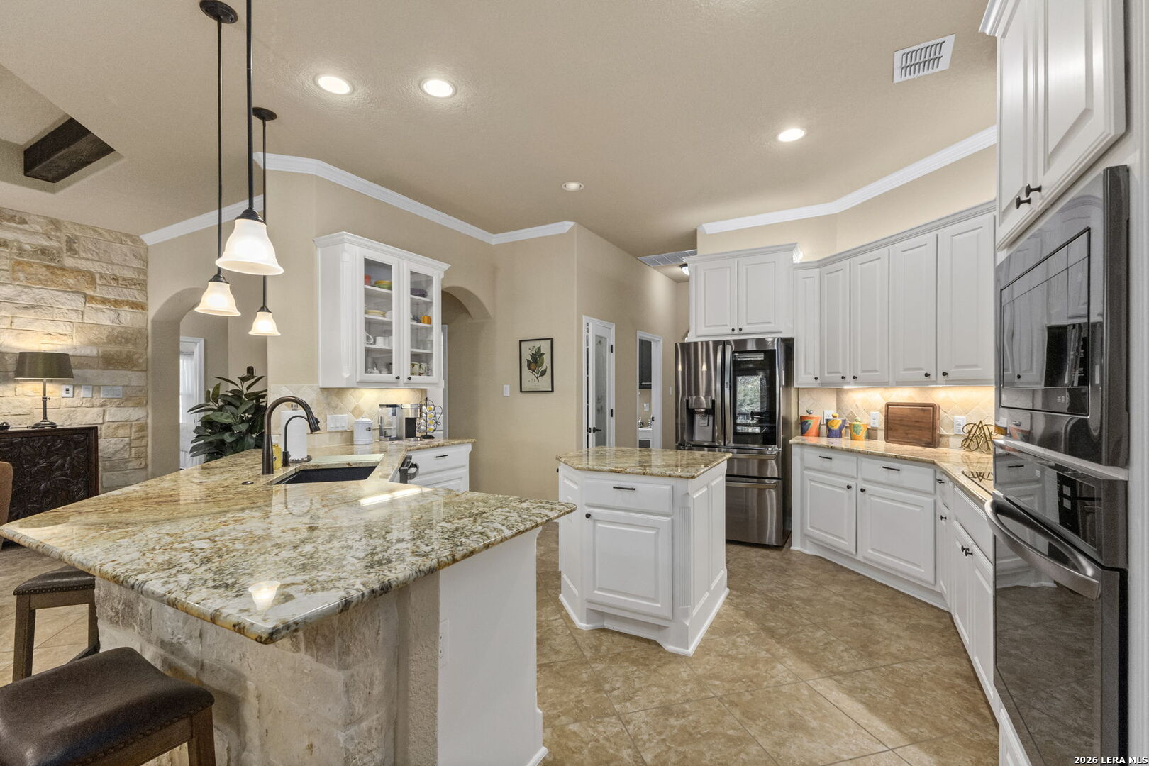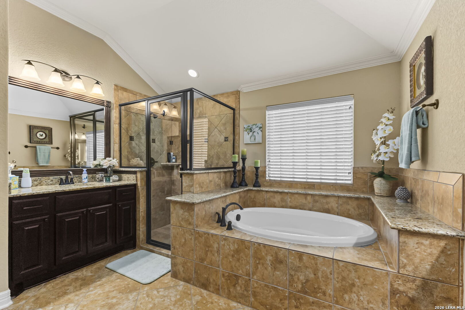 Set among mature trees in the prestigious Fair Oaks Ranch community, this 4-bedroom, 3.5-bathroom home blends timeless elegance with thoughtful design. Beautiful curb appeal and refined accents welcome you into an open, inviting interior filled with warmth and character. The living room makes a striking impression with rich wood beams, a stone accent wall, and custom built-in shelving-creating a space that is both sophisticated and comfortable. The spacious chef's kitchen is designed for both everyday living and entertaining, featuring stainless steel appliances, an inlay oven and microwave, an electric cooktop, abundant cabinetry, and a peninsula with bar seating. The seamless layout flows effortlessly into the formal dining room and a dedicated front office, offering the perfect balance of gathering spaces and quiet work areas. The grand primary suite serves as a private retreat, complete with a spa-like en suite bathroom featuring dual vanities, a soaking tub, separate shower, and an expansive walk-in closet. An additional dedicated media room provides the ideal setting for movie nights, game days, or relaxing with family and friends. Step outside to a generous covered patio overlooking a spacious backyard-perfect for al fresco dining, entertaining, or unwinding in the shade of mature trees. Located in the highly sought-after Fair Oaks Ranch community, this home offers a serene Hill Country lifestyle with convenient access to shopping, dining, and top-rated schools-delivering the perfect blend of luxury, comfort, and everyday convenience.