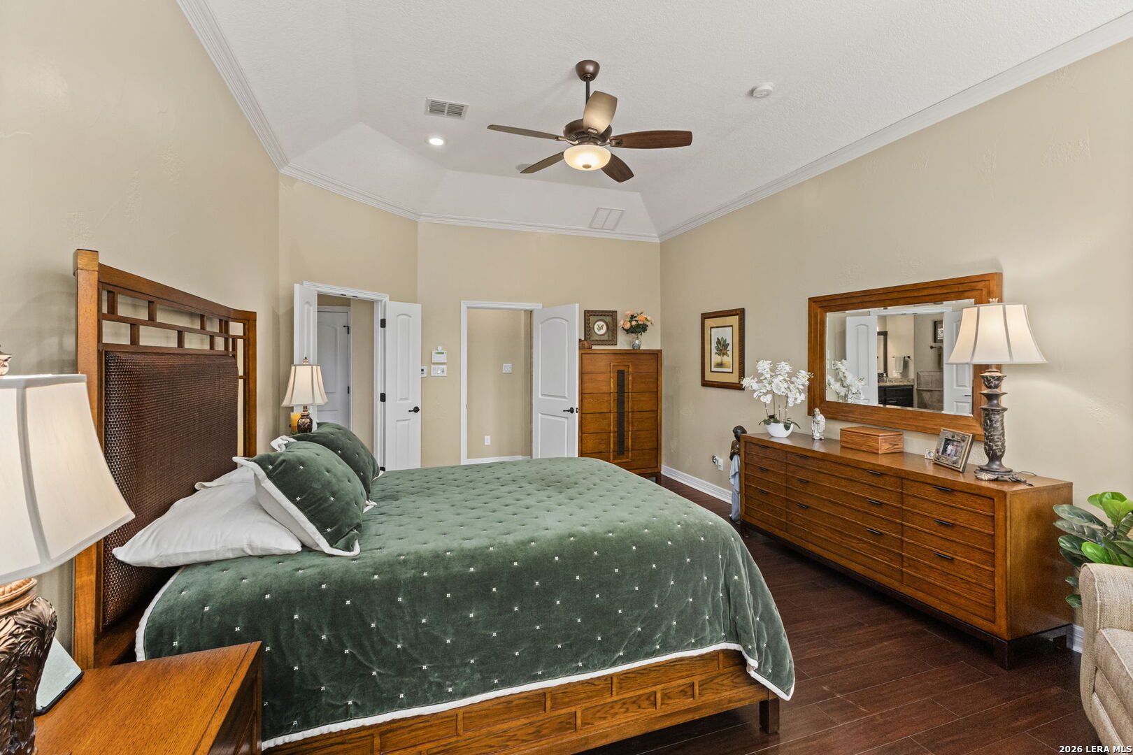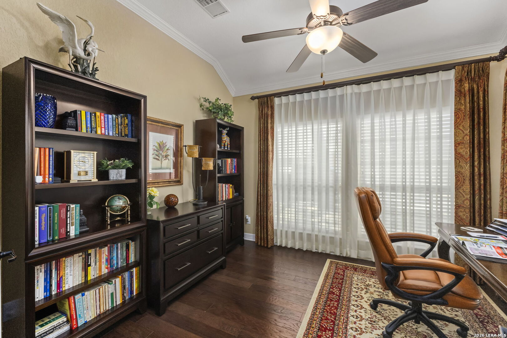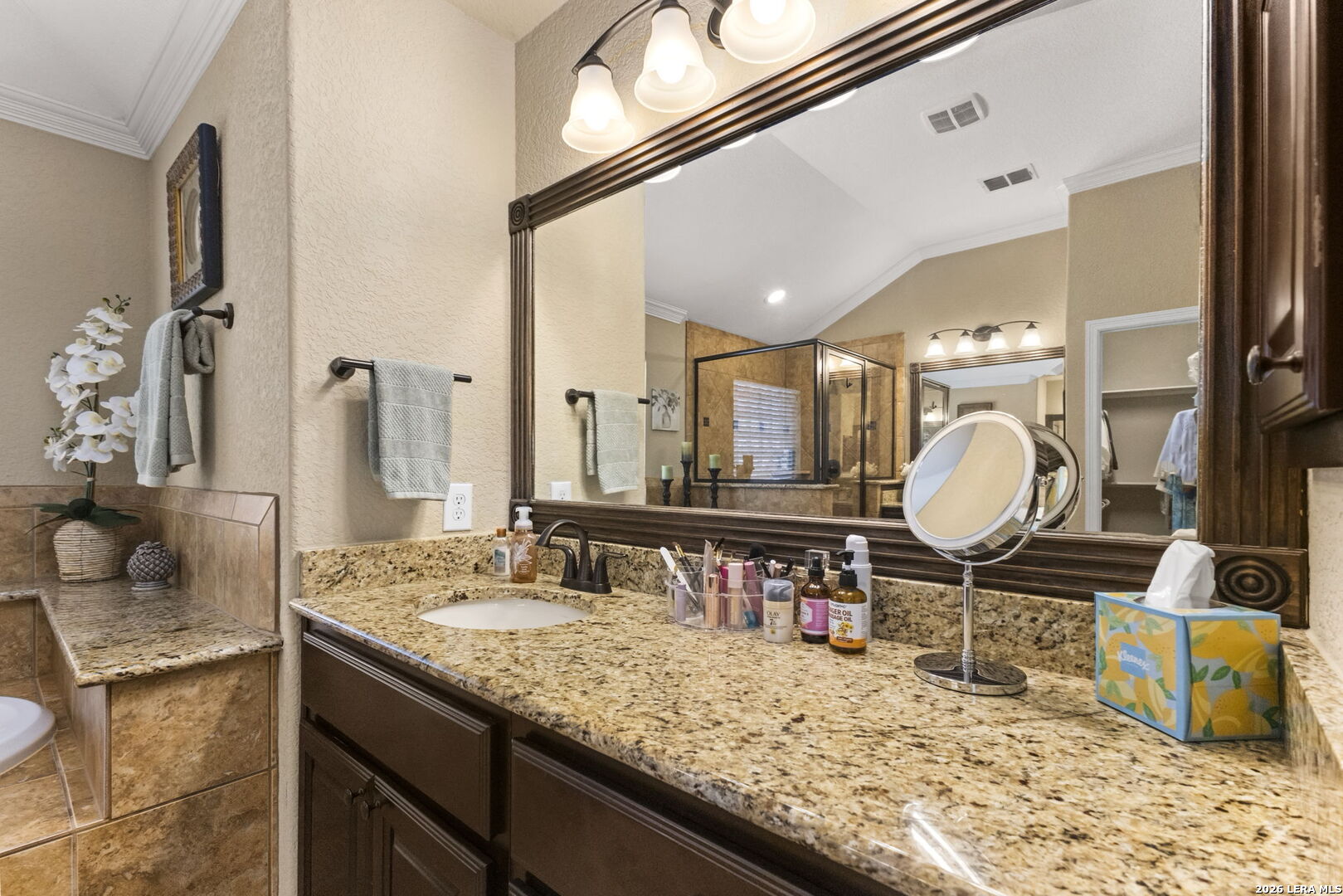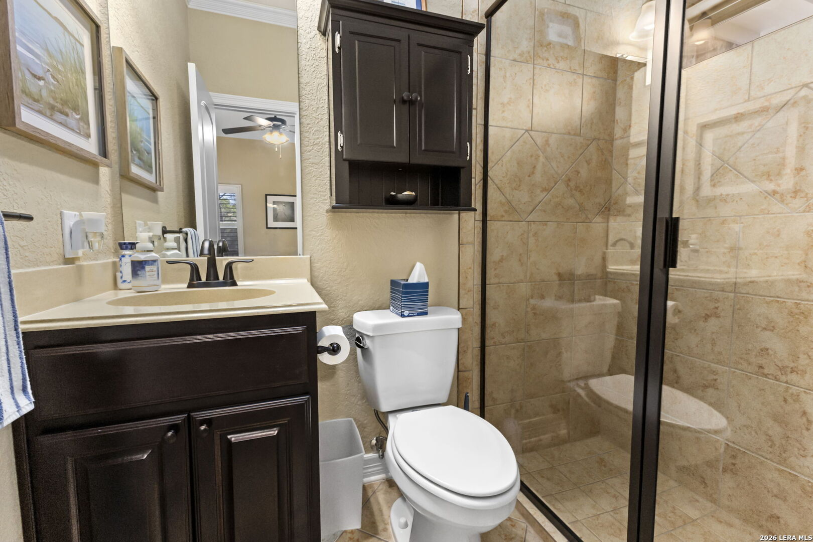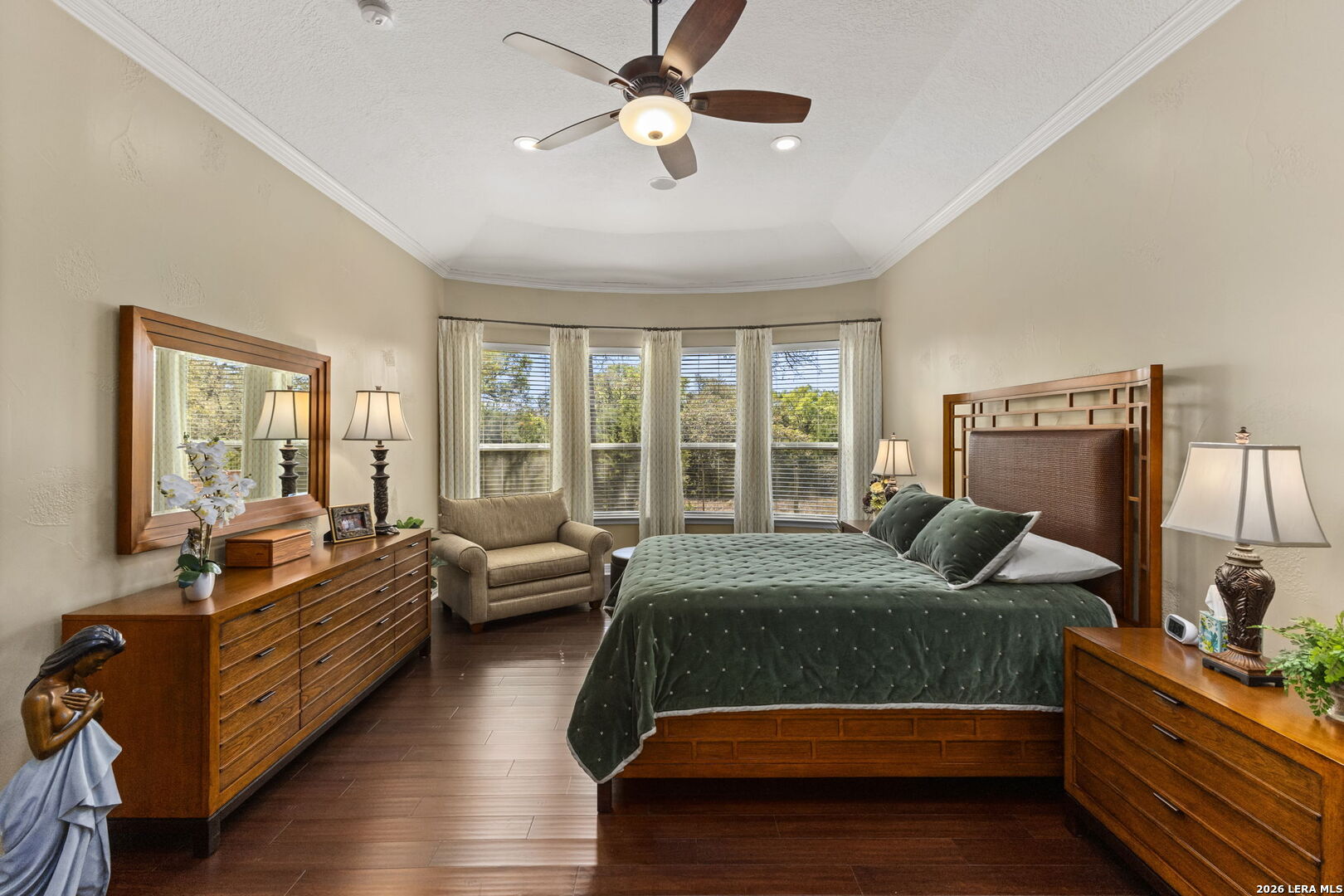 Set among mature trees in the prestigious Fair Oaks Ranch community, this 4-bedroom, 3.5-bathroom home blends timeless elegance with thoughtful design. Beautiful curb appeal and refined accents welcome you into an open, inviting interior filled with warmth and character. The living room makes a striking impression with rich wood beams, a stone accent wall, and custom built-in shelving-creating a space that is both sophisticated and comfortable. The spacious chef's kitchen is designed for both everyday living and entertaining, featuring stainless steel appliances, an inlay oven and microwave, an electric cooktop, abundant cabinetry, and a peninsula with bar seating. The seamless layout flows effortlessly into the formal dining room and a dedicated front office, offering the perfect balance of gathering spaces and quiet work areas. The grand primary suite serves as a private retreat, complete with a spa-like en suite bathroom featuring dual vanities, a soaking tub, separate shower, and an expansive walk-in closet. An additional dedicated media room provides the ideal setting for movie nights, game days, or relaxing with family and friends. Step outside to a generous covered patio overlooking a spacious backyard-perfect for al fresco dining, entertaining, or unwinding in the shade of mature trees. Located in the highly sought-after Fair Oaks Ranch community, this home offers a serene Hill Country lifestyle with convenient access to shopping, dining, and top-rated schools-delivering the perfect blend of luxury, comfort, and everyday convenience.