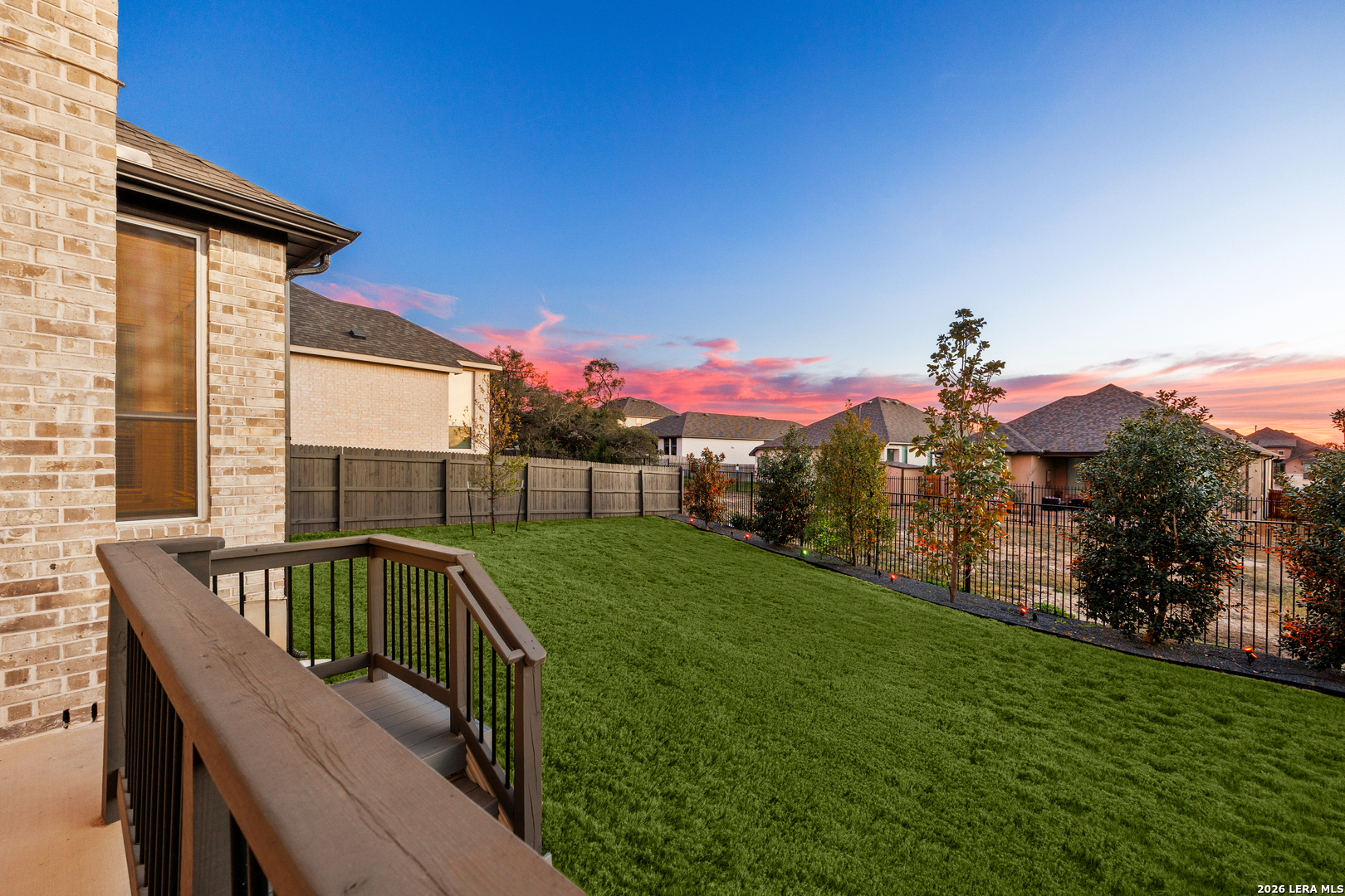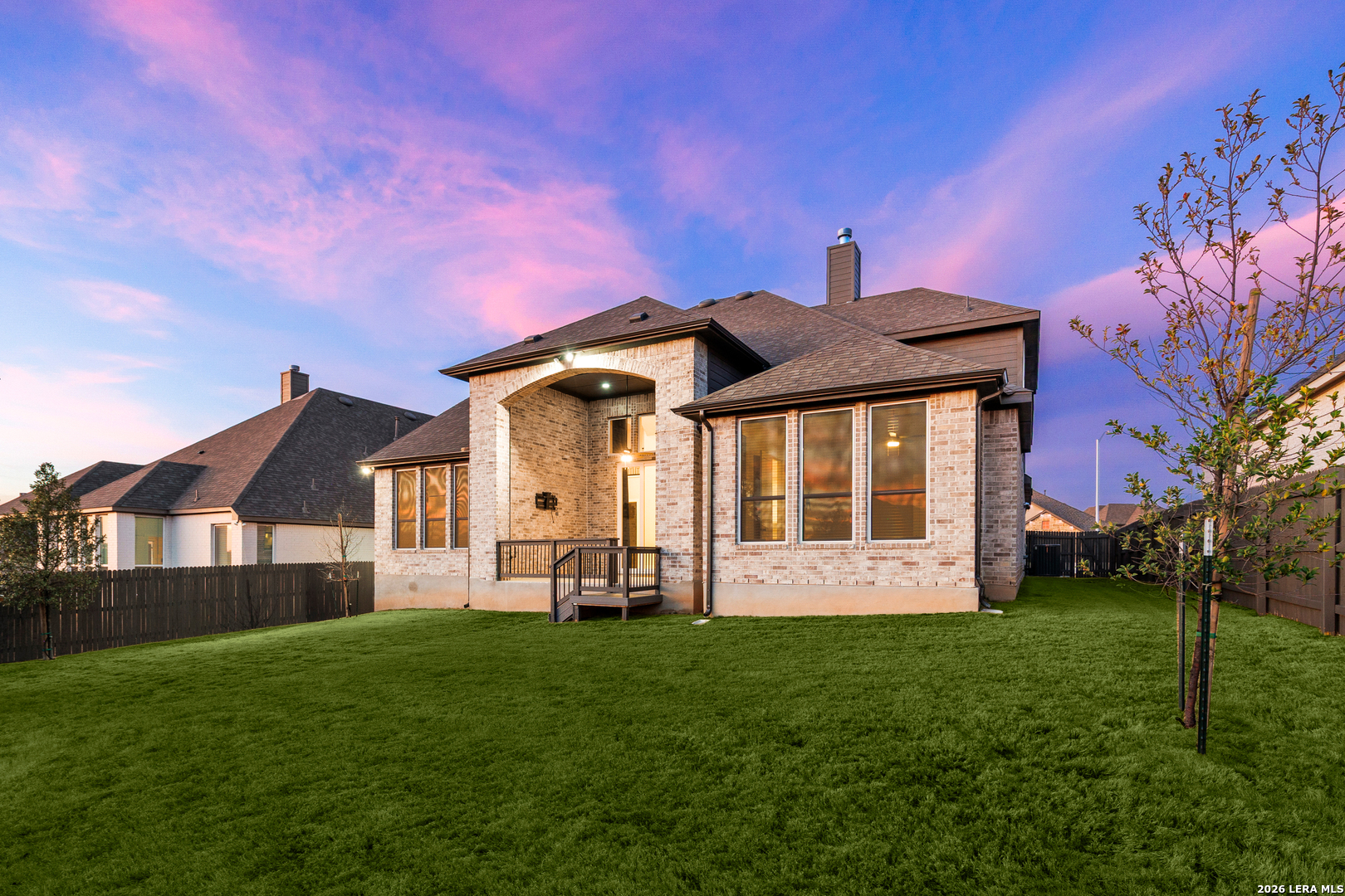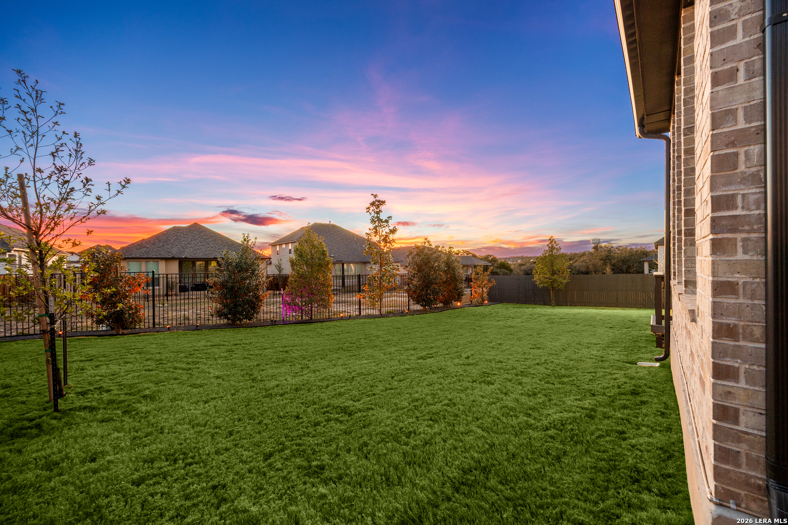 Gorgeous, move-in-ready two-story home located in the community of Ventana with many upgrades throughout! This thoughtfully designed Highland Homes build offers 5 bedrooms and 5.5 baths, all set on a desirable cul-de-sac lot. The exterior features mature trees, professional landscaping, stone flower beds, special outdoor lighting, and a spacious covered patio with a motorized shade, creating a comfortable outdoor setting and a large lawn for everyday enjoyment. Inside, dramatic tall ceilings and abundant natural light welcome you into a very open floor plan that feels bright and spacious throughout. Engineered wood floors highlight the main living areas, with hardwood stairs adding warmth and character. The home includes a private office, a dedicated media room, and a flexible upstairs living space ideal for a game room or playroom. The gourmet island kitchen is designed for both daily living and entertaining, featuring designer quartz countertops, double ovens, generous cabinet and counter space, wine cabinetry in the kitchen, a walk-in pantry, and a butler's pantry with a wine fridge. Sliding glass doors off the dining area lead to an extended patio, creating a smooth indoor-outdoor connection. The first floor includes a split primary suite for added privacy, along with a first-floor guest suite that offers its own living quarters. The home is wheelchair accessible and includes a roll-in shower. Upstairs, oversized secondary bedrooms provide space for king-size beds and additional furniture, making every room comfortable and functional. Smart home features, energy-efficient design, ceramic log fireplace details, and designer-selected finishes throughout add convenience and long-term value, making this home both practical and impressive for everyday living and entertaining. Seller is offering a $10,000. concession to buyer. Come experience all this home has to offer, book your personal tour today!