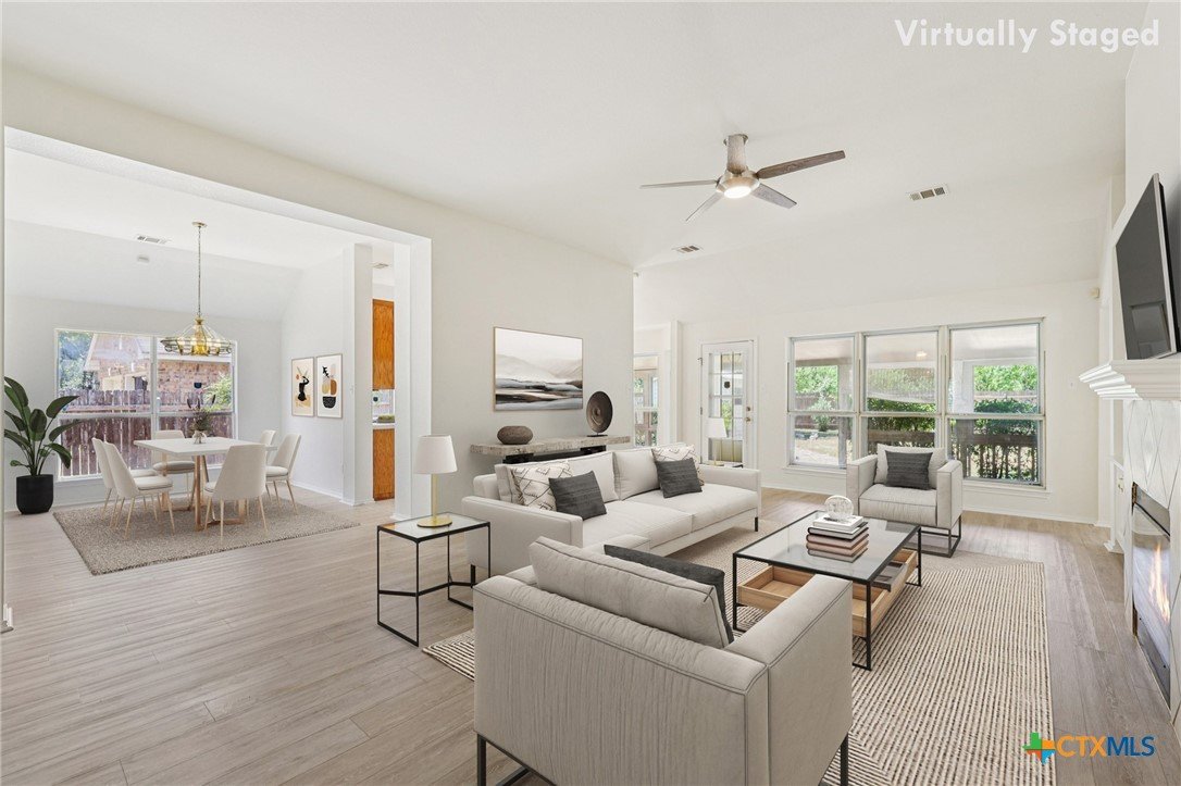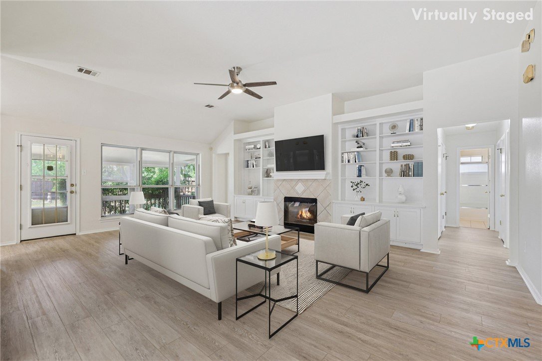 Don't miss this fantastic opportunity to own a single-story home in the heart of Cedar Park, just one block from a neighborhood park. The location couldn't be more convenient - less than a mile from the new Cedar Park Library, farmers market, and the upcoming Bell District development, and under two miles to Brushy Creek Regional Trail, Lakeline Park, Cedar Park Medical Center, and just about every restaurant and retailer you can imagine including HEB, Walmart, Costco, Target and more. Inside, the home centers around a spacious living area with a cozy fireplace, a wall of built-in cabinets and display shelves, just installed luxury vinyl plank flooring, and large windows overlooking the backyard. The kitchen offers abundant cabinet and counter space along with a breakfast area set in a charming bay window. The primary suite features a beautifully updated walk-in shower with frameless glass doors. Additional highlights include a freshly painted interior, high ceilings in most rooms, vinyl plank and hard tile flooring throughout (no carpet), and an extended covered patio that overlooks the big backyard (nearly quarter-acre lot) with no rear neighbors for added privacy. All of this comes with excellent Leander ISD schools and no HOA fees - saving you money year after year.