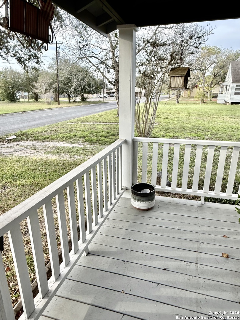 With a large porch spanning the front, this lovely home is quite inviting! The attractive metal roof and the landscaping, with two Sego palms at the entrance, add to the curb appeal. The large backyard is privacy fenced and features a brick patio and a cute storage building. There are numerous trees including a rain tree, a Chinese tallow and a crepe myrtle. Enter into a spacious living room with a wall of built-in cabinets with glass front doors-so nice! There are oaks floors which are beautiful. High ceilings also add a nice touch. The attractive white kitchen also has some cabinets with glass front doors in the built-in hutch. The range and refrigerator will remain. There is a nice built-in breakfast bar. The two bedrooms are both spacious. There are ceiling fans in the home. The bathroom has a tub/shower combination and built-ins. There is a bonus room across the back of the house with a closet and could serve as a den, office and more. There is blown-in insulation in the attic and the home has central air and heat. The exterior of the home is stucco and the one-car garage has Hardie board siding. This home is located a short distance from the Klipstein Park and within walking distance to St.Mary's School. You must see this lovely home!