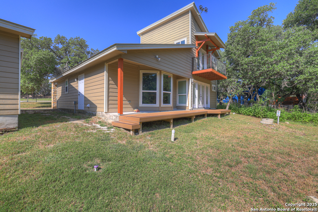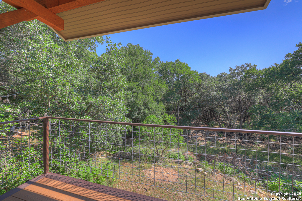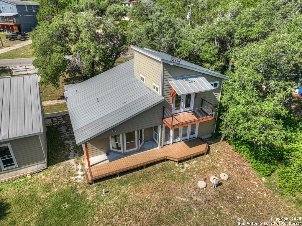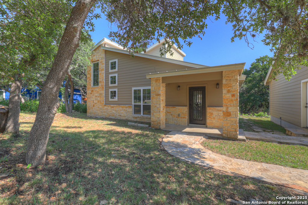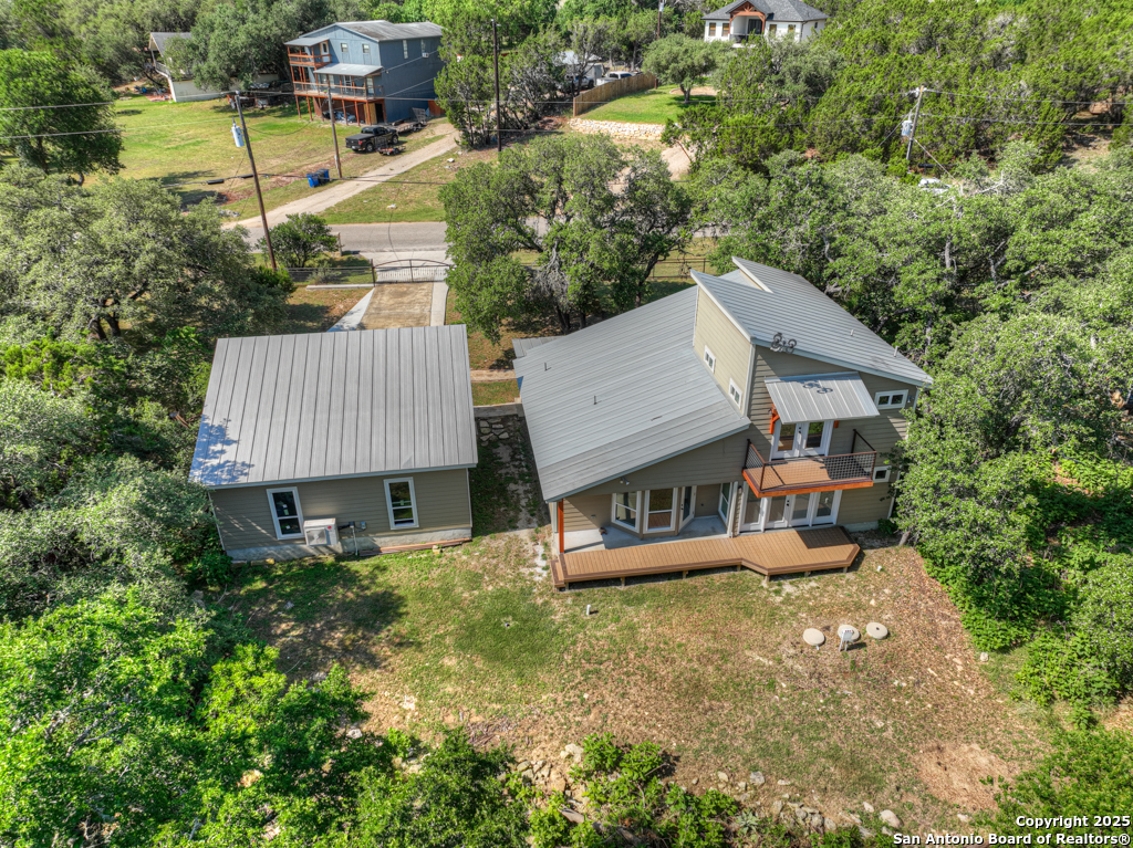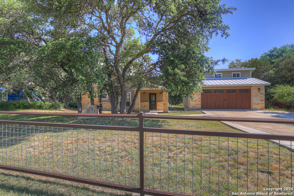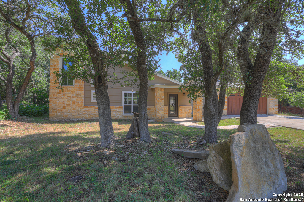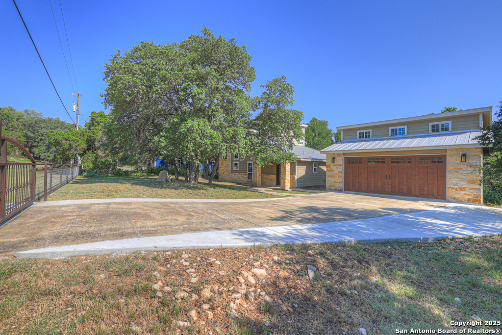 This stunning property sits on a spacious (127 feet wide) double lot, offering both privacy and room to breathe. Step inside to find an open floor plan that seamlessly blends living, dining, and kitchen areas-perfect for entertaining or enjoying peaceful everyday living. The home features natural light, thanks to large, strategically placed windows that bring the outdoors in and create a warm, inviting atmosphere throughout. Designed for comfort and versatility, the home features dual primary suites. The larger of the two is conveniently located on the main floor with French doors leading to the backyard. The second suite is upstairs and includes its own private balcony-ideal for morning coffee or sunset views overlooking the woods with the absence of a rear neighbor. High-quality wood and tile flooring flow throughout the home, adding a sense of luxury and durability. The kitchen is equipped with gorgeous cherry wood cabinets and striking leathered granite countertops that offer both style and functionality. Each room is fitted with a dedicated mini split system, providing efficient, customizable climate control all year round. The oversized 841 sq ft garage is fully temperature-controlled with heating and cooling, and includes two 220V outlets-perfect for workshops, EV charging, or heavy-duty equipment. There's ample space for boat or toy storage, catering to all your recreational needs. The property has a gated front entry, offering security and a welcoming curb appeal. Just minutes from Canyon Lake, you'll have easy access to fishing and lakeside fun. This home combines practical luxury with outdoor adventure, making it a rare find in a coveted location. Whether you're looking for a serene retreat or a base for all your lake activities, this property checks every box. Don't miss the opportunity to make it yours!
