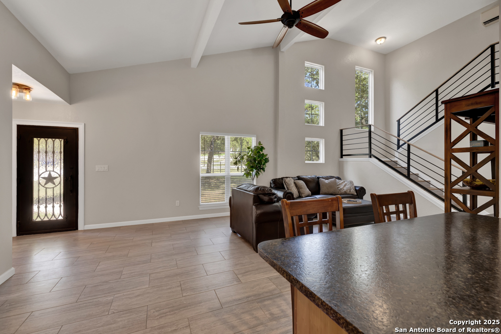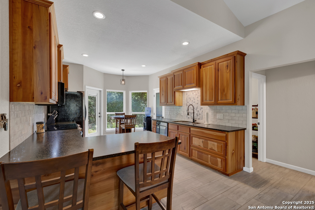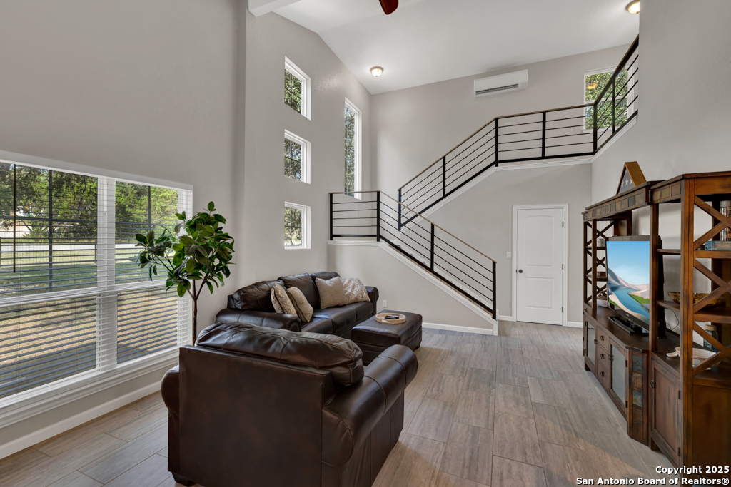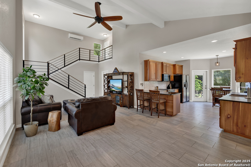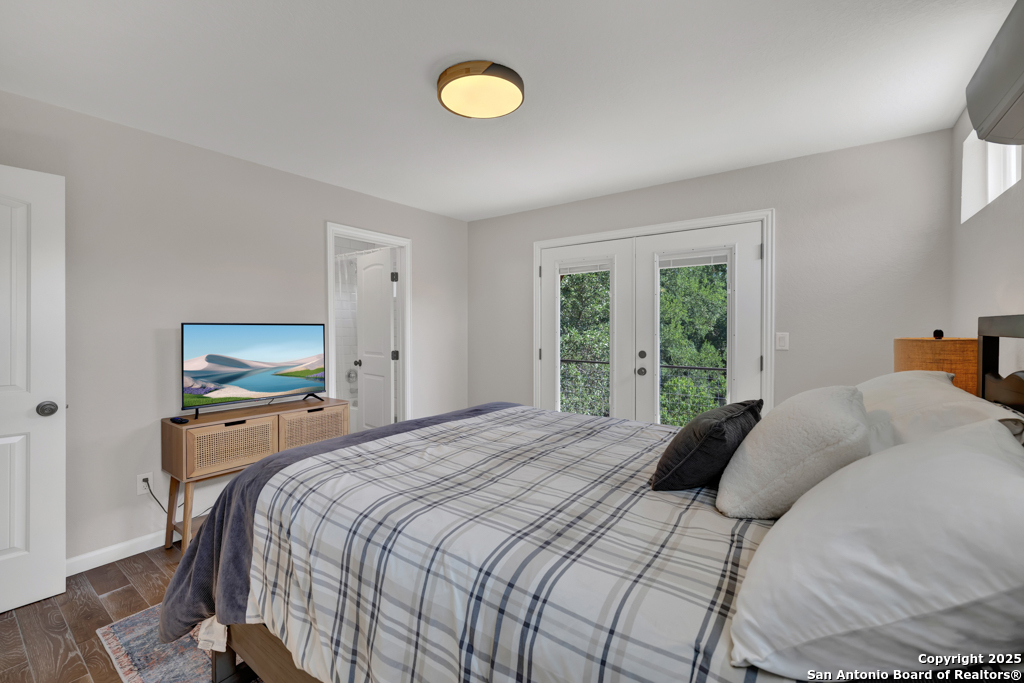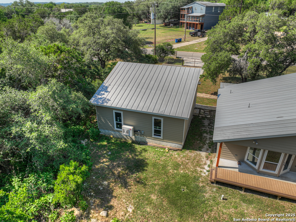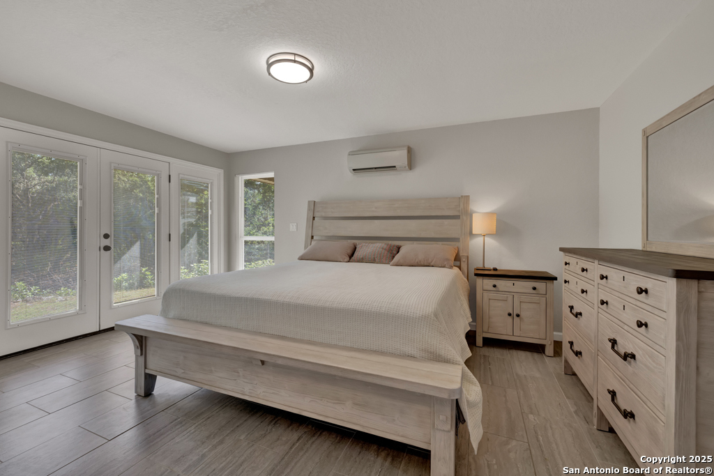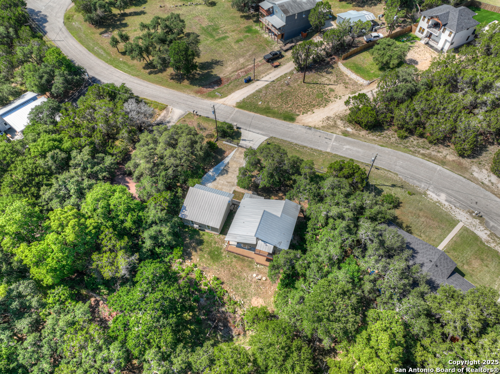 This stunning property sits on a spacious (127 feet wide) double lot, offering both privacy and room to breathe. Step inside to find an open floor plan that seamlessly blends living, dining, and kitchen areas-perfect for entertaining or enjoying peaceful everyday living. The home features natural light, thanks to large, strategically placed windows that bring the outdoors in and create a warm, inviting atmosphere throughout. Designed for comfort and versatility, the home features dual primary suites. The larger of the two is conveniently located on the main floor with French doors leading to the backyard. The second suite is upstairs and includes its own private balcony-ideal for morning coffee or sunset views overlooking the woods with the absence of a rear neighbor. High-quality wood and tile flooring flow throughout the home, adding a sense of luxury and durability. The kitchen is equipped with gorgeous cherry wood cabinets and striking leathered granite countertops that offer both style and functionality. Each room is fitted with a dedicated mini split system, providing efficient, customizable climate control all year round. The oversized 841 sq ft garage is fully temperature-controlled with heating and cooling, and includes two 220V outlets-perfect for workshops, EV charging, or heavy-duty equipment. There's ample space for boat or toy storage, catering to all your recreational needs. The property has a gated front entry, offering security and a welcoming curb appeal. Just minutes from Canyon Lake, you'll have easy access to fishing and lakeside fun. This home combines practical luxury with outdoor adventure, making it a rare find in a coveted location. Whether you're looking for a serene retreat or a base for all your lake activities, this property checks every box. Don't miss the opportunity to make it yours!