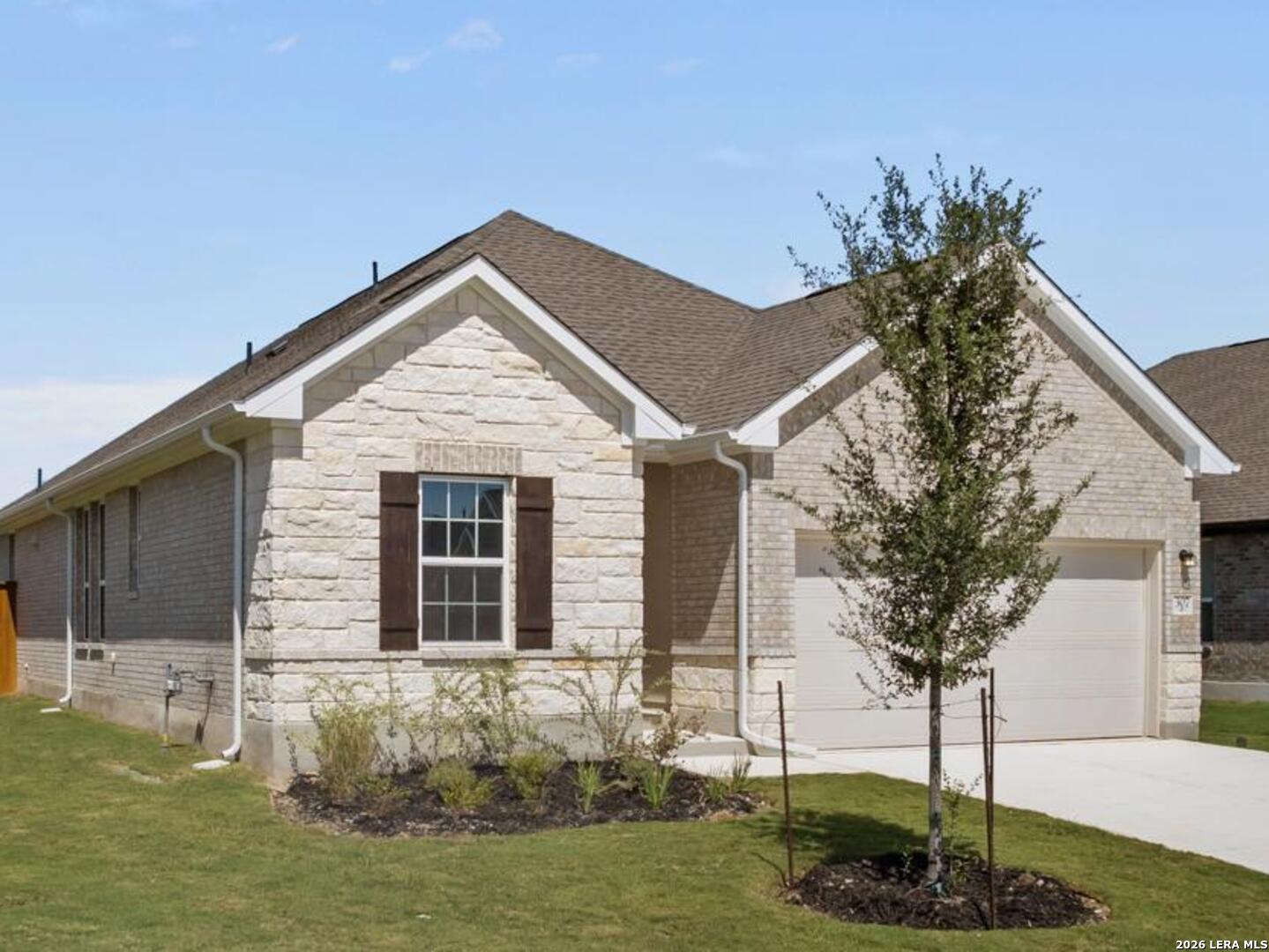 This beautifully crafted Liberty single-story home offers 3 bedrooms, a versatile study, and over 1,800 square feet of meticulously designed living space. From the moment you arrive, the elegant stone and brick exterior makes a stunning first impression, providing timeless curb appeal and lasting durability. Inside, an open-concept layout effortlessly blends the living, dining, and kitchen areas-creating a welcoming space for both everyday living and entertaining. The modern kitchen features quartz countertops, built-in stainless steel appliances, a stylish subway-tile backsplash, and a spacious island with a single-bowl sink-perfect for meal prep and casual gatherings. A cozy study with French doors offers flexible space for a home office, creative retreat, or quiet reading nook. The private primary suite is a relaxing retreat, complete with a large bedroom, walk-in closet, and a spa-inspired bathroom with a generous shower and built-in bench. Step outside to your private backyard oasis, ideal for morning coffee, alfresco dining, or simply unwinding after a long day. Nestled in a peaceful section of the Foxbrook community, this home is just steps away from scenic walking trails that lead to a serene bird sanctuary and surrounding neighborhoods. A short 20-minute walk will take you to the community pool, offering the perfect place for warm-weather relaxation. Scheduled for completion in September 2025, this home blends style, comfort, and prime location, making it the perfect choice for first-time buyers, growing families, or those seeking a fresh start.